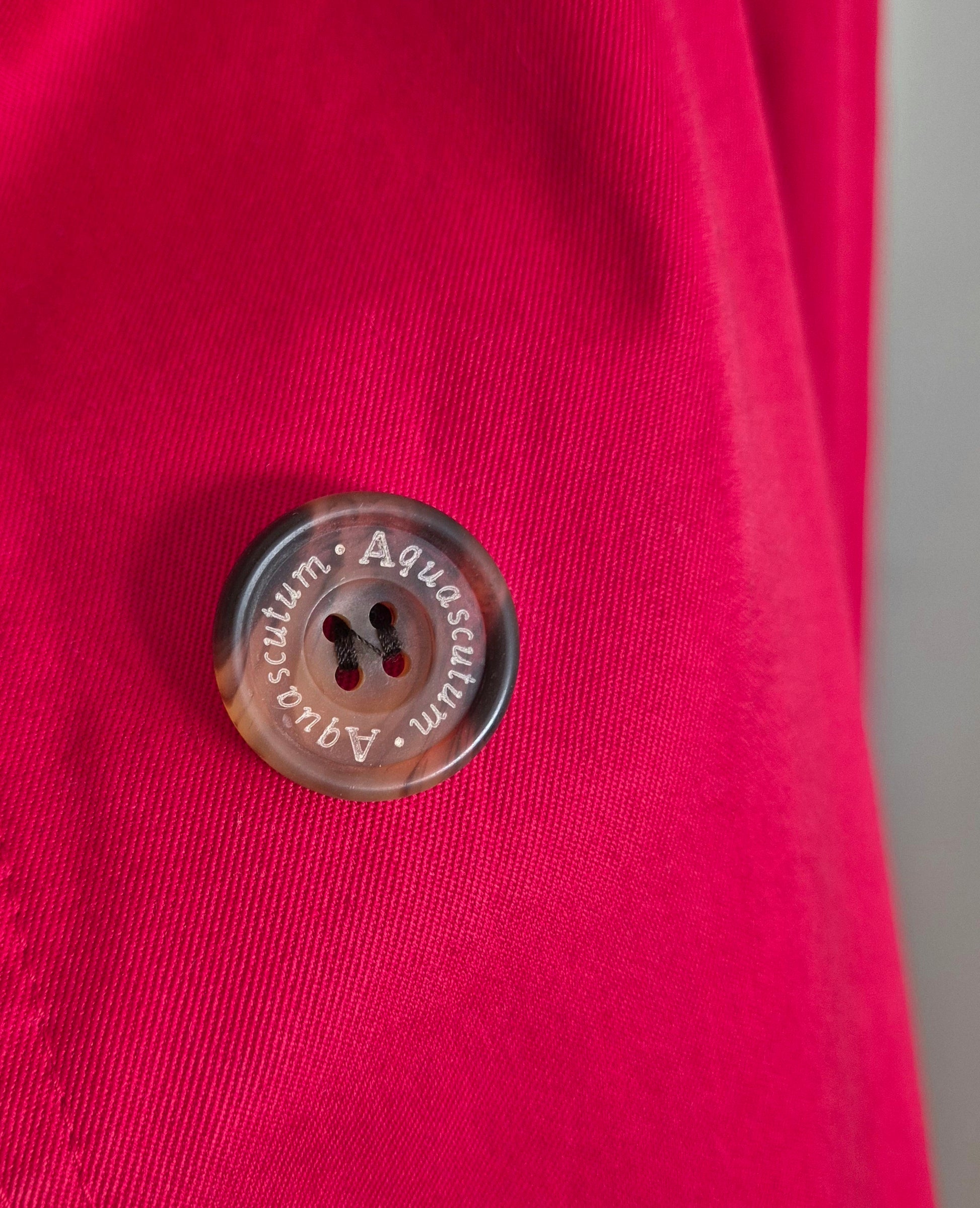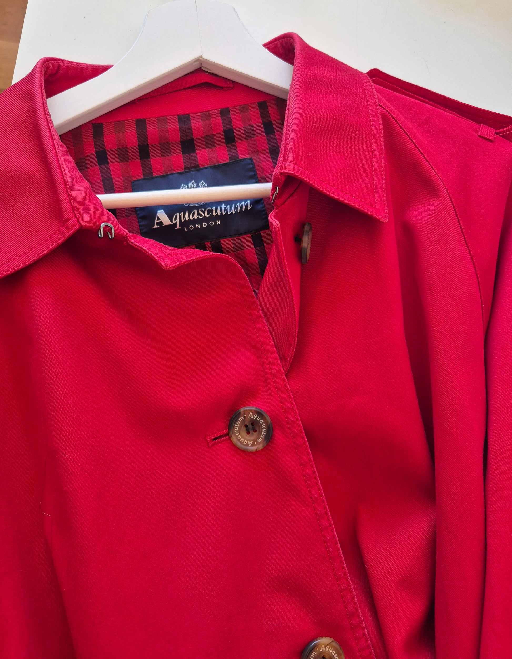Crveni baloner britanskog high-end brenda Aquascutum. Bezvremenski stil i kvaliteta. Prepoznatljiva karirana podstava. Remen u struku. Izgleda odlično zakopčan i otkopčan :). Klasičan trench coat materijal - 55% pamuk i 45% poliester. Podstava pamuk.