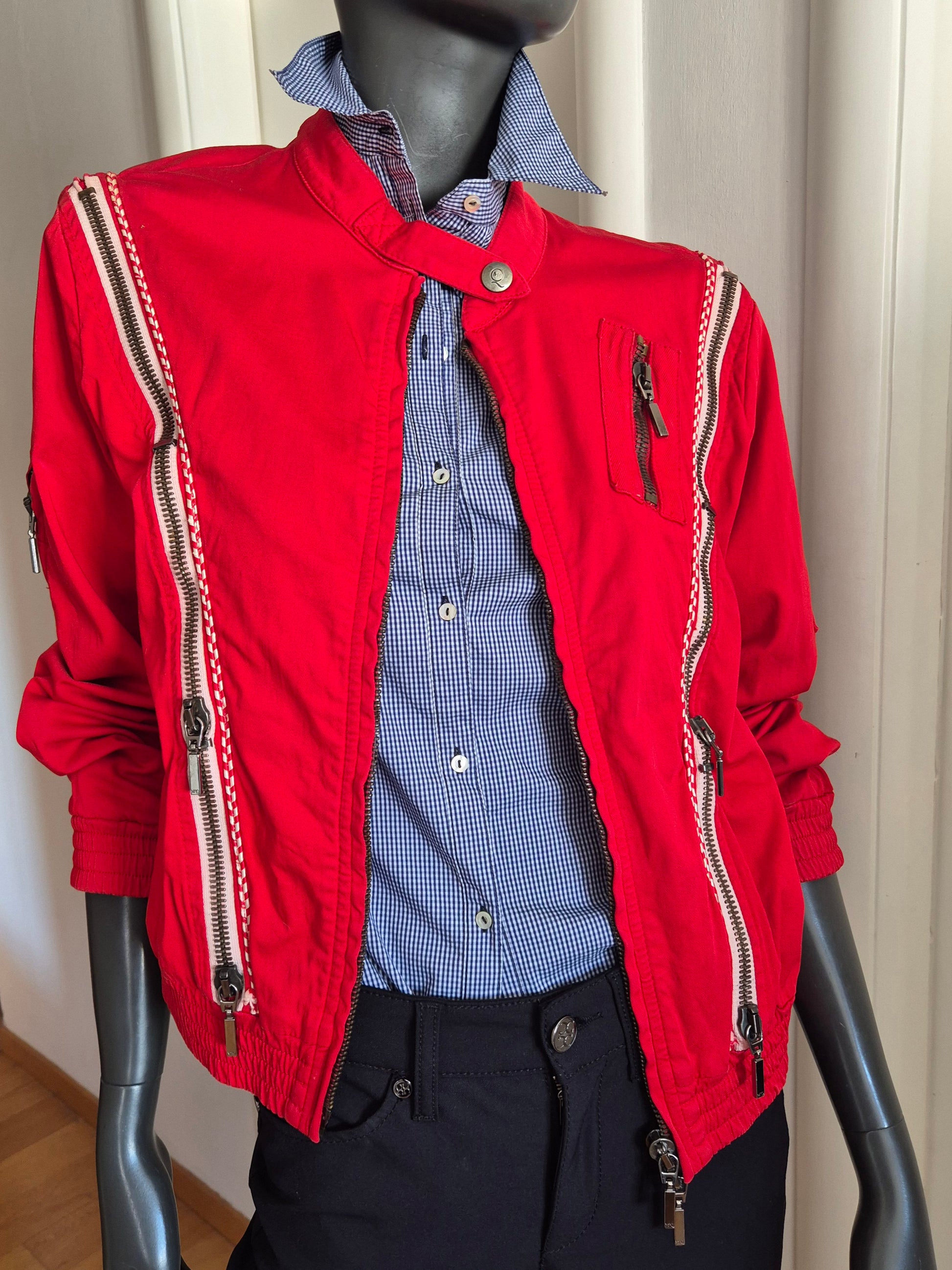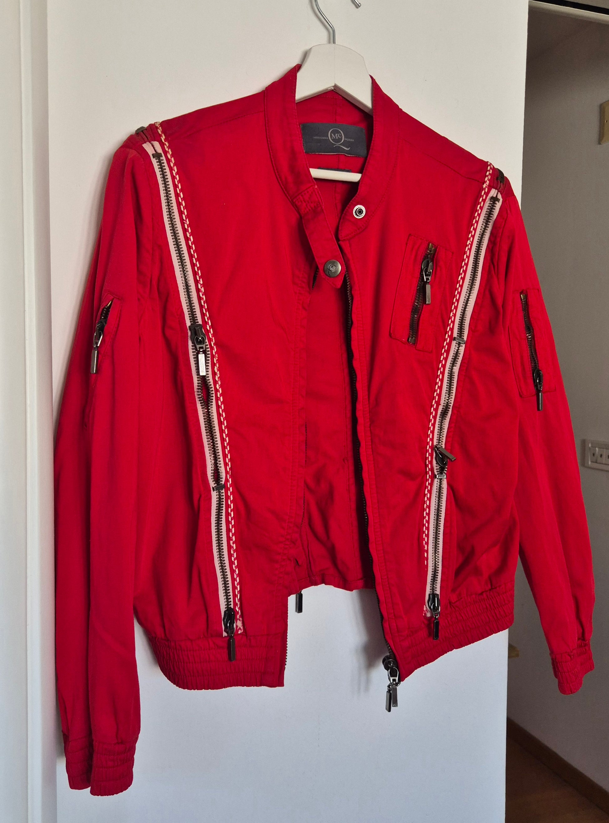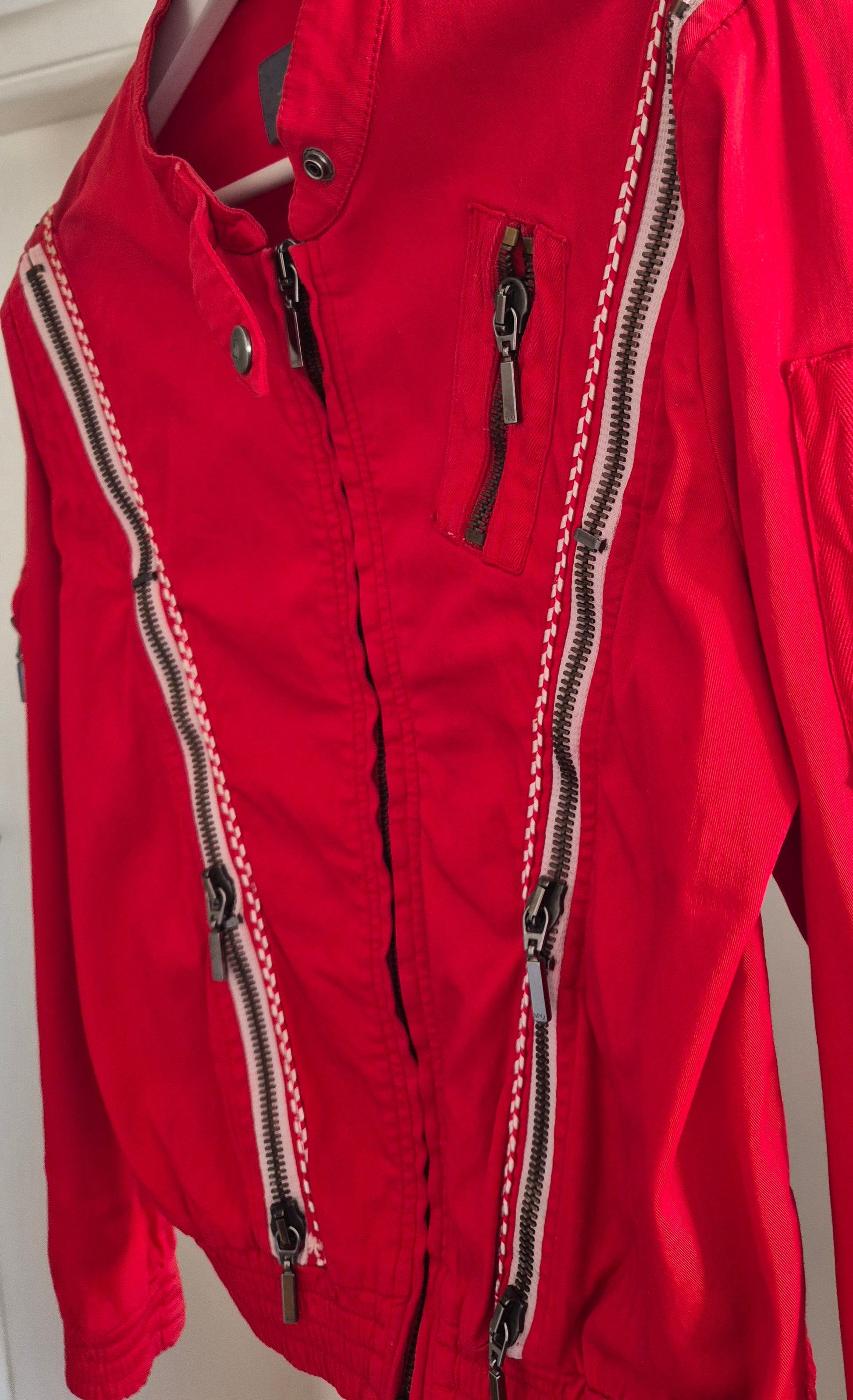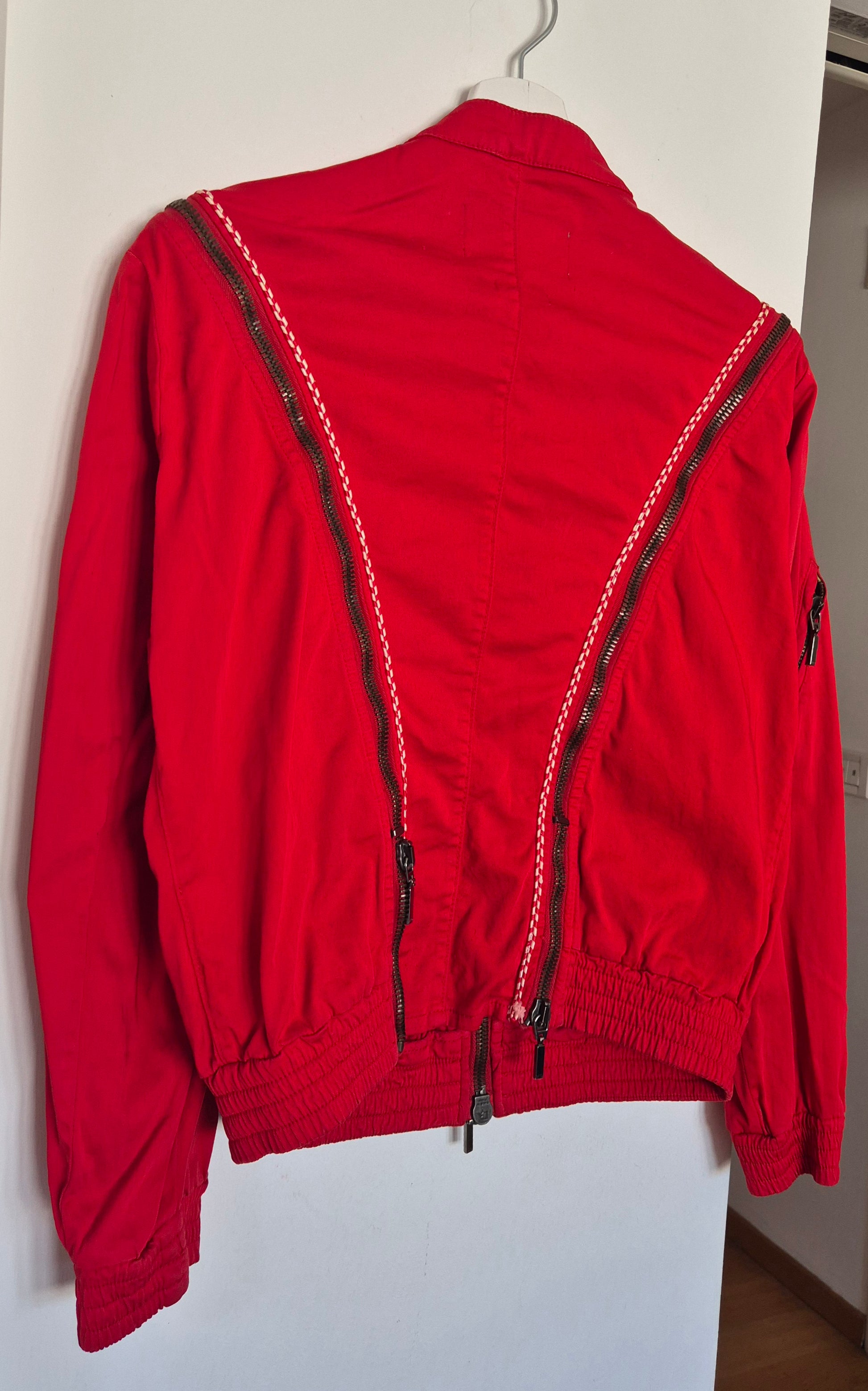 Dizajnerska jakna, Alexander McQueen. Pamučna (98% pamuk i 2% elastin), crvena. Zipovi kao detalji (mogu se otvarati i zatvarati). Veoma efektna 👌