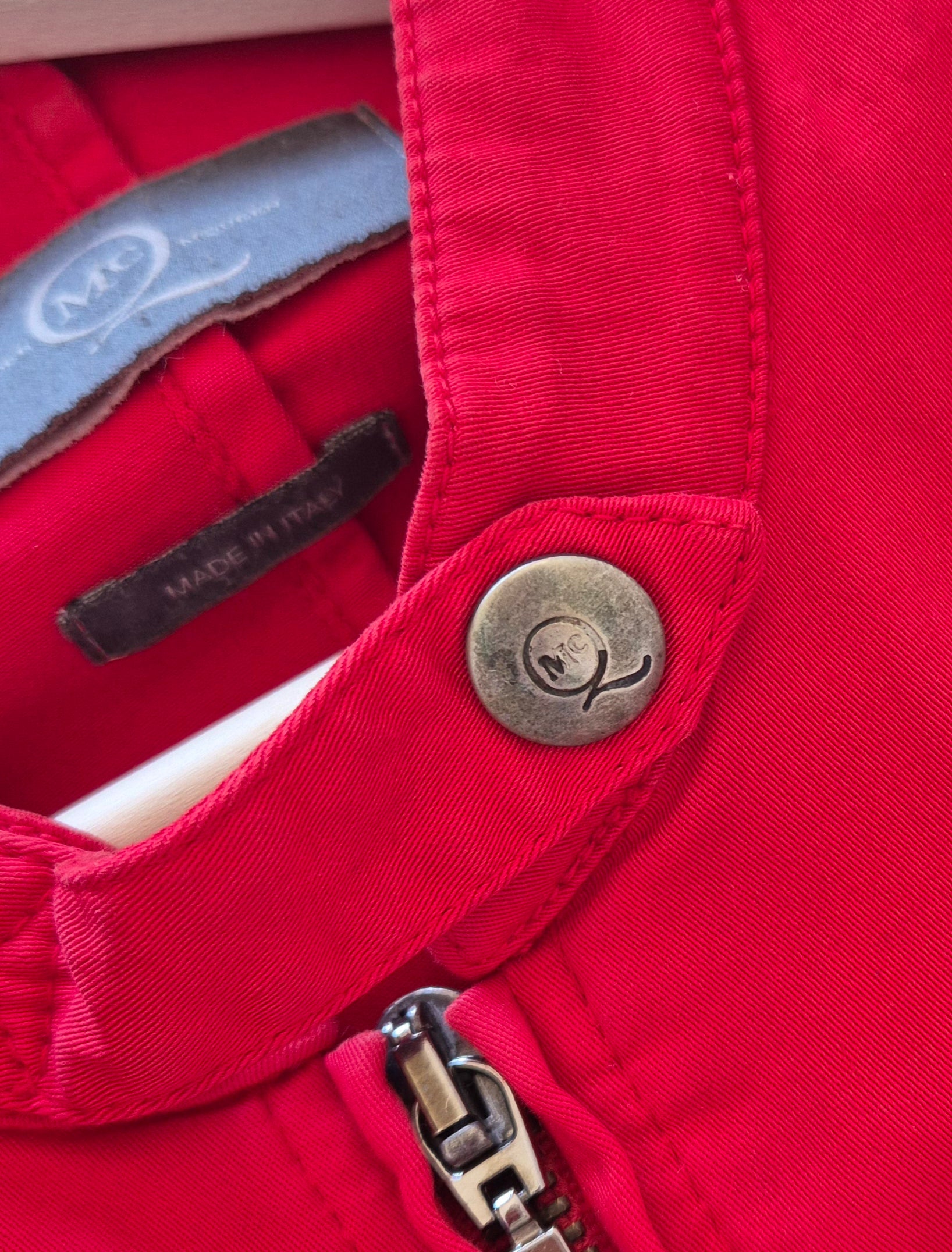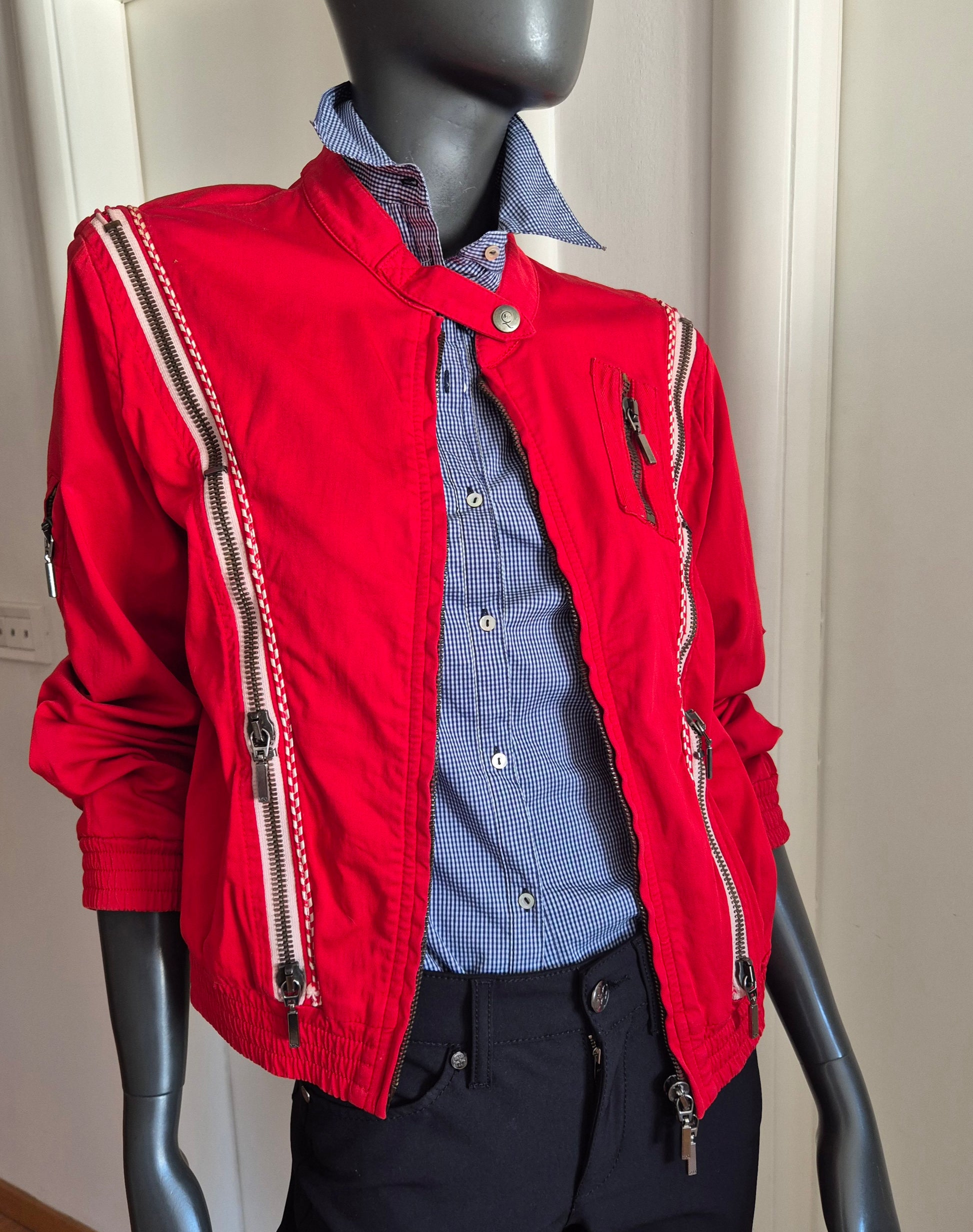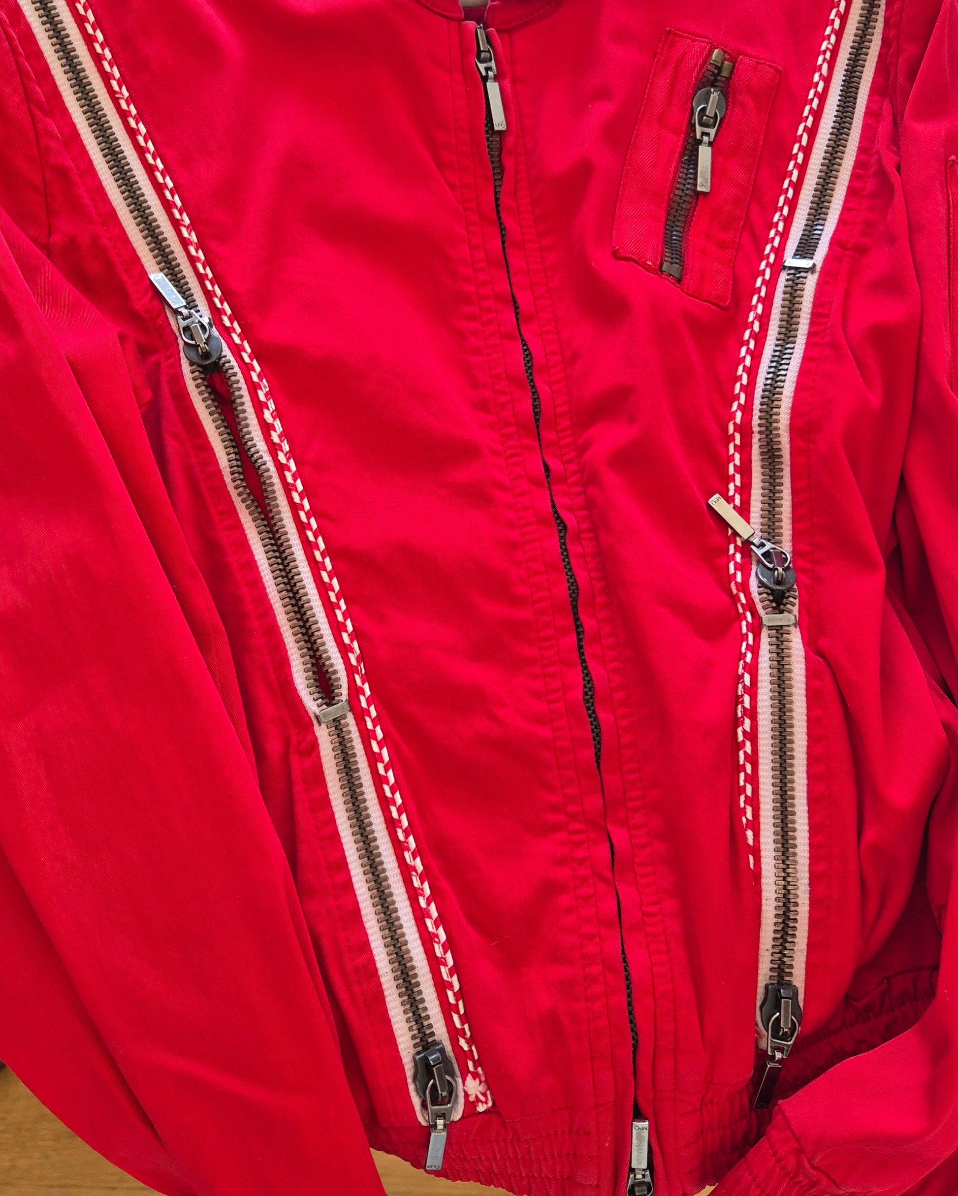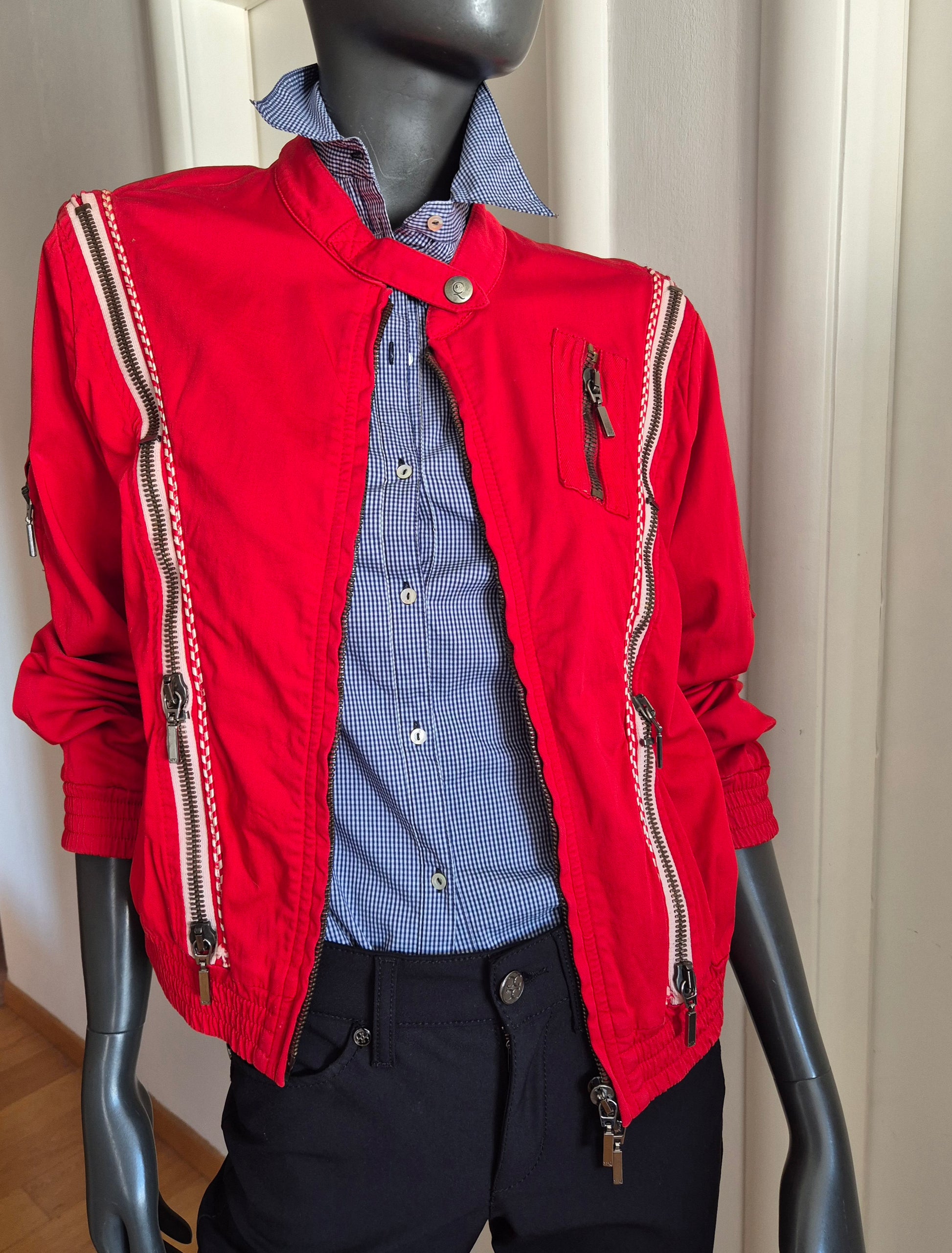 Dizajnerska jakna, Alexander McQueen. Pamučna (98% pamuk i 2% elastin), crvena. Zipovi kao detalji (mogu se otvarati i zatvarati). Veoma efektna 👌