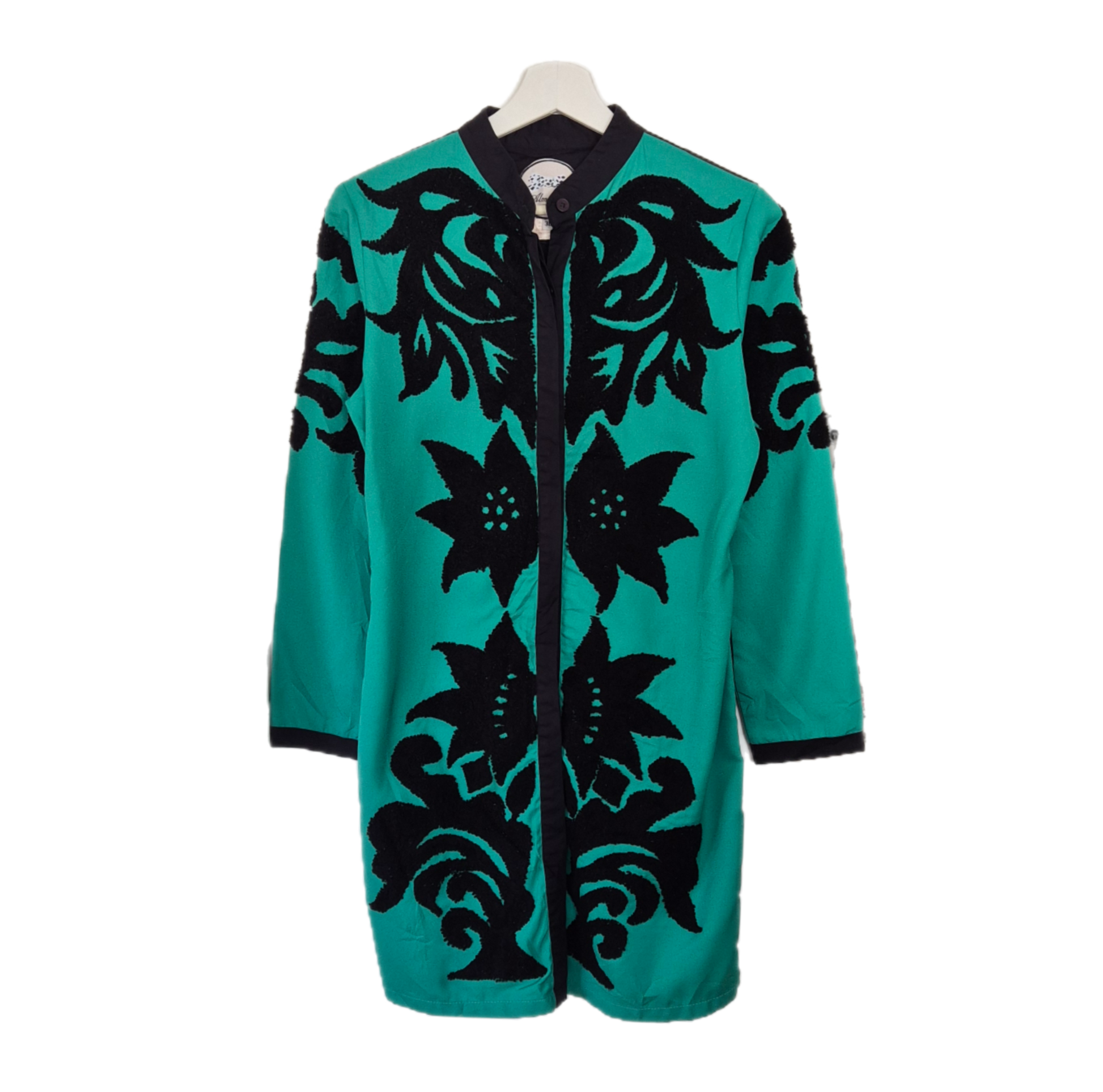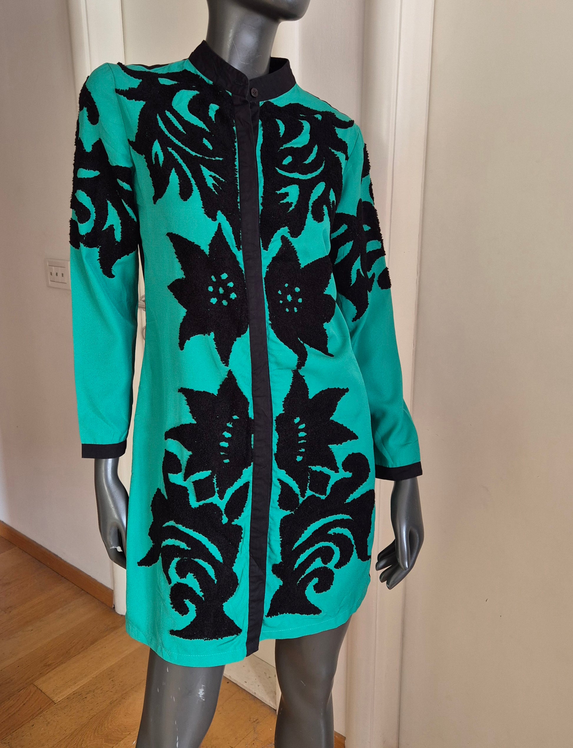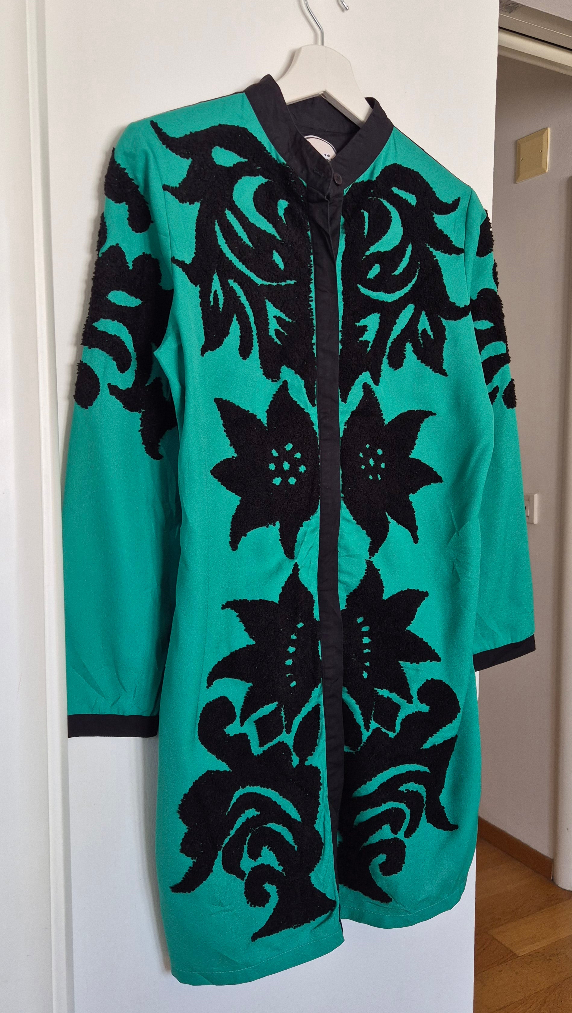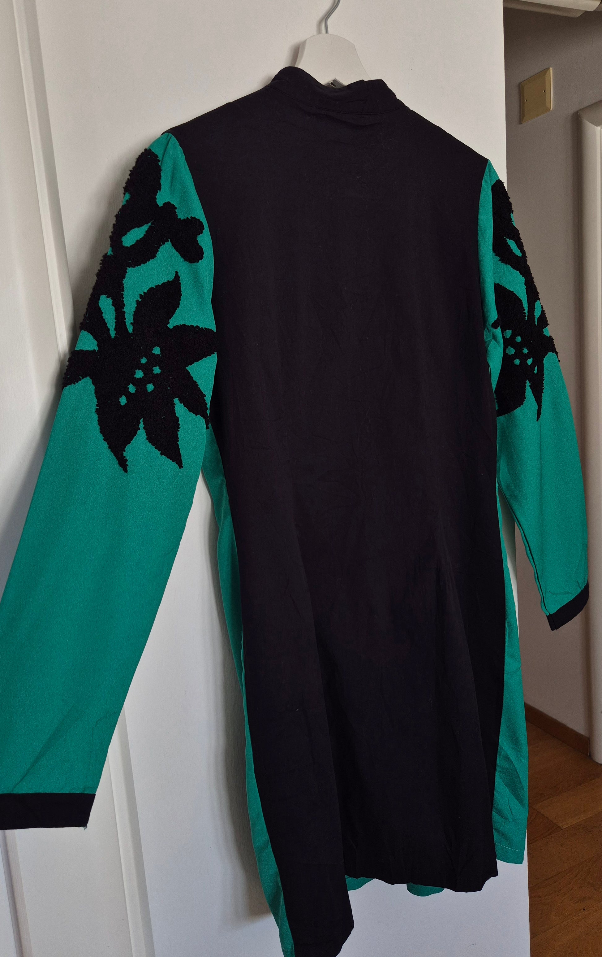 Posebna haljina španjolskog brenda Almatrichi. Prednjica i rukavi zeleni s crnim kao bukle aplikacijama. Iza crni pamuk-popelin. Zeleni djelovi su vjerojatno poliester.
