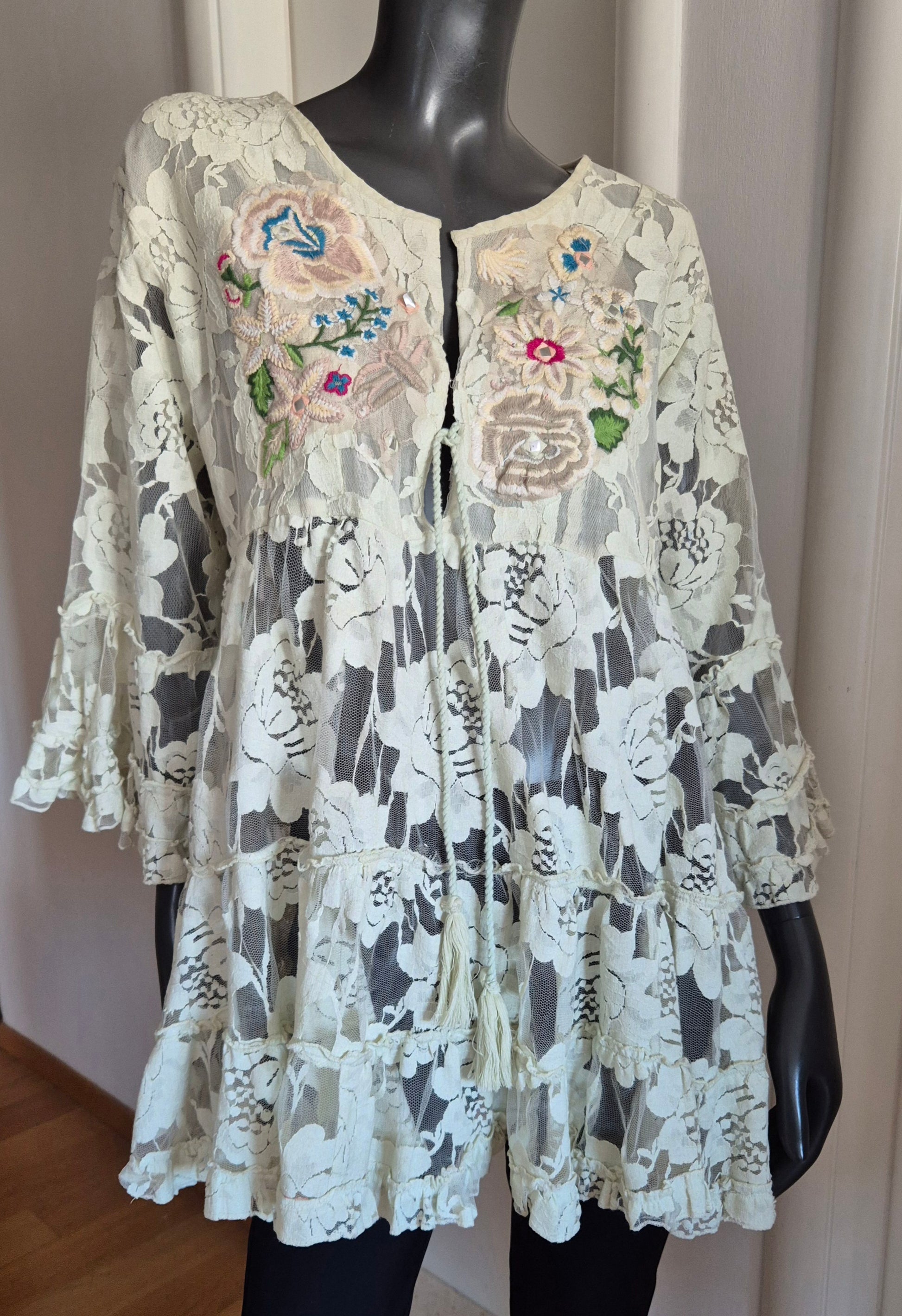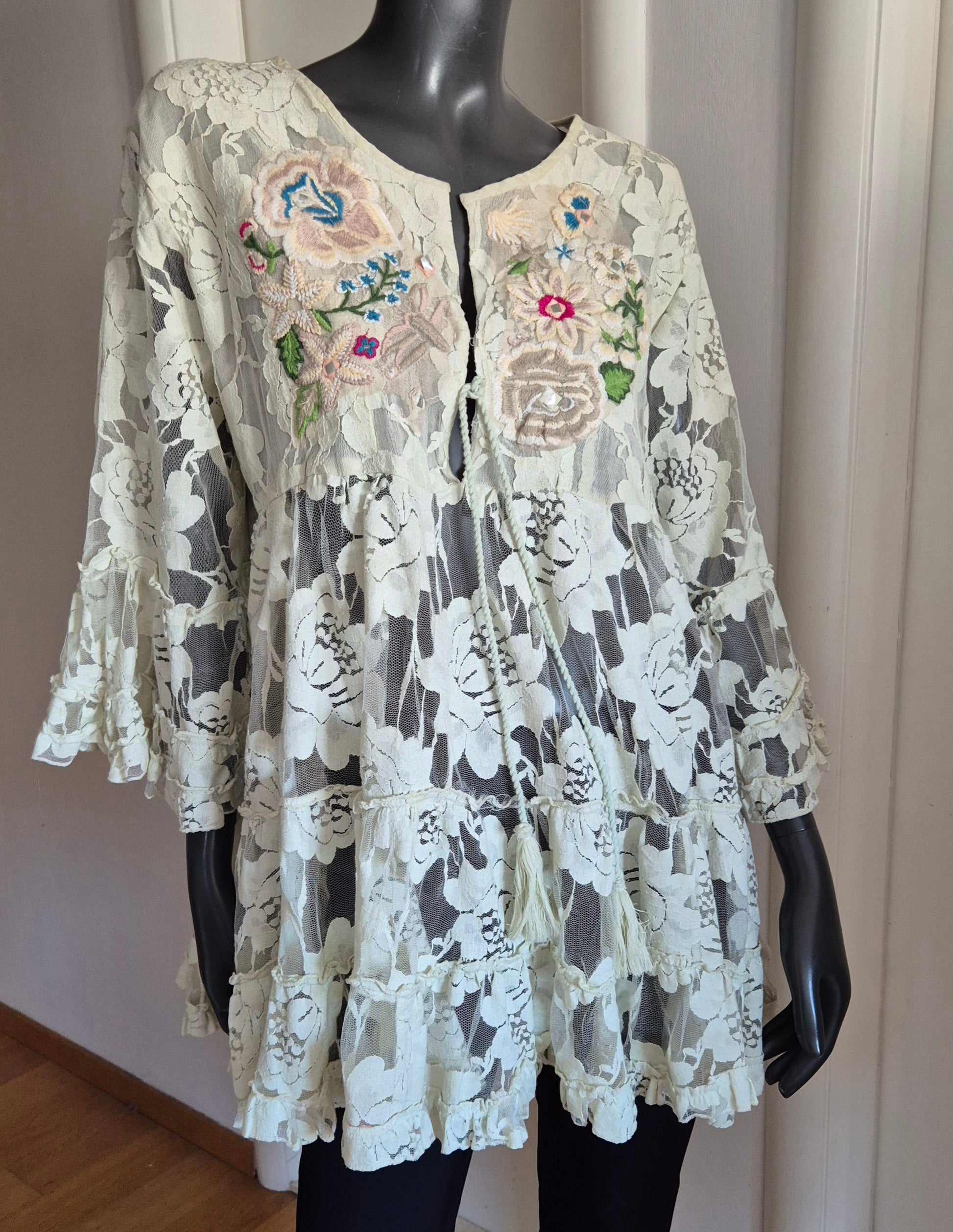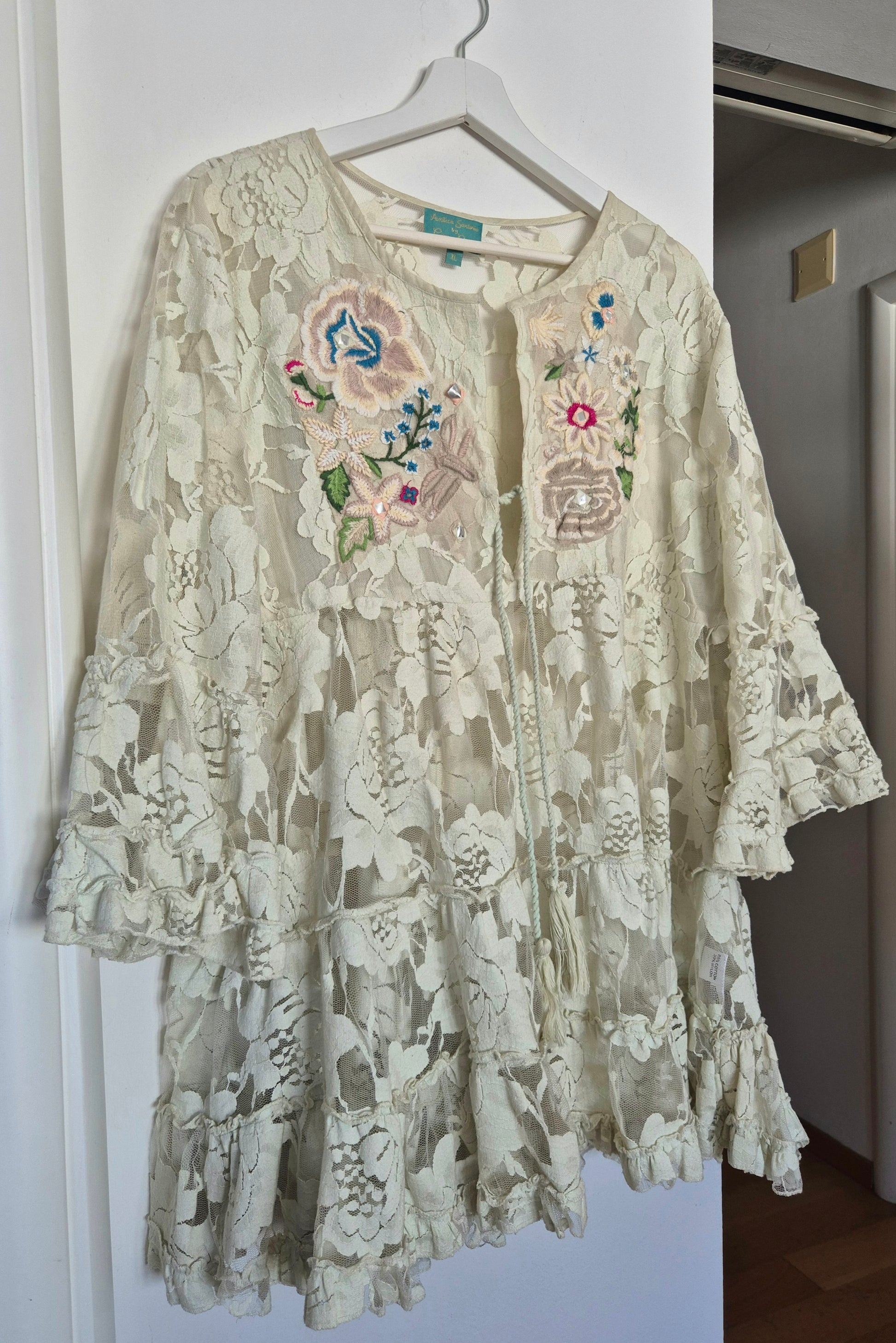 Antica Sartoria by Giacomo Cinque tunika ili haljina. Čipka s vezom, A-kroj, volani. Boja je prljavobijela prema tamno beige-maslinastoj. Flowy komad koji može biti i oversize.