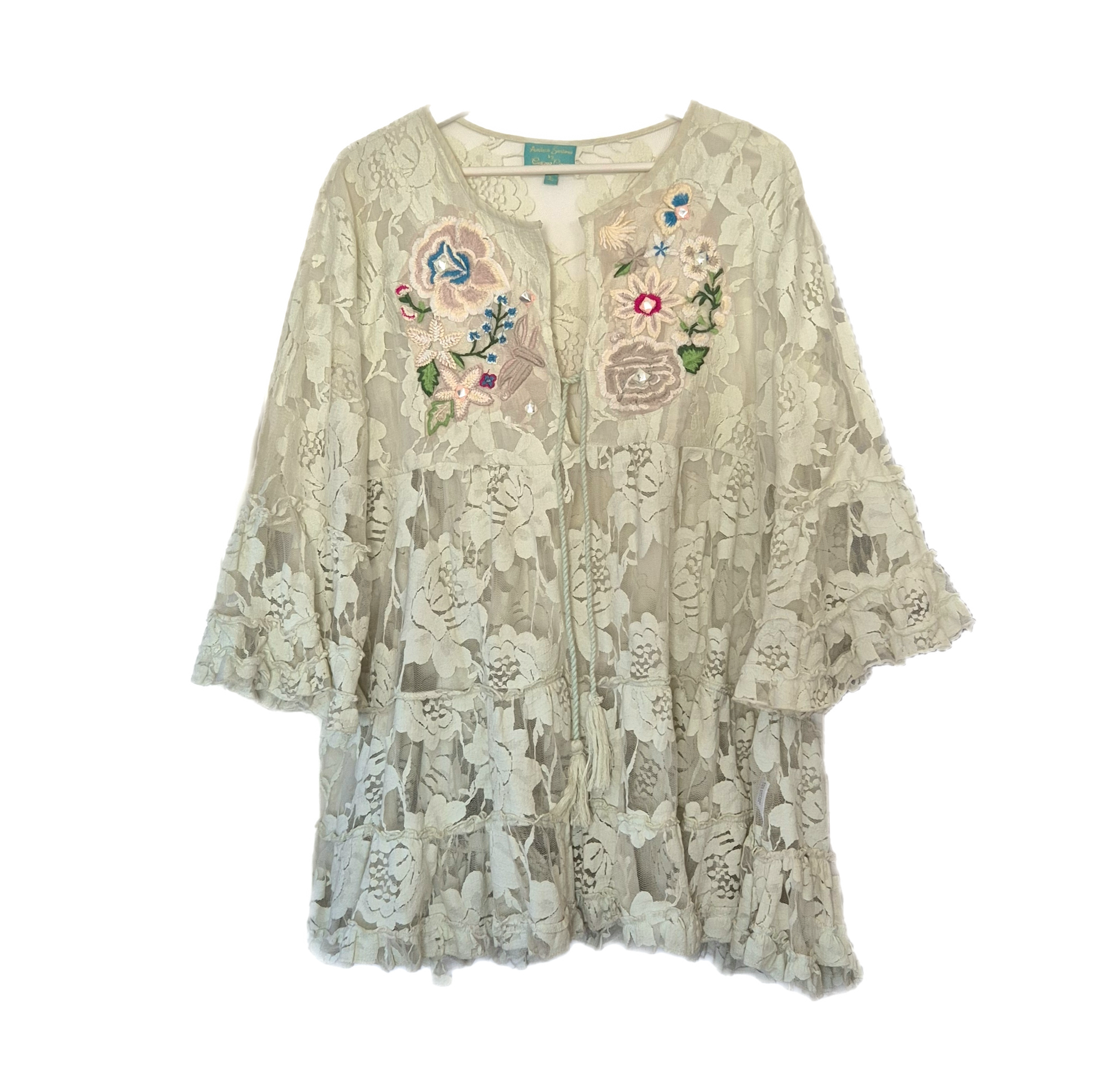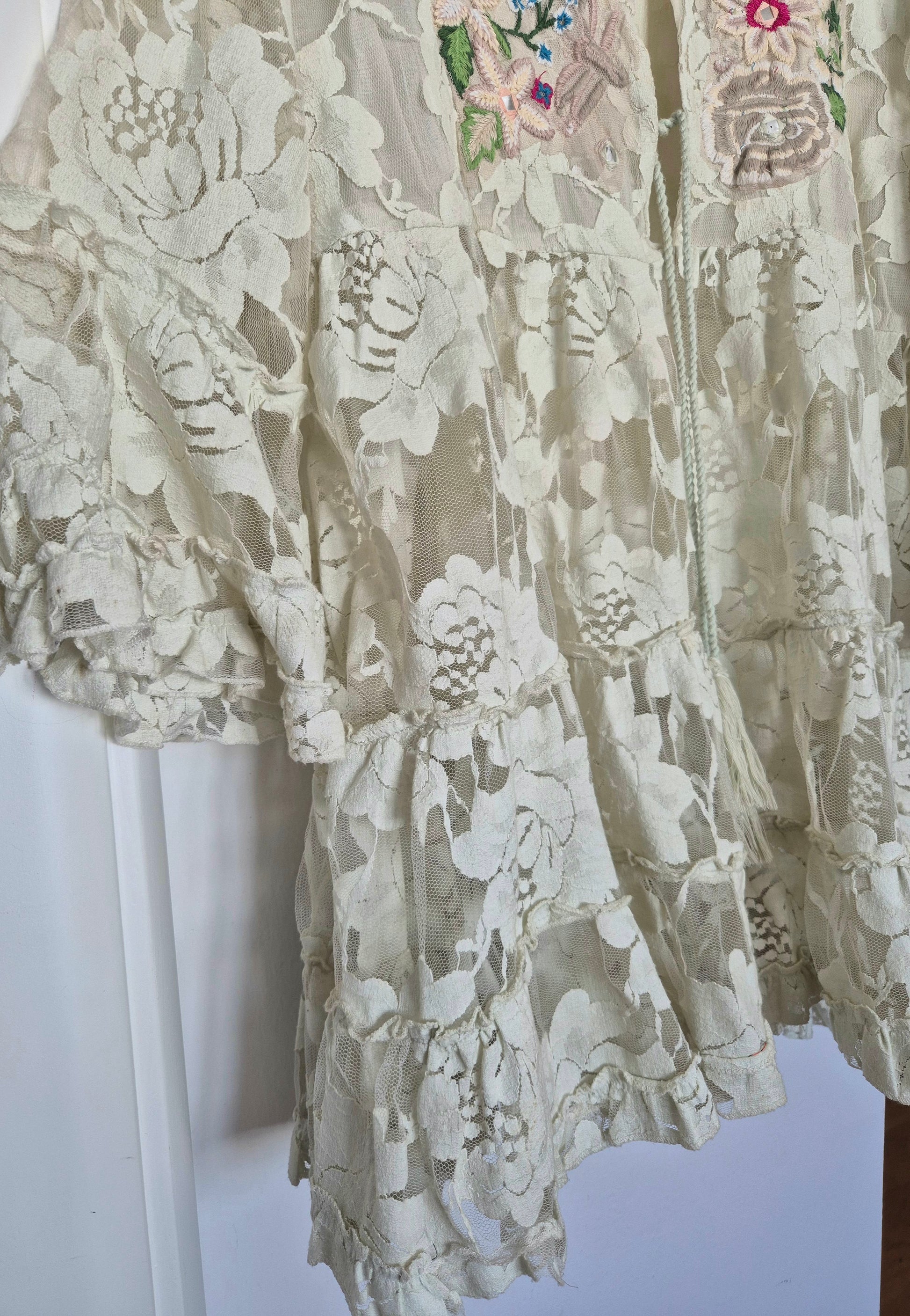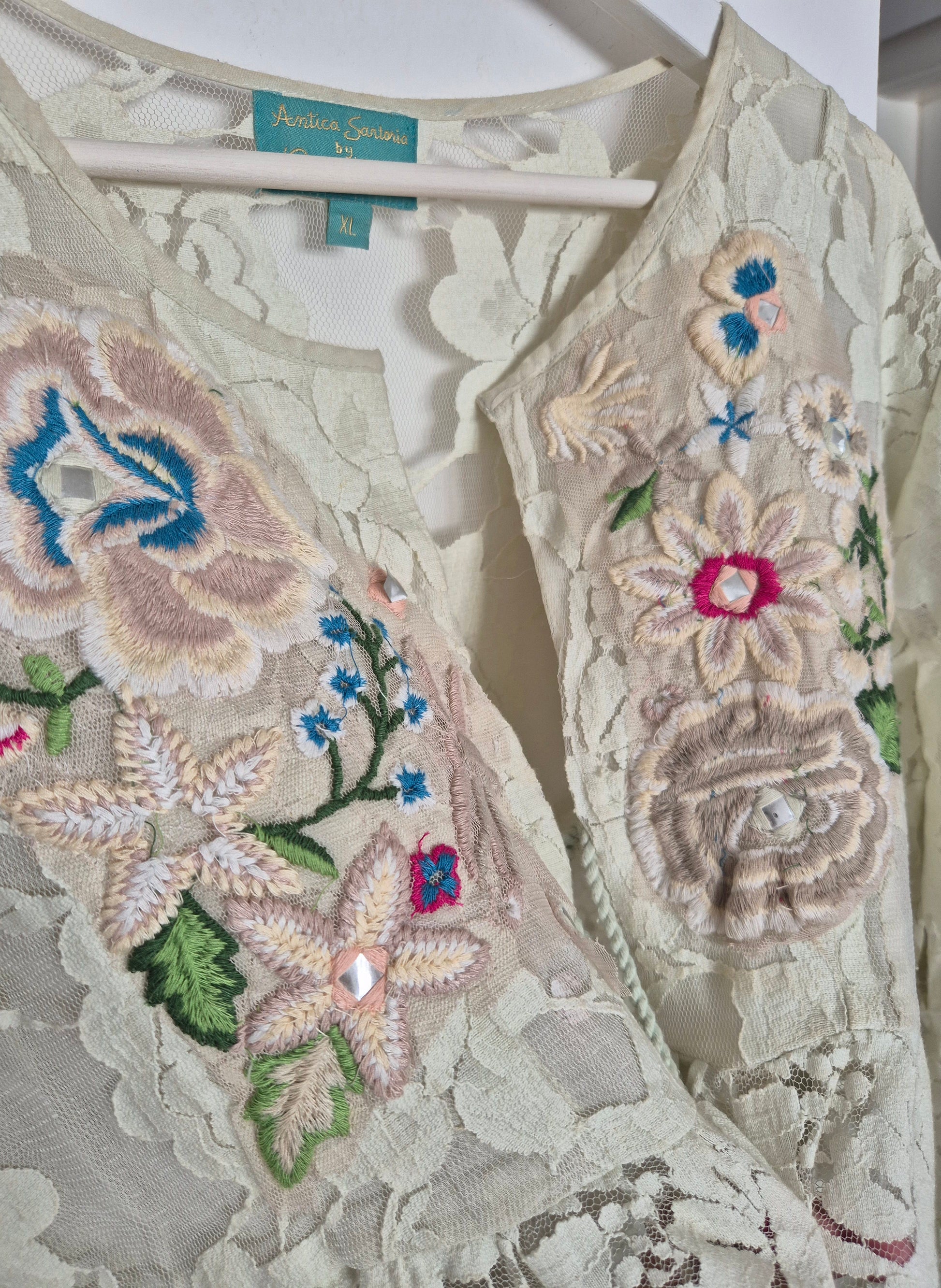 Antica Sartoria by Giacomo Cinque tunika ili haljina. Čipka s vezom, A-kroj, volani. Boja je prljavobijela prema tamno beige-maslinastoj. Flowy komad koji može biti i oversize.