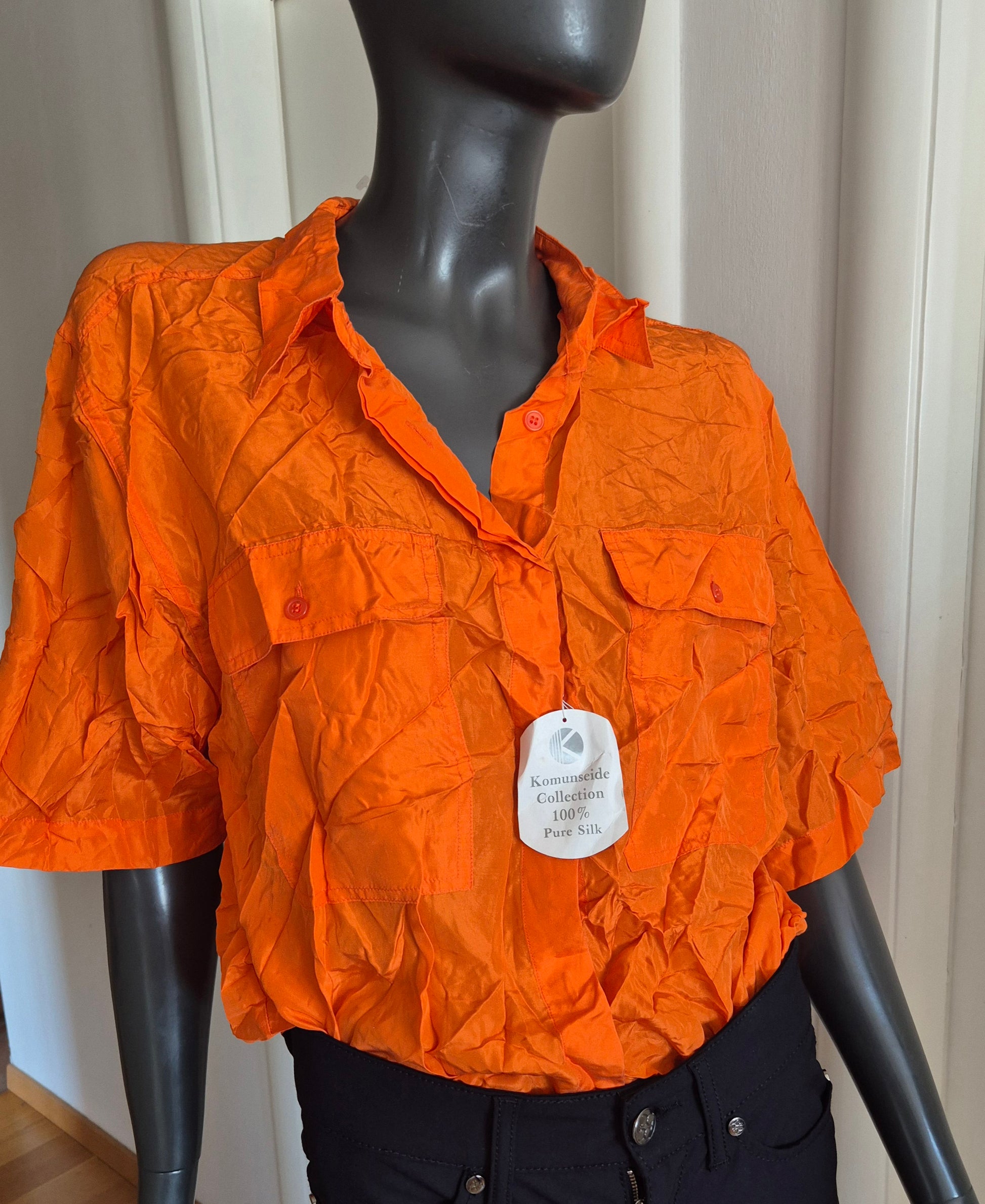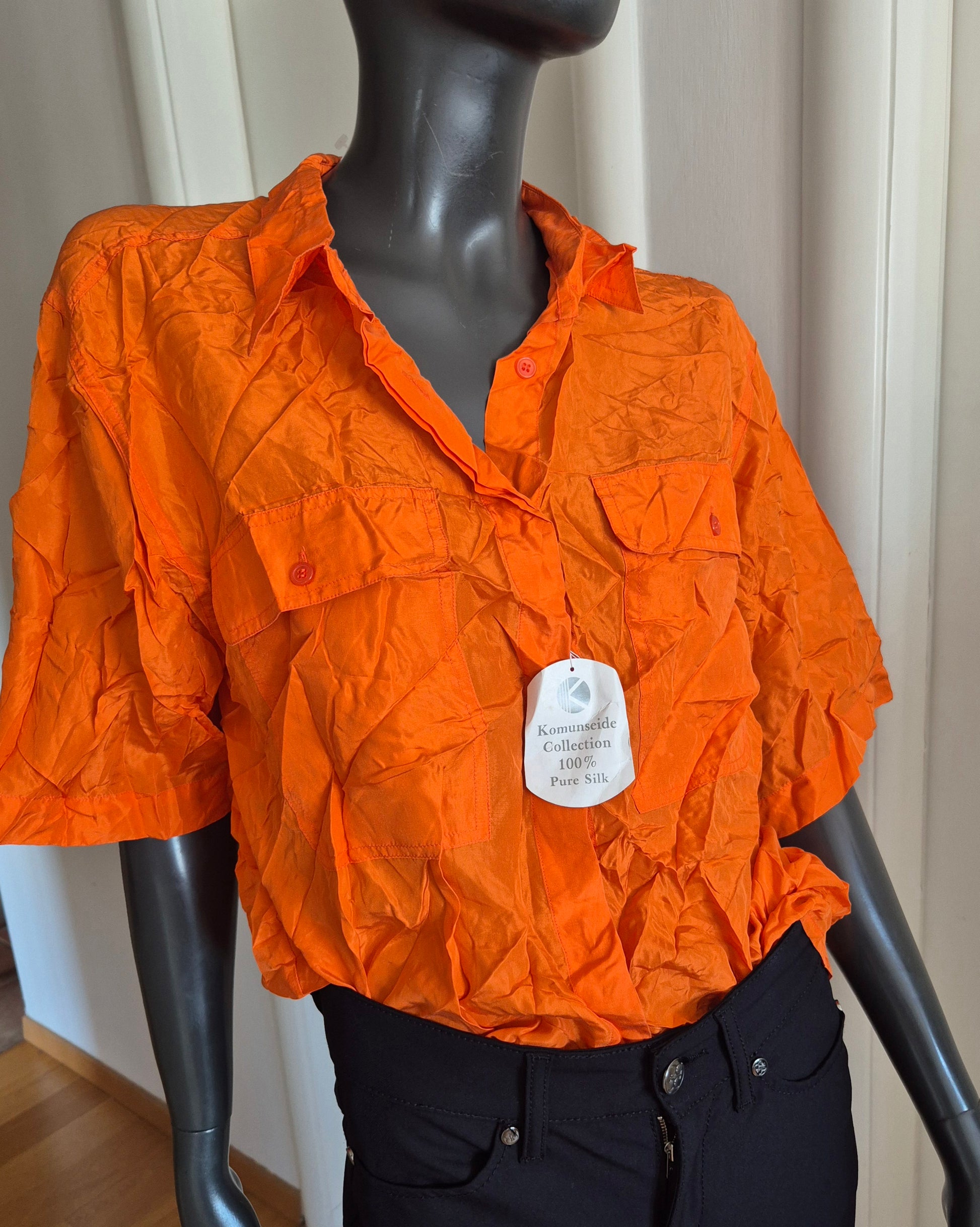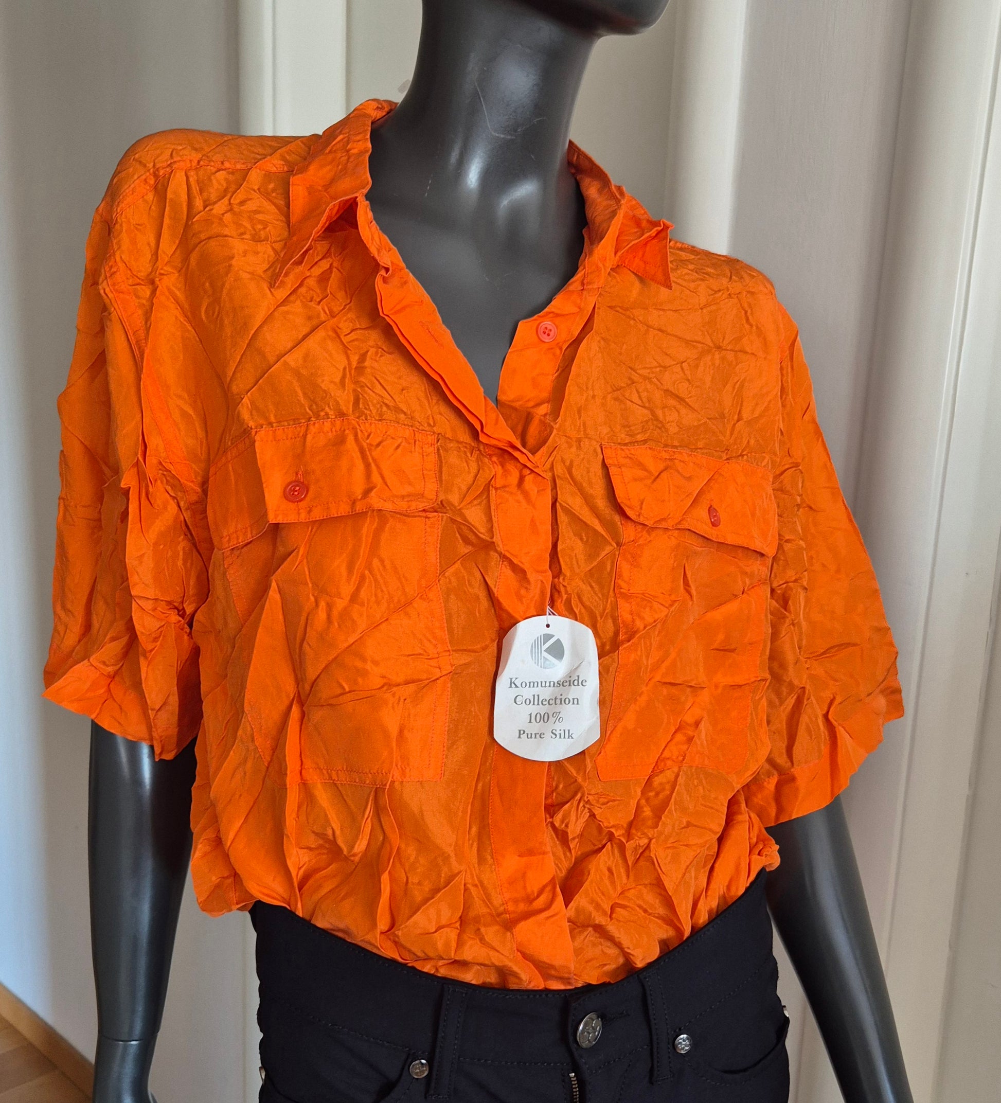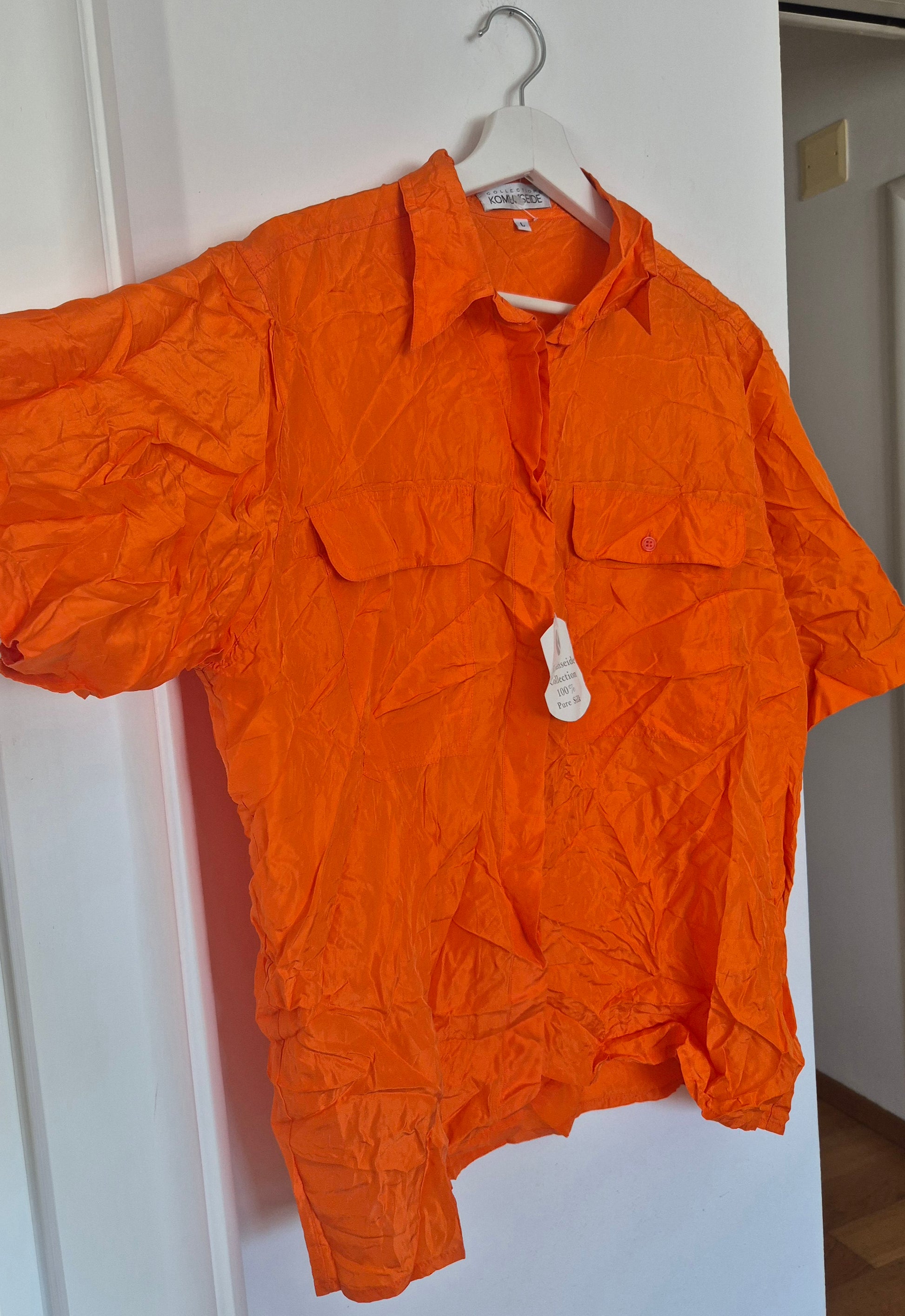 Nova košulja od čiste svile. Jako živa narančasta, divna! S etiketama. Nagužvana zbog pakiranja/transporta - može se za početak furati tako, a pranjem će postati obična glatka svila. Pranje je u hladnoj/mlakoj vodi i obavezno ručno.