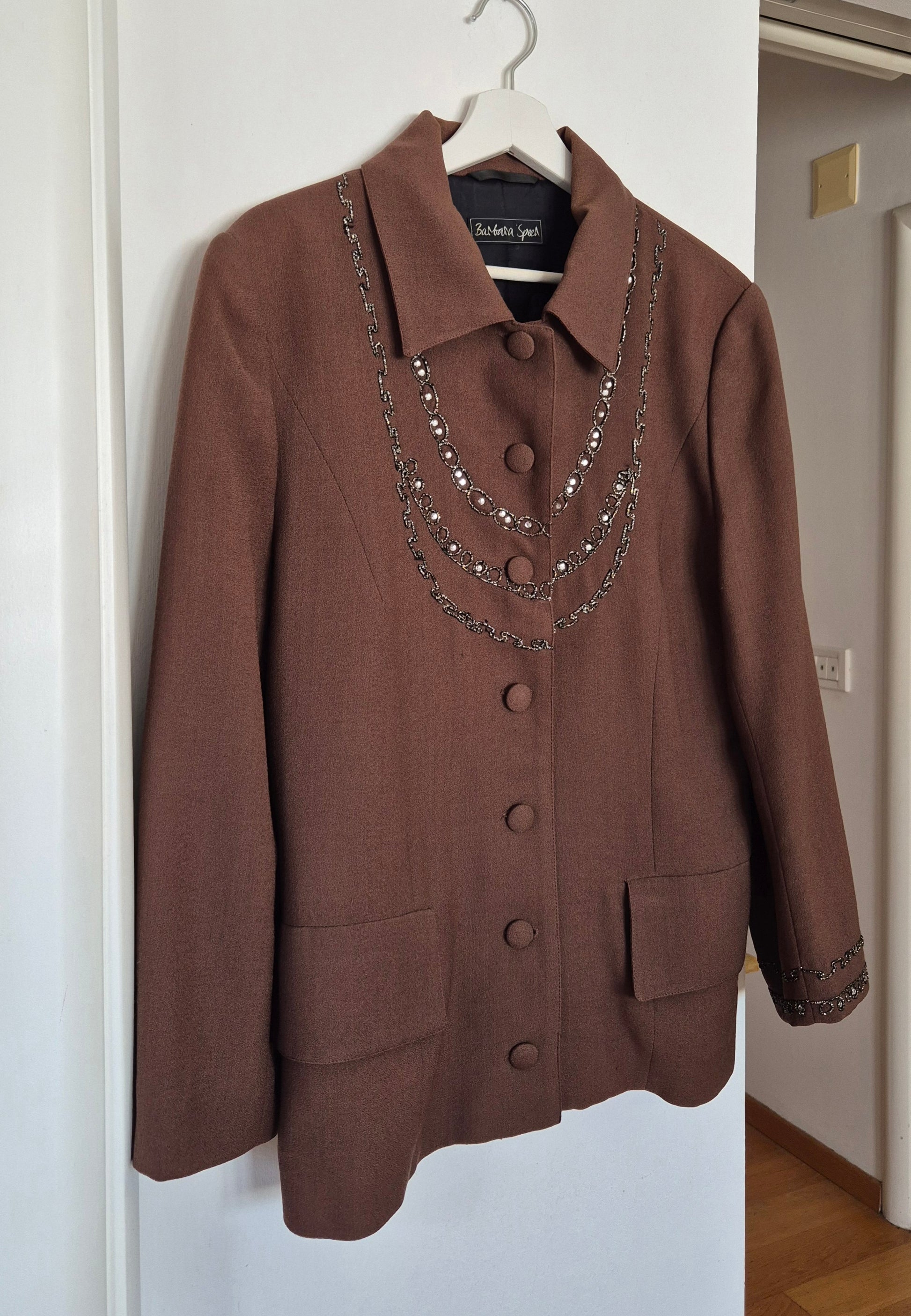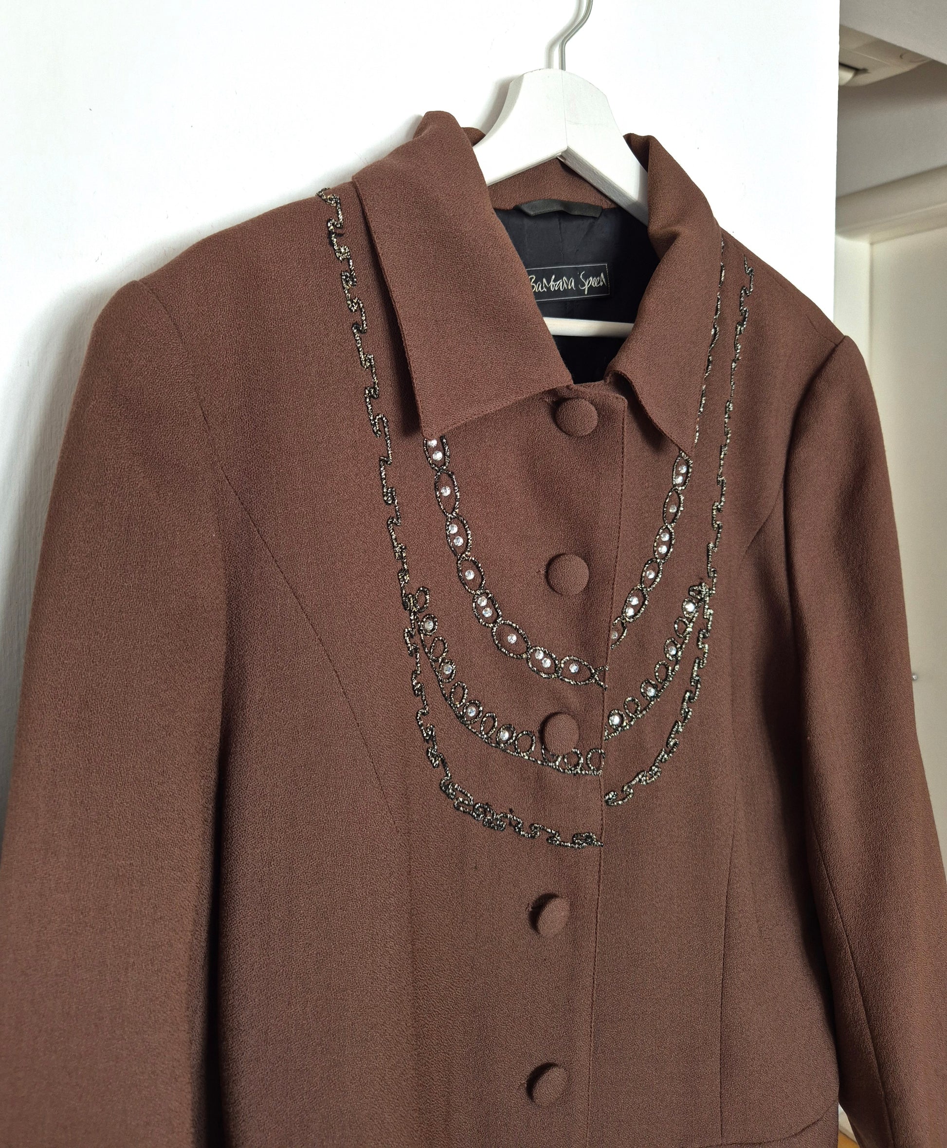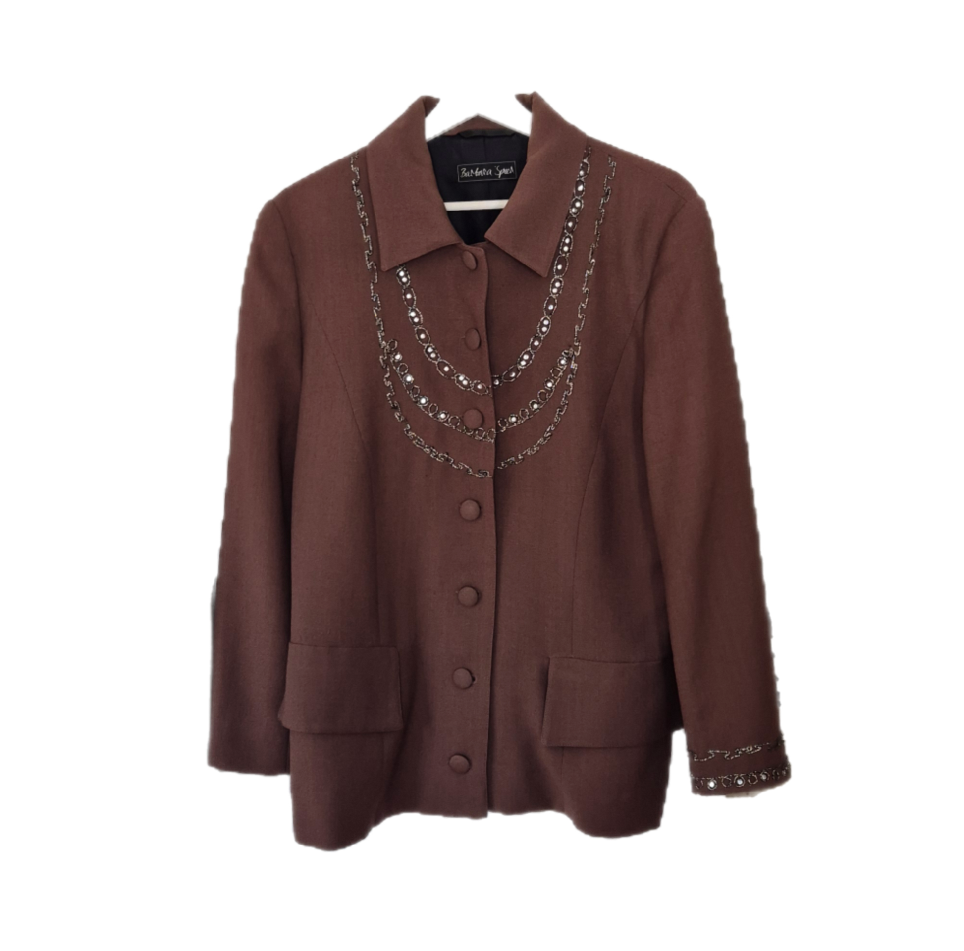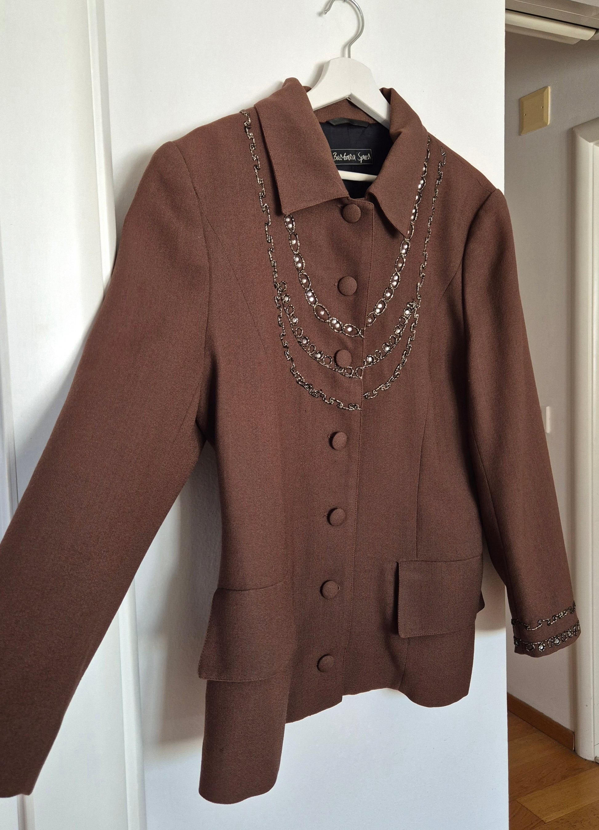 Smeđa jakna njemačke dizajnerice Barbare Speer. Neopisivo dobri uresi na prsima i jednom rukavu 🥰. Jako elegantna i posebna! Materijal je vjerojatno fina i tanka vuna.
