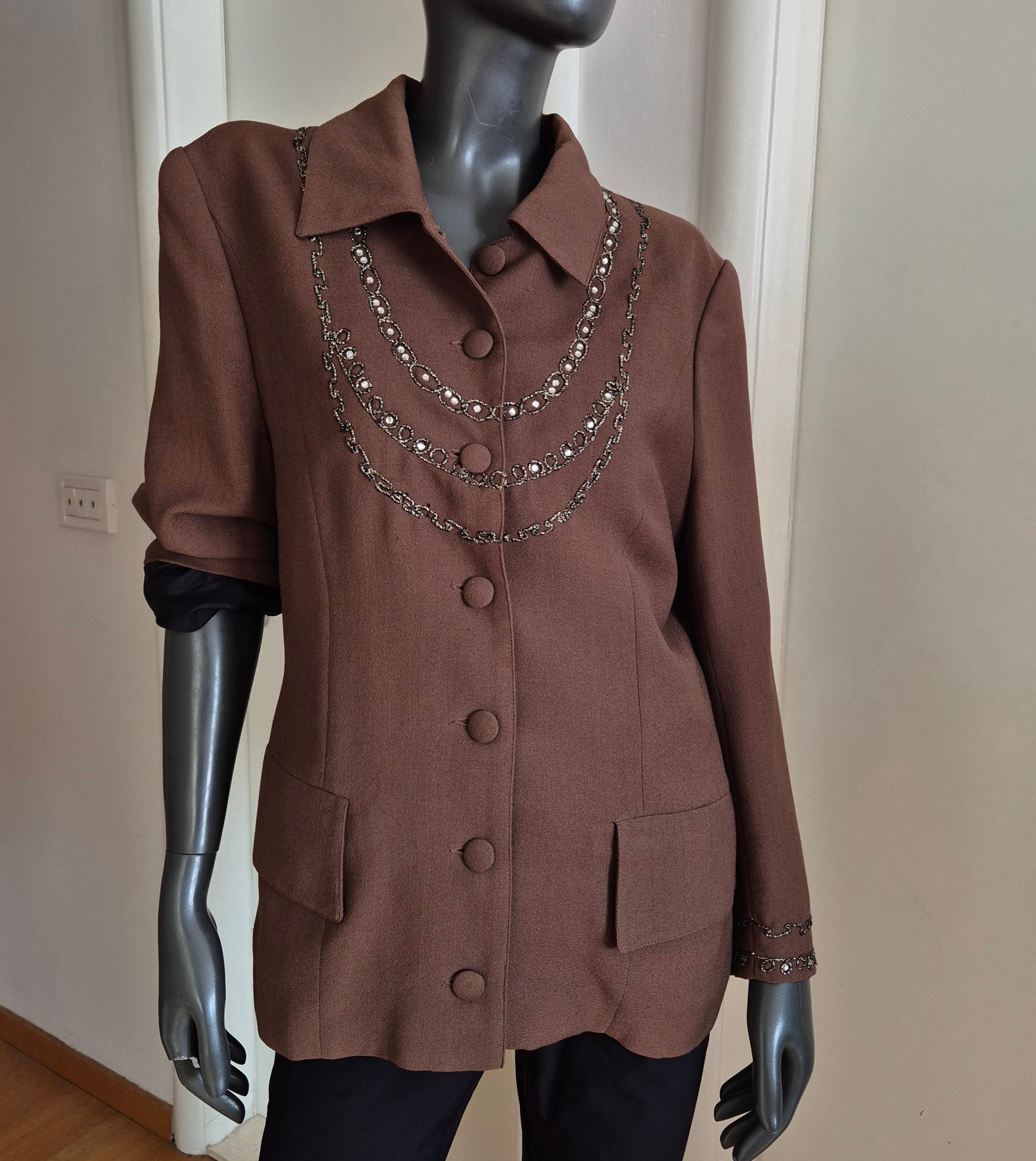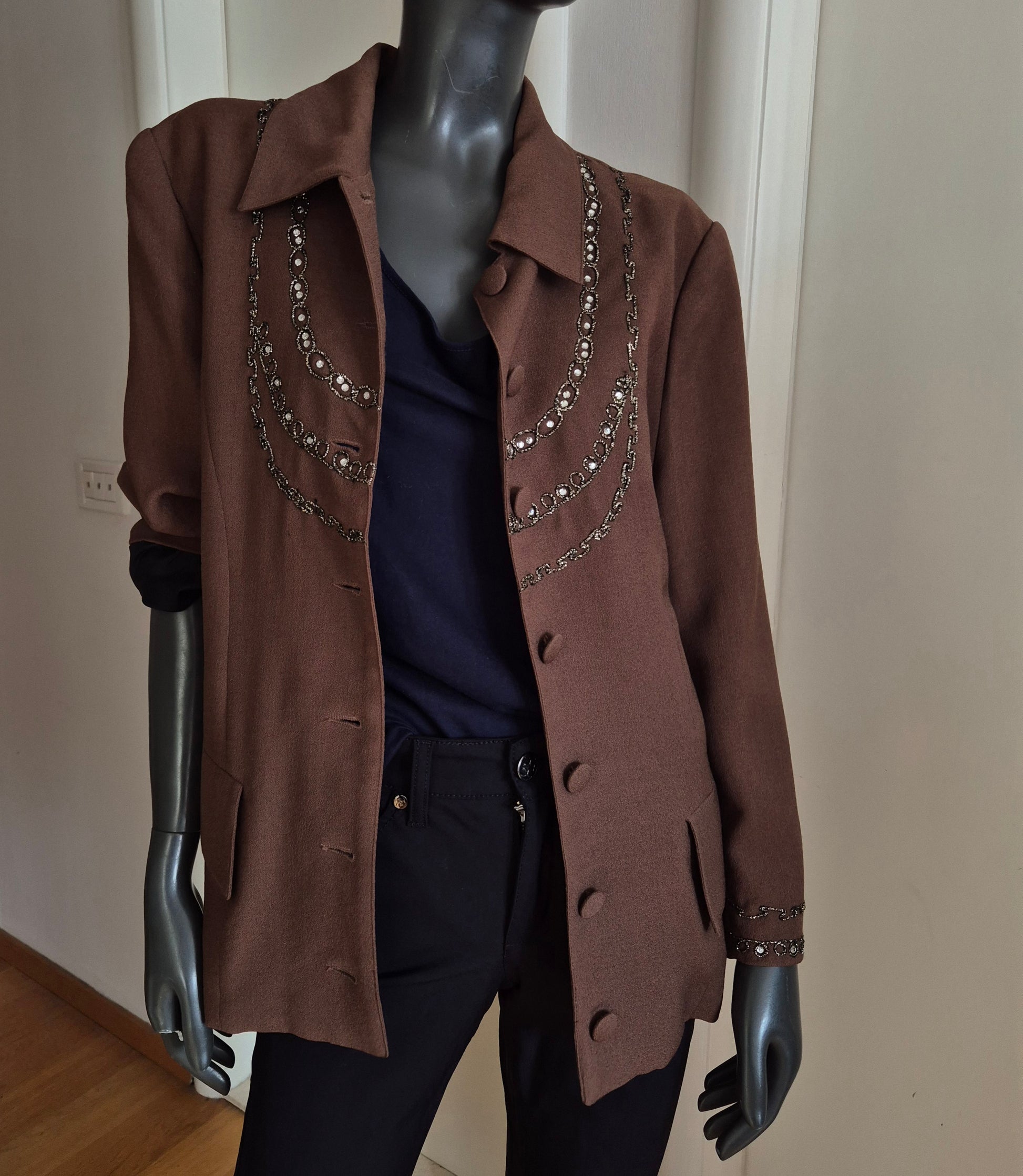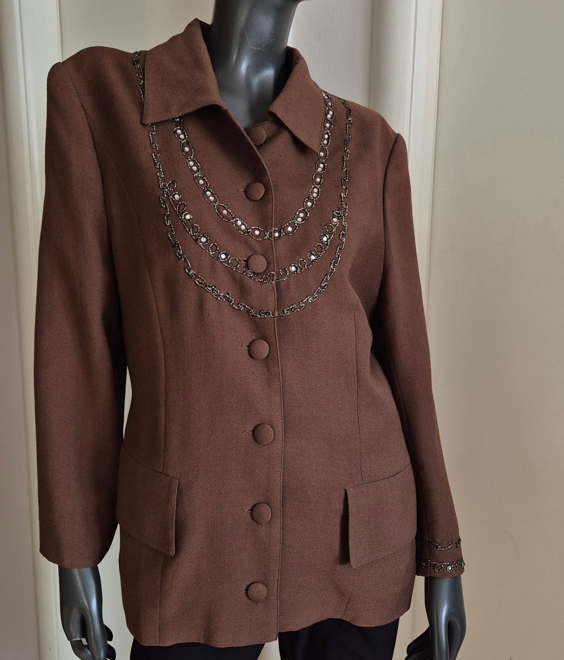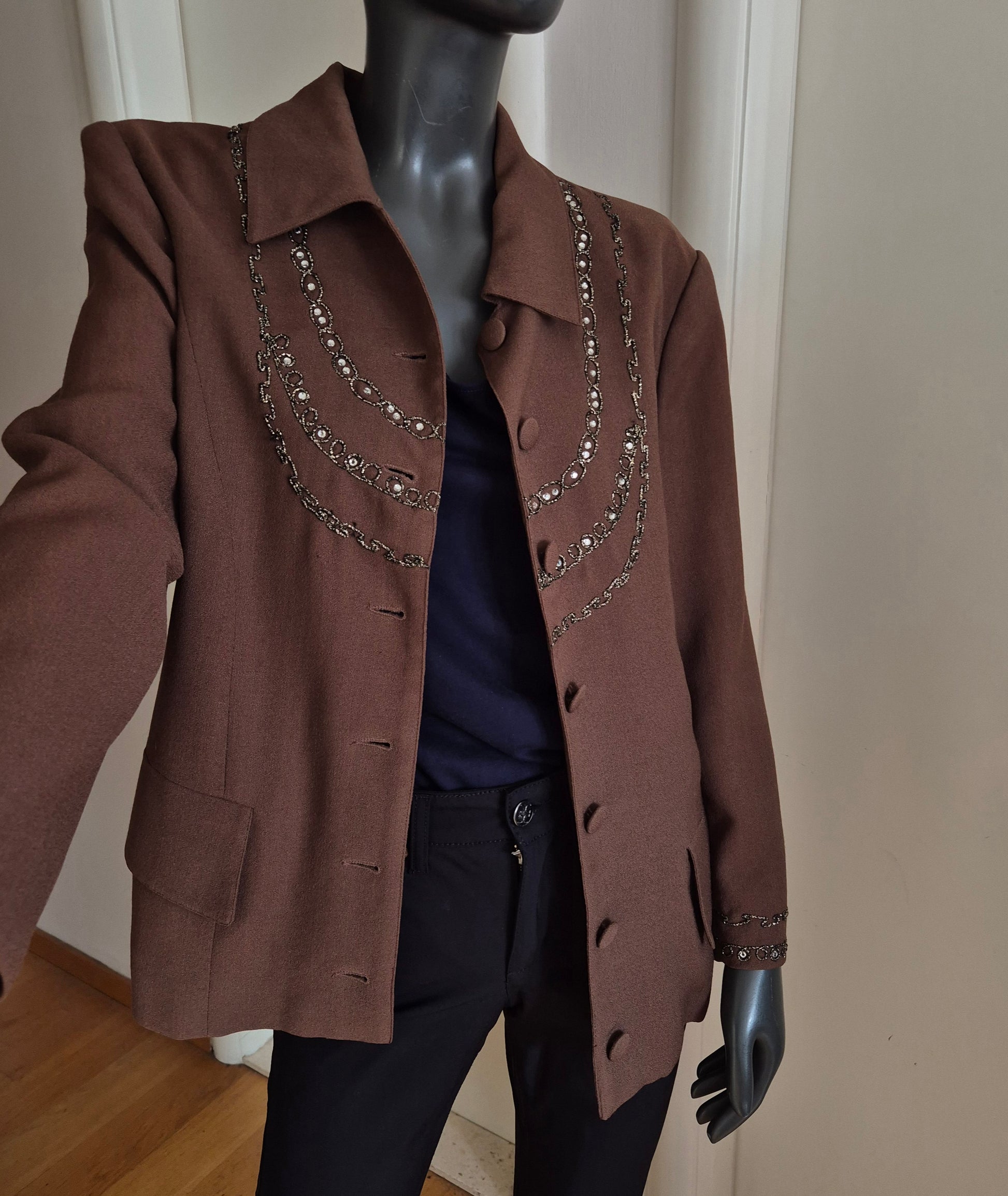Smeđa jakna njemačke dizajnerice Barbare Speer. Neopisivo dobri uresi na prsima i jednom rukavu 🥰. Jako elegantna i posebna! Materijal je vjerojatno fina i tanka vuna.