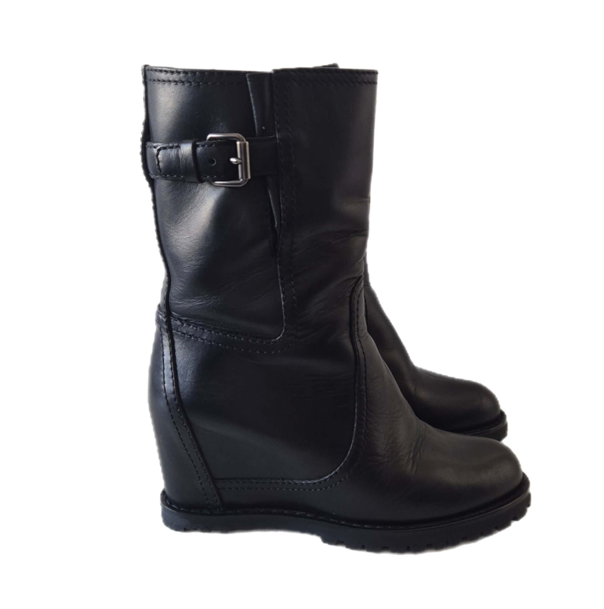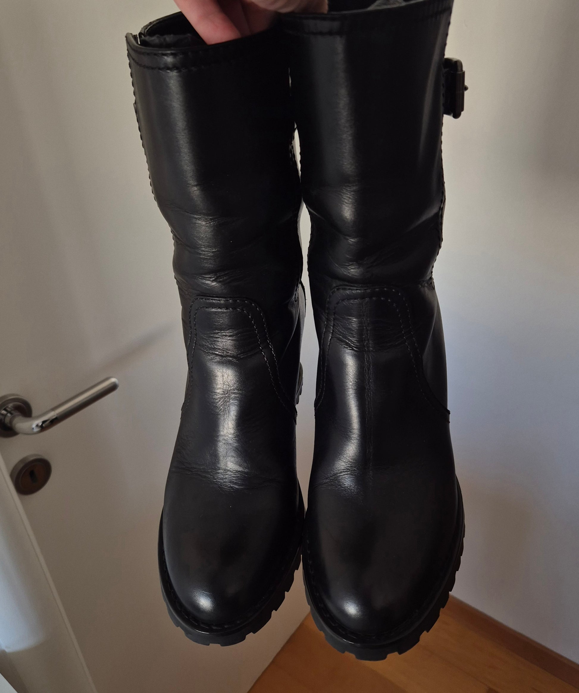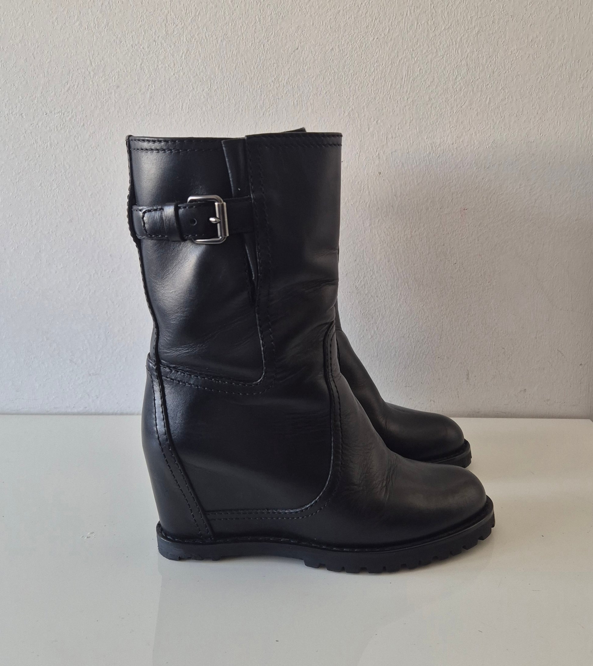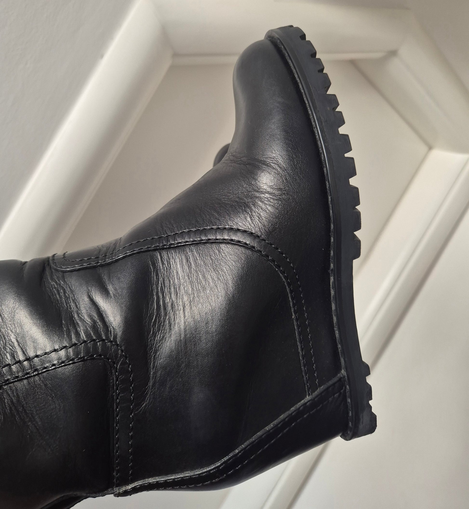 Čizme odličnog brenda Carshoe. Skrivena puna peta. Crna koža. Kao nove, doslovce, prošetane jednom/dvaput. S dust bag-om za svaku čizmu. Postoji i kutija, ali vjerojatno ne stane u paket :(
