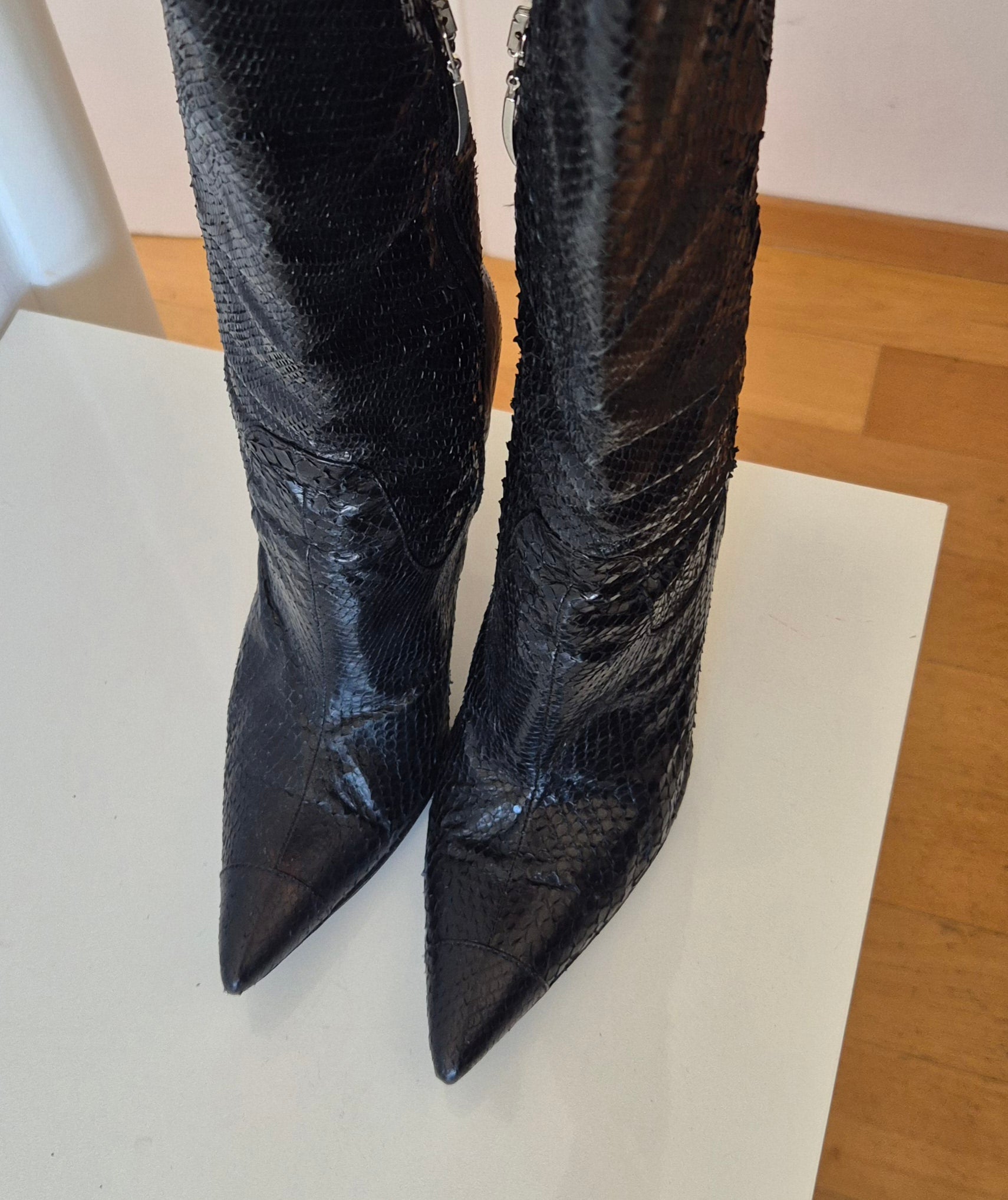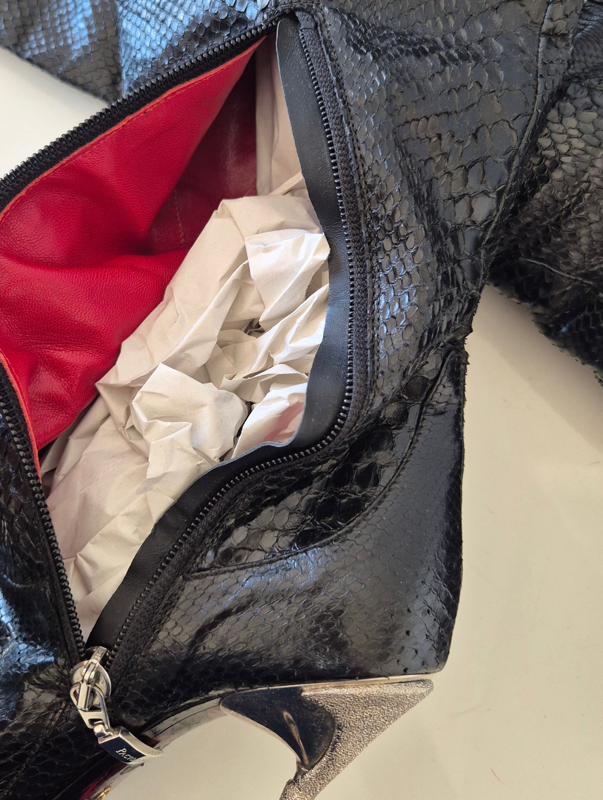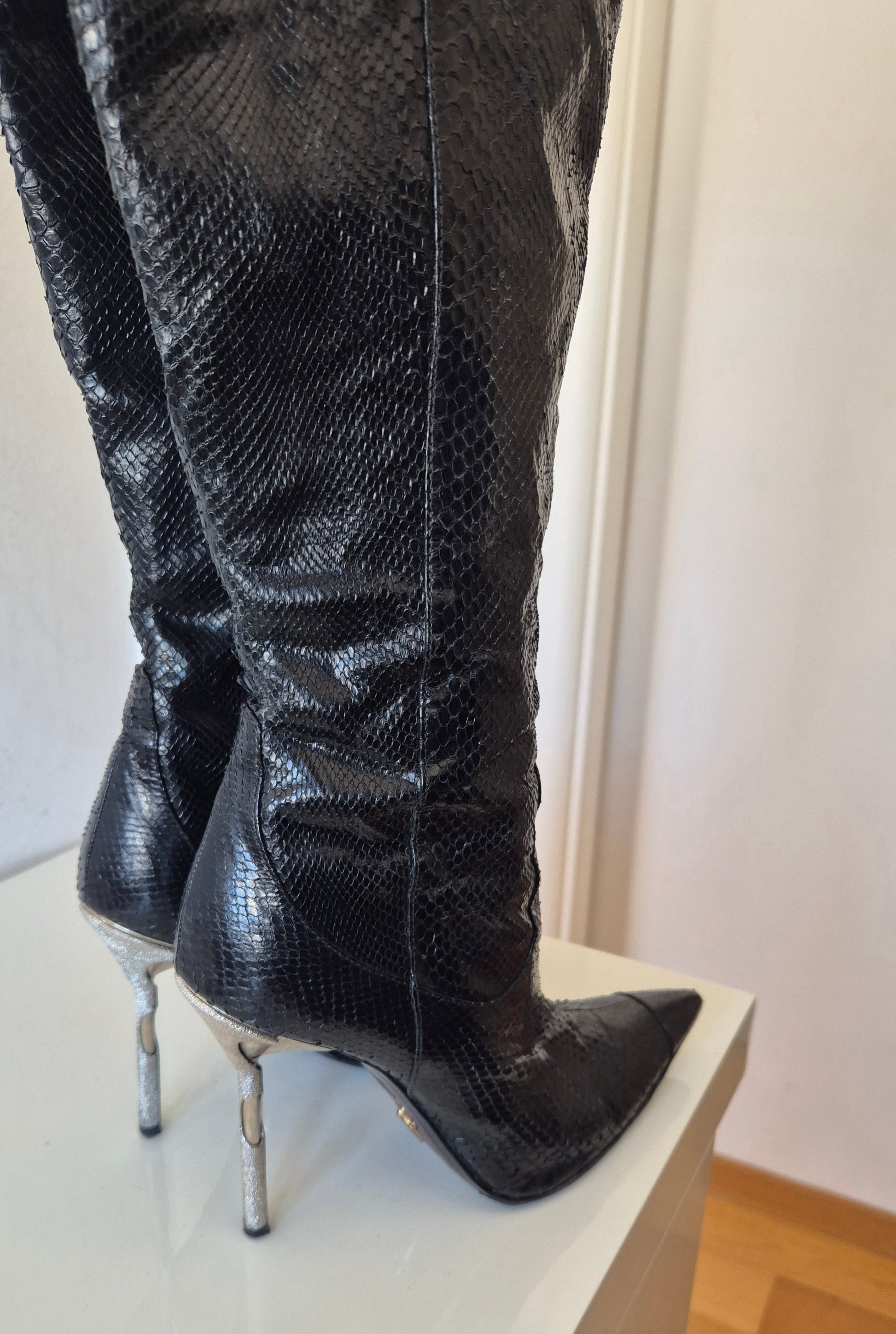 Paciotti visoke crne čizme od zmijske kože. Upečatljiva srebrna peta. Unutrašnjost od crvene kože. Kolekcionarski komad velike vrijednosti 😎. Redovna cijena oko 1700 €. Visina pete 10.5 cm.