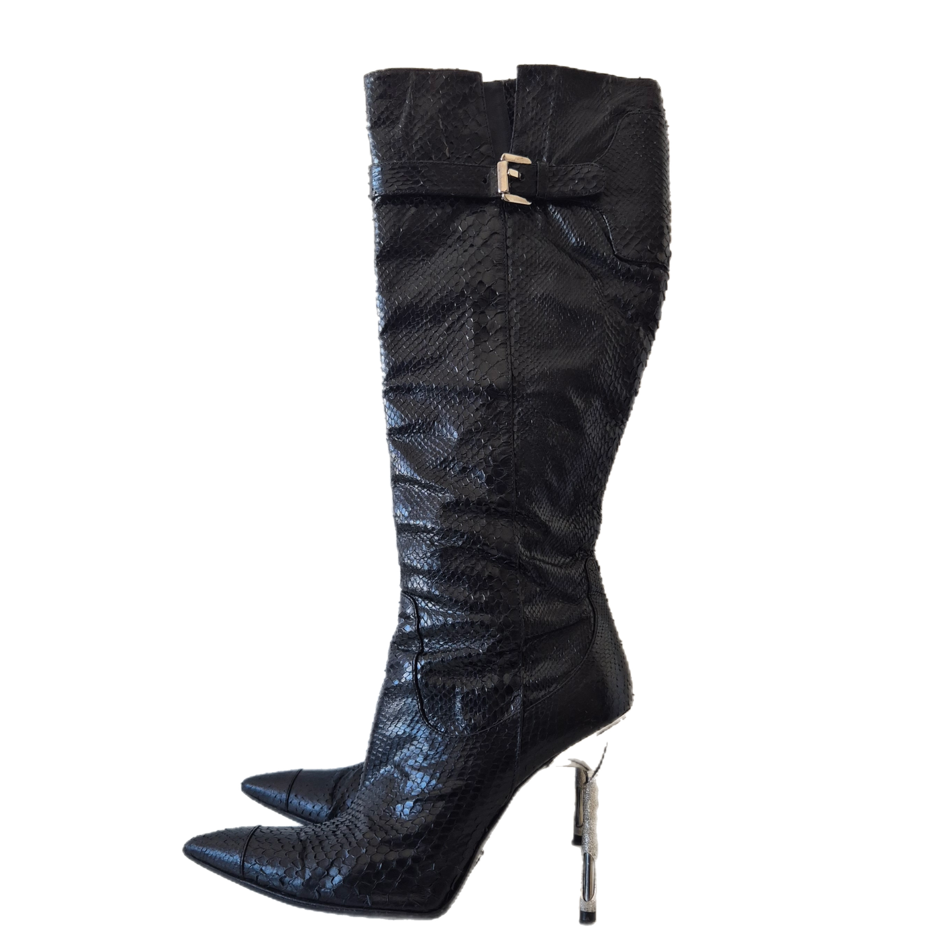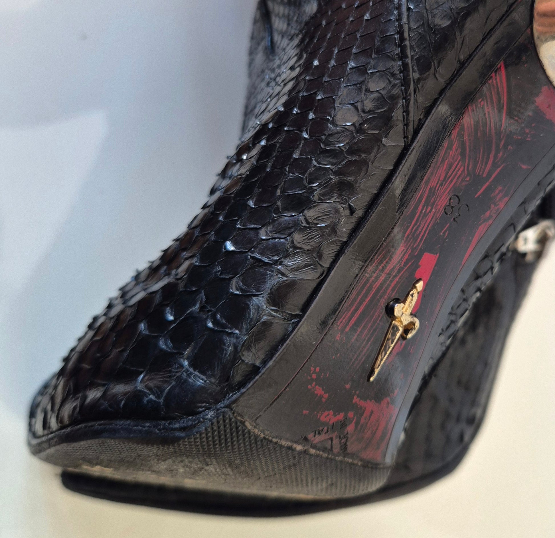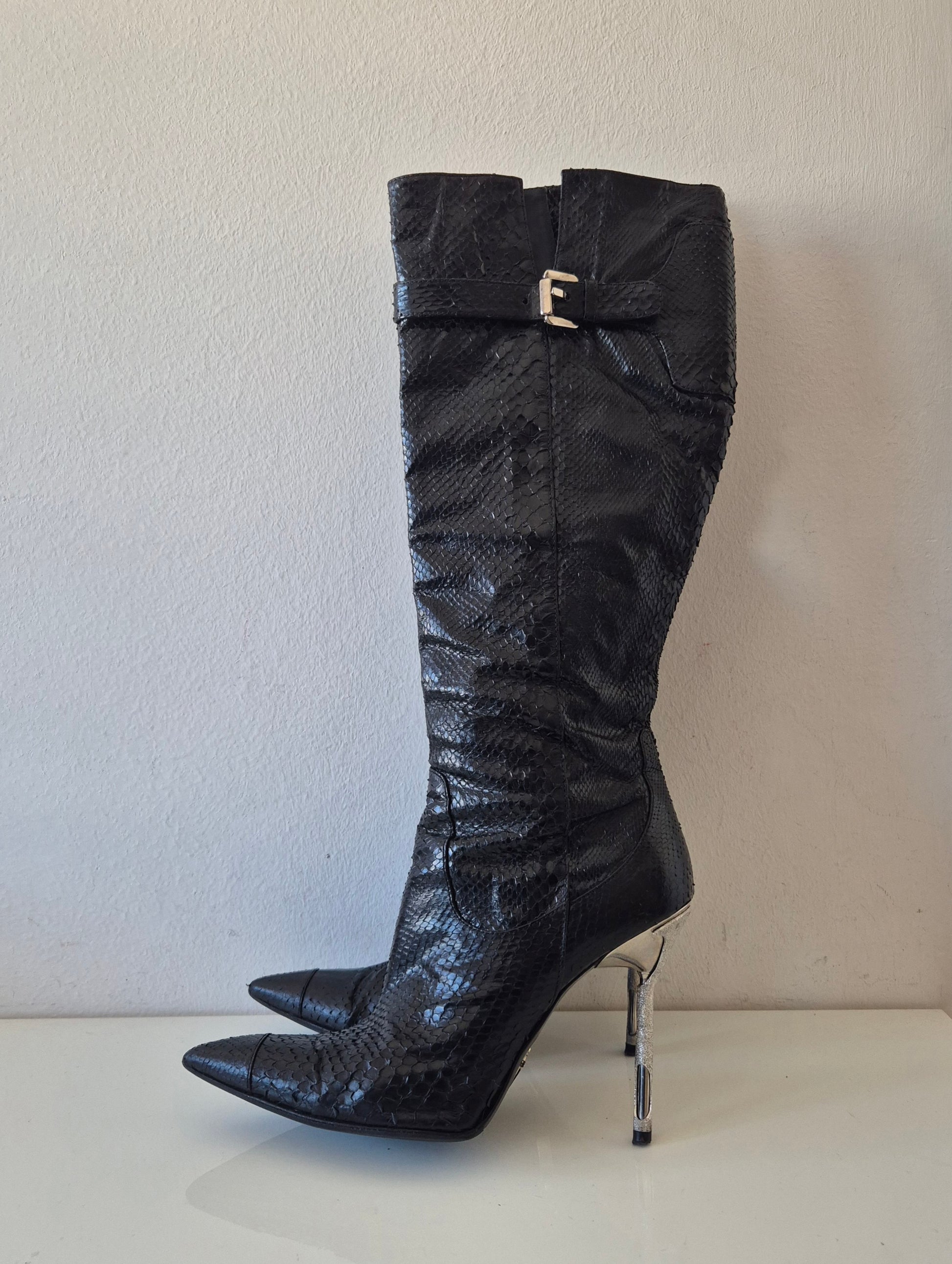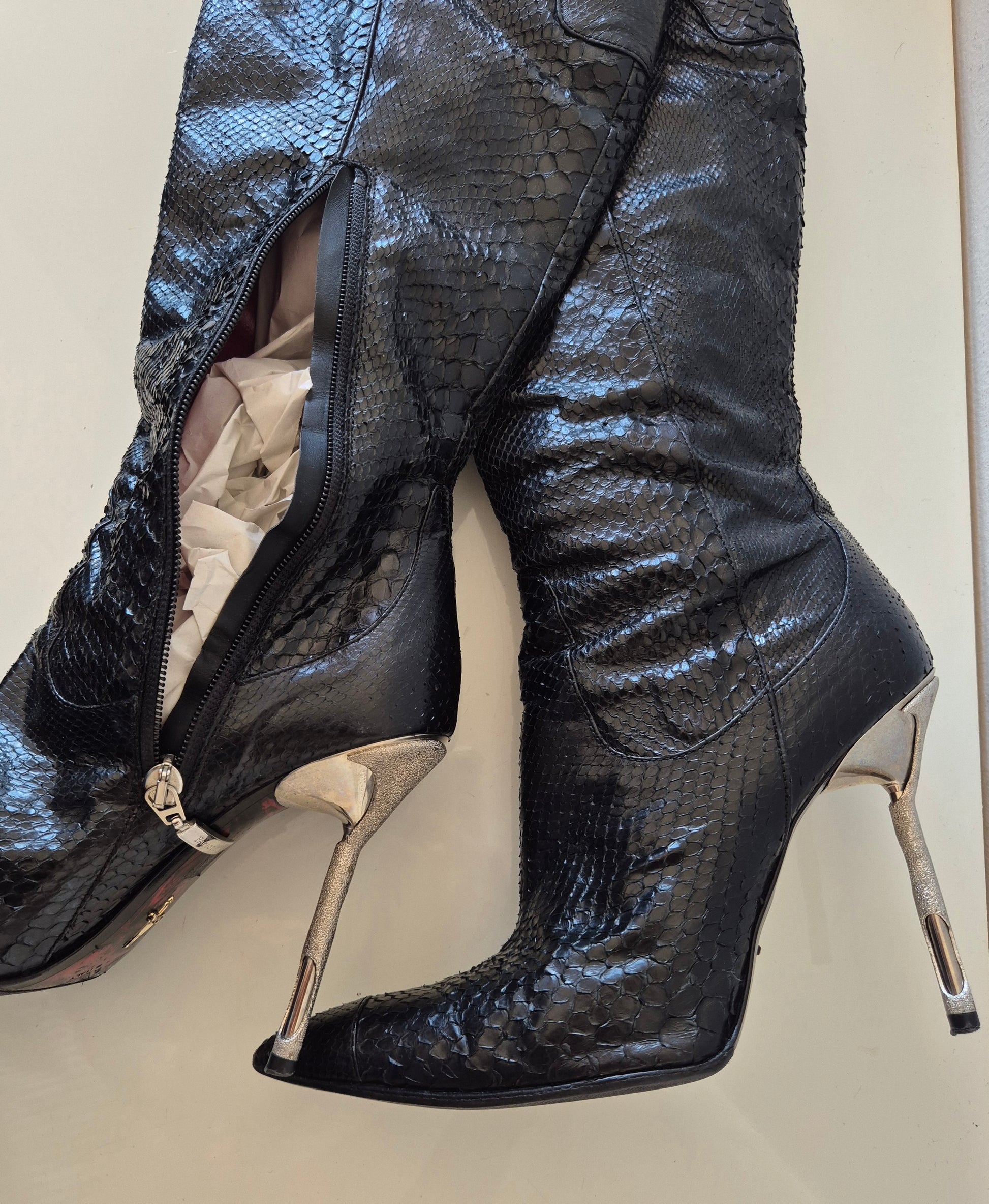Paciotti visoke crne čizme od zmijske kože. Upečatljiva srebrna peta. Unutrašnjost od crvene kože. Kolekcionarski komad velike vrijednosti 😎. Redovna cijena oko 1700 €. Visina pete 10.5 cm.