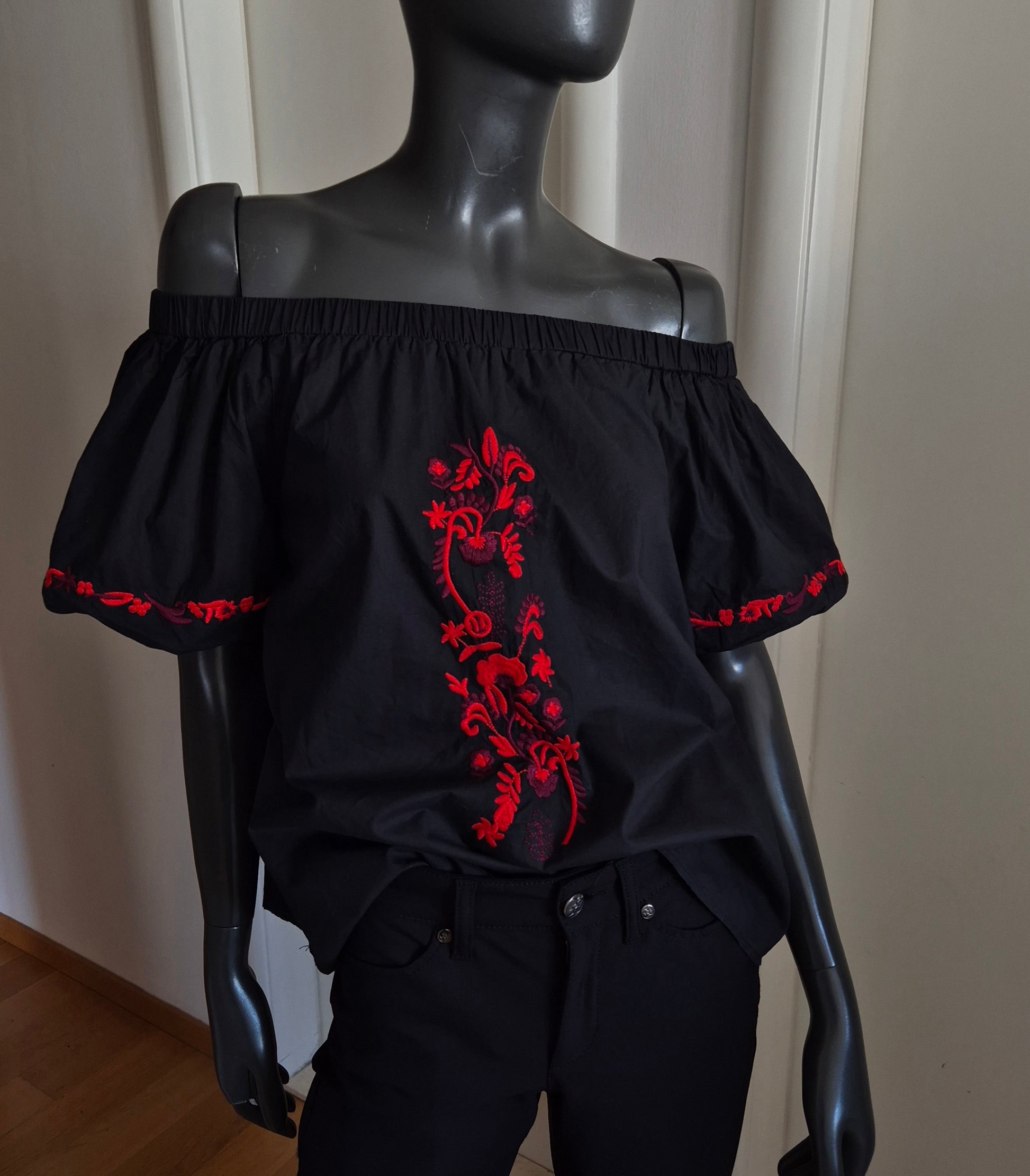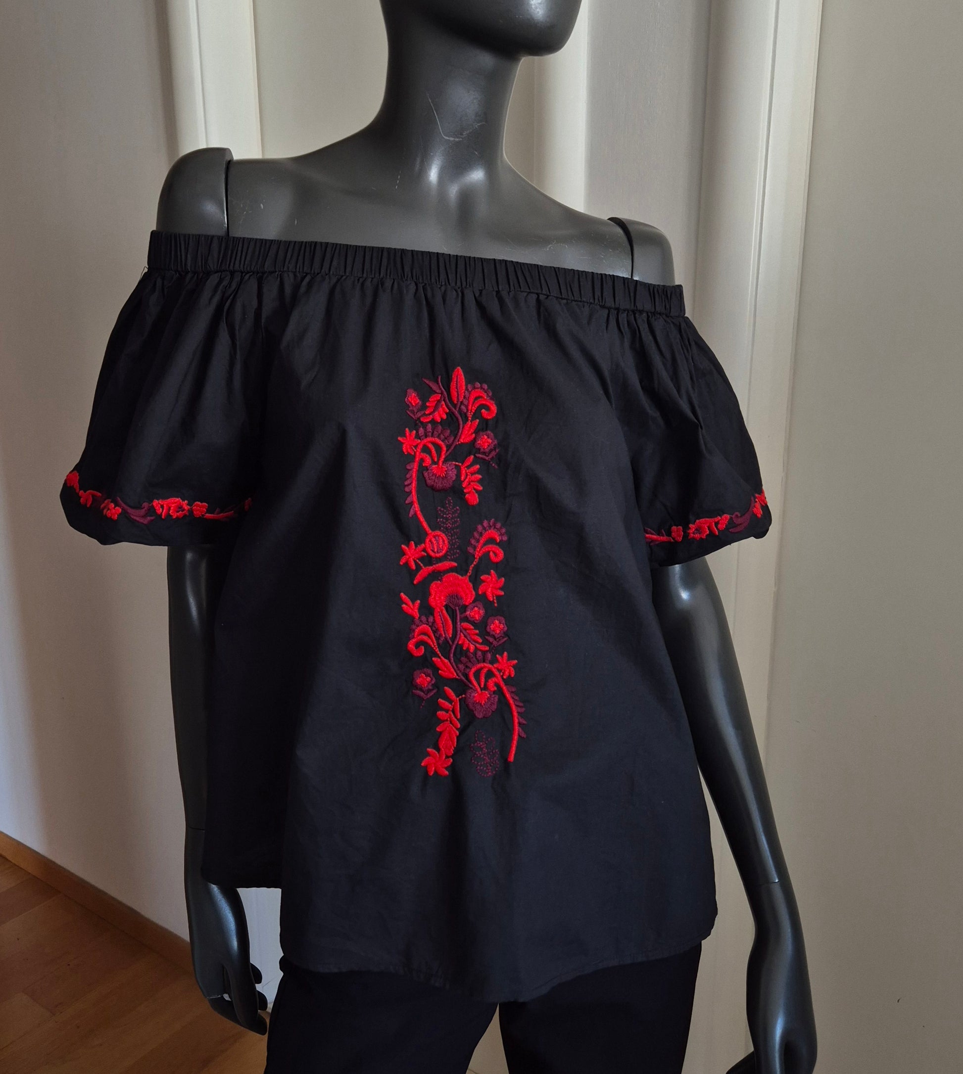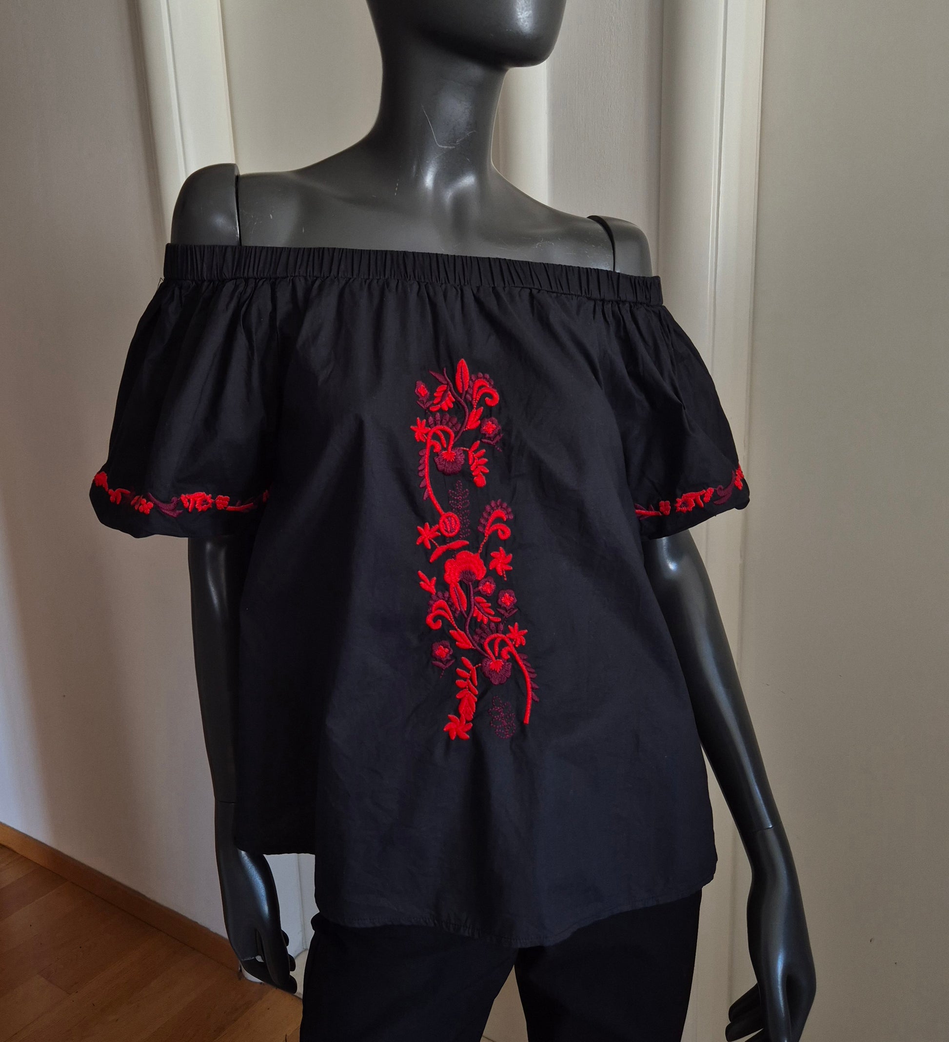 Bluza od crnog popelina (pamuka), s crvenim vezom. Voluminozni rukavi, širi i blagi A-kroj. Gola ramena.