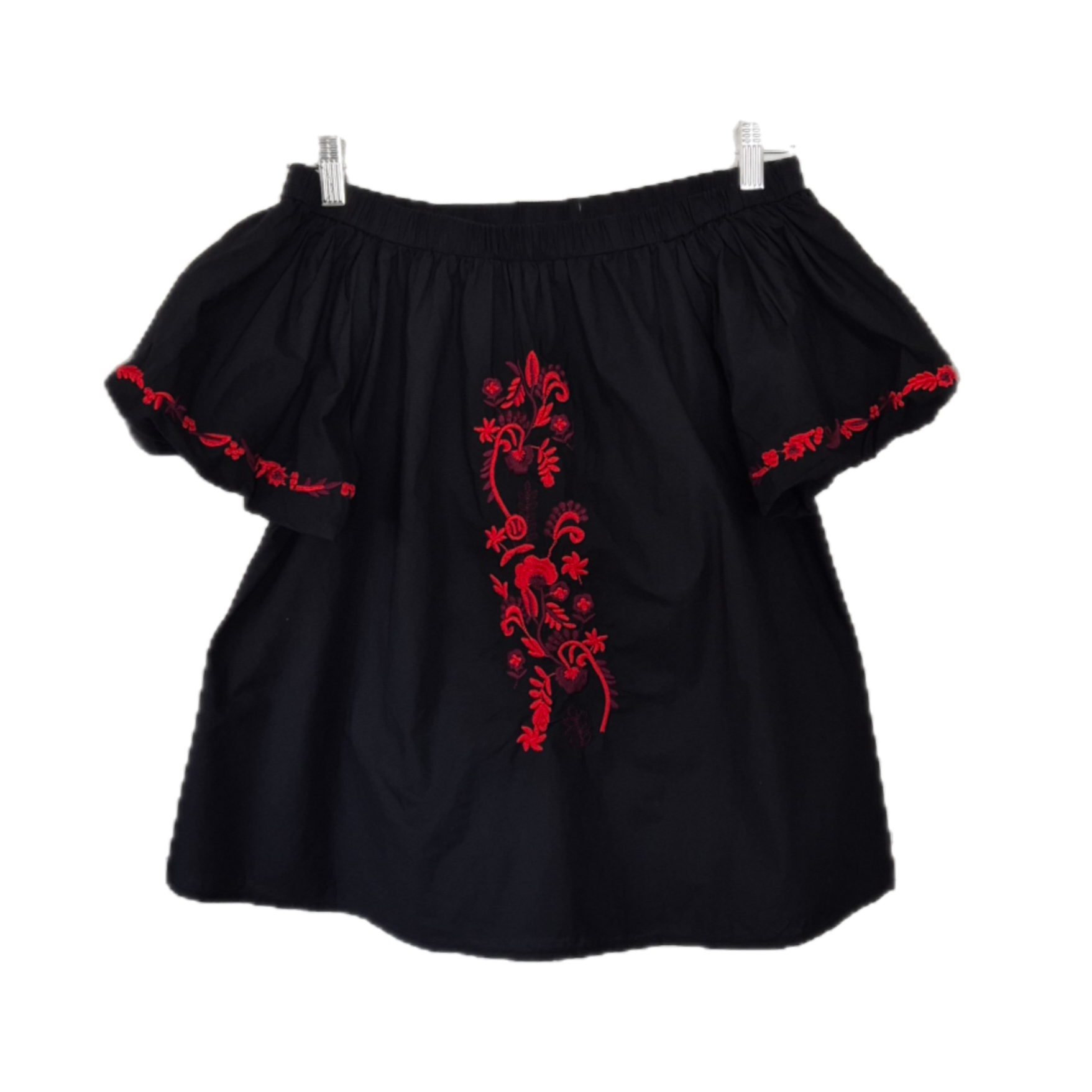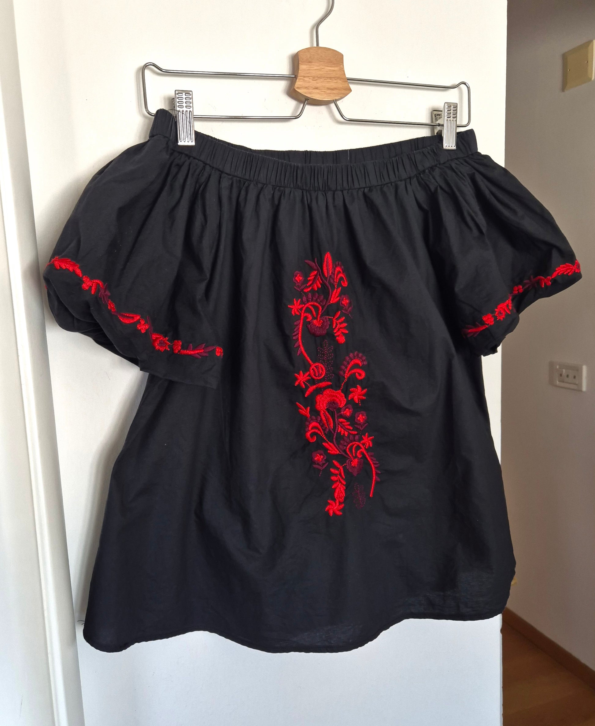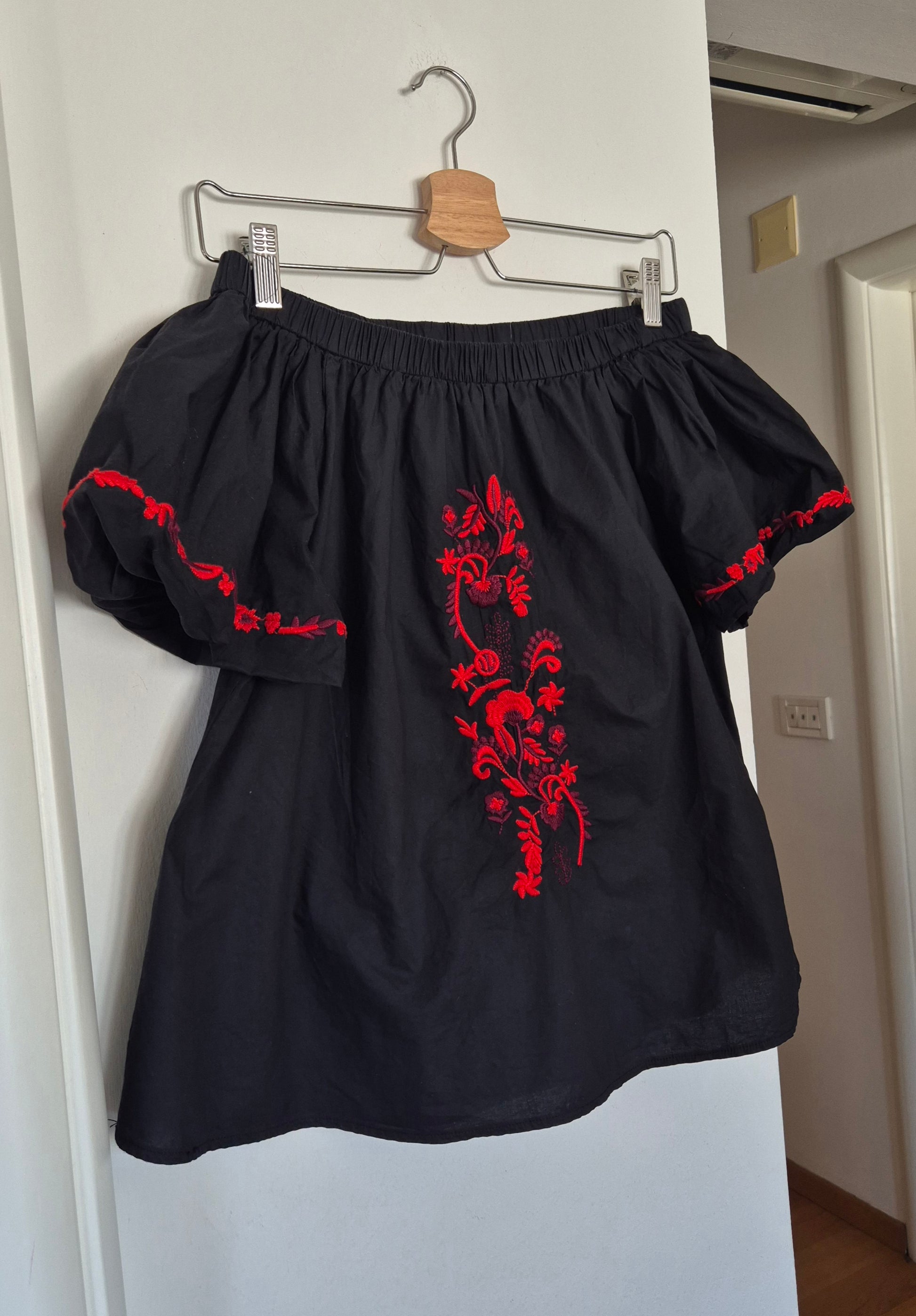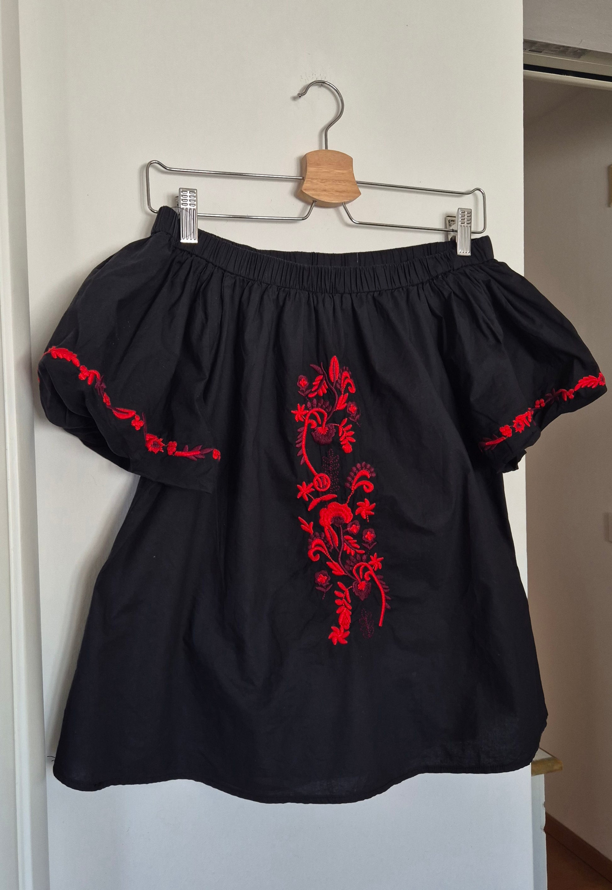 Bluza od crnog popelina (pamuka), s crvenim vezom. Voluminozni rukavi, širi i blagi A-kroj. Gola ramena.