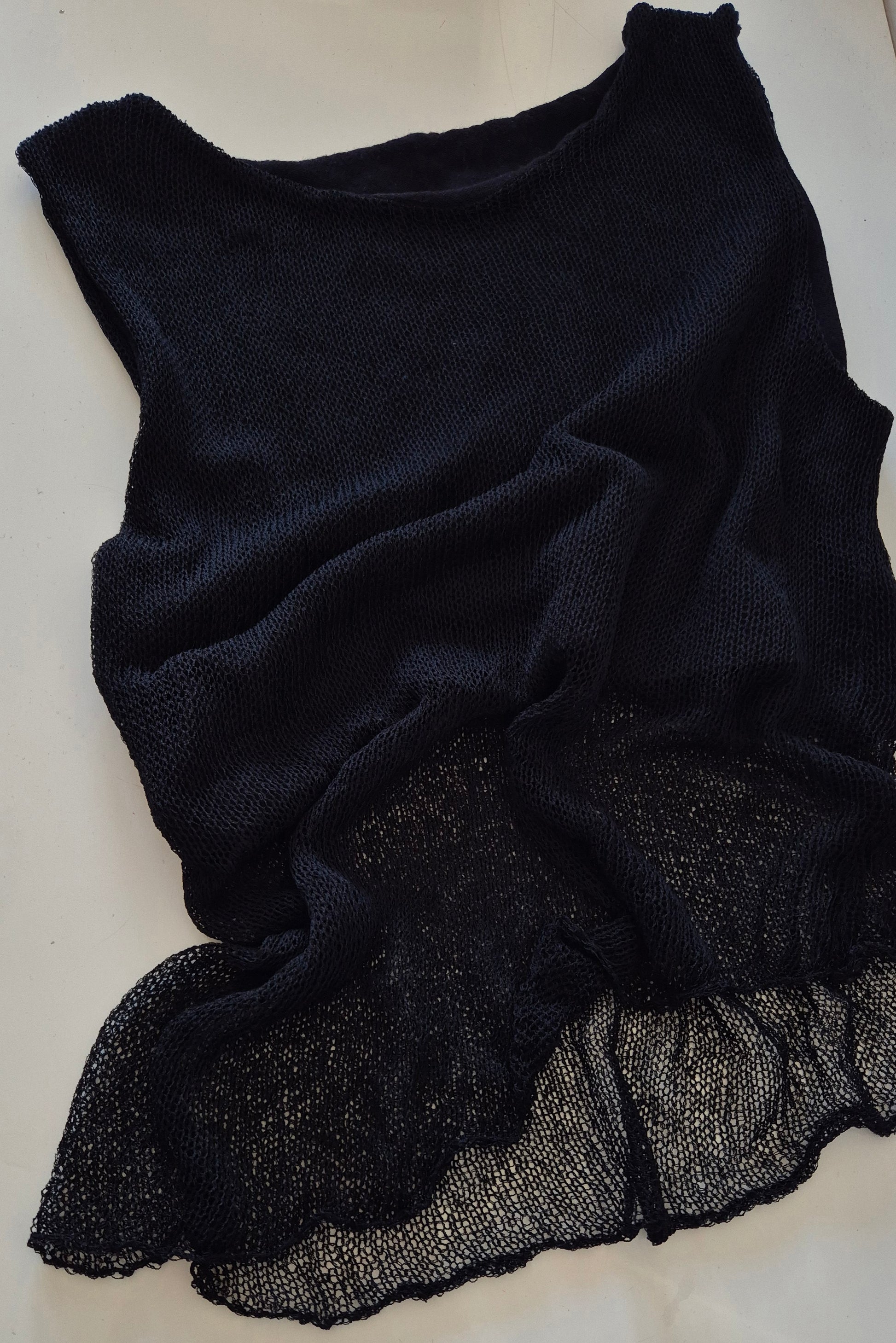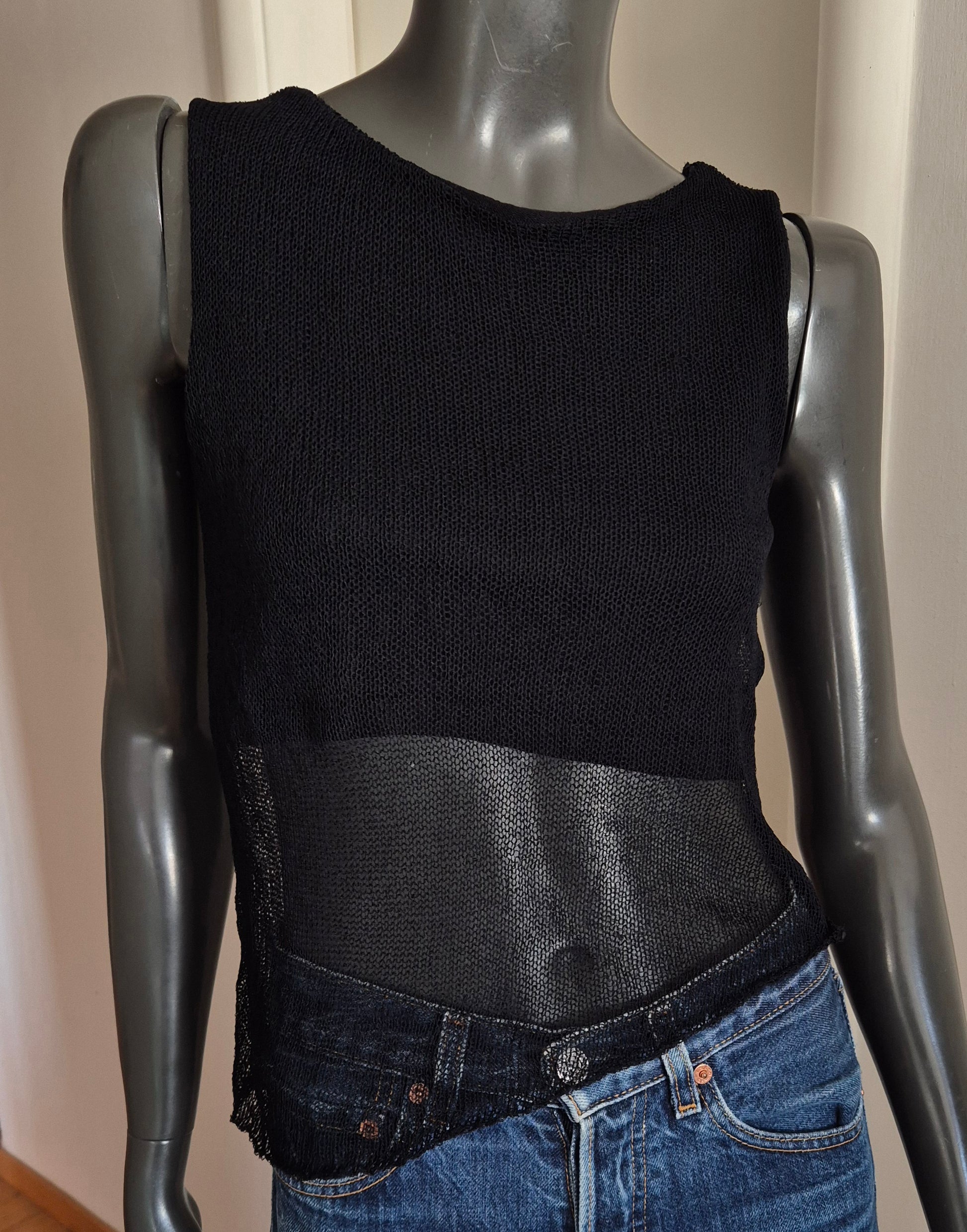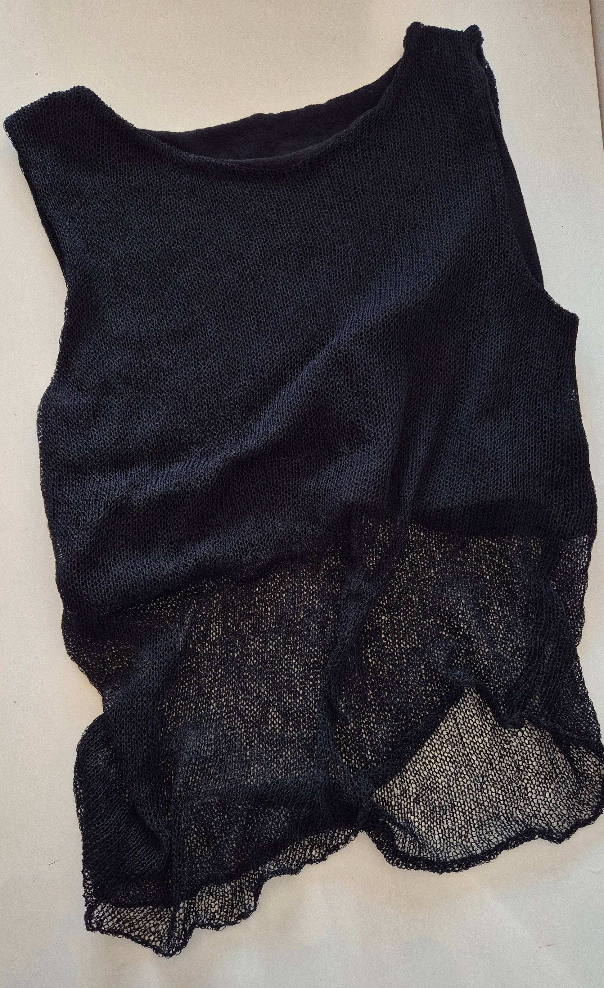 Savršen crni mesh top. Neki talijanski brend, po etiketi sa sastavom materijala moguće da je vintage Max&Co! Blago asimetričan. Na gornjem dijelu crni top. 82% pamuk, 16% poliamid, 2% elastin.