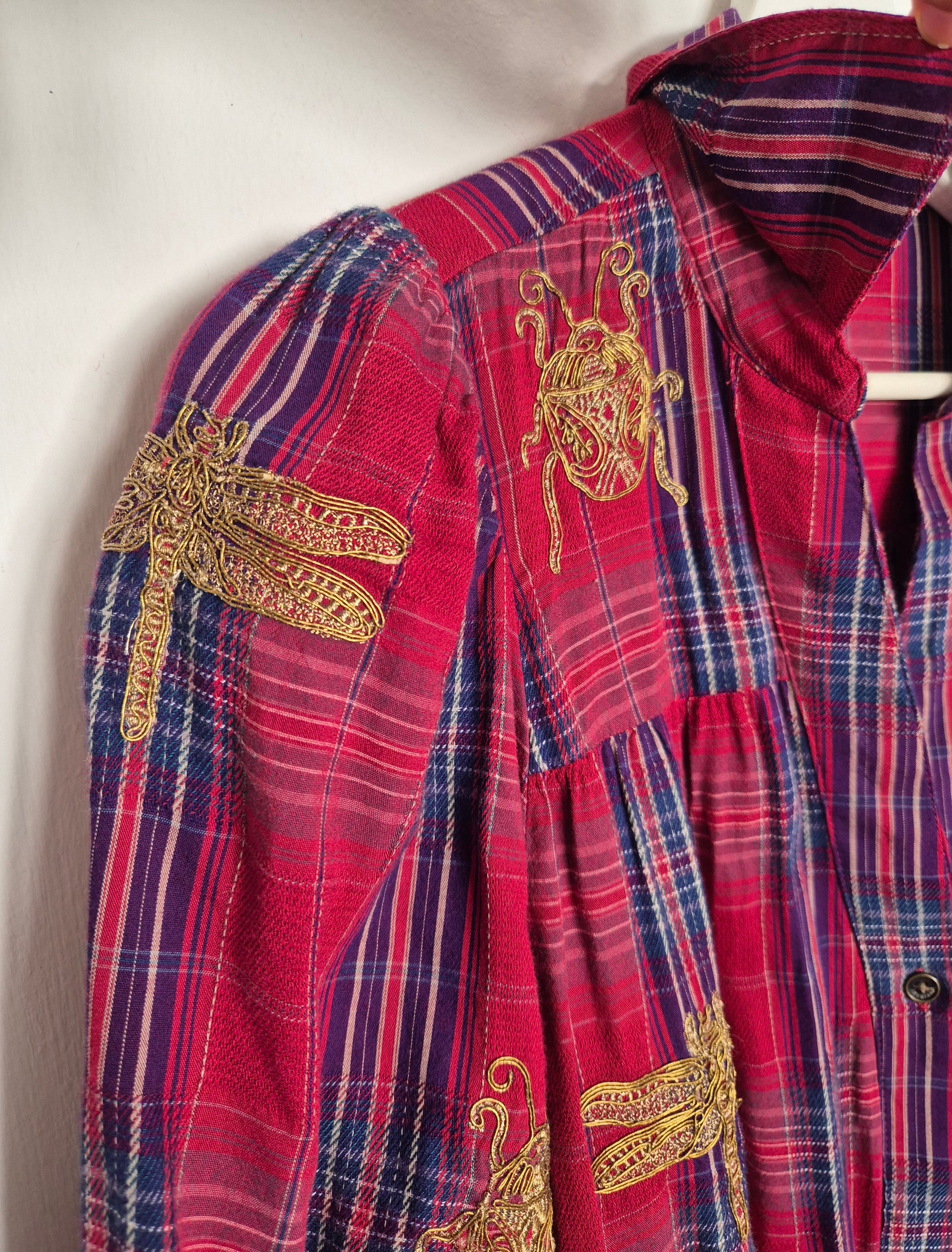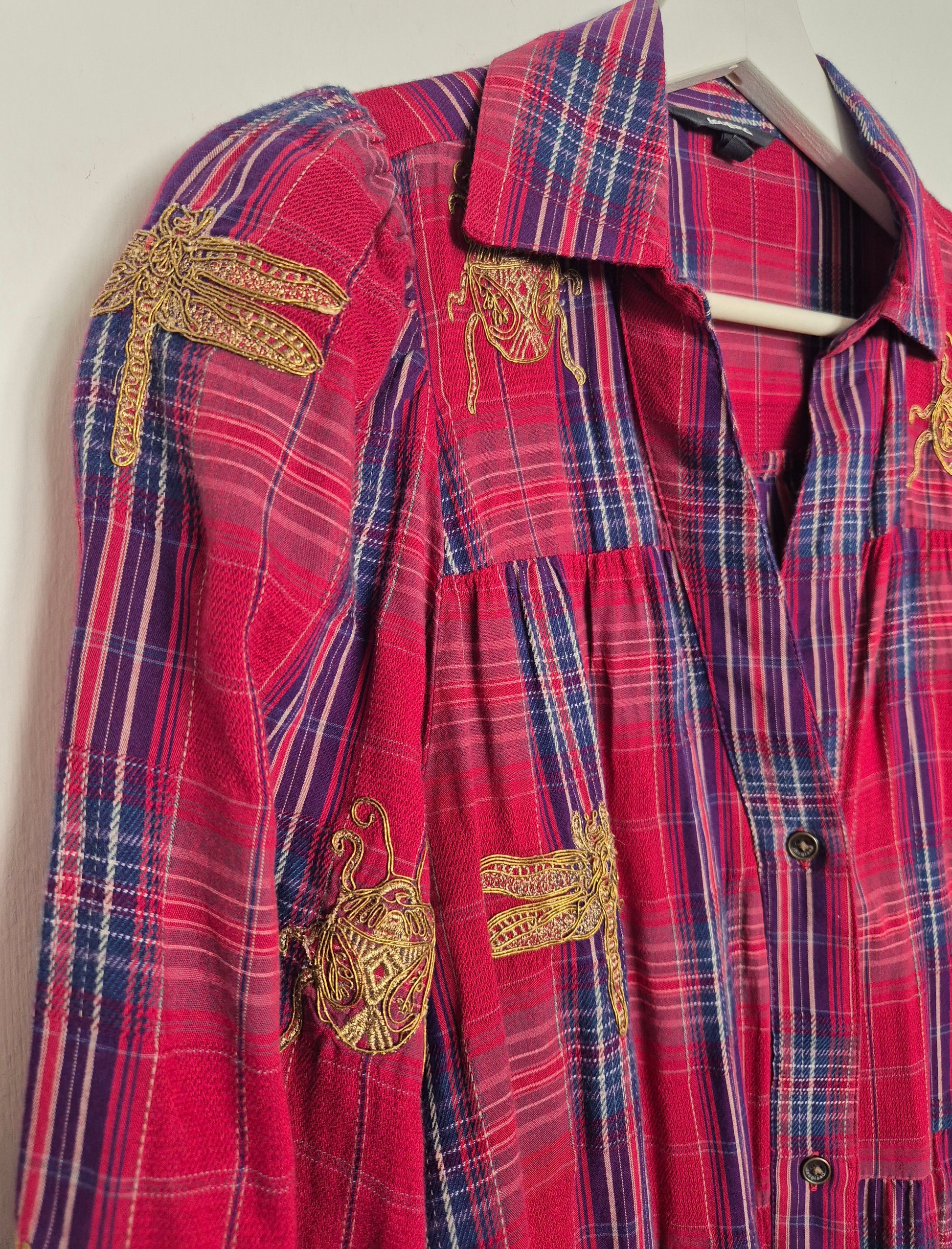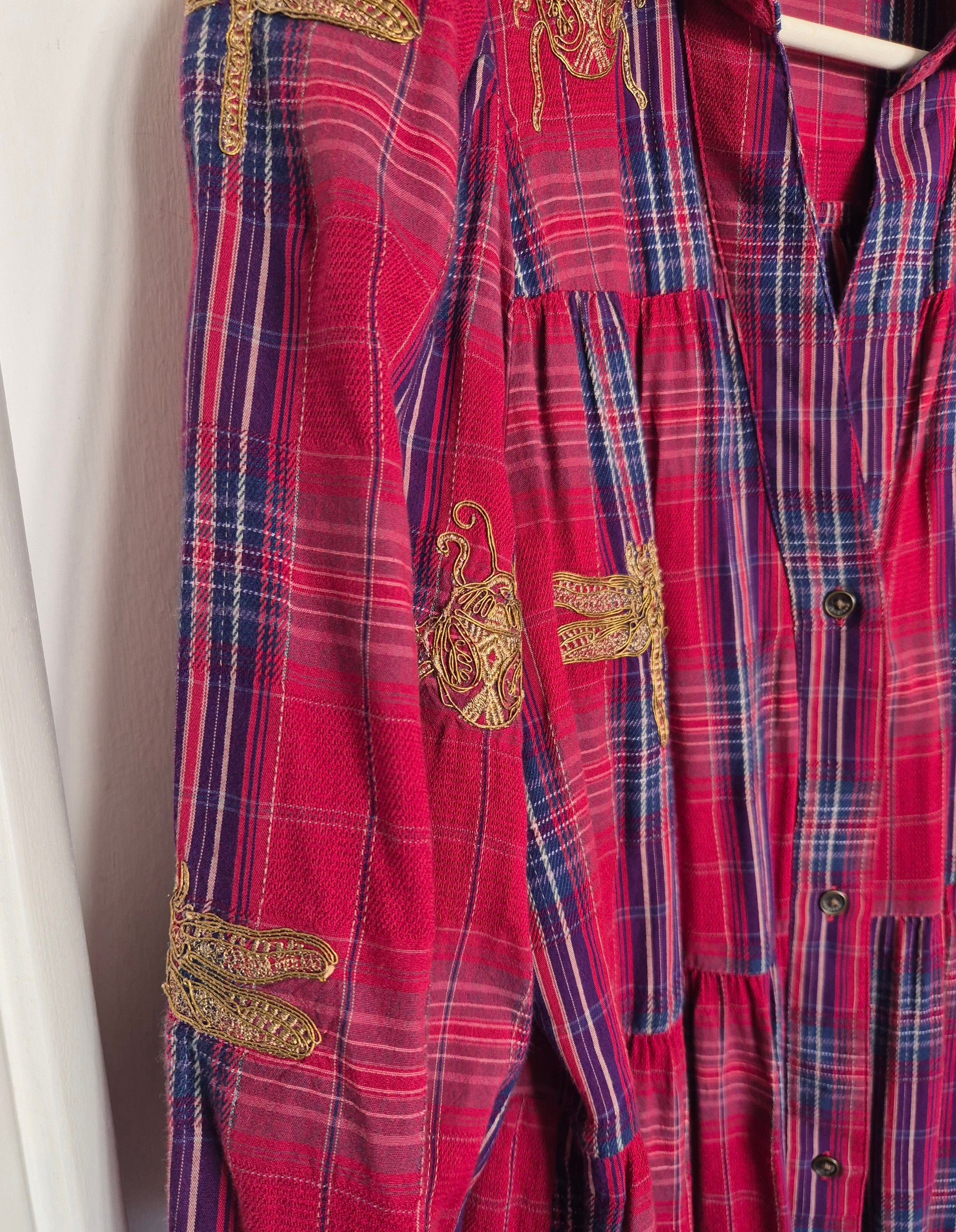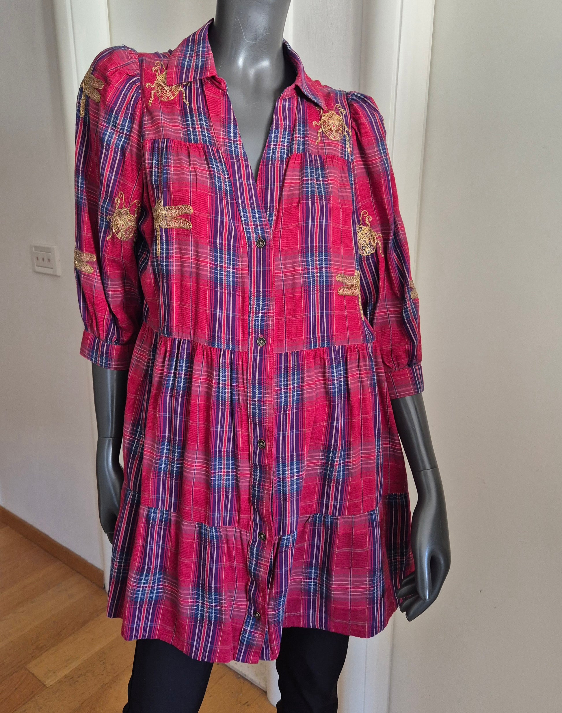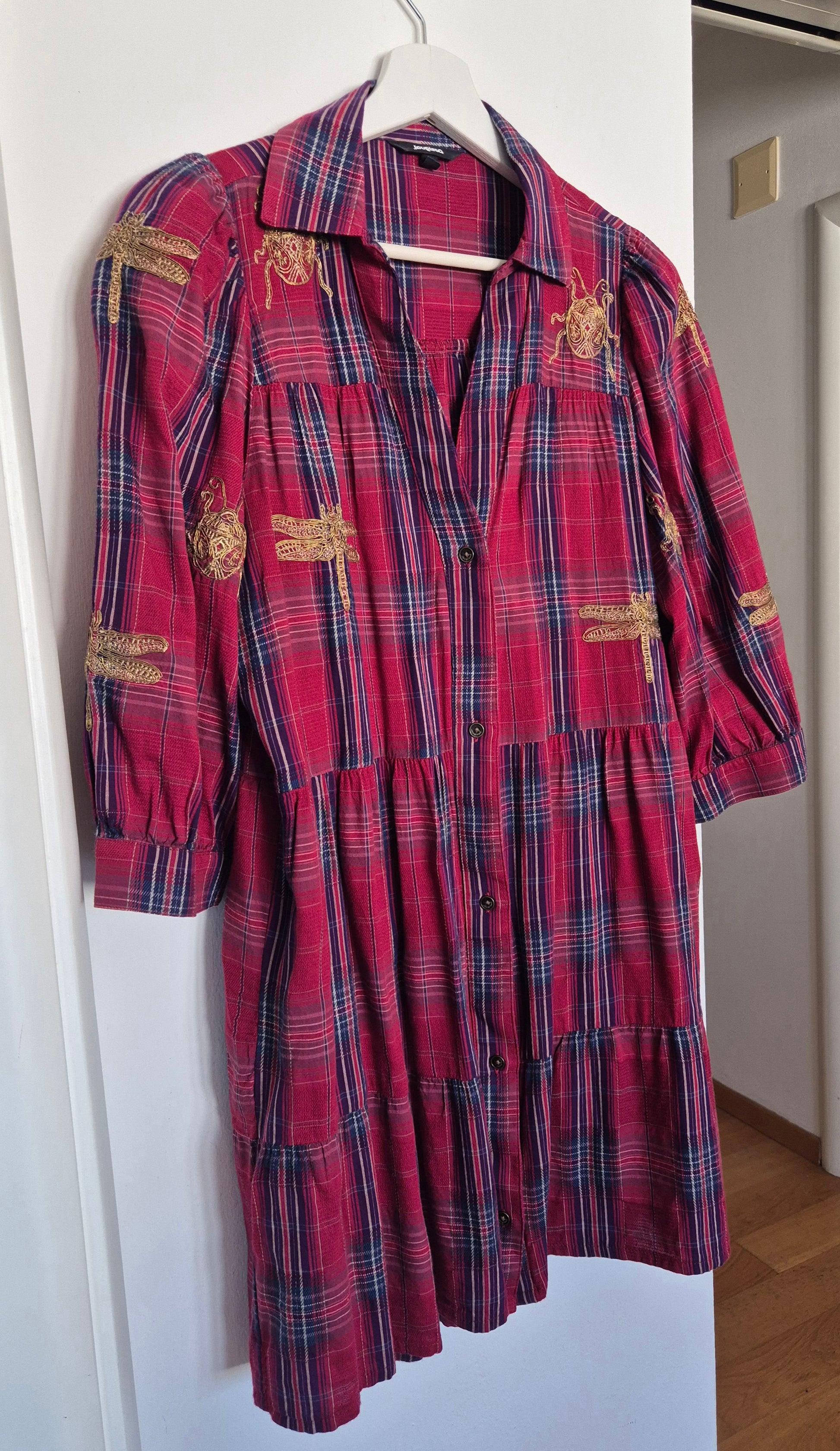 Desigual haljina, nosiva i kao tunika (na hlače). Pamuk. Karo uzorak i zlatni vez. Opušten kroj s malo širim/balon rukavima.