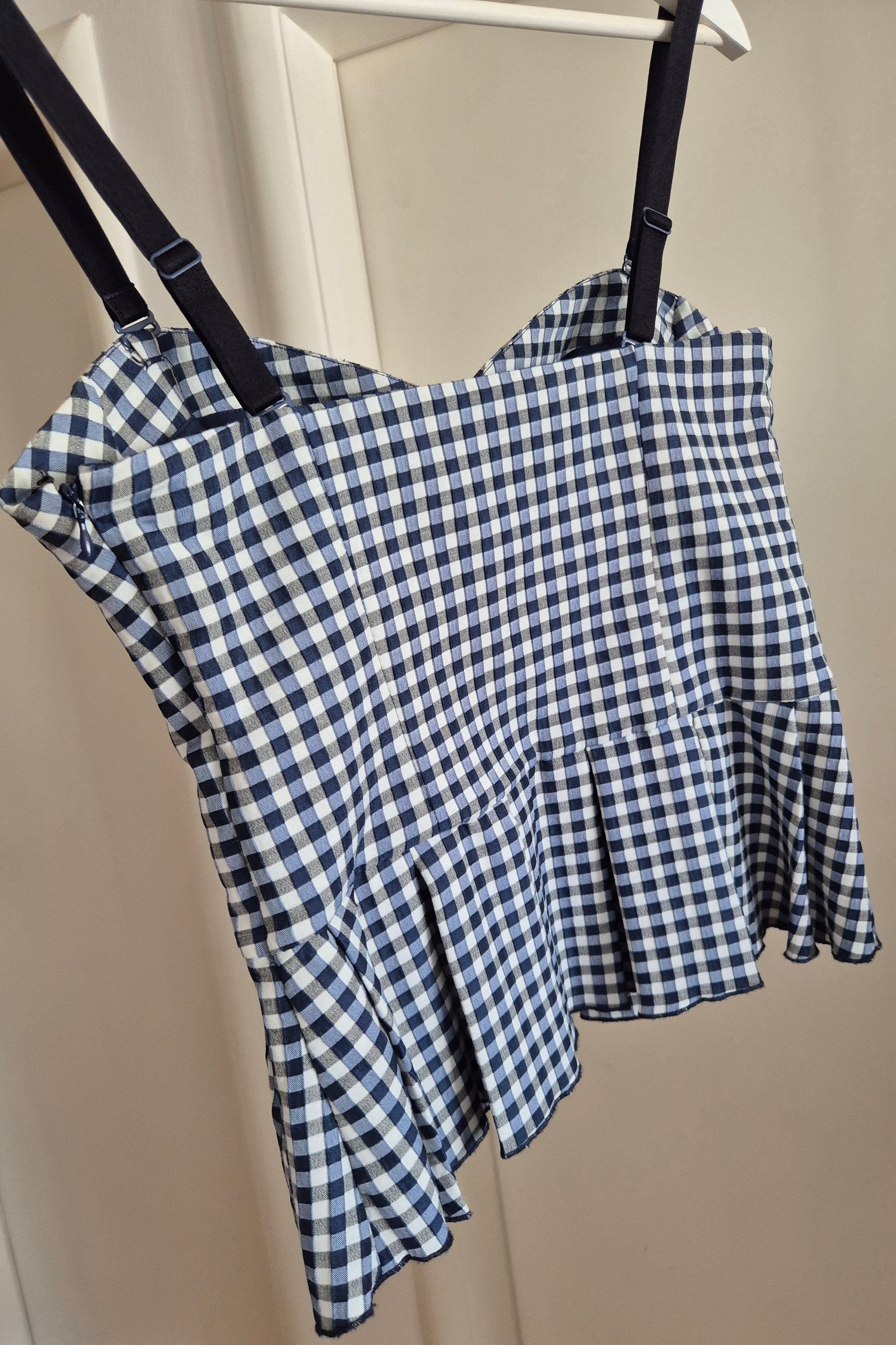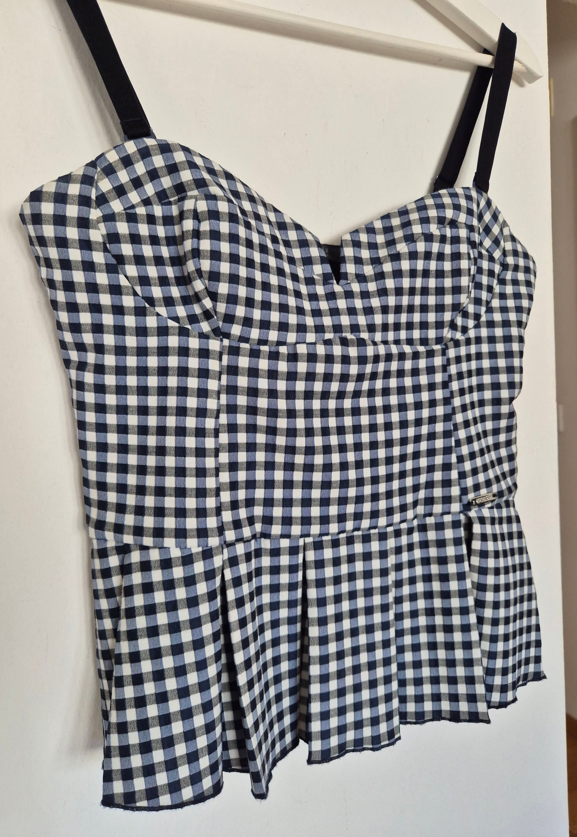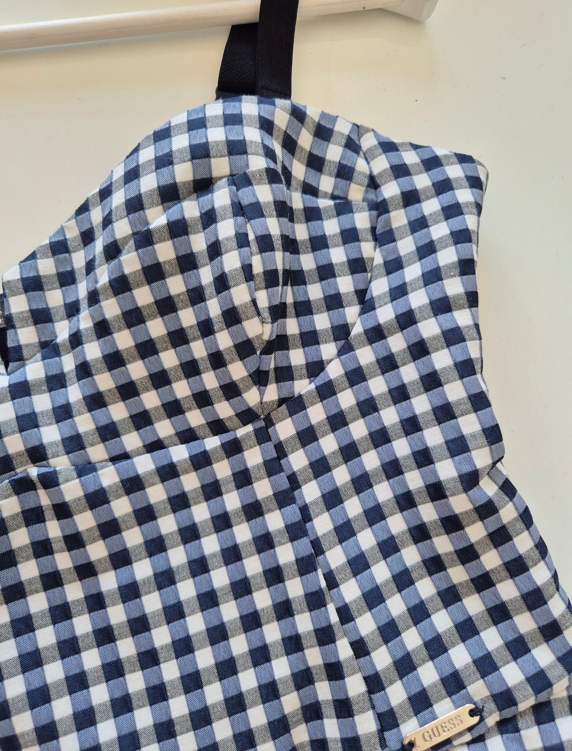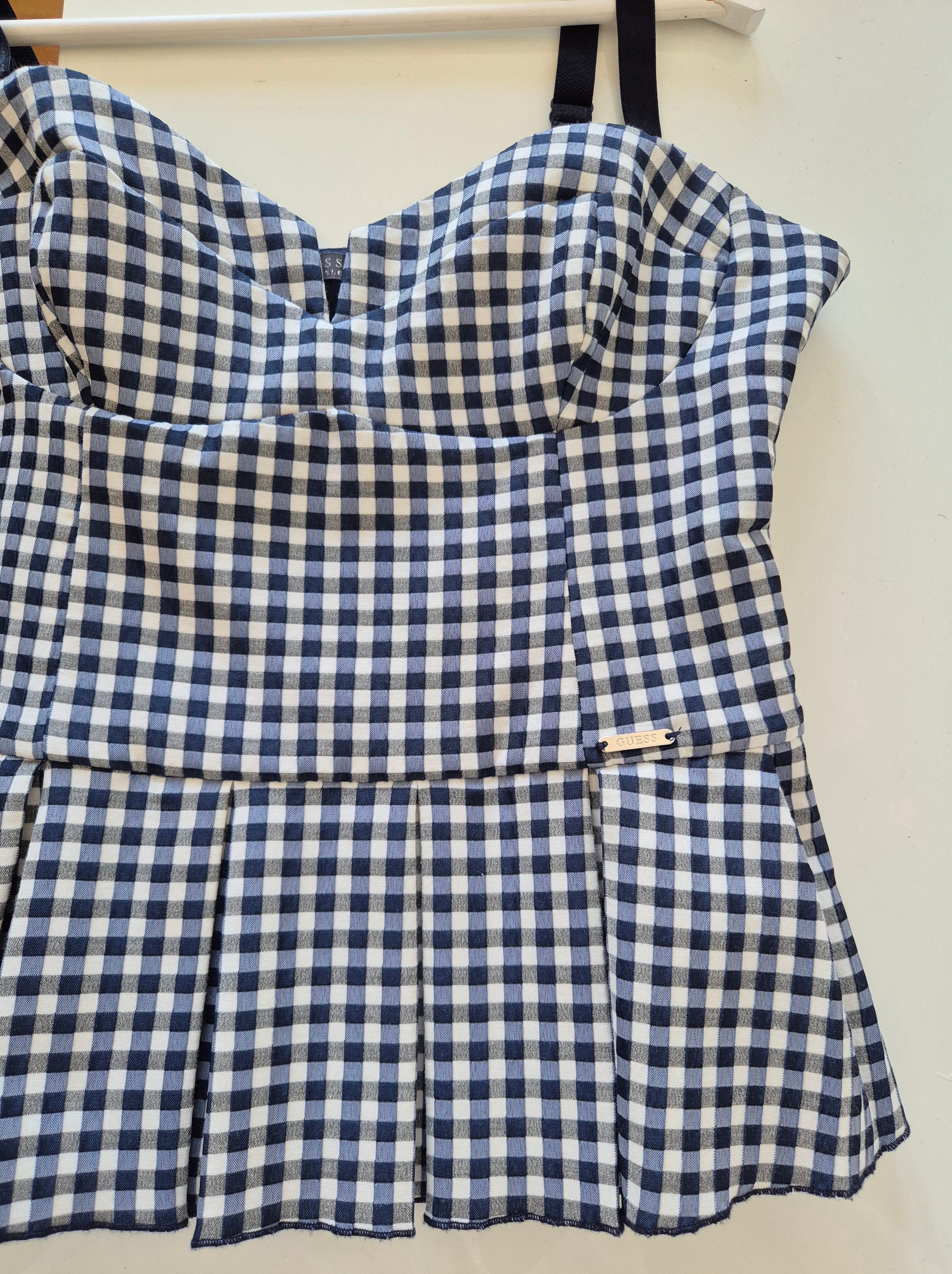 Savršen Guess topić - kao korzet s faldama/volanom. Gingham uzorak u plavoj i bijeloj boji. Pamuk ili mješavina pamuka. Podesive bretela, a može se nositi i bez njih.