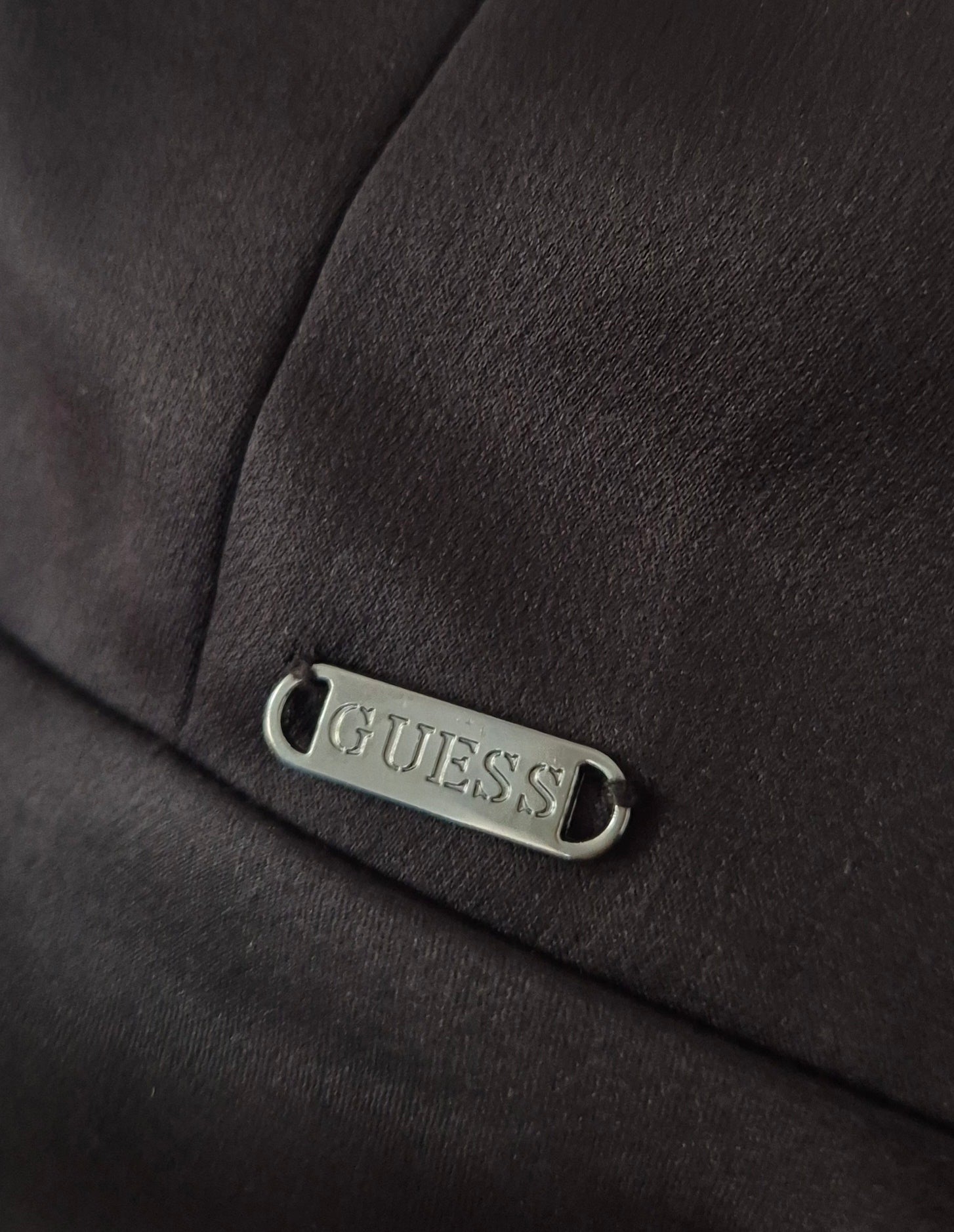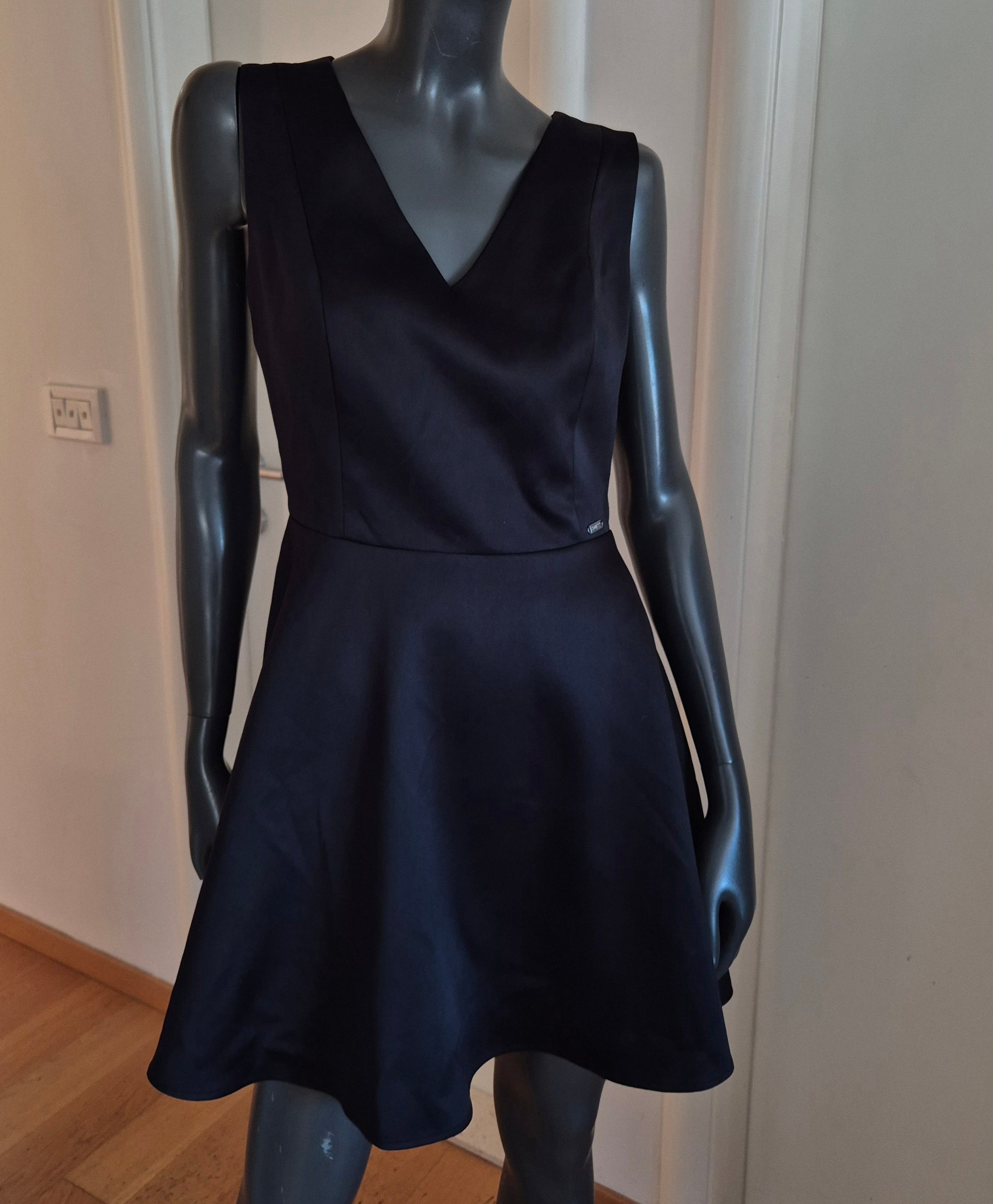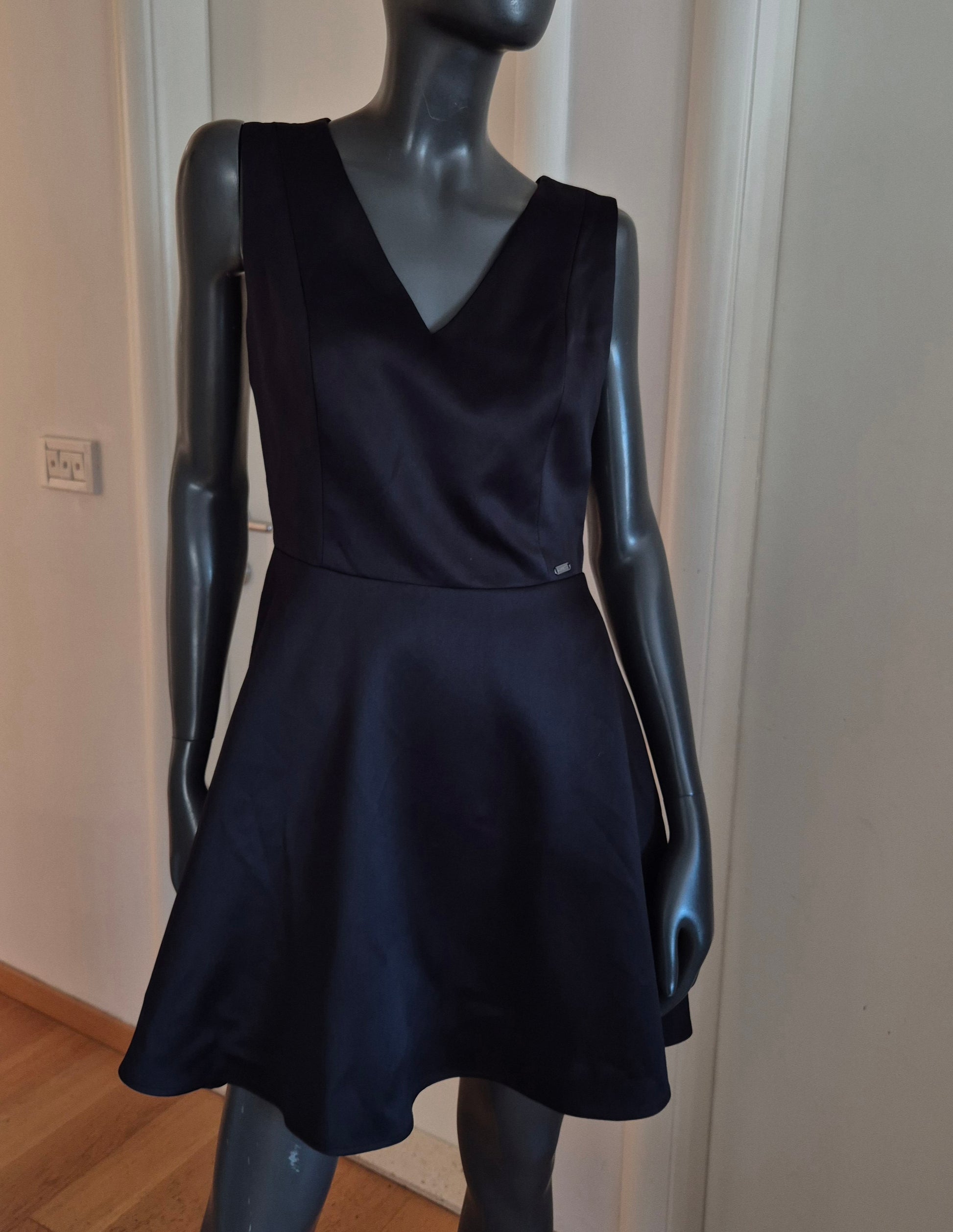 Guess haljina zanimljivog kroja, malo deblji saten (poliester), crna. Na leđima se dvije trake sijeku, naprijed V-otvor. U donjem dijelu A-kroj, pada nabrano. U struku decentna pločica s imenom brenda.
