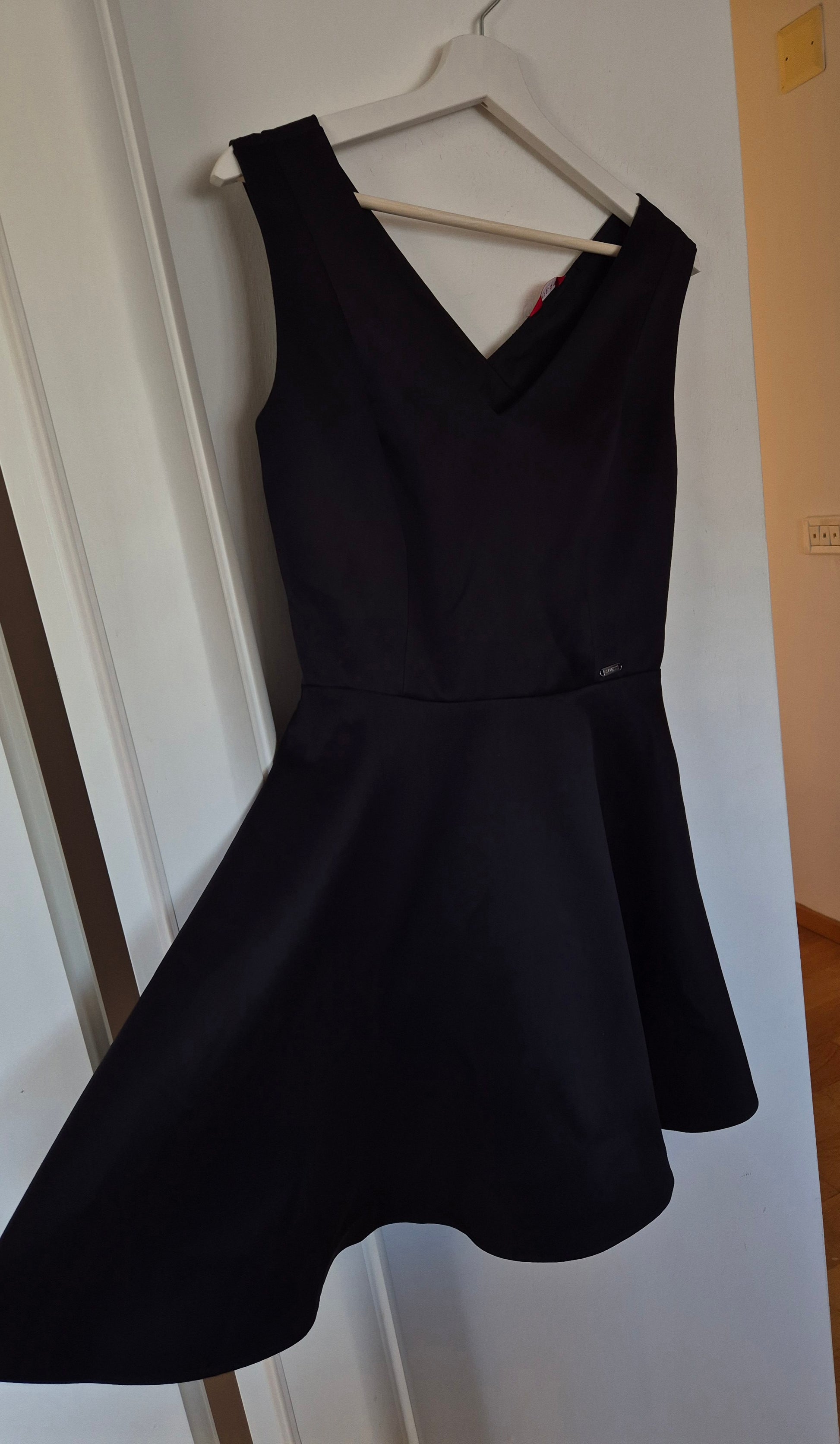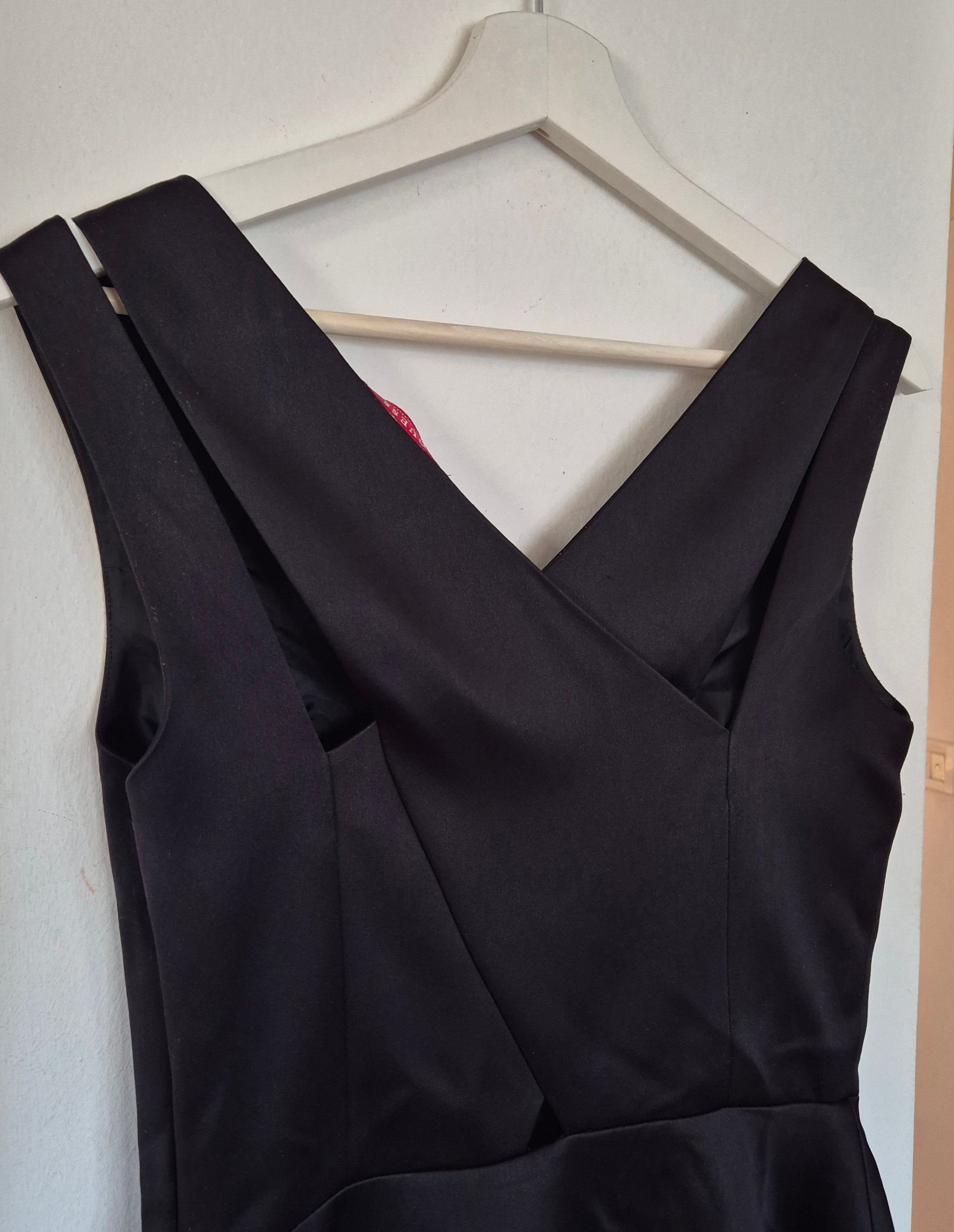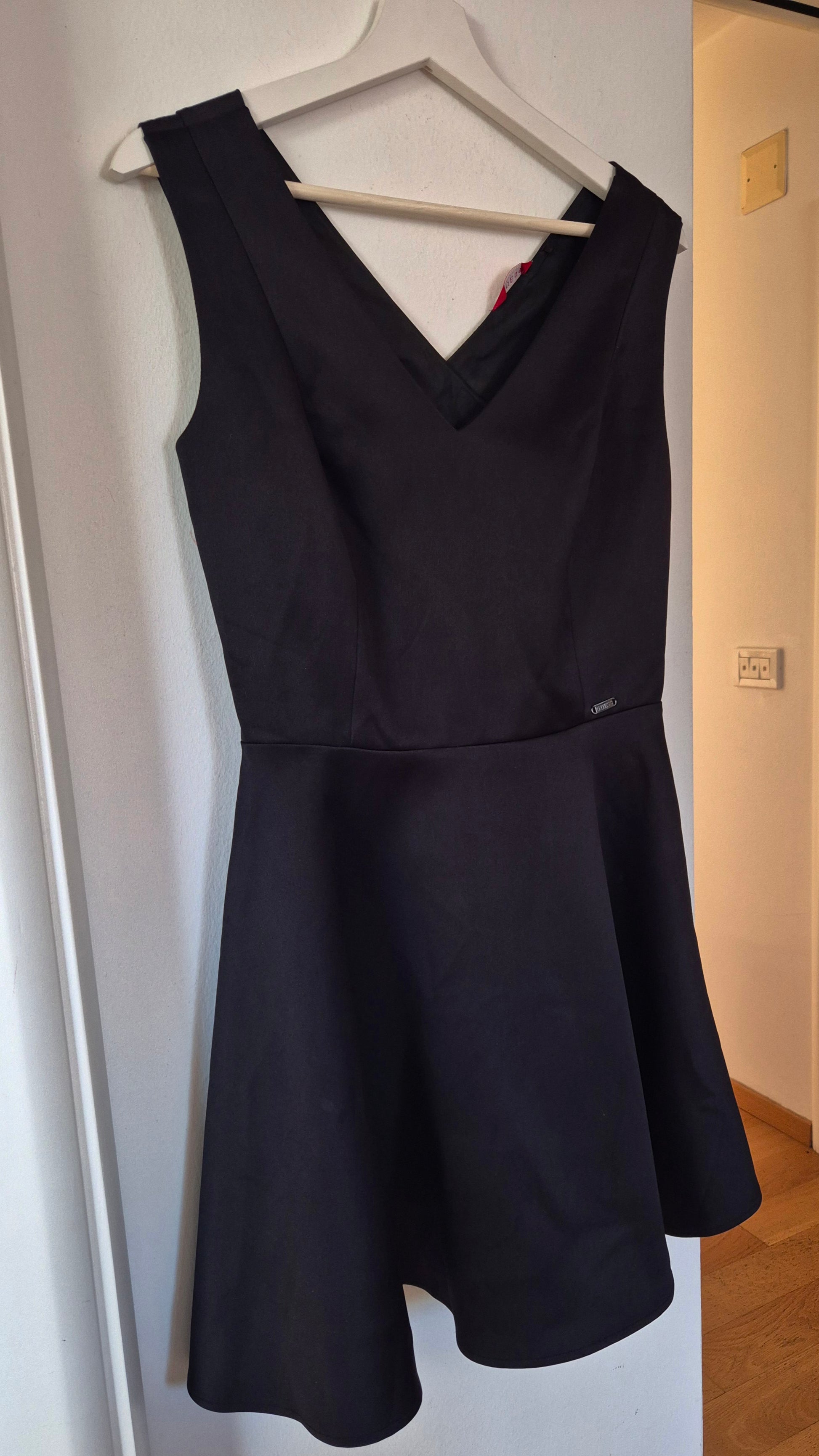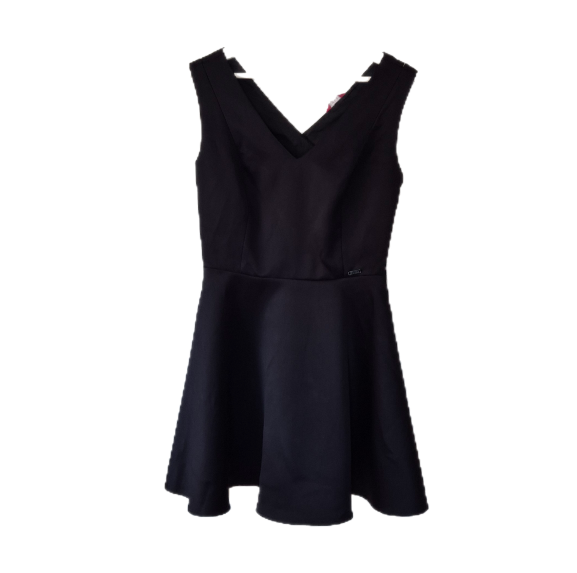Guess haljina zanimljivog kroja, malo deblji saten (poliester), crna. Na leđima se dvije trake sijeku, naprijed V-otvor. U donjem dijelu A-kroj, pada nabrano. U struku decentna pločica s imenom brenda.