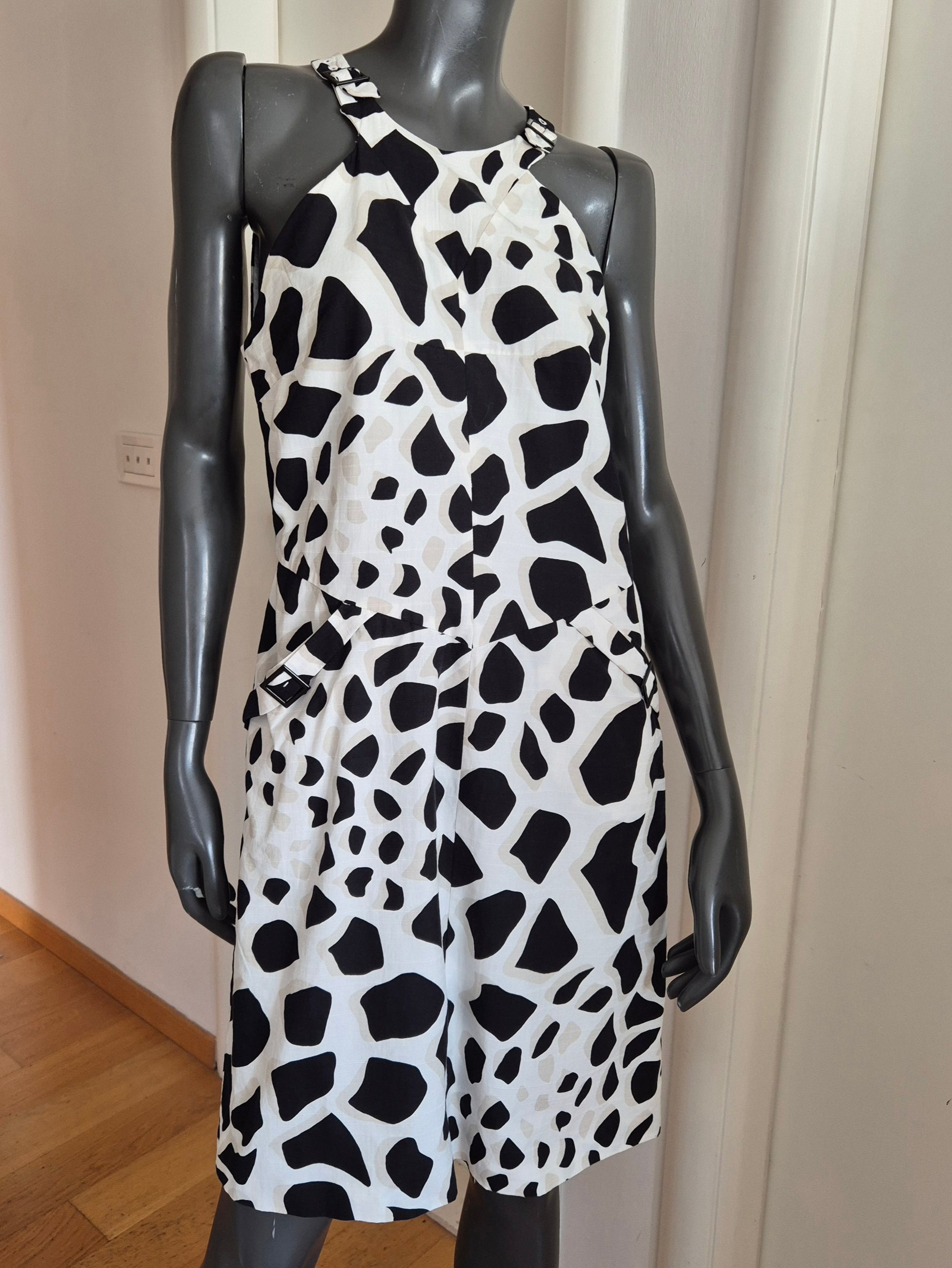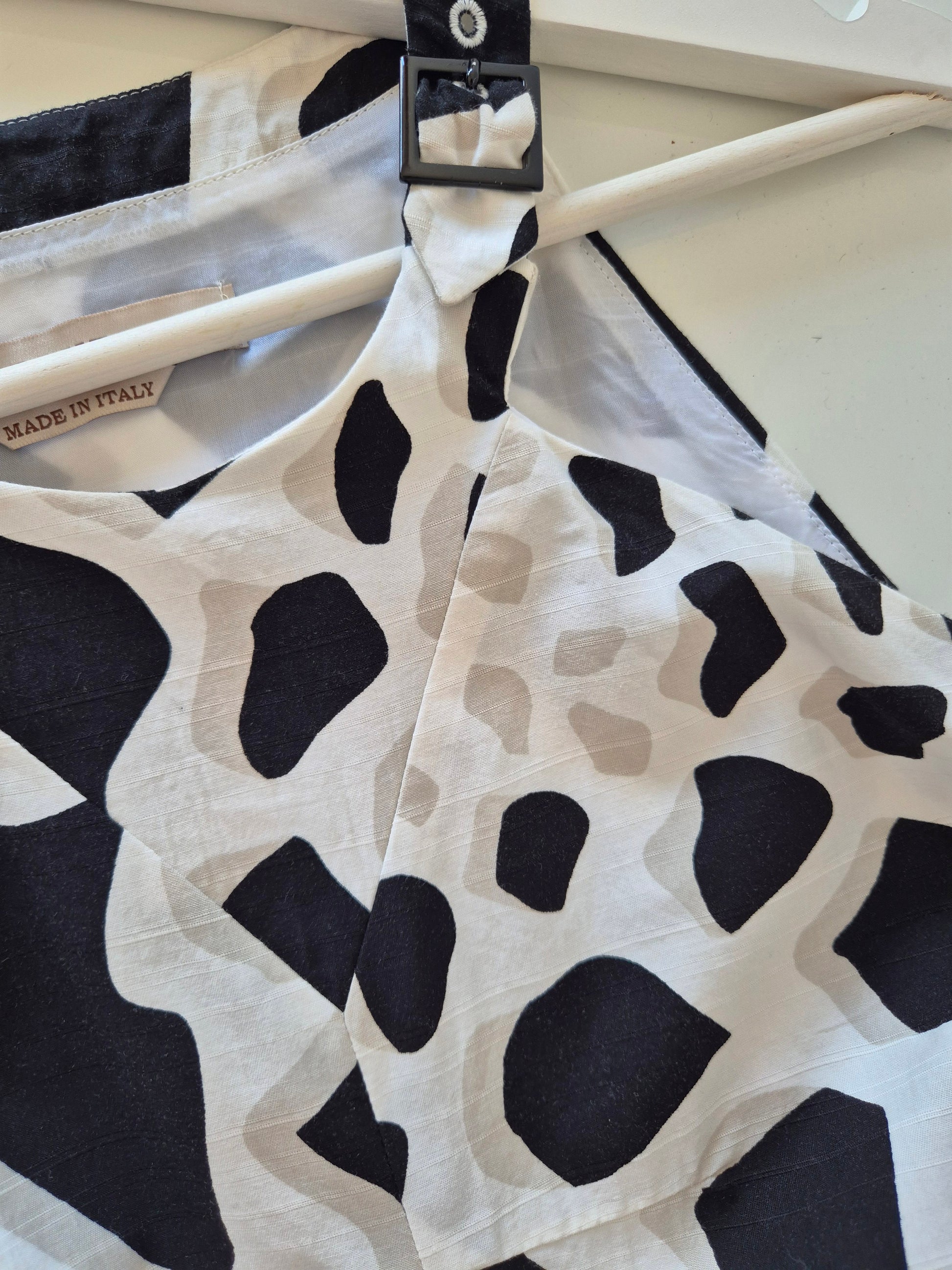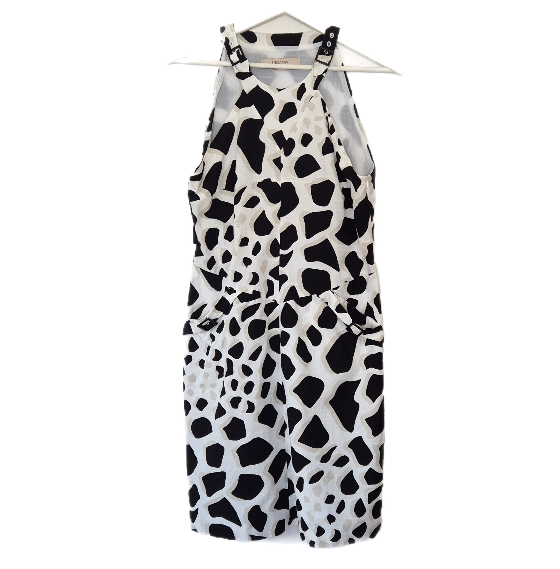 Haljina odličnog brenda iBlues (koji pripada Max Mara fashion grupi). Crno-bijela-beige, s posebnim otvorom i detaljima kopčica. Pamuk, a podstava cupro i rayon (viskoza).
