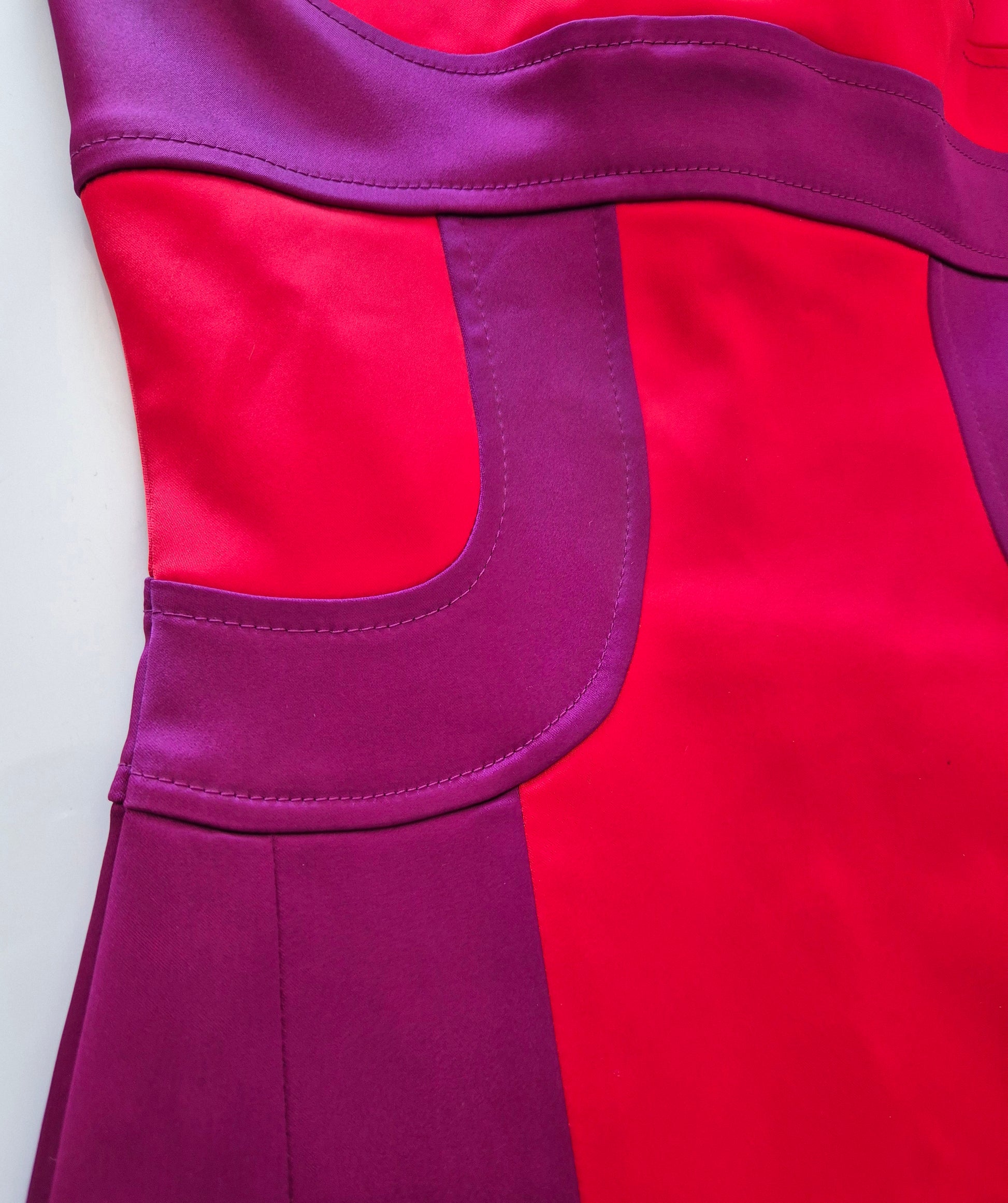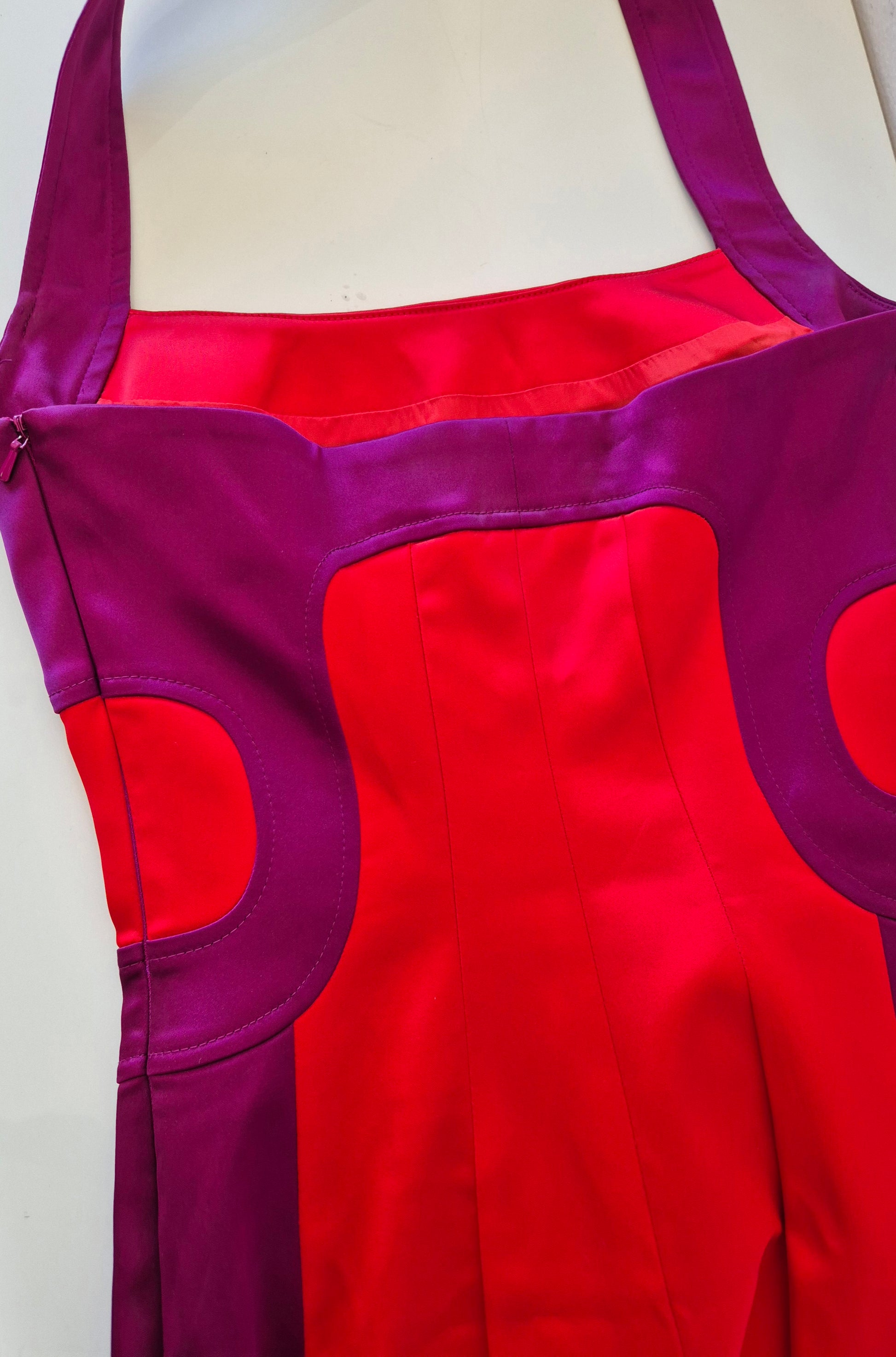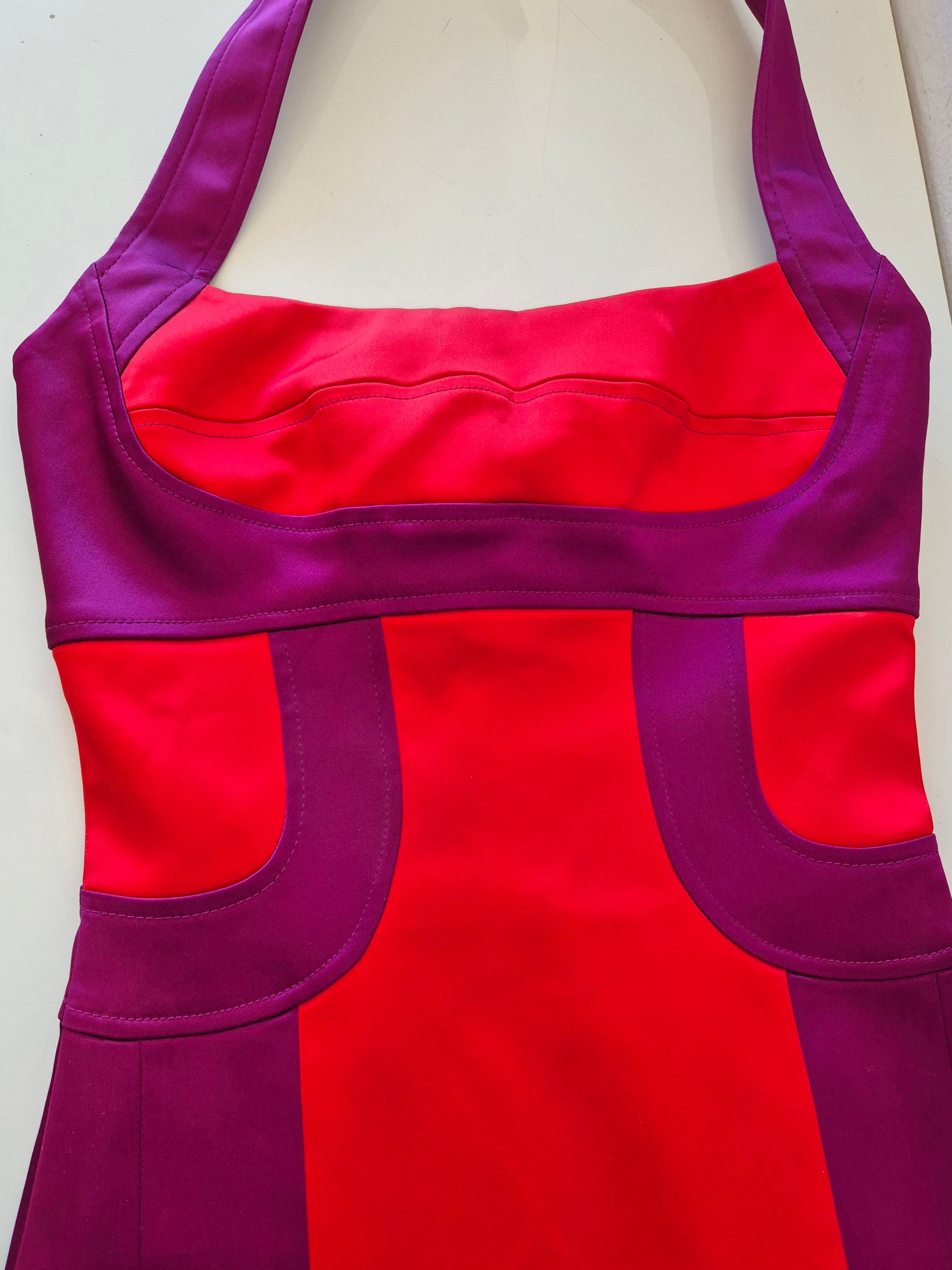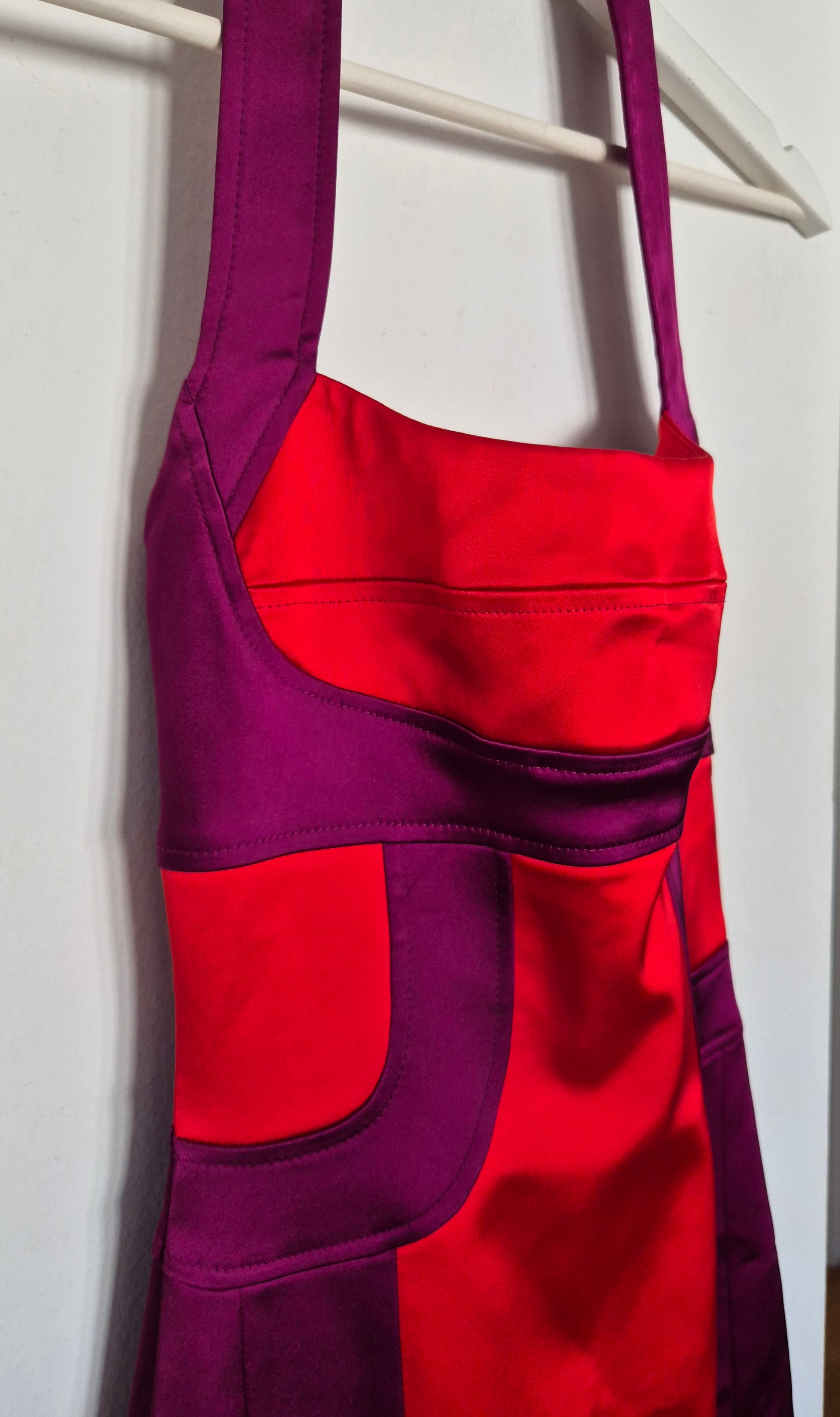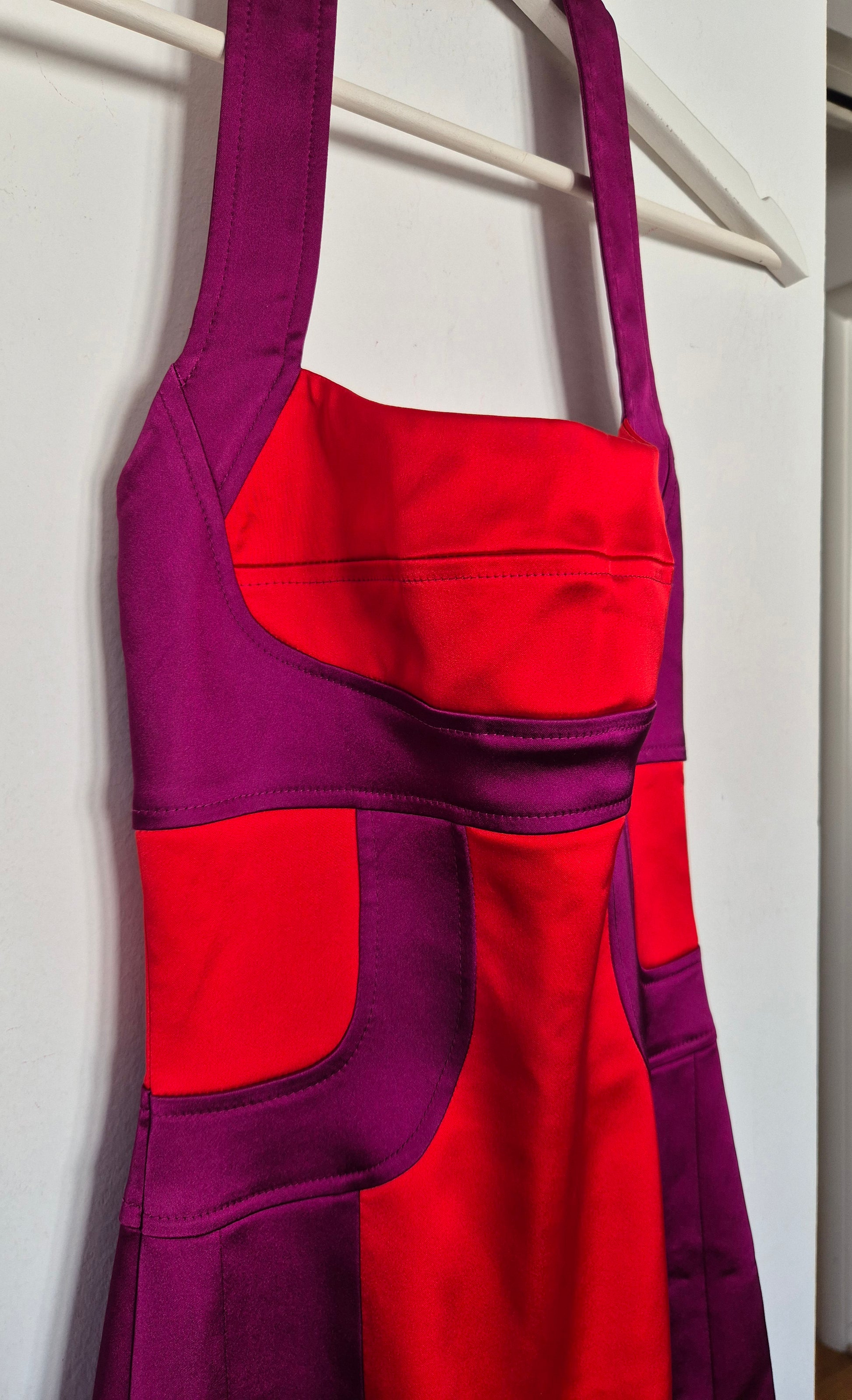 Dizajnerska Karen Millen haljina, savršena kombinacija boja - crvena i ljubičasta ❤️💜. Odličan kroj! Fini saten; sastav materijala na fotografiji. Podesive bretele. Kemijski očišćena.