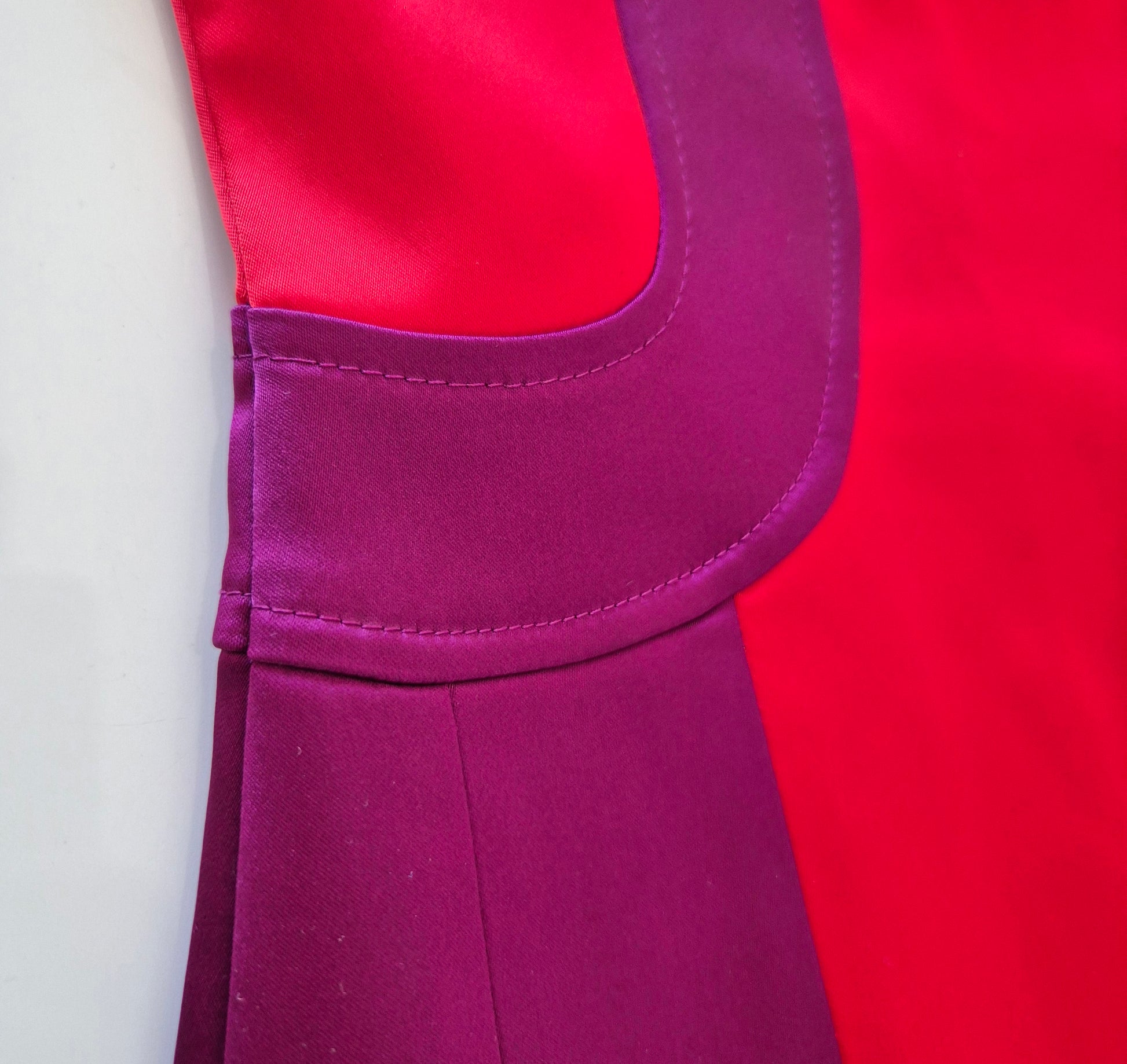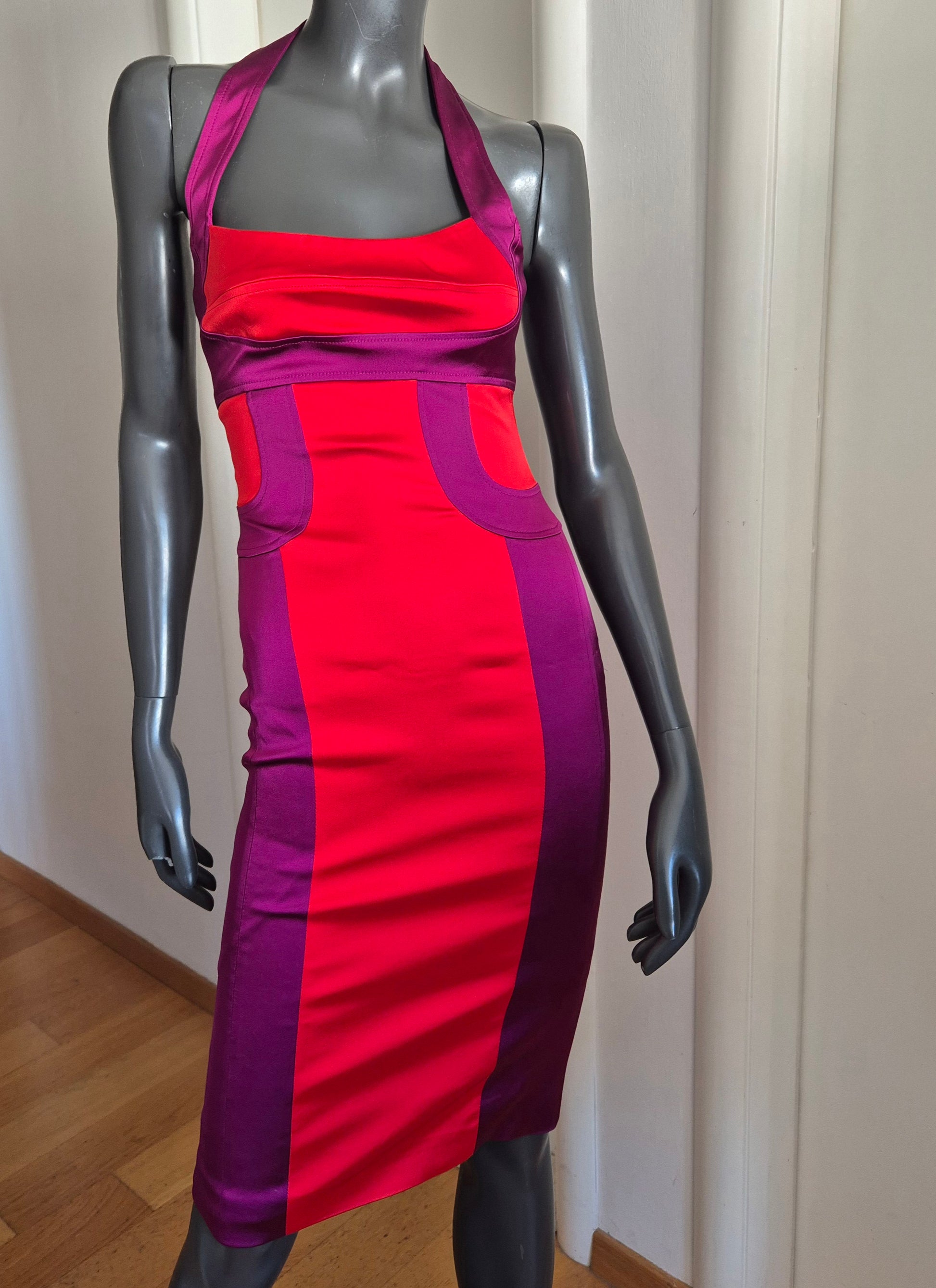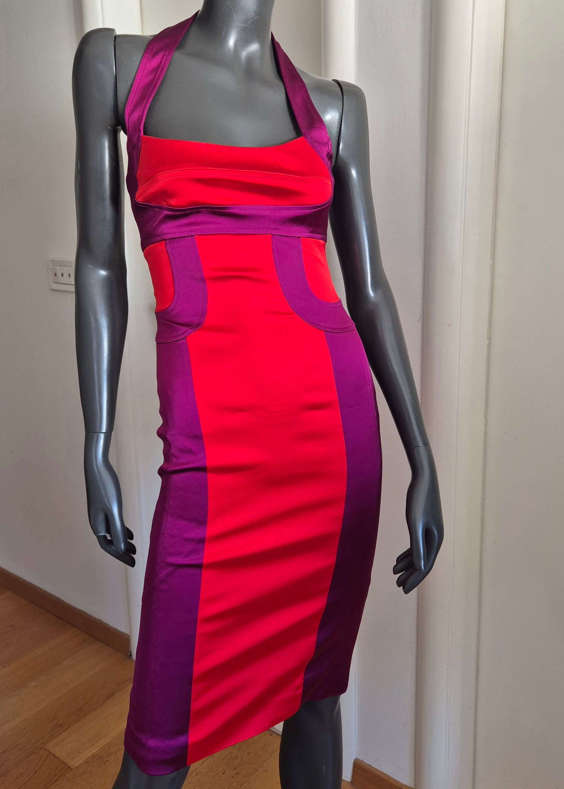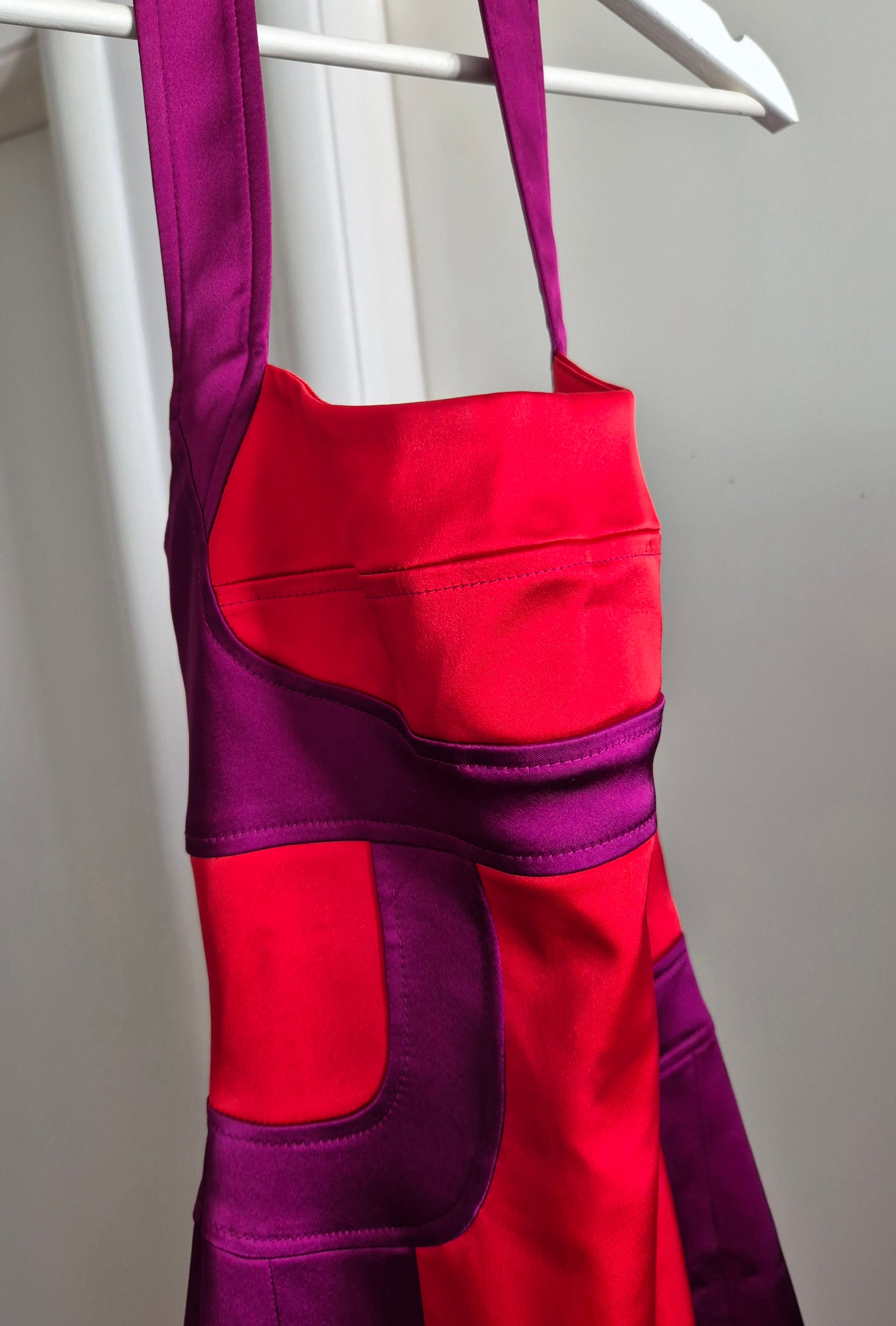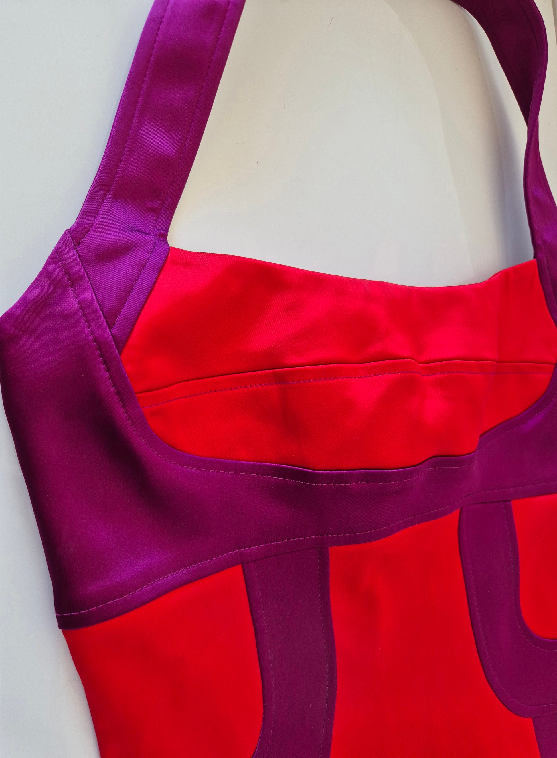 Dizajnerska Karen Millen haljina, savršena kombinacija boja - crvena i ljubičasta ❤️💜. Odličan kroj! Fini saten; sastav materijala na fotografiji. Podesive bretele. Kemijski očišćena.