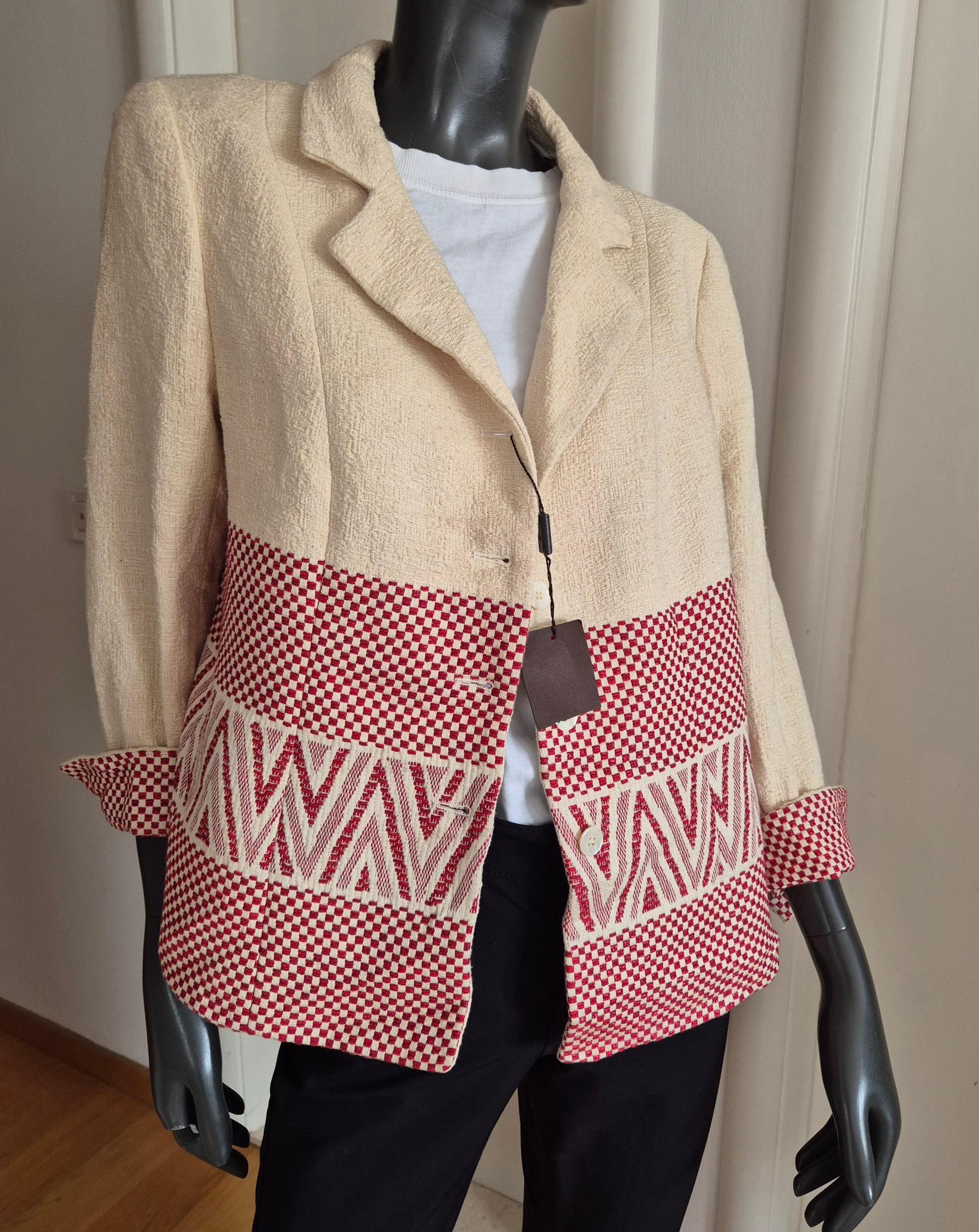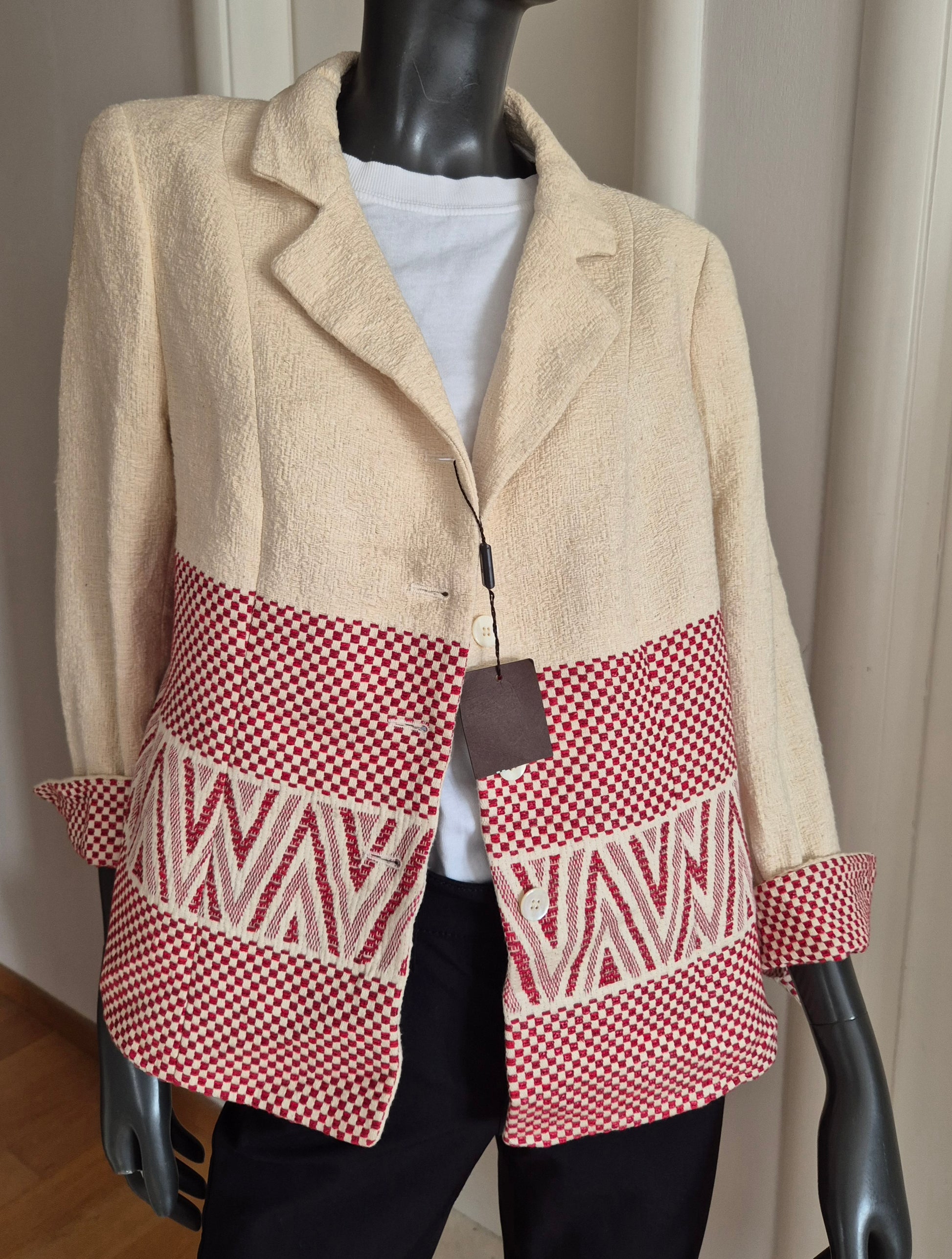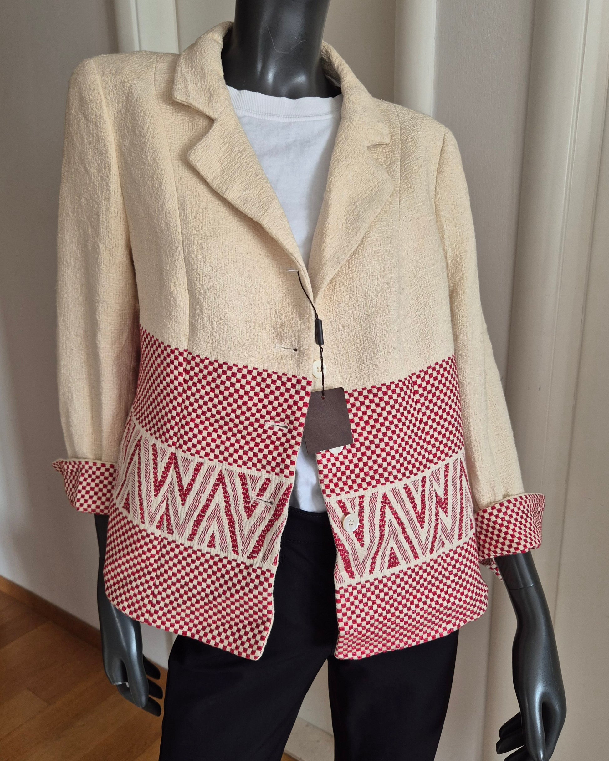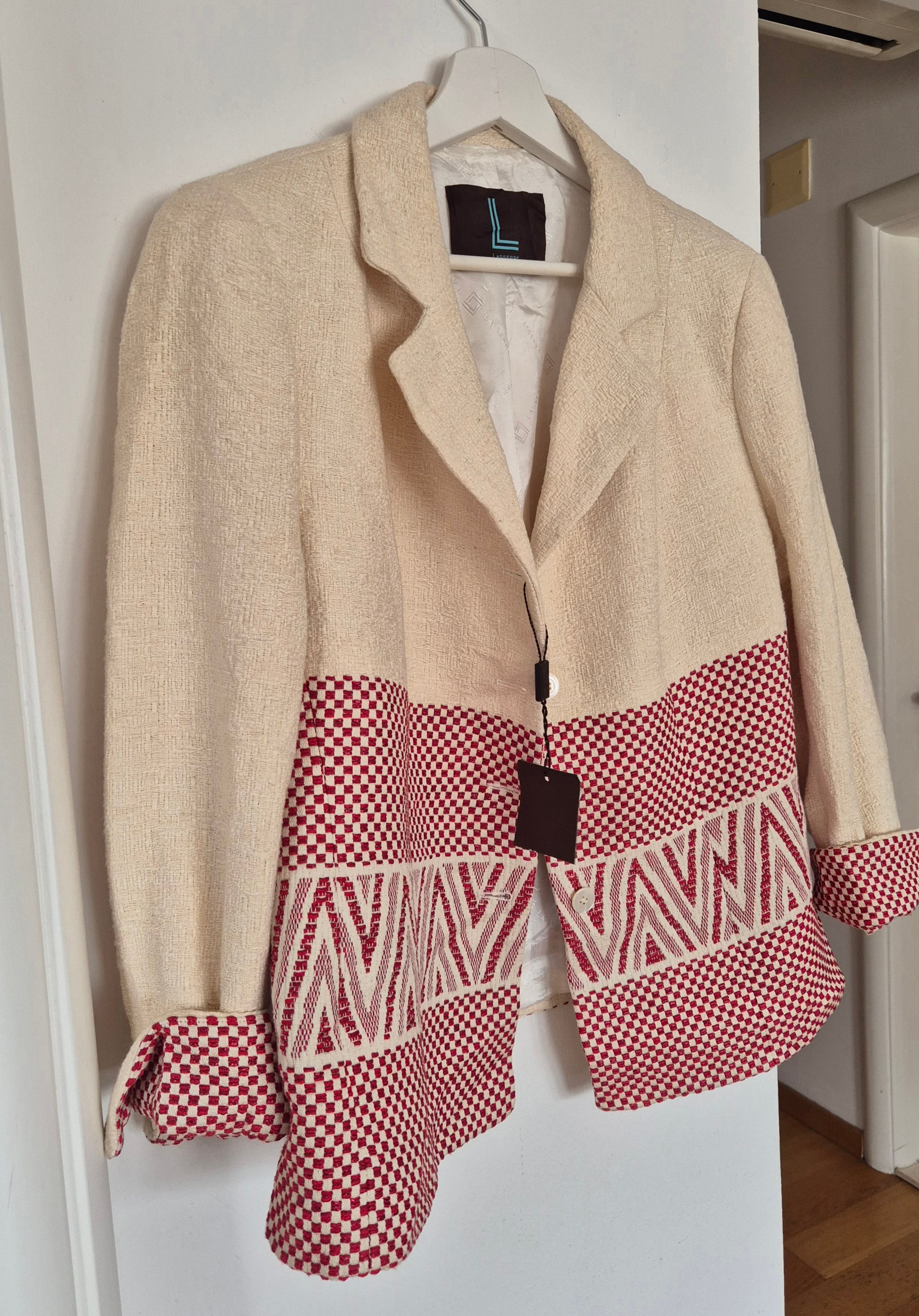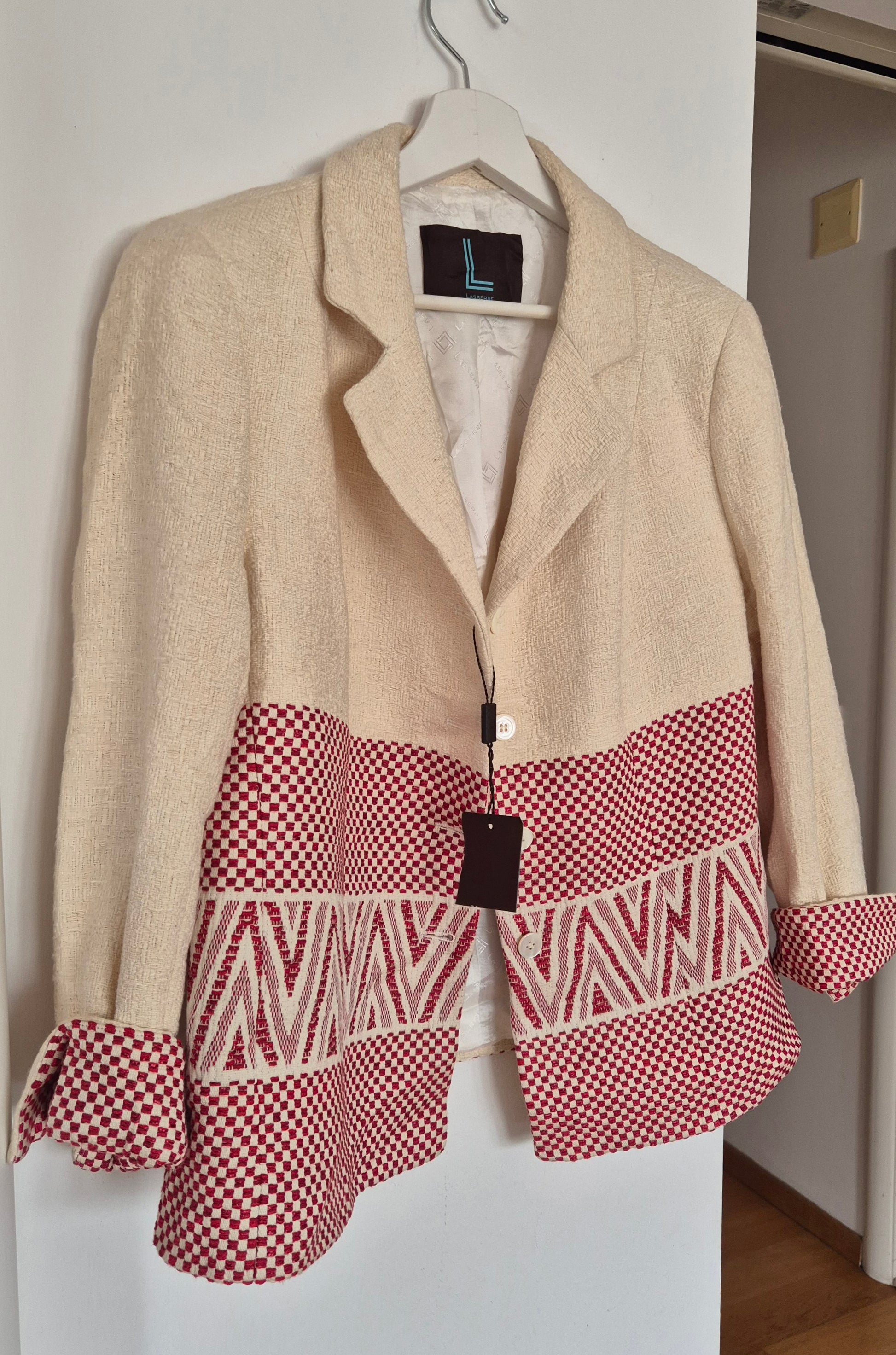 Jakna brenda Lassere (pariški brend kojeg je osnovao Louis Lasserre). Prljavobijeli pamučni bukle, crveni vez. Odličan komad. Nekorištena, s etiketom, redovna cijena 330 €.