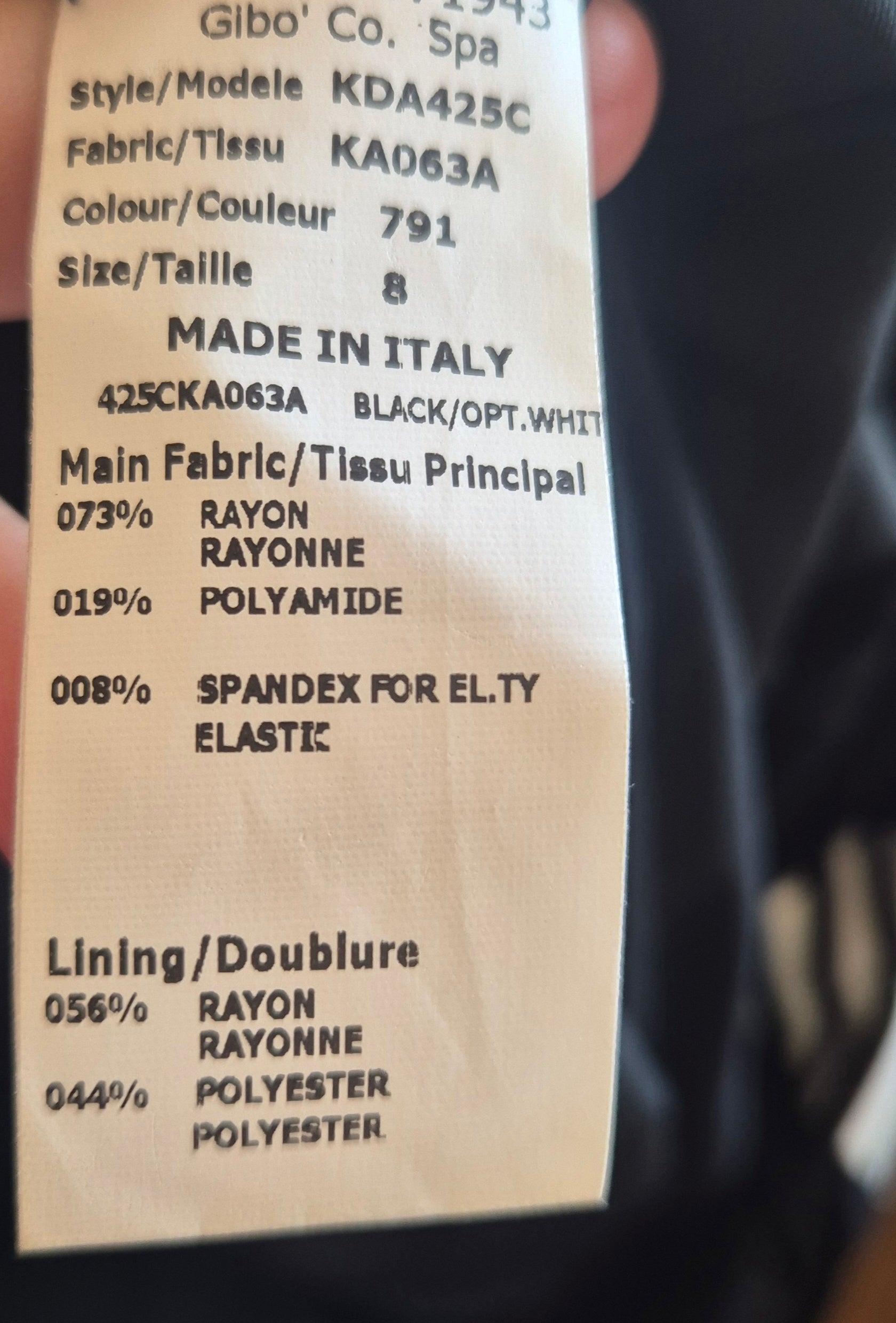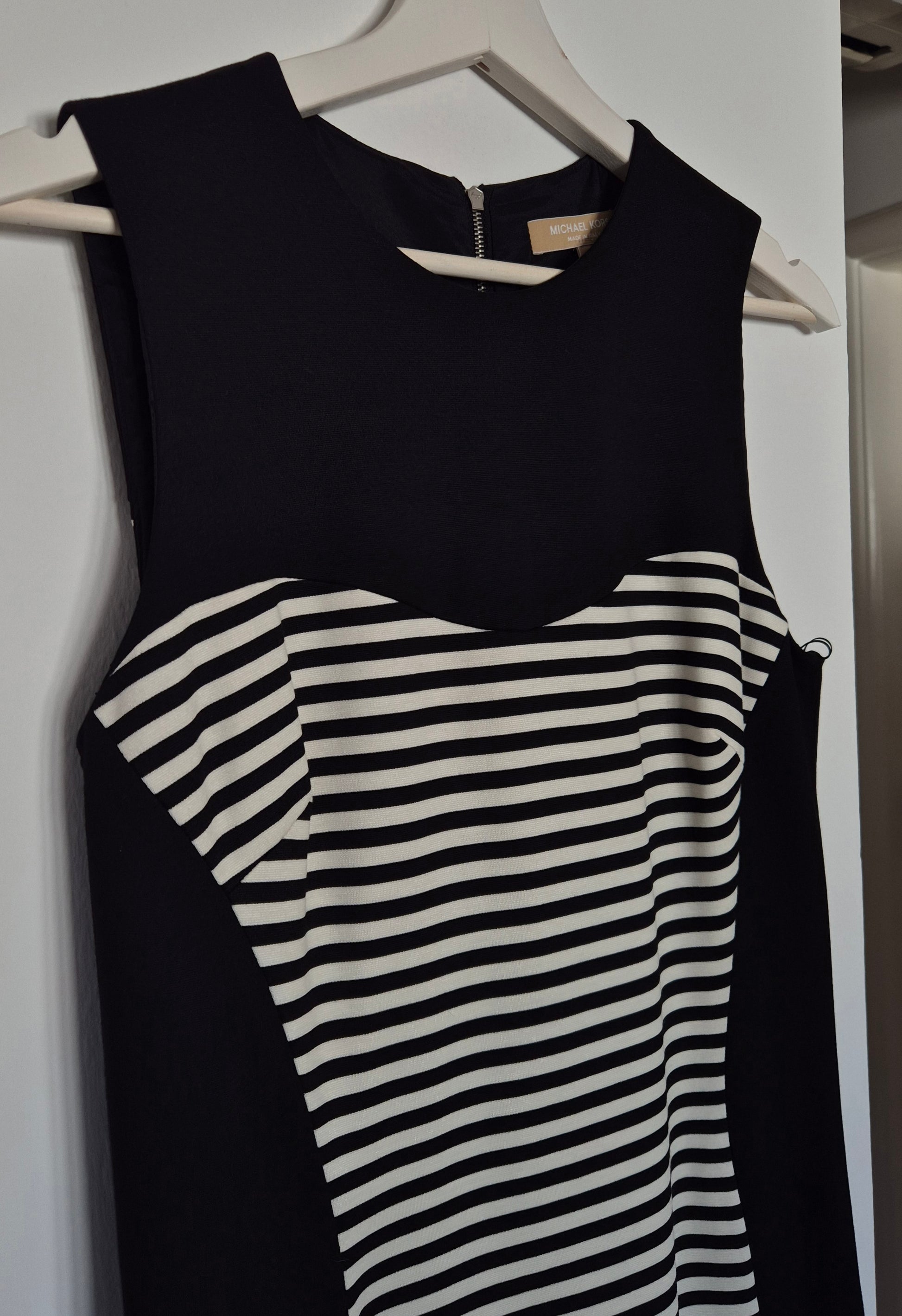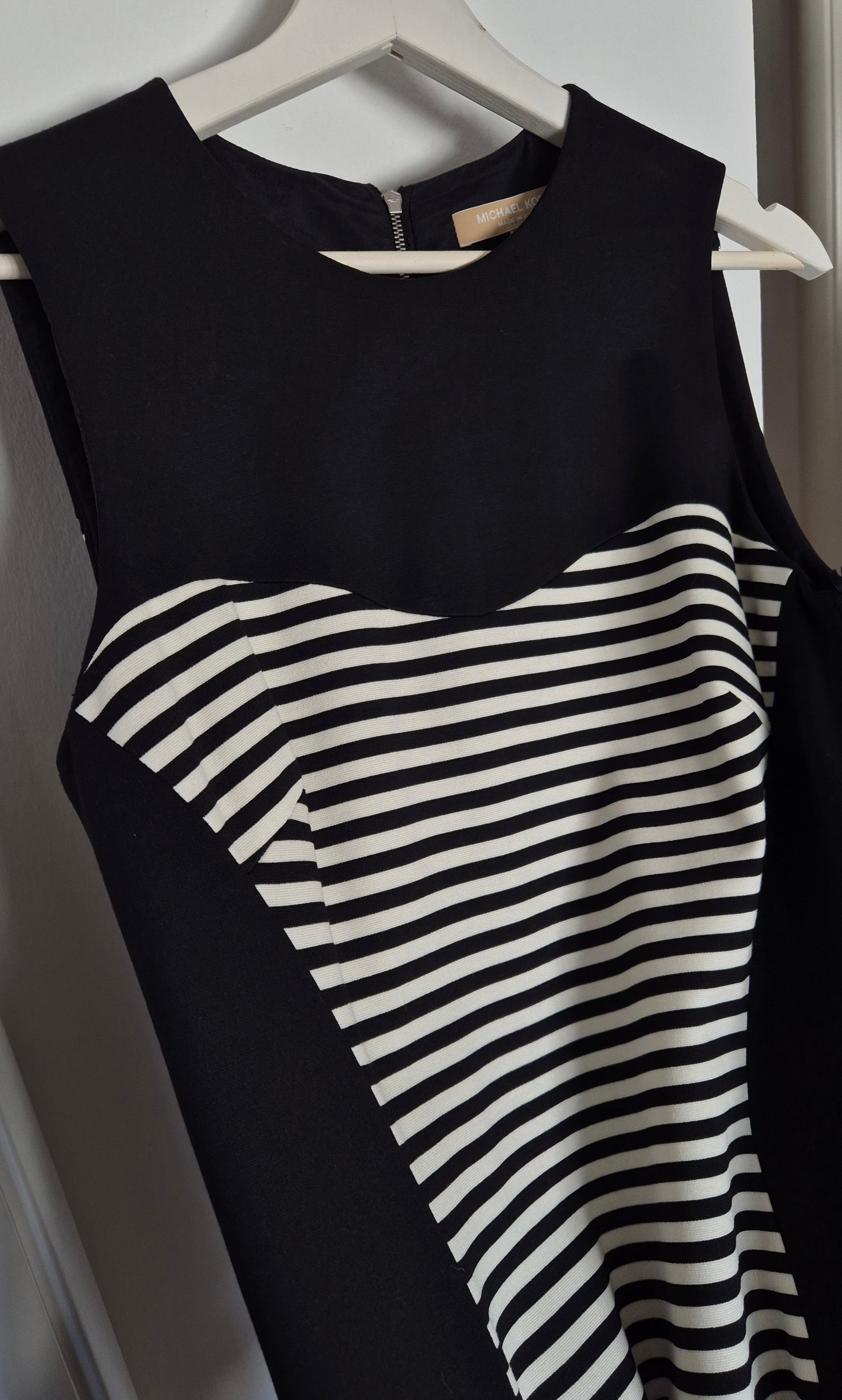 Michael Kors haljina, crno-prljavobijela, raspodjela uzorka koja vizualno sužava figuru. Sastav materijala na posljednjoj fotografiji.