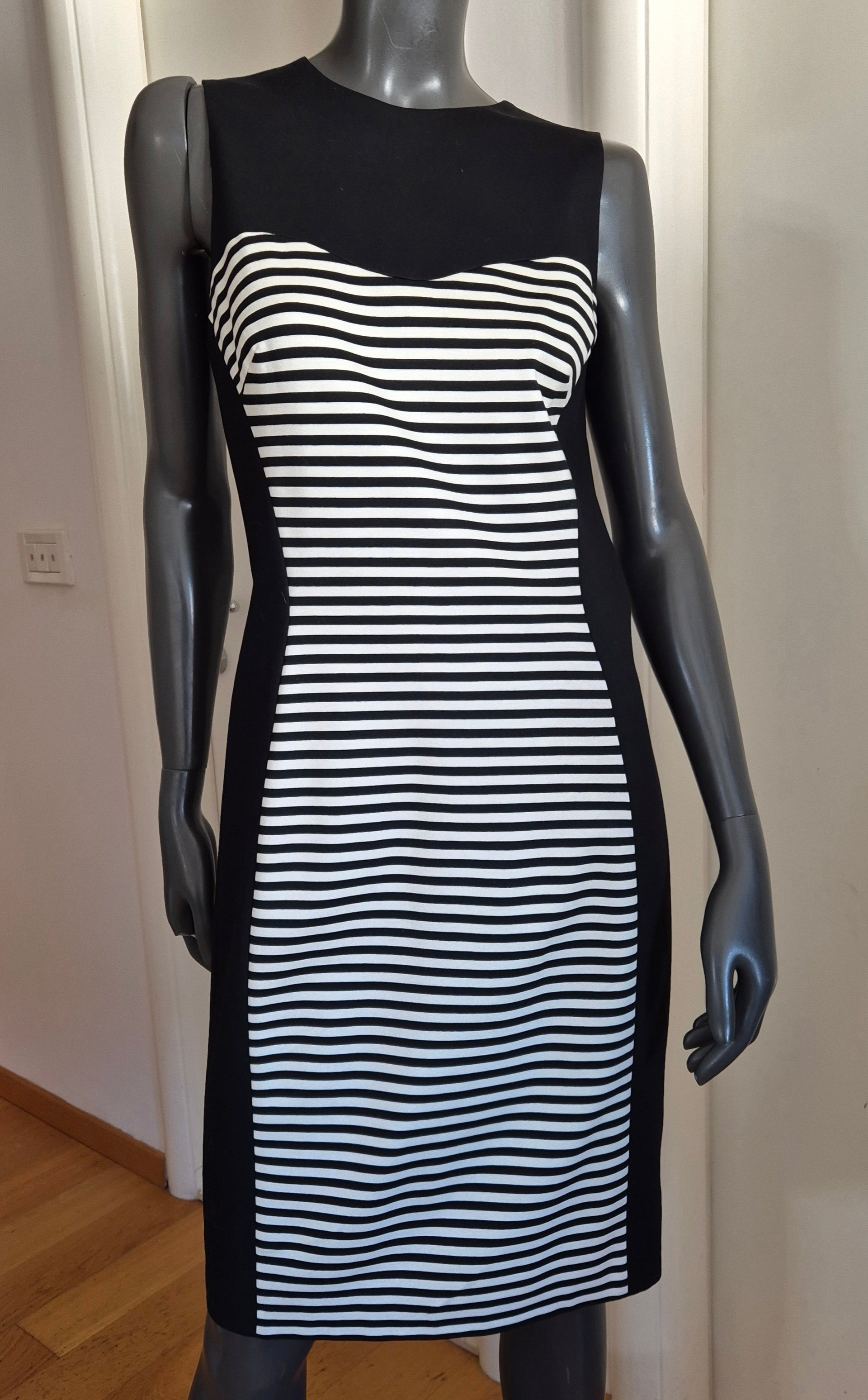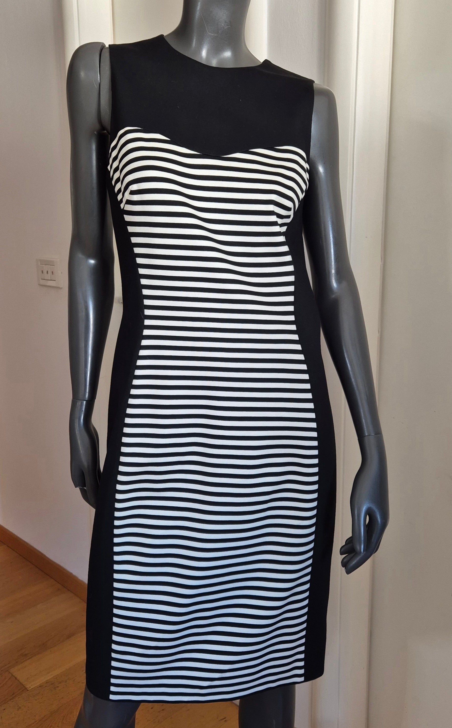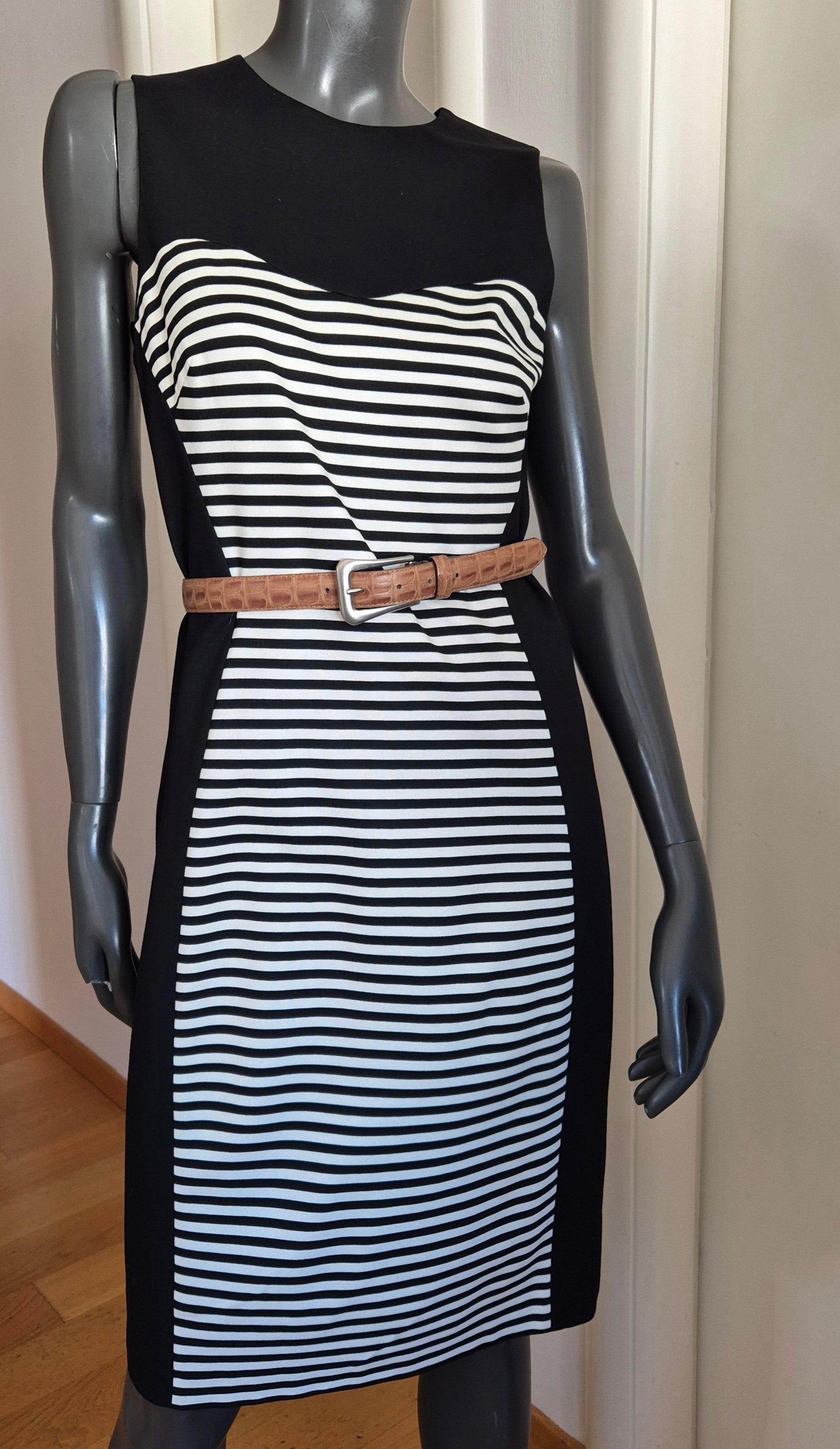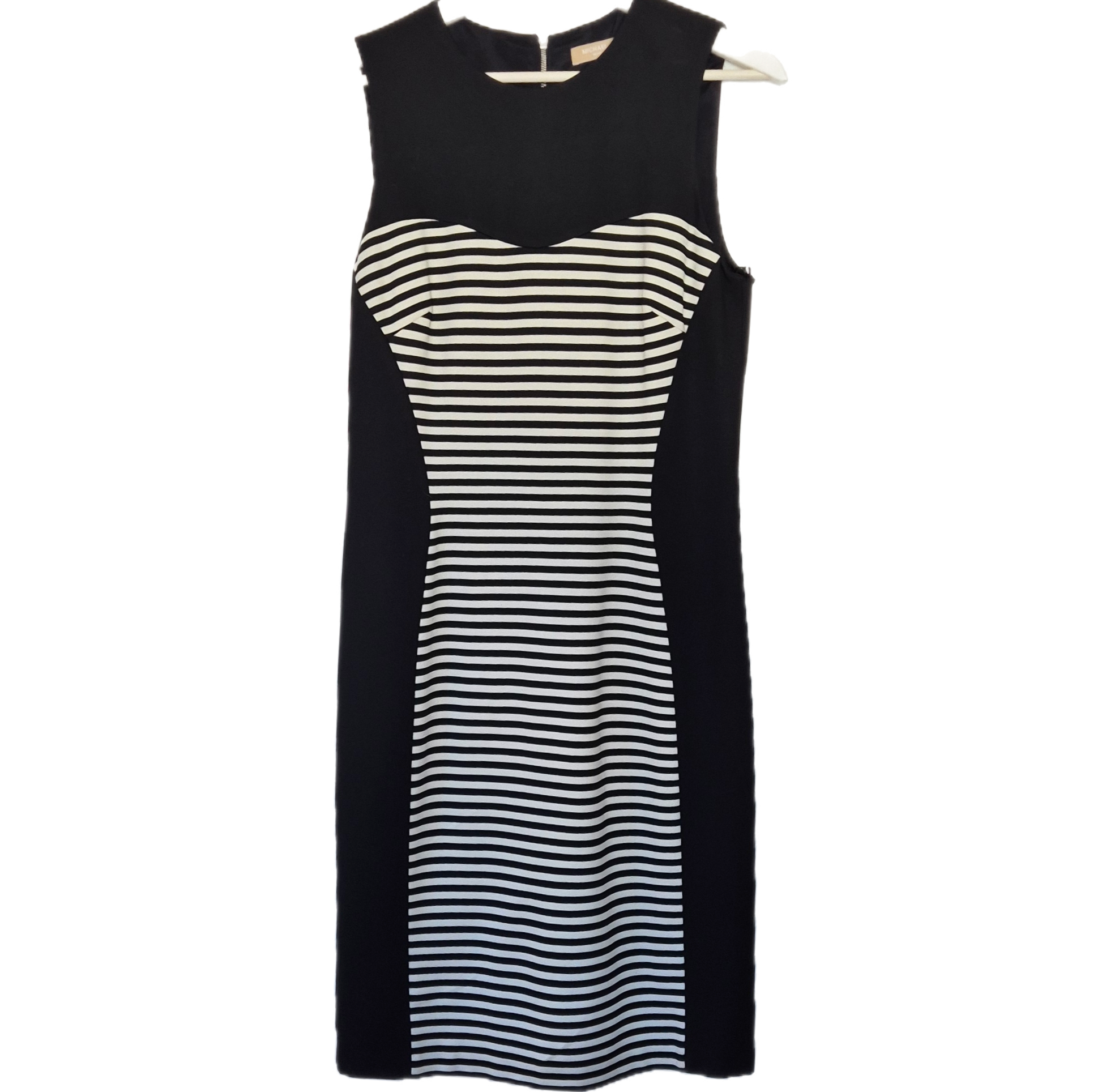Michael Kors haljina, crno-prljavobijela, raspodjela uzorka koja vizualno sužava figuru. Sastav materijala na posljednjoj fotografiji.