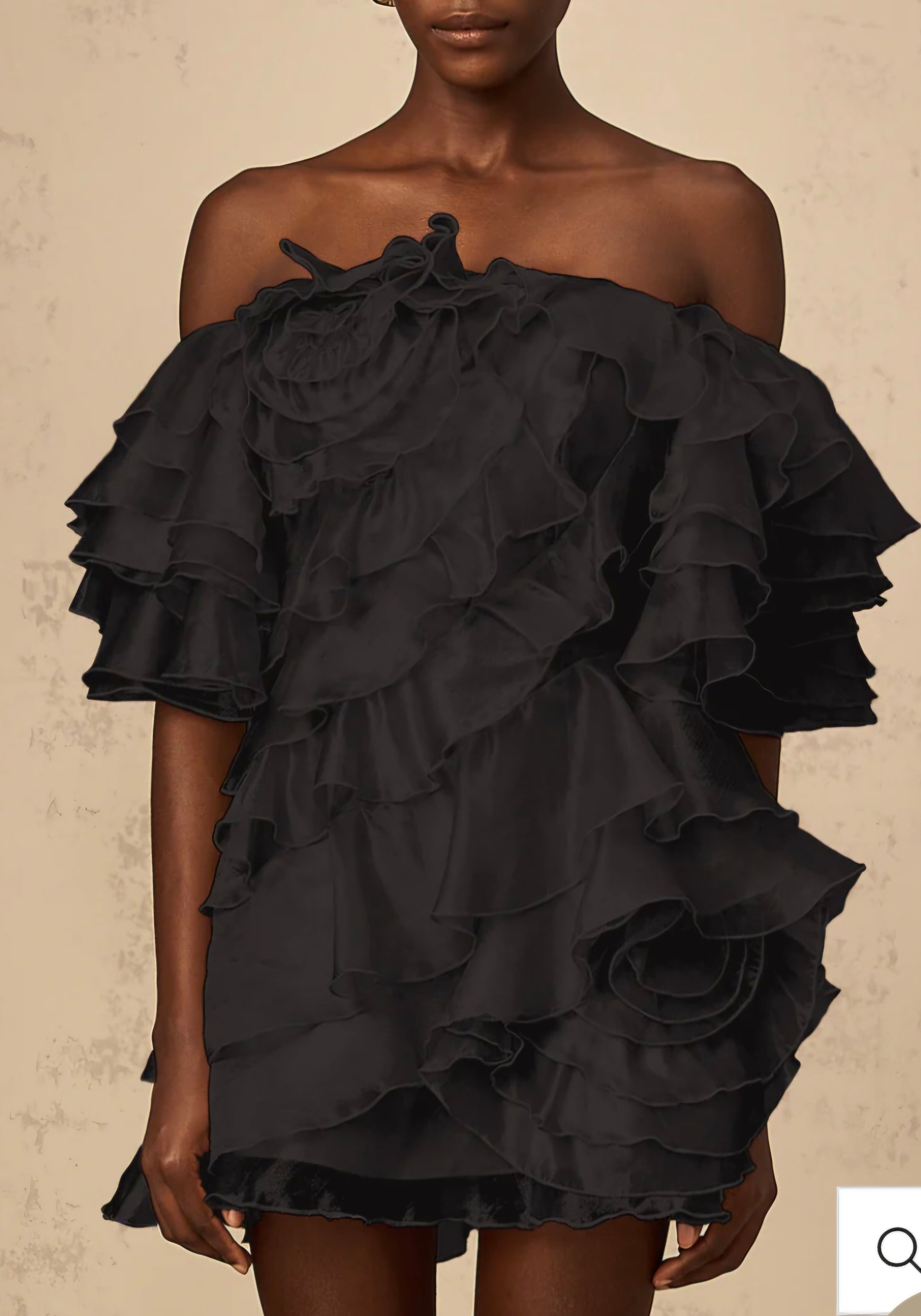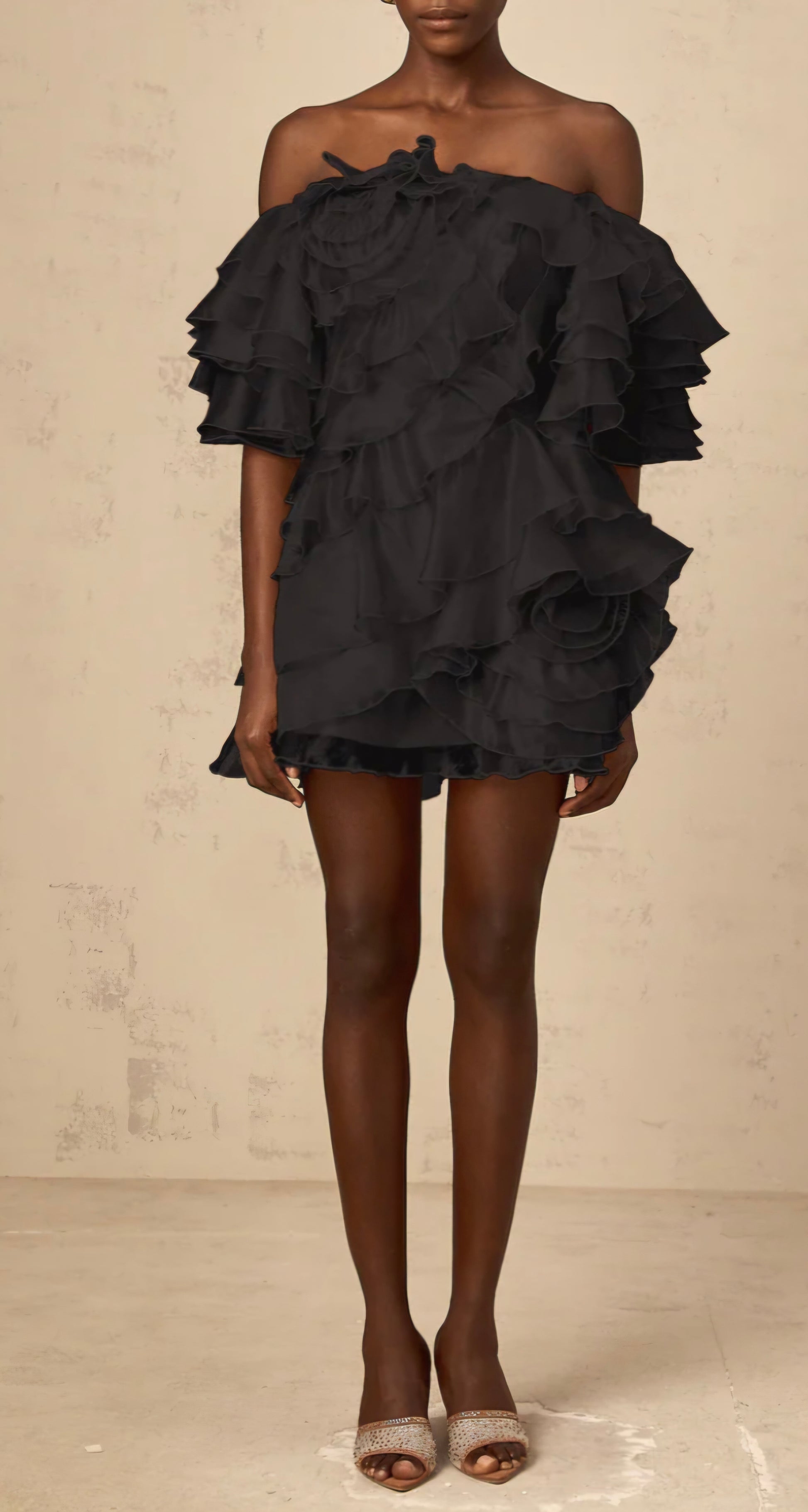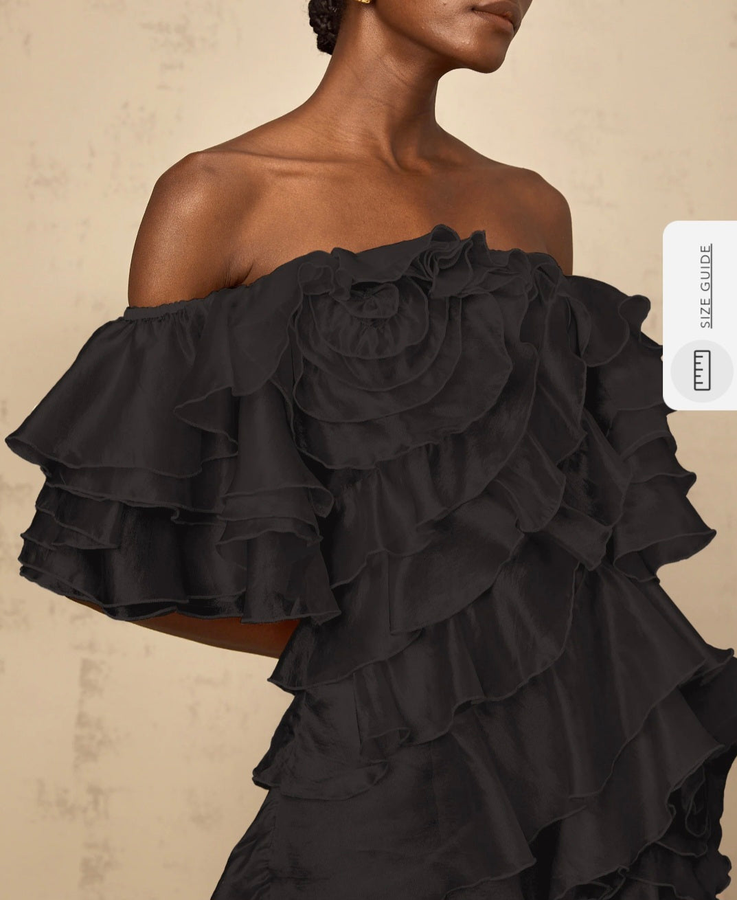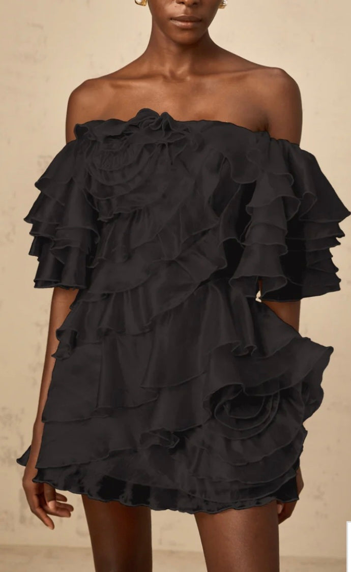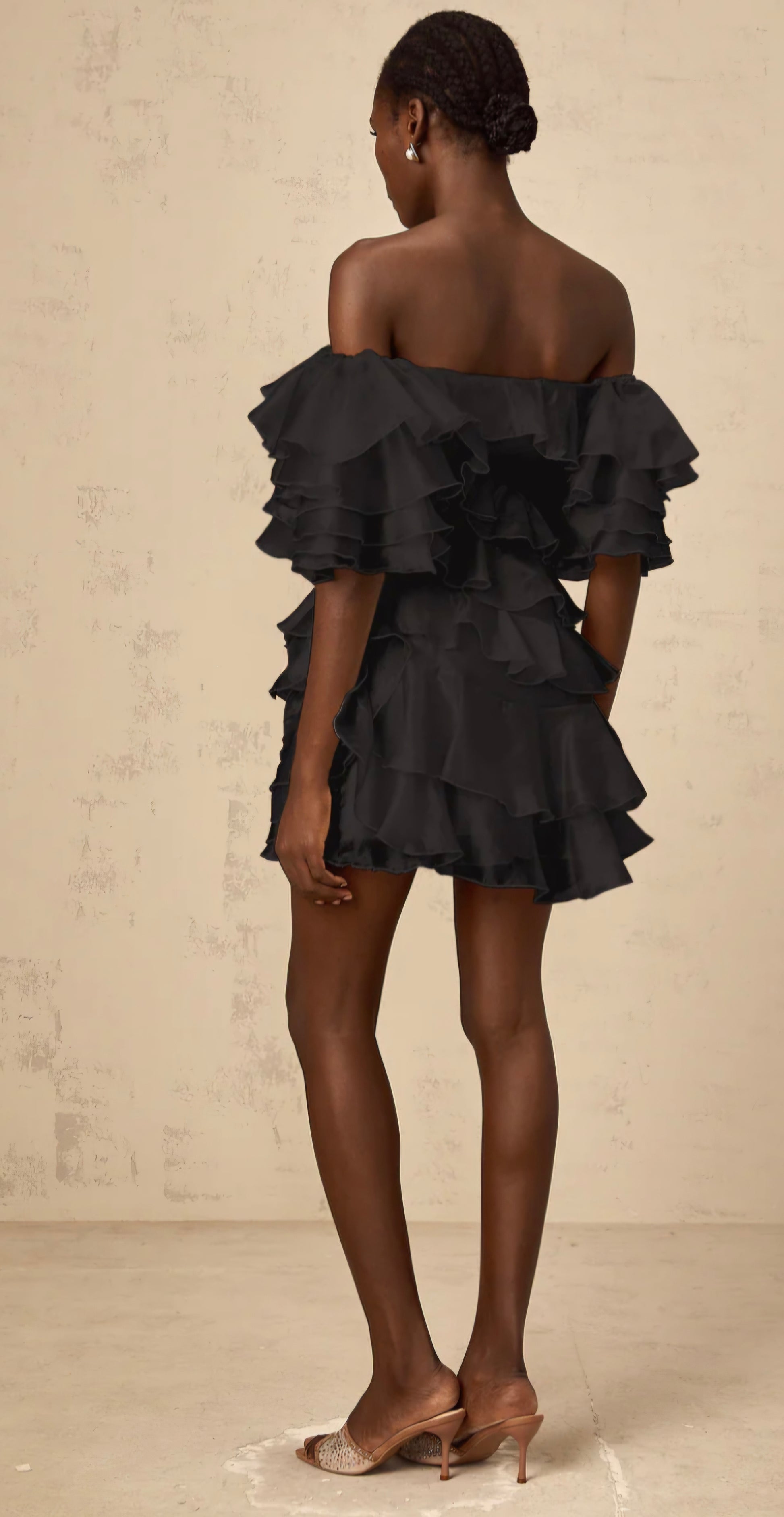 Miss Rosier off shoulder (gola ramena) haljina. Model Cerise. Crna s volanima (koji mjestimično tvore cvijet).