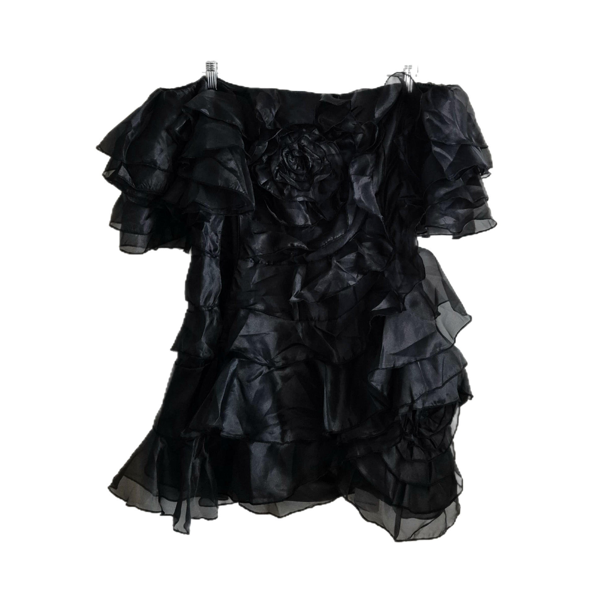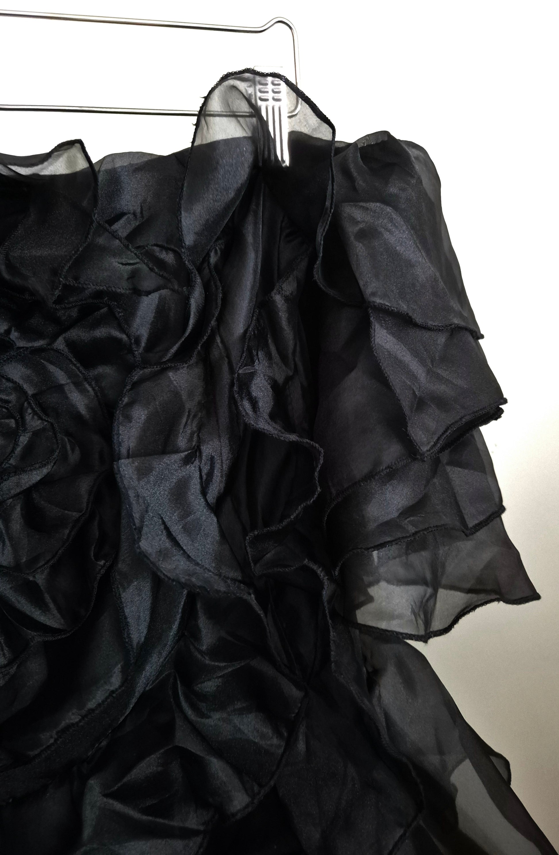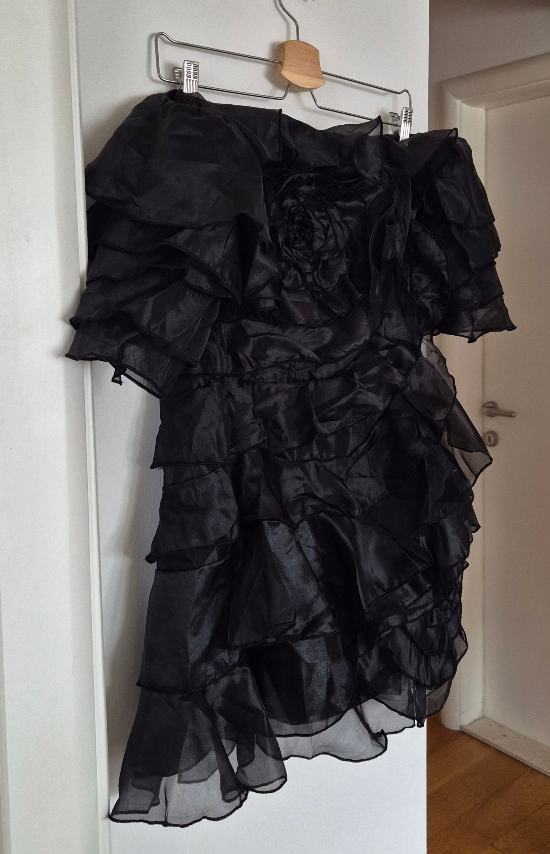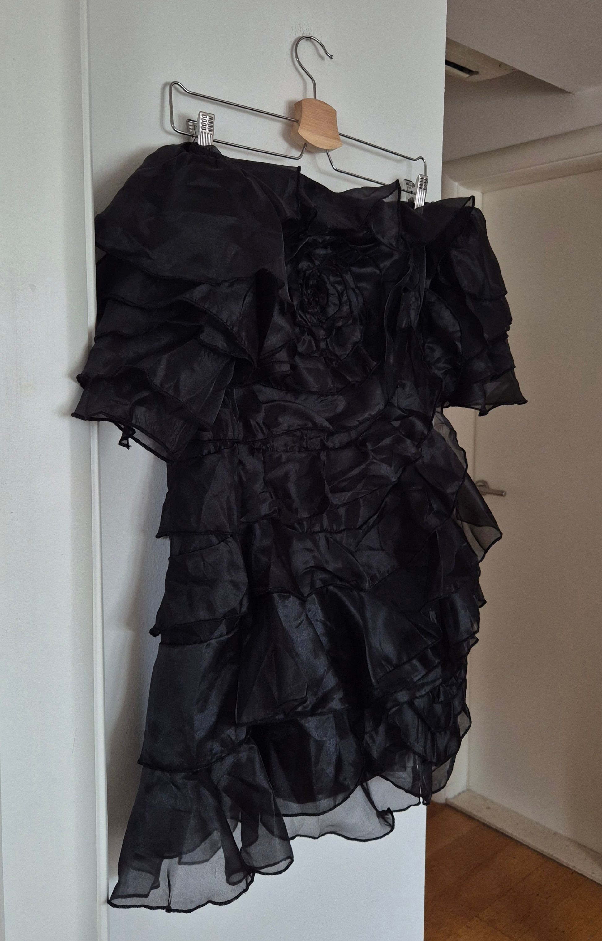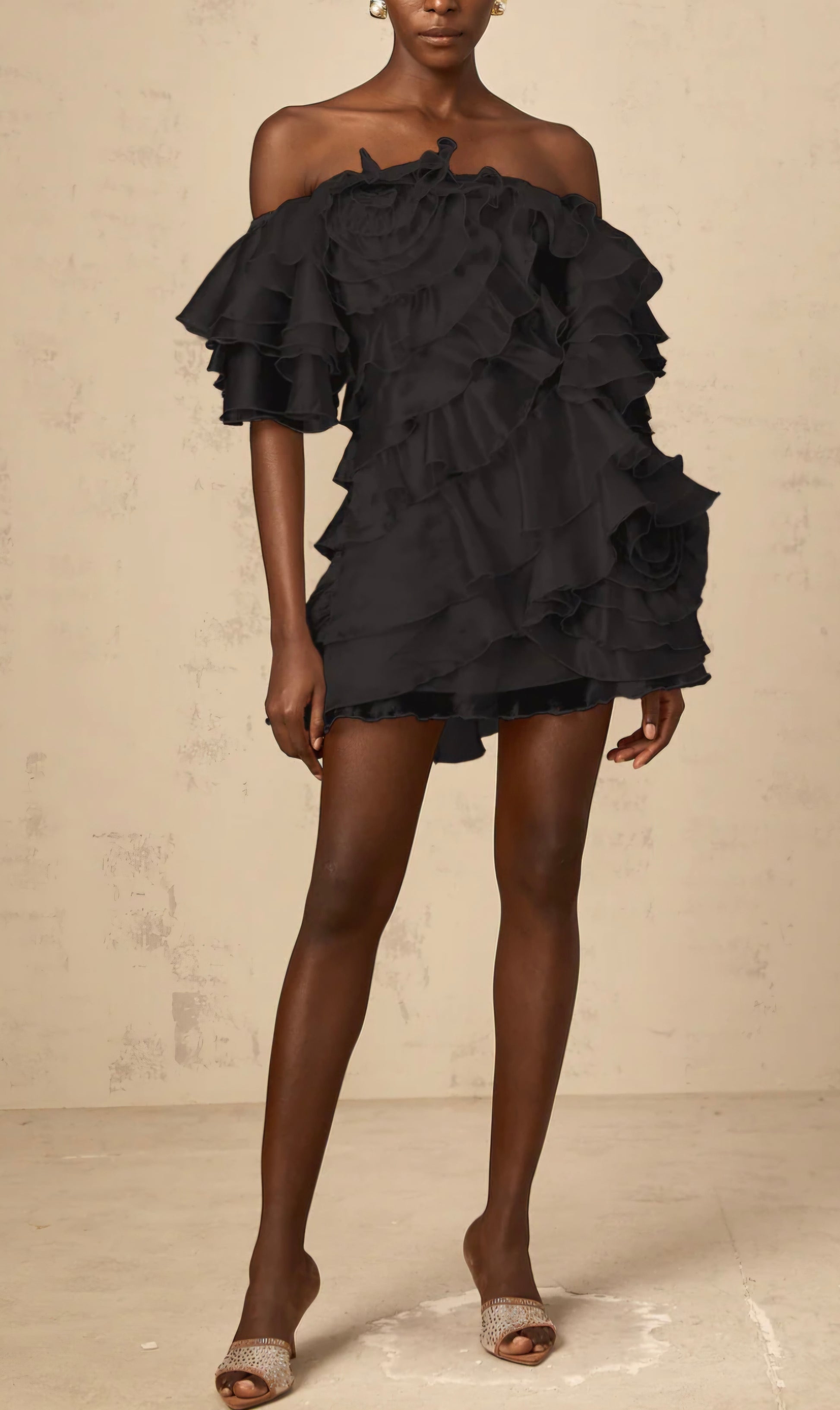 Miss Rosier off shoulder (gola ramena) haljina. Model Cerise. Crna s volanima (koji mjestimično tvore cvijet).