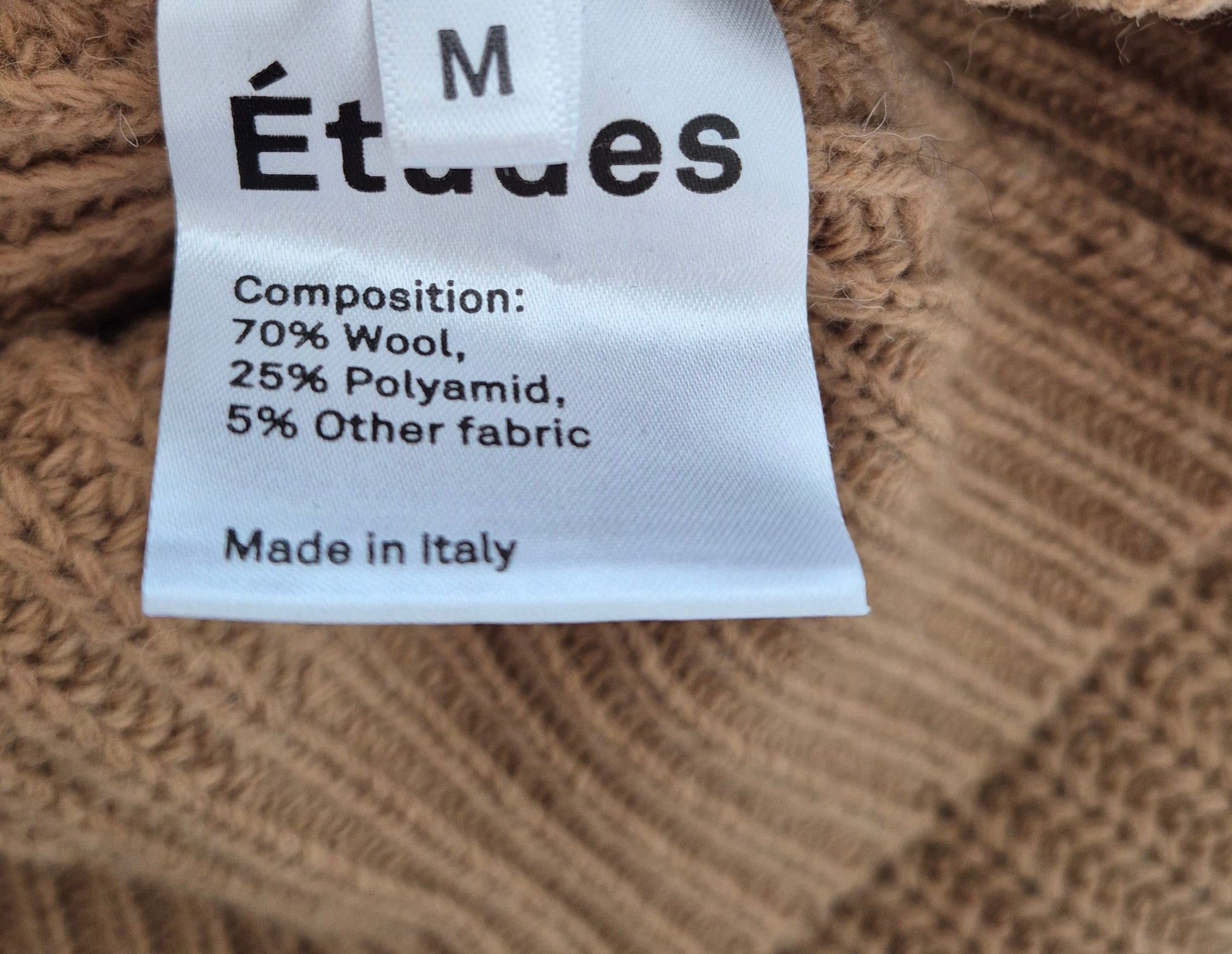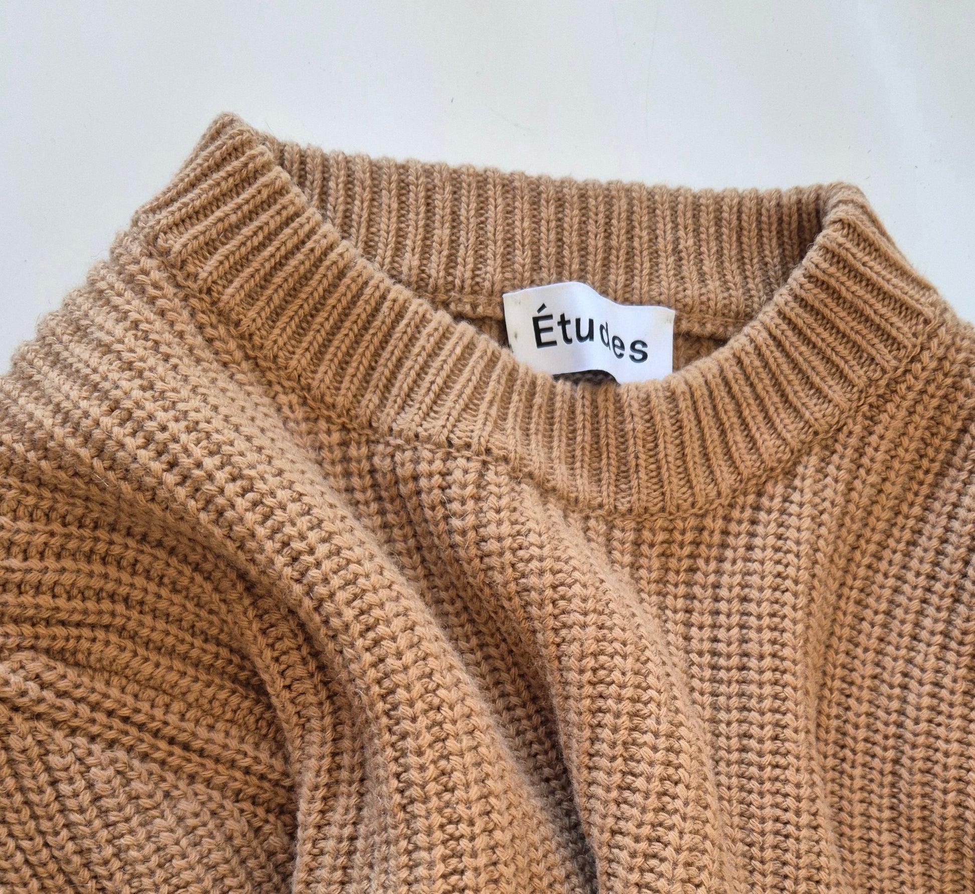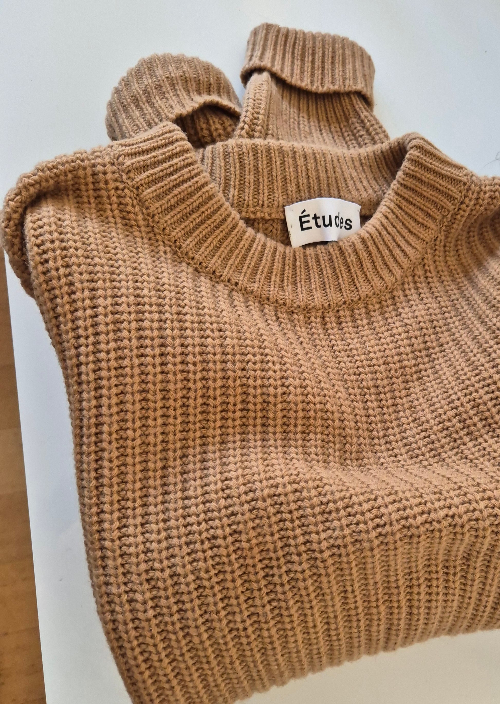 Études pleteni pulover. Boja je tamna beige/tan. 70% vuna, 25% poliamid, 5% druga vlakna. Na leđima malo drukčije pleten - fora. Kvalitetan basic komad 👌