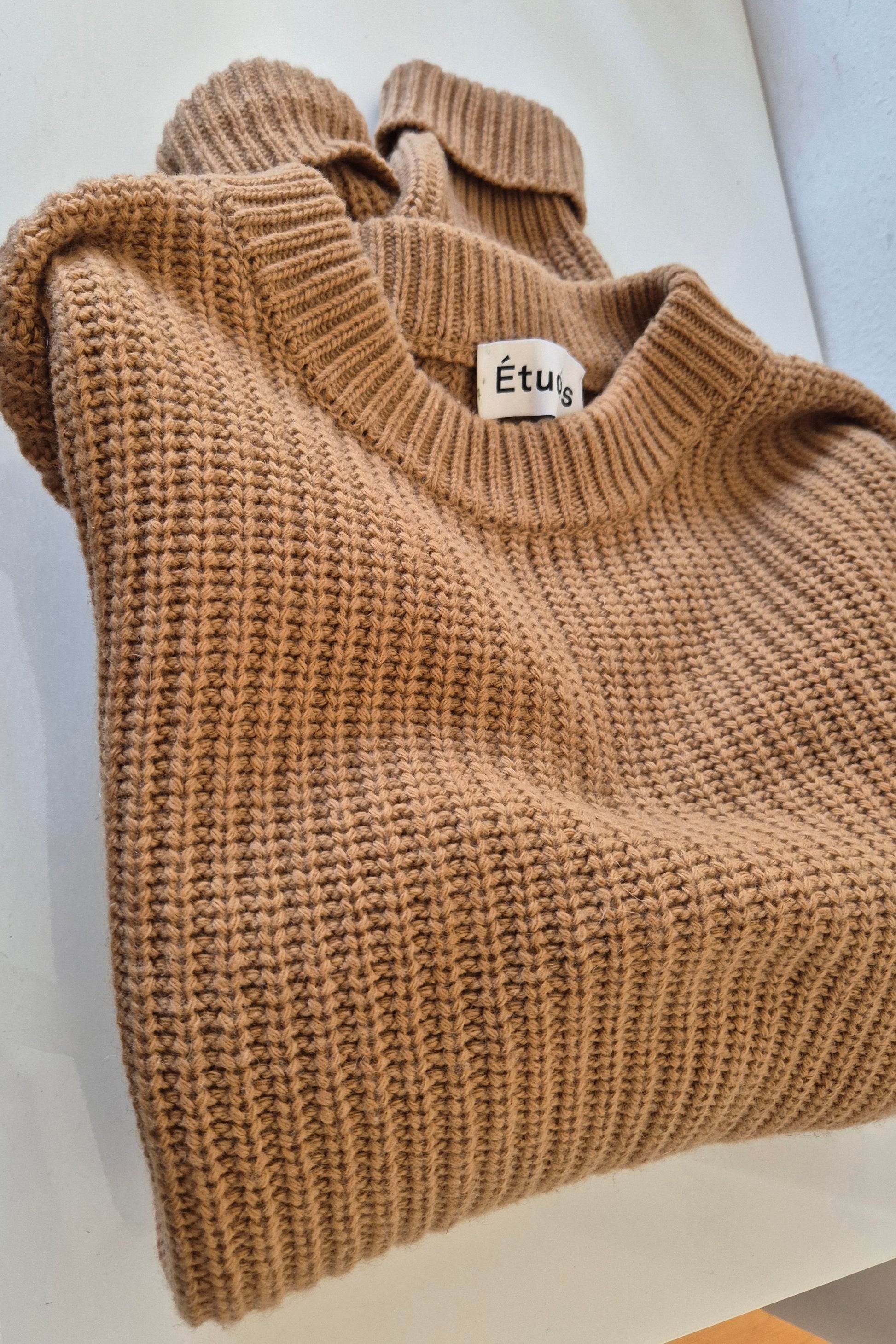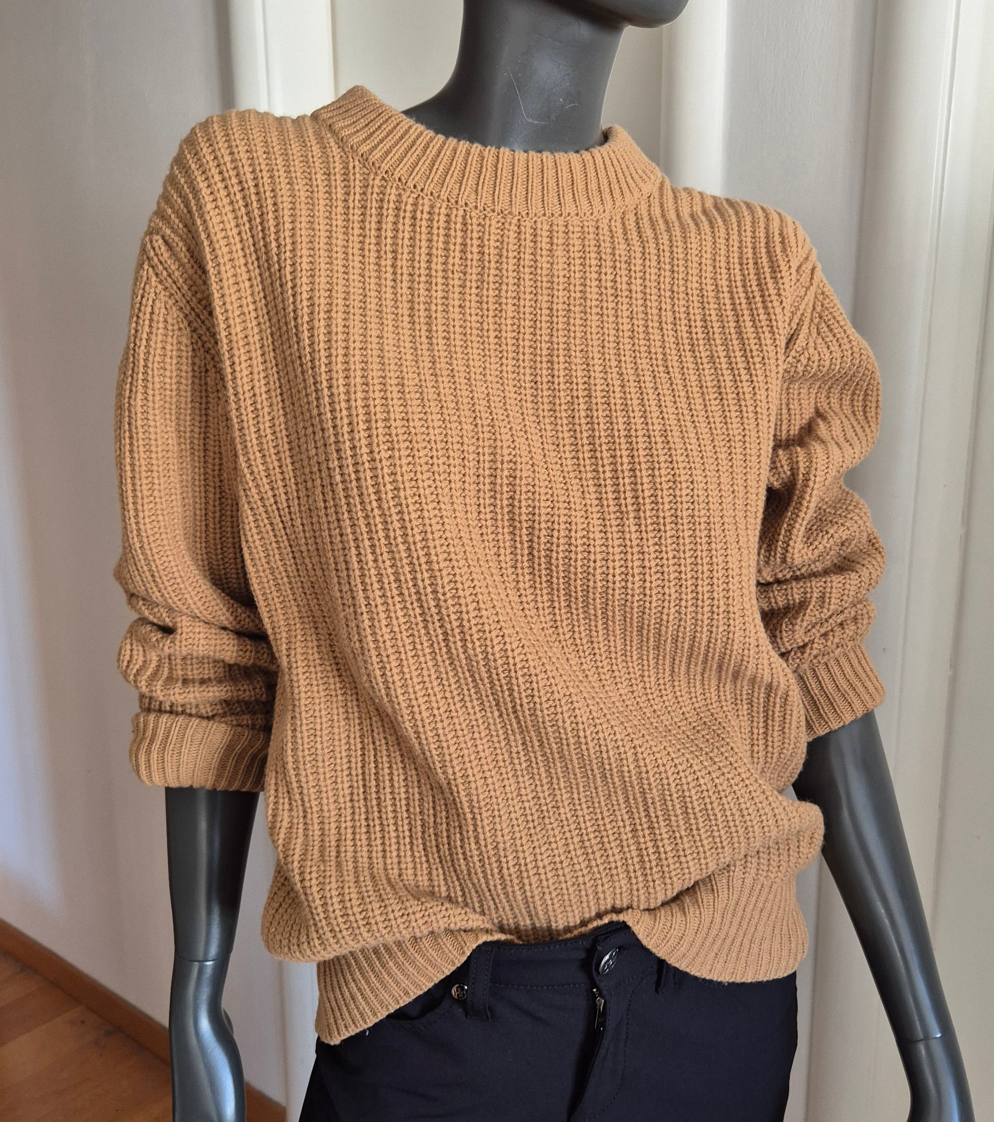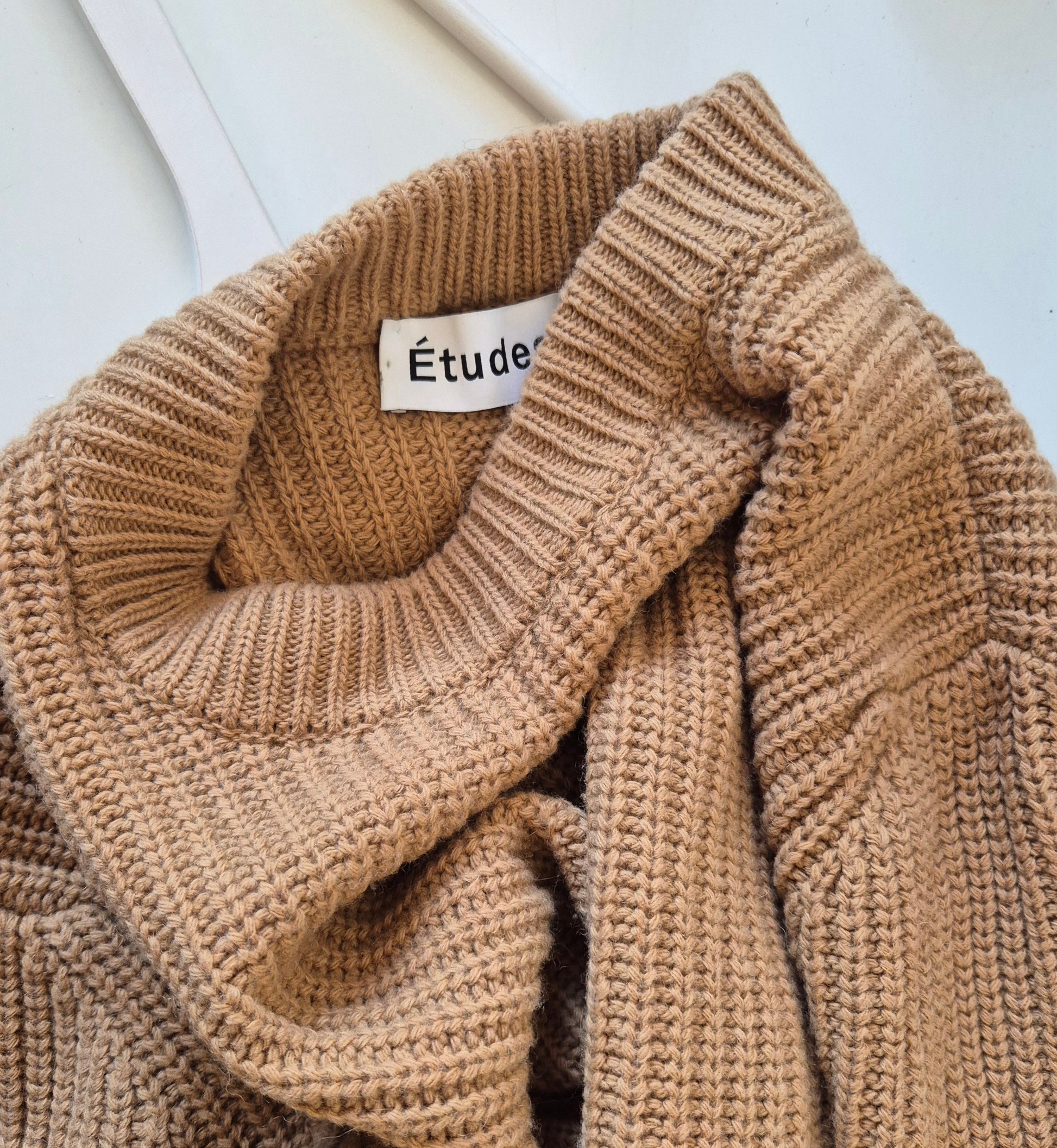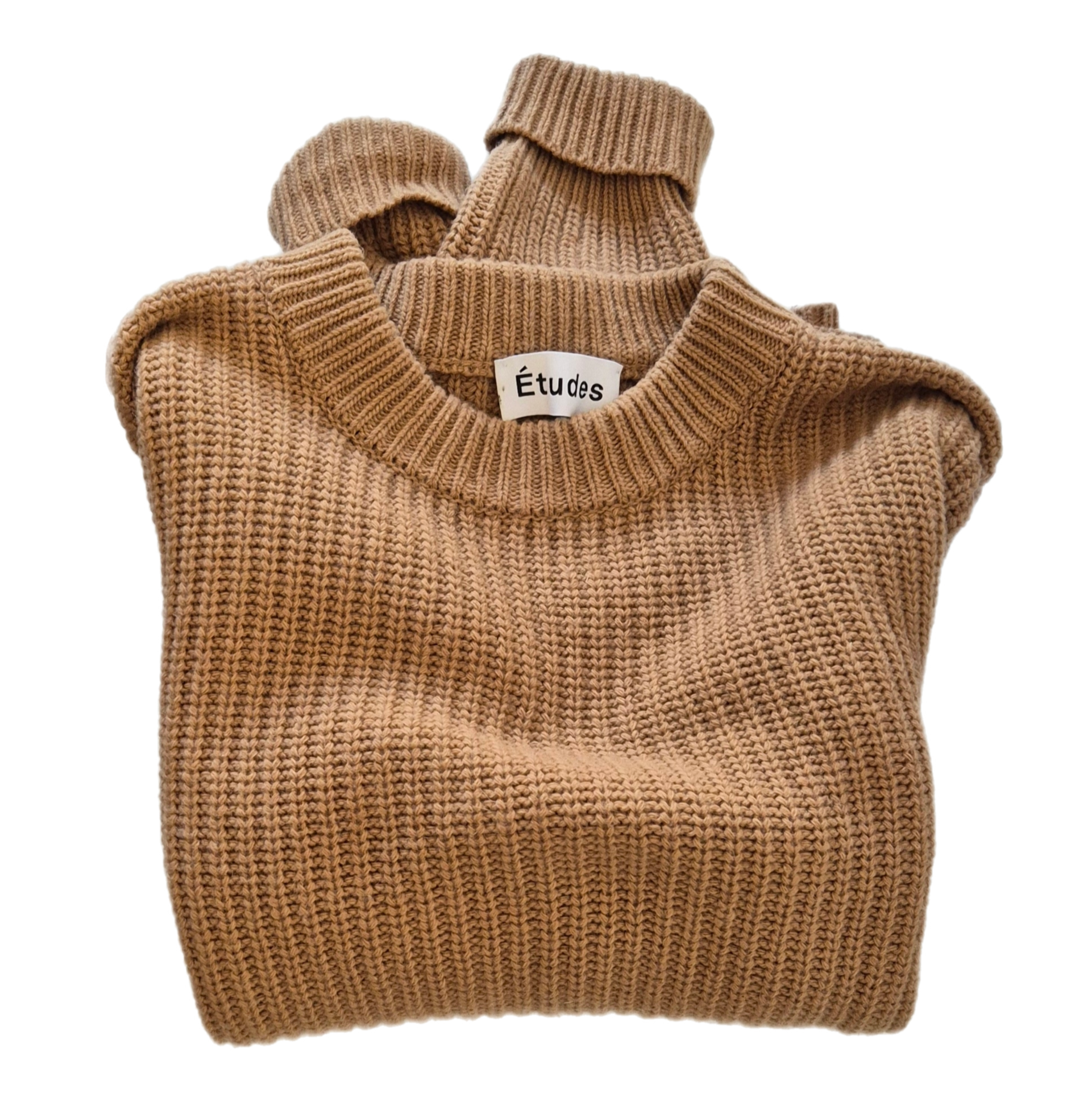 Études pleteni pulover. Boja je tamna beige/tan. 70% vuna, 25% poliamid, 5% druga vlakna. Na leđima malo drukčije pleten - fora. Kvalitetan basic komad 👌