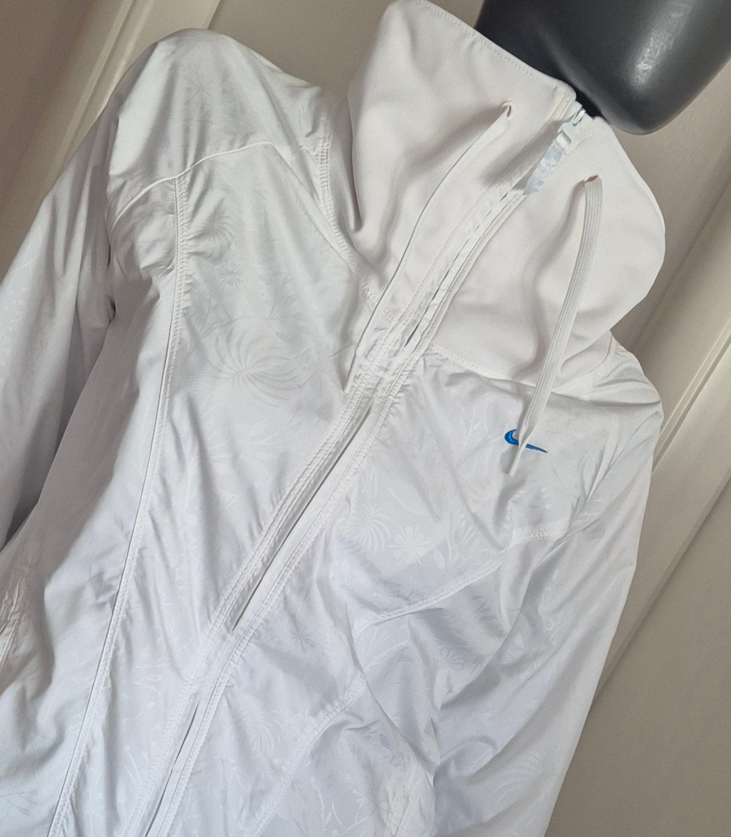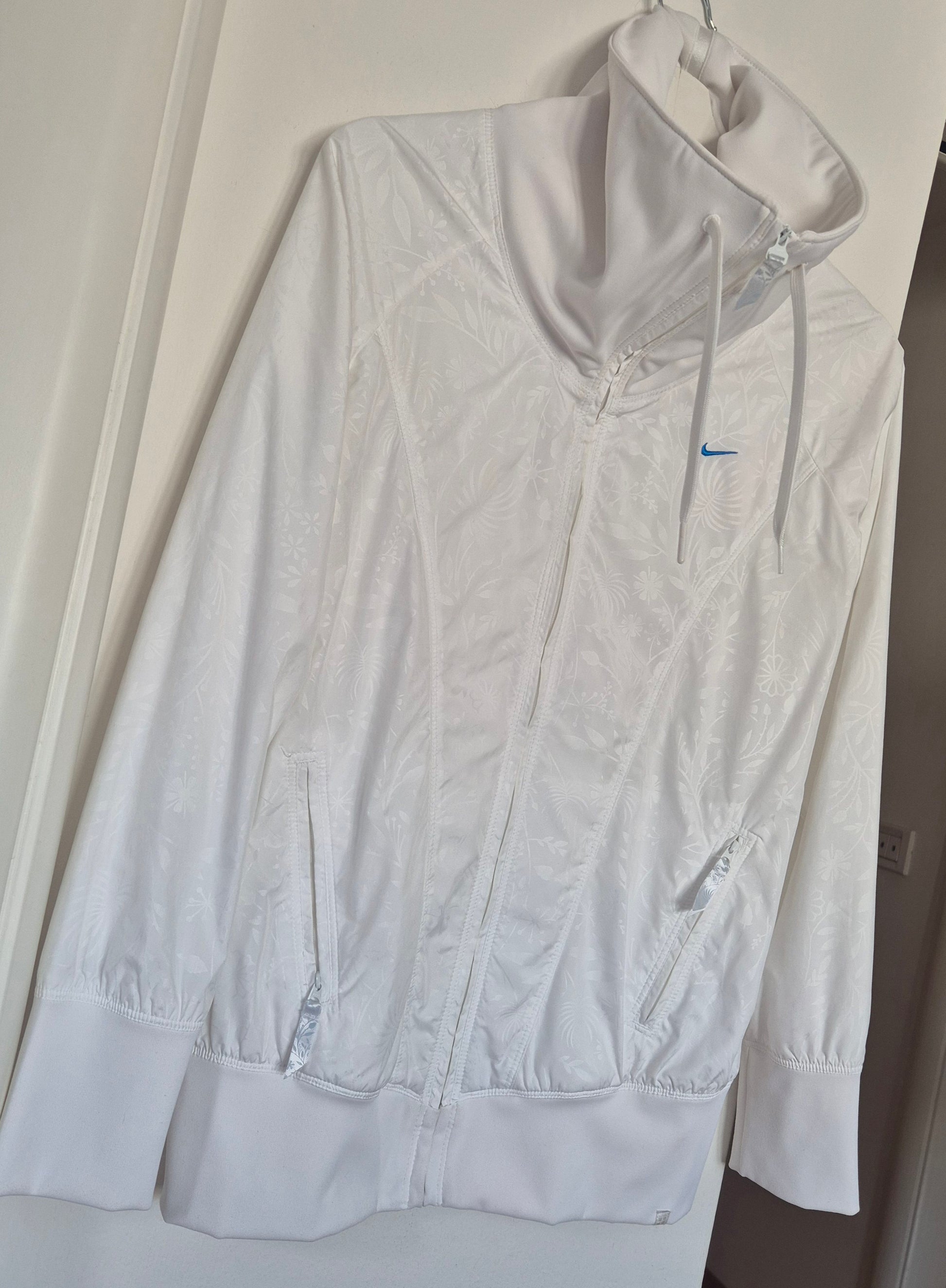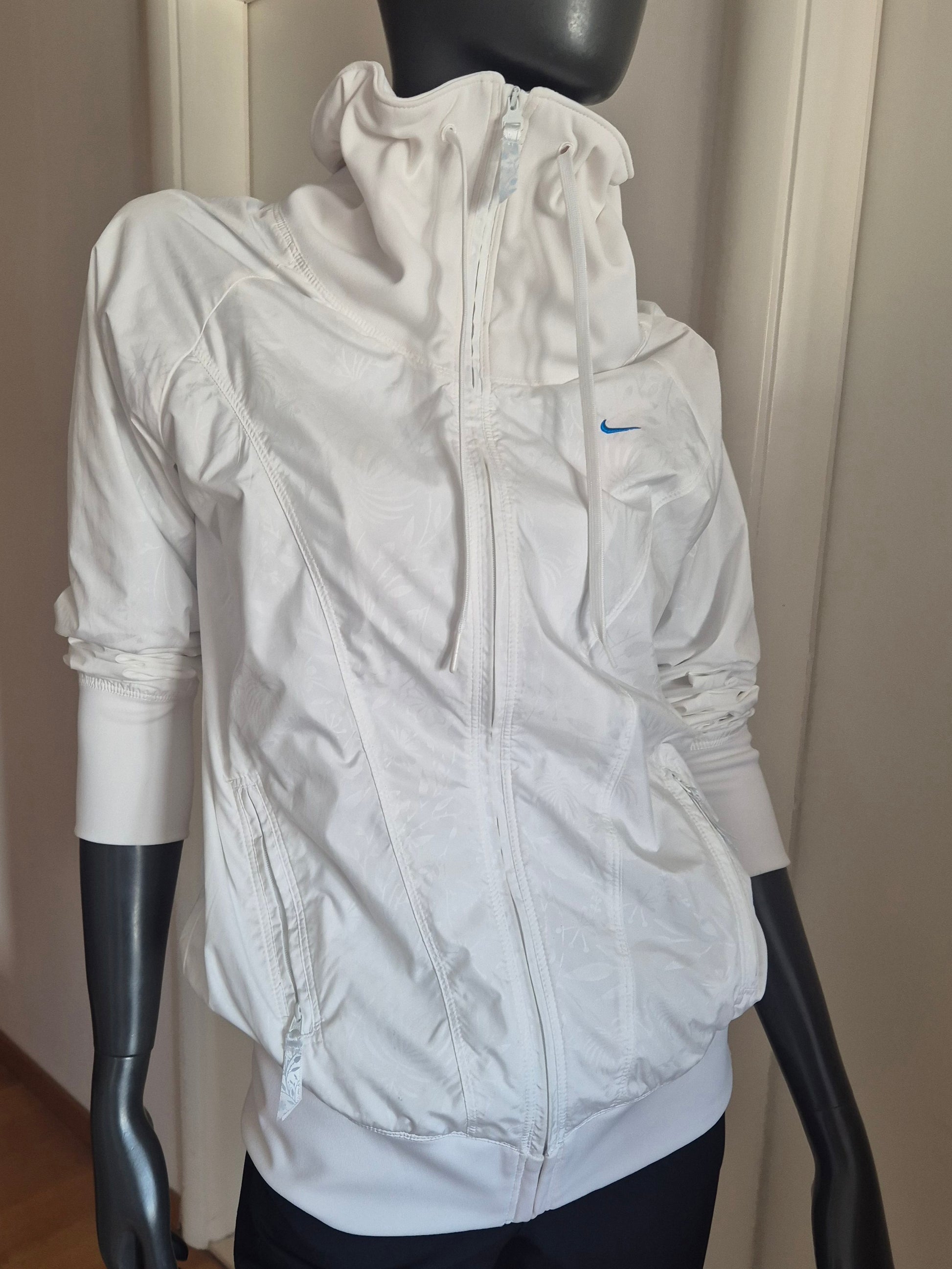 Nike bijela jakna, šuškavac. Visoki ovratnik koji se može i stisnuti. Decentan uzorak (nastao malom promjenom teksture).