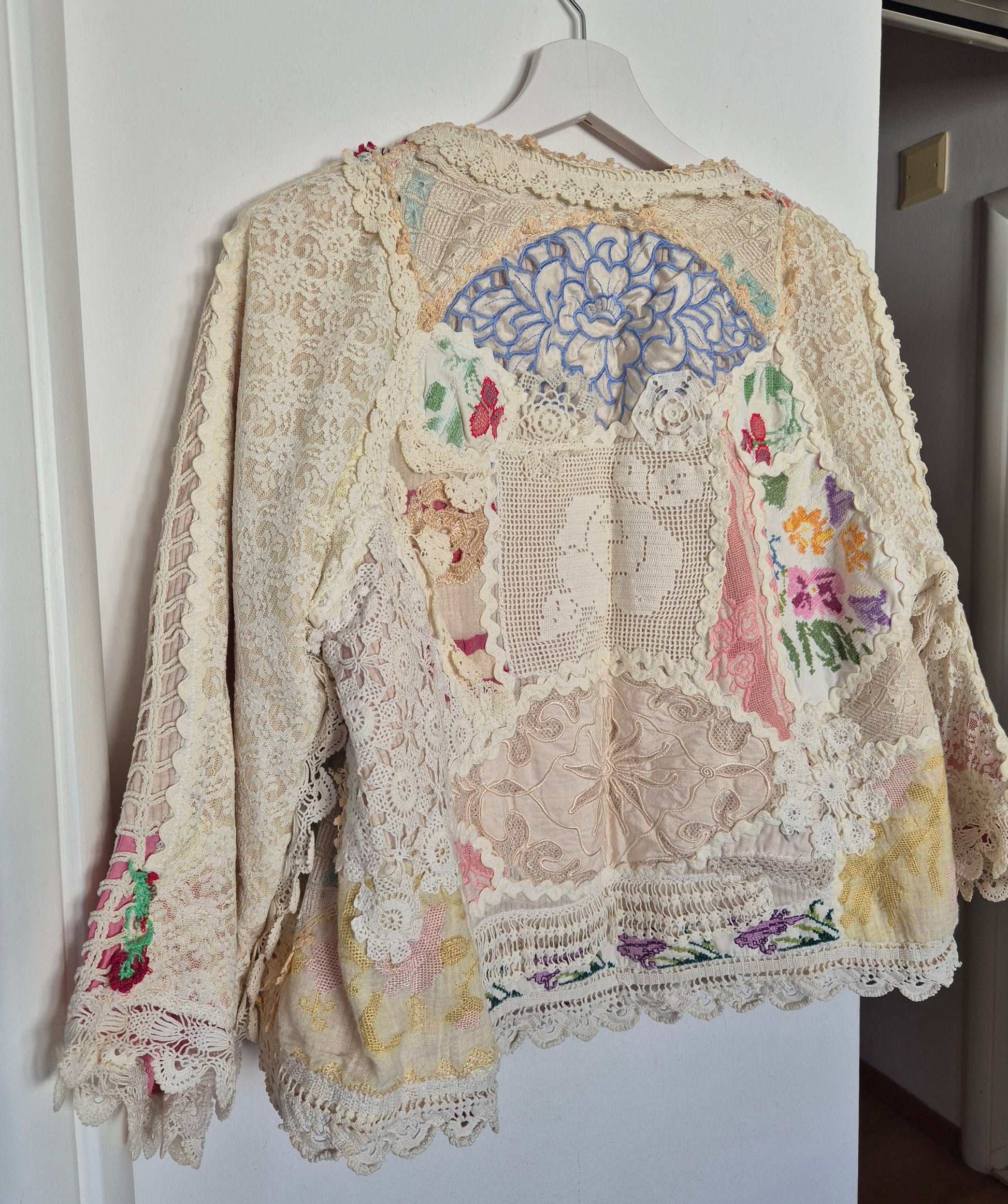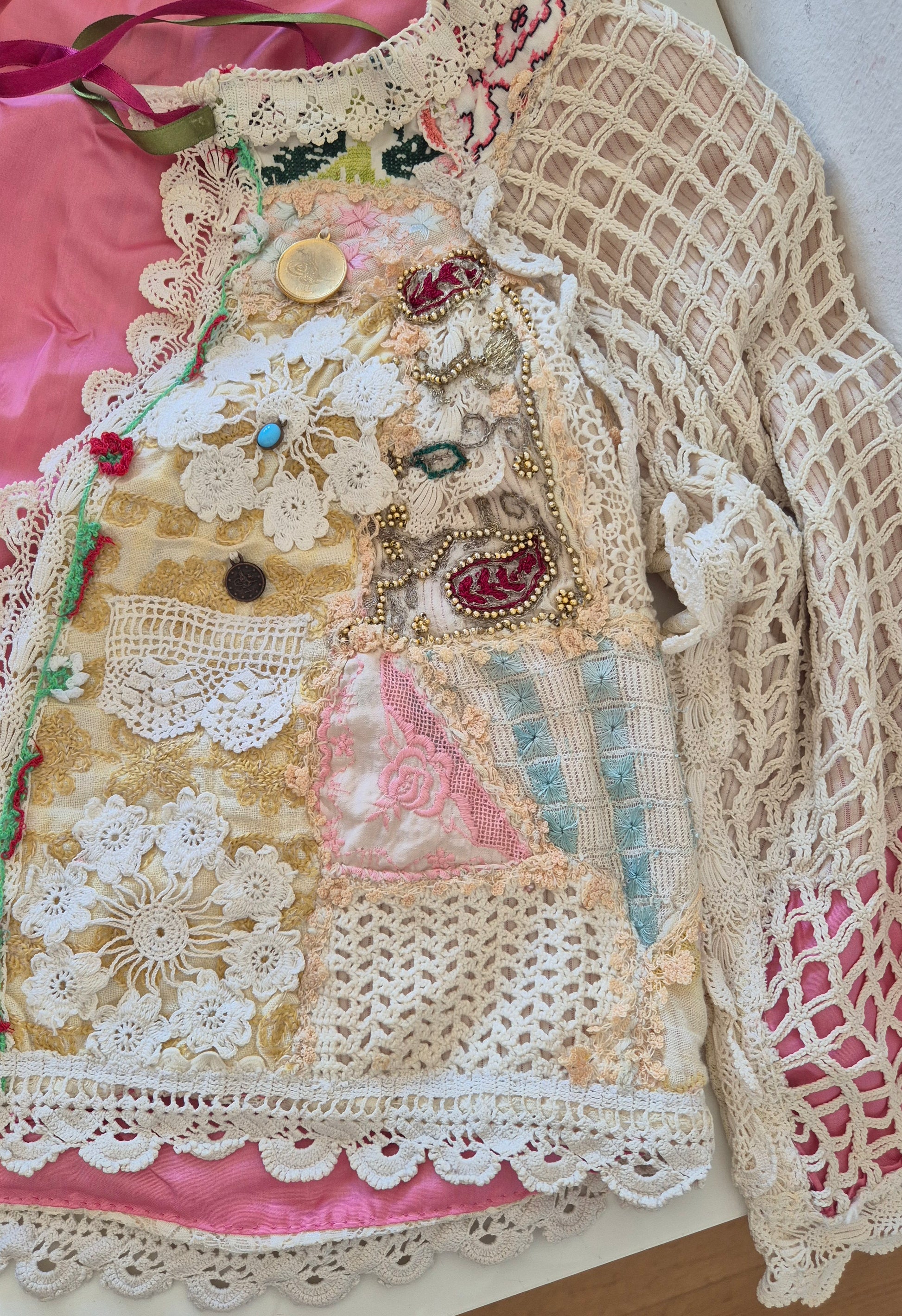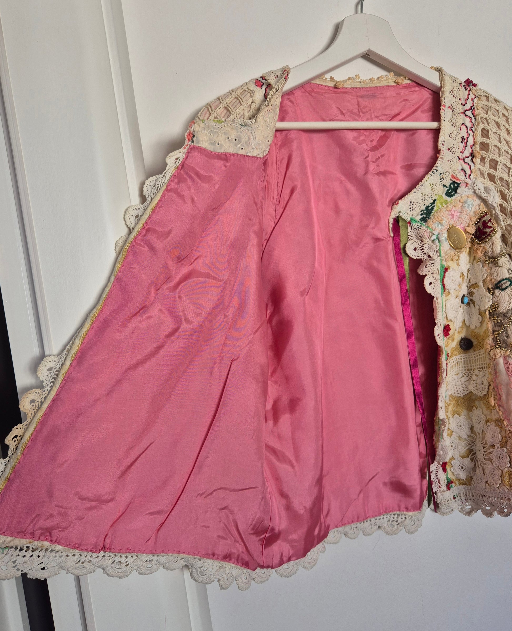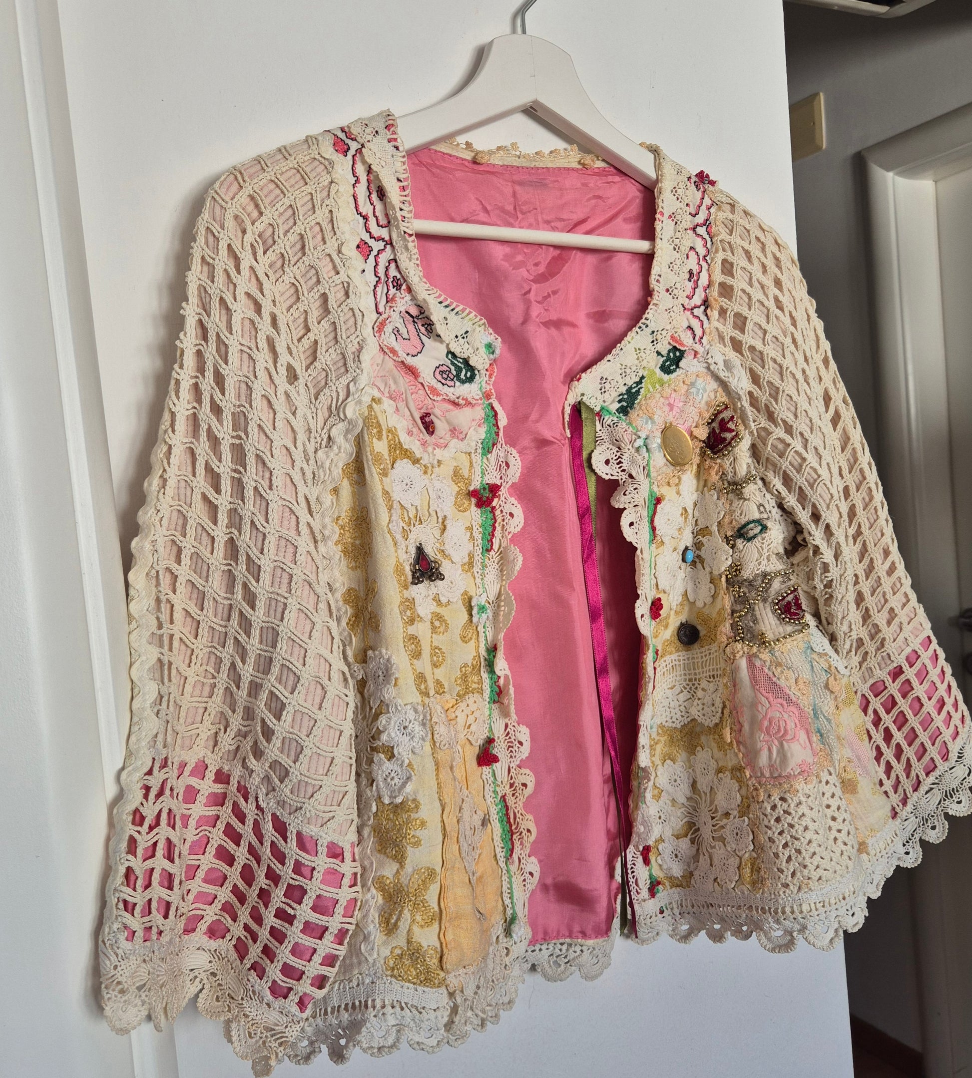 Maksimalno posebna vintage jakna 💎. Savršena! Pink podstava od fine viskoze, a povrh - detalja da im se ne zna broj... čipke, gobleni, privjesci, vezovi - fotografije govore sve 🤓. Što se tiče materijala vanjštine - to je pamuk, u različitim verzijama.