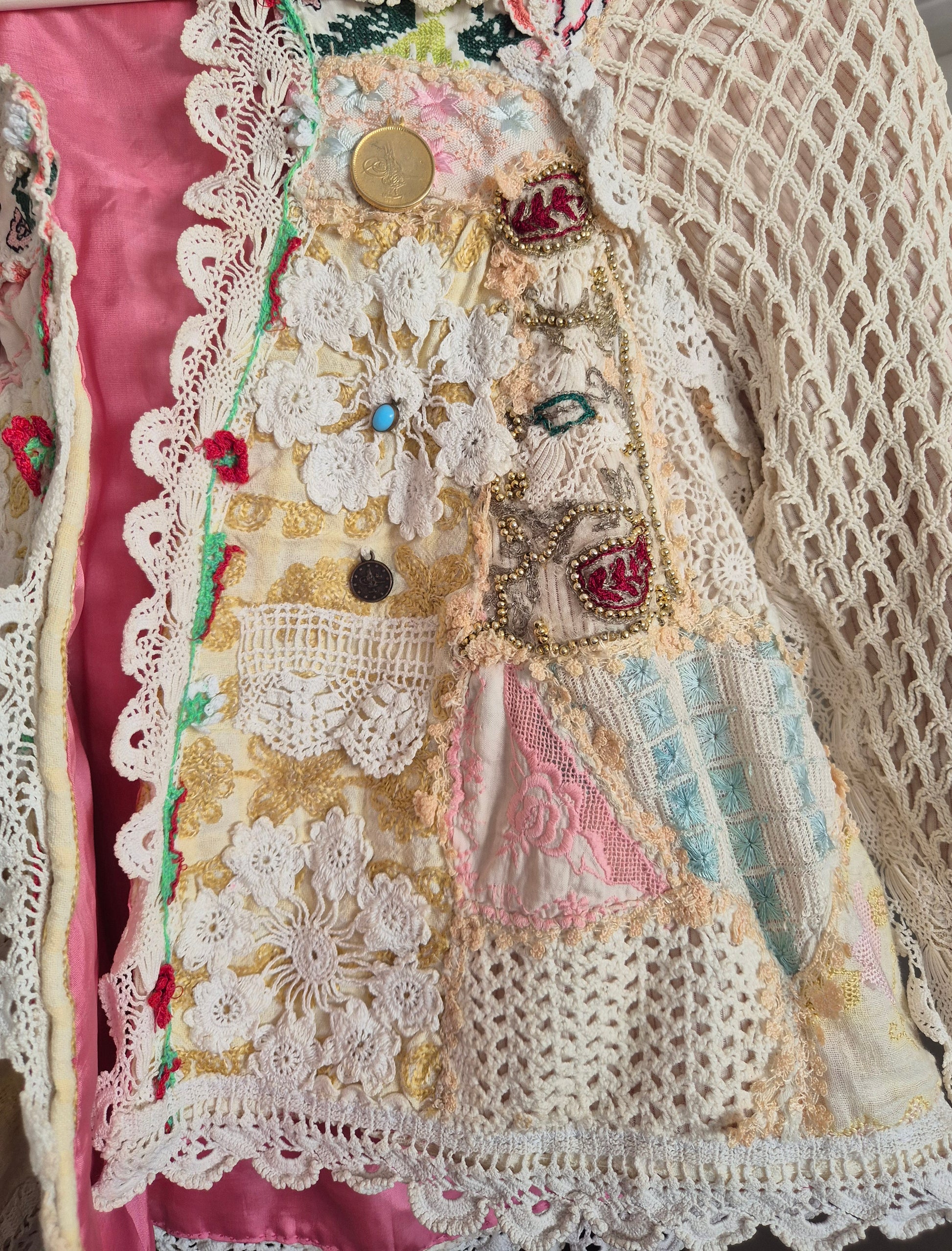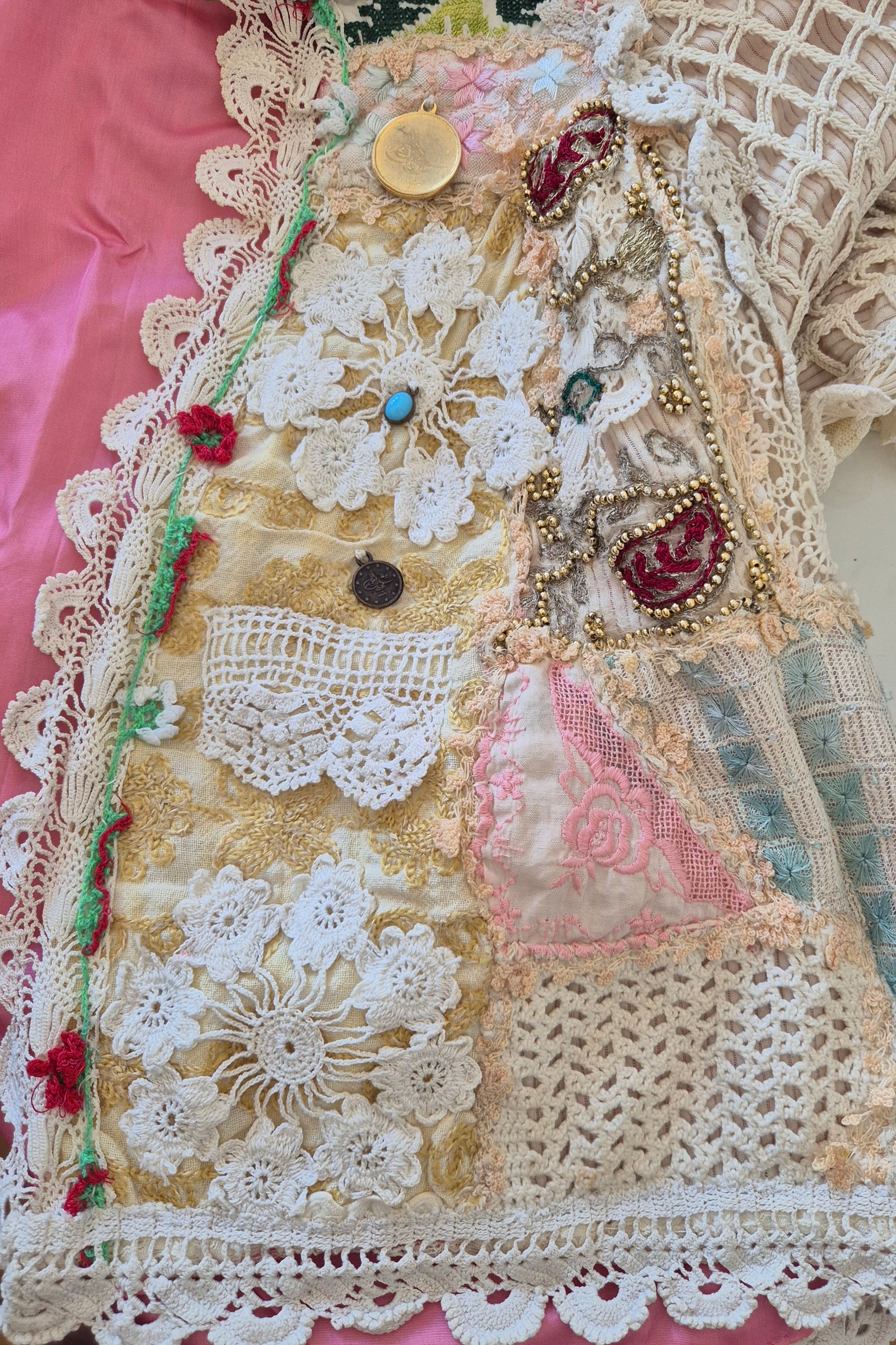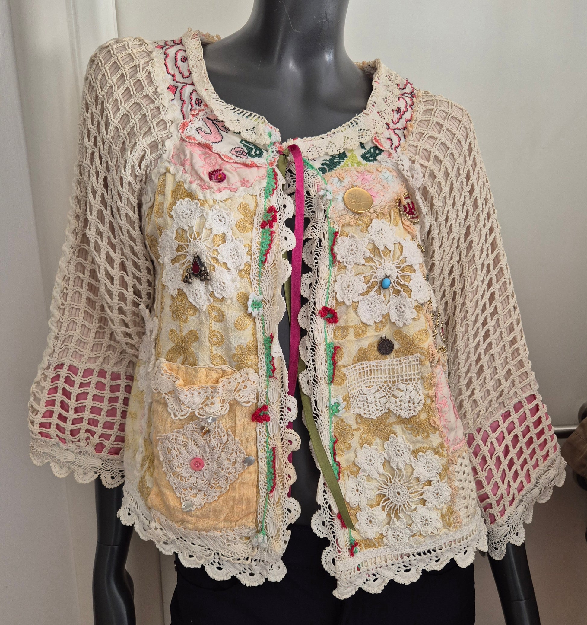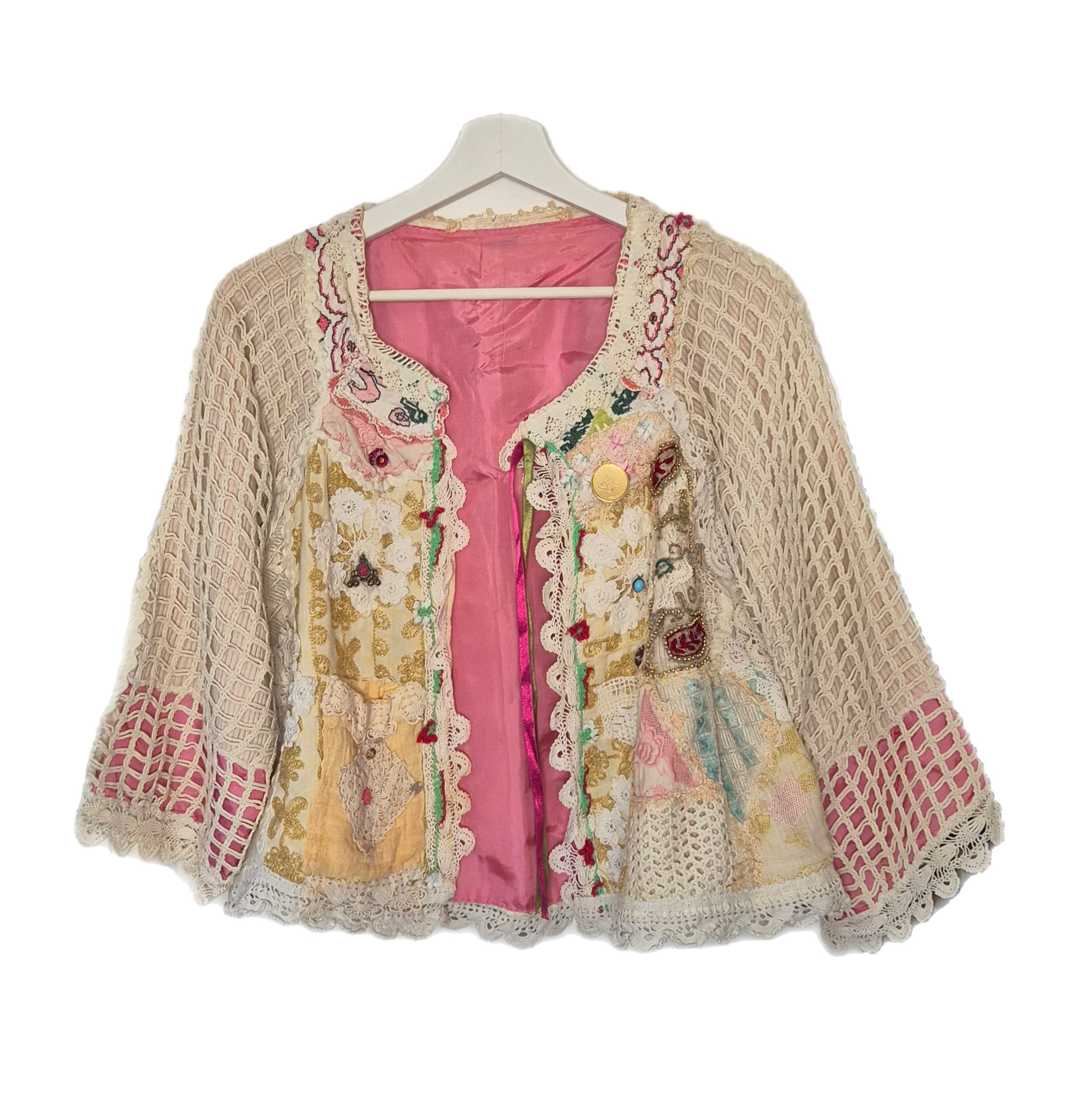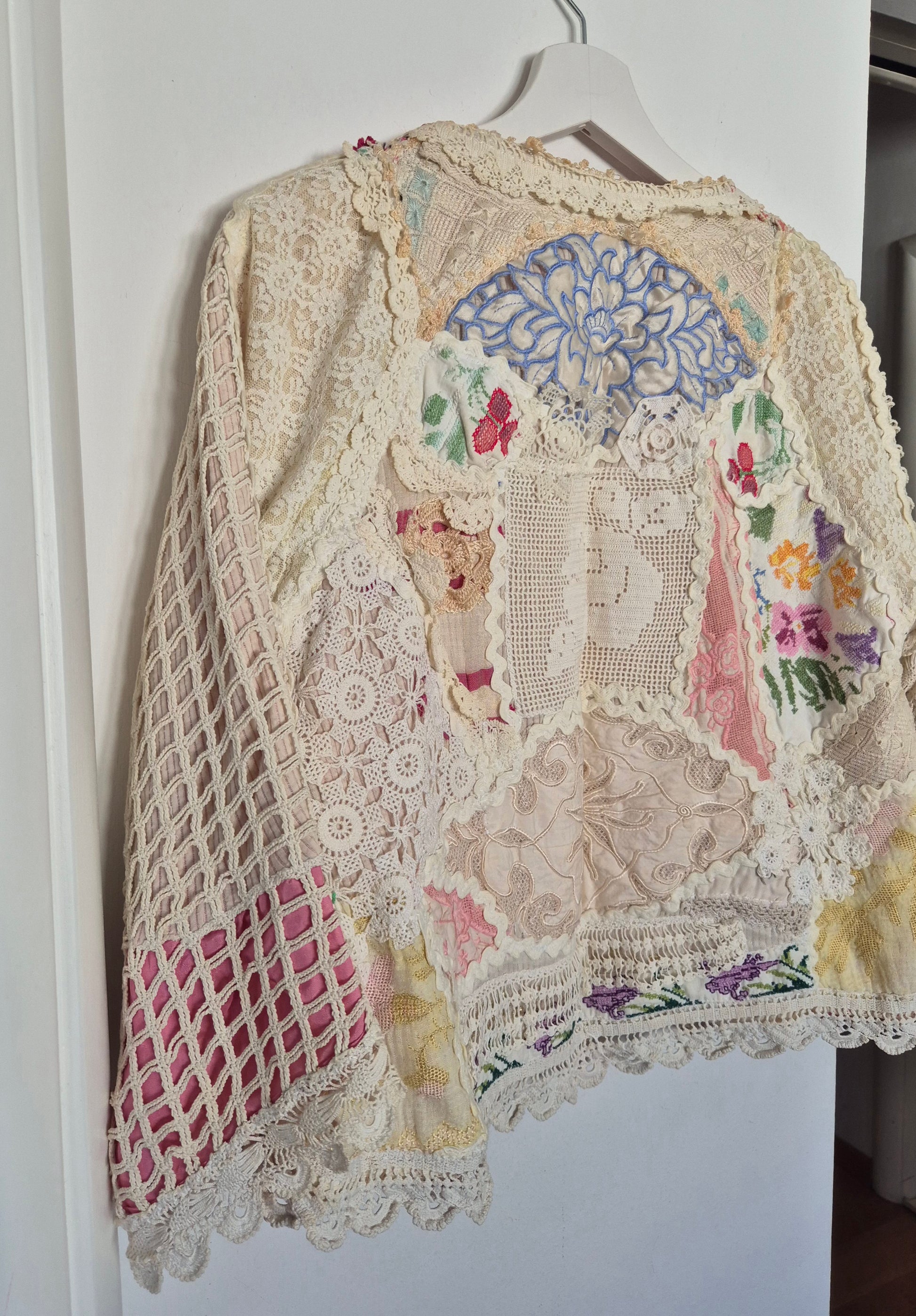 Maksimalno posebna vintage jakna 💎. Savršena! Pink podstava od fine viskoze, a povrh - detalja da im se ne zna broj... čipke, gobleni, privjesci, vezovi - fotografije govore sve 🤓. Što se tiče materijala vanjštine - to je pamuk, u različitim verzijama.