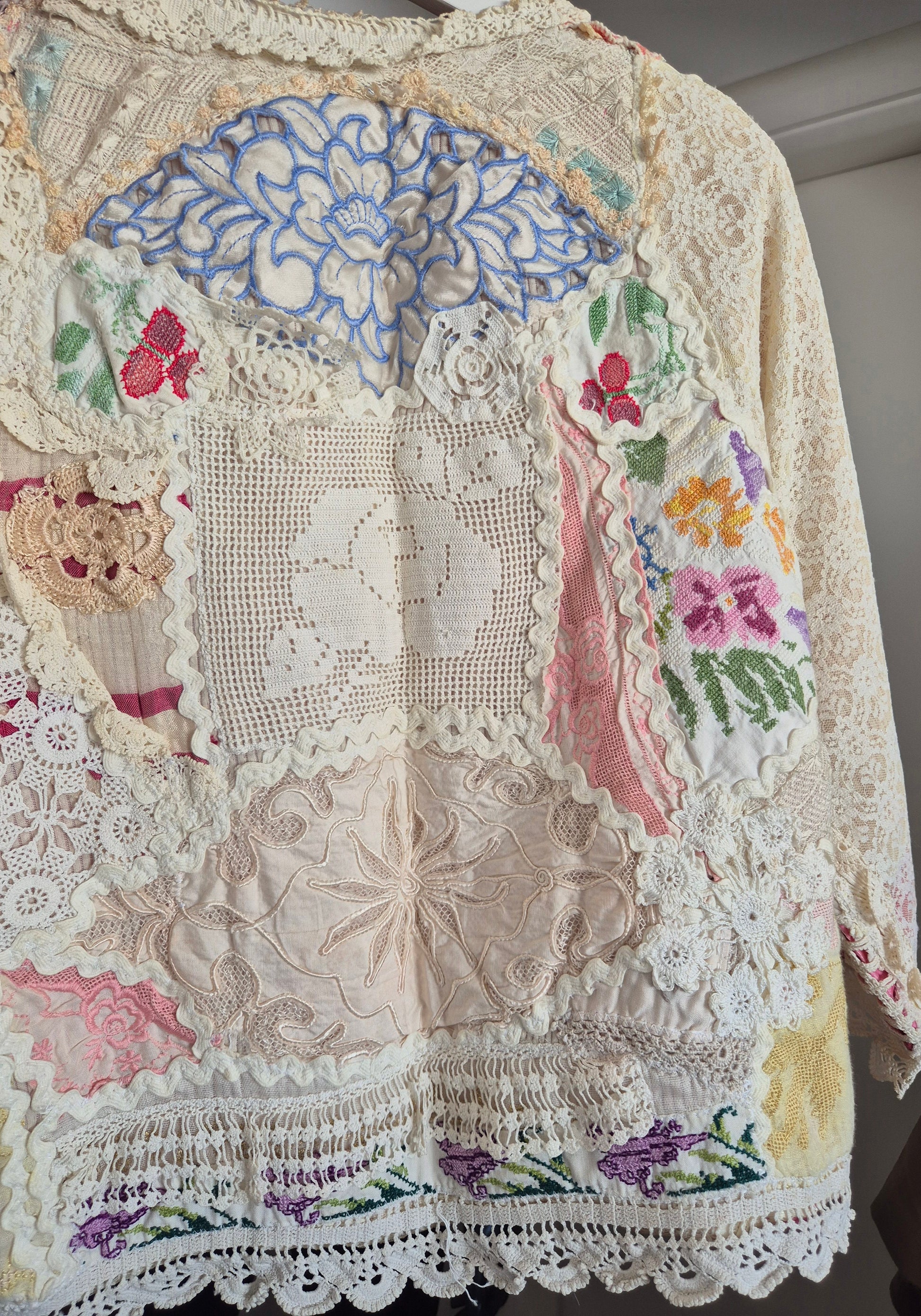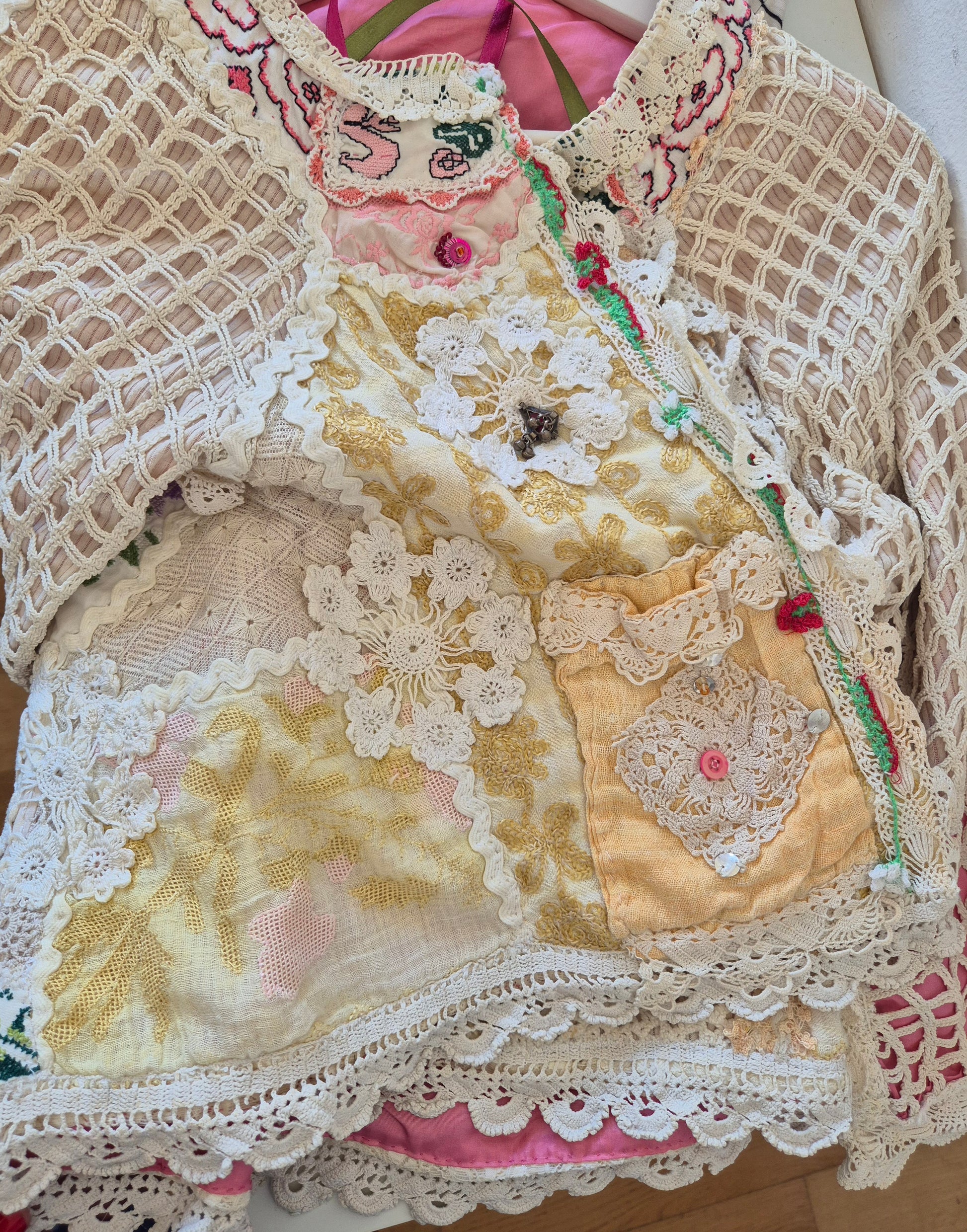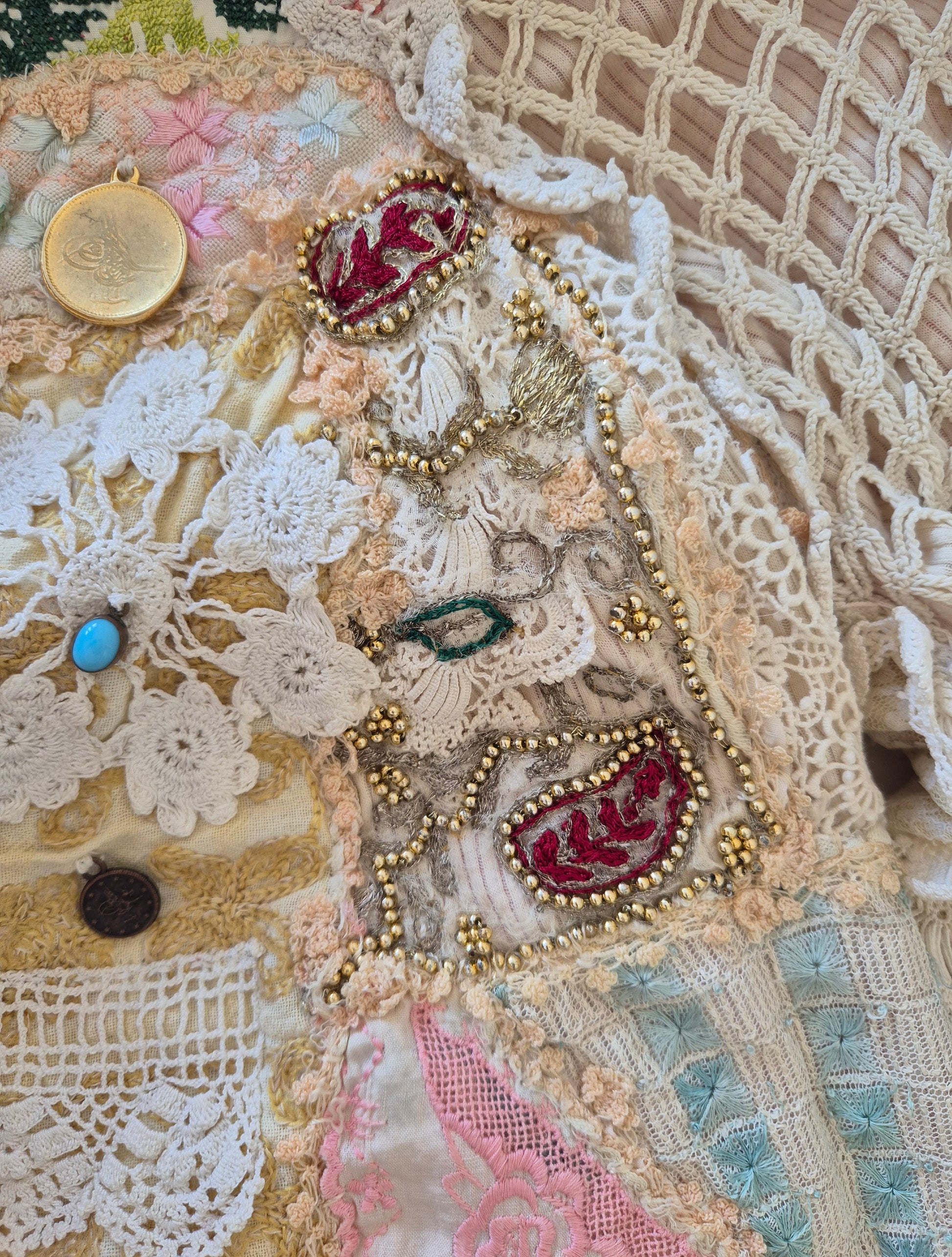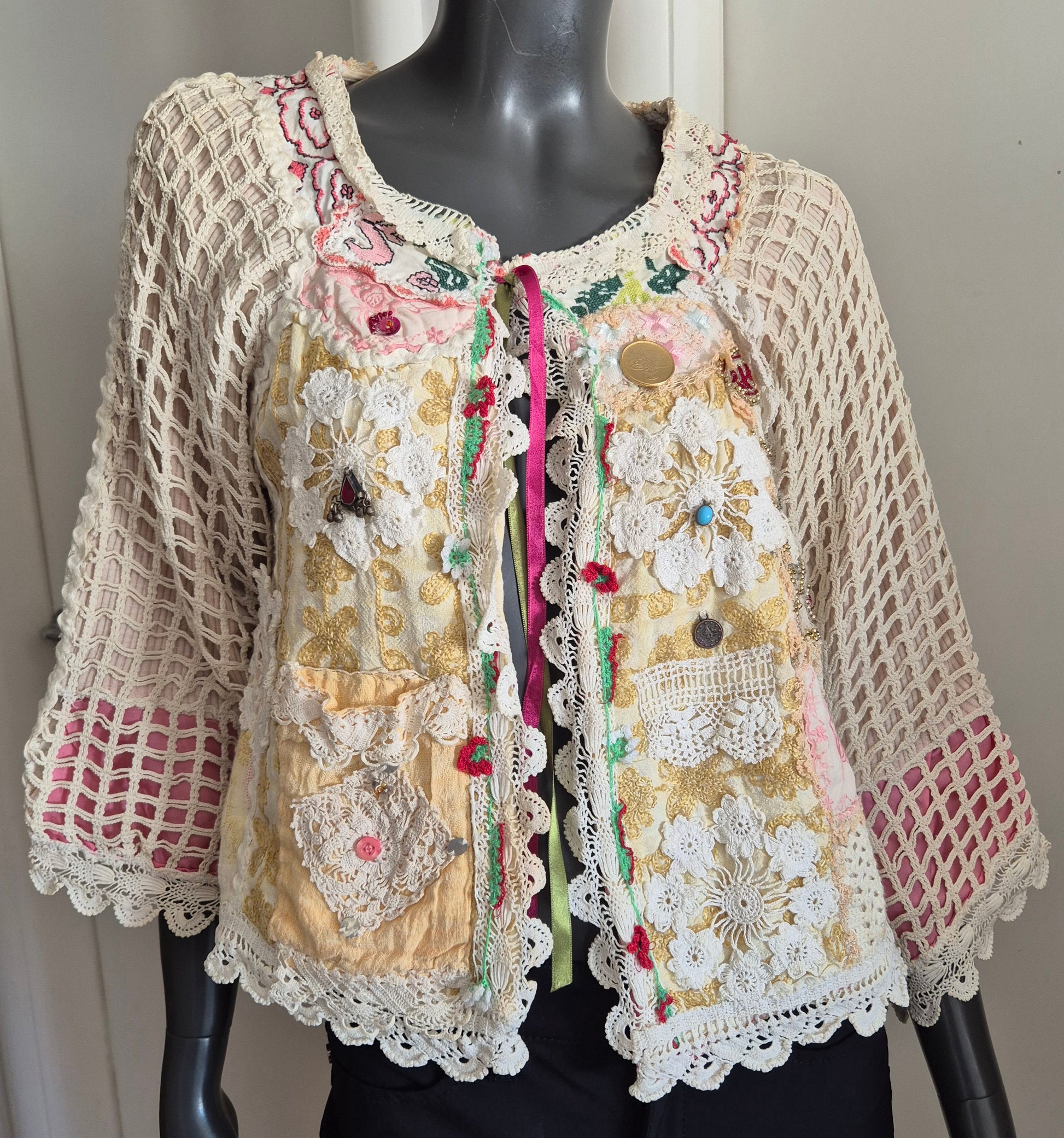 Maksimalno posebna vintage jakna 💎. Savršena! Pink podstava od fine viskoze, a povrh - detalja da im se ne zna broj... čipke, gobleni, privjesci, vezovi - fotografije govore sve 🤓. Što se tiče materijala vanjštine - to je pamuk, u različitim verzijama.