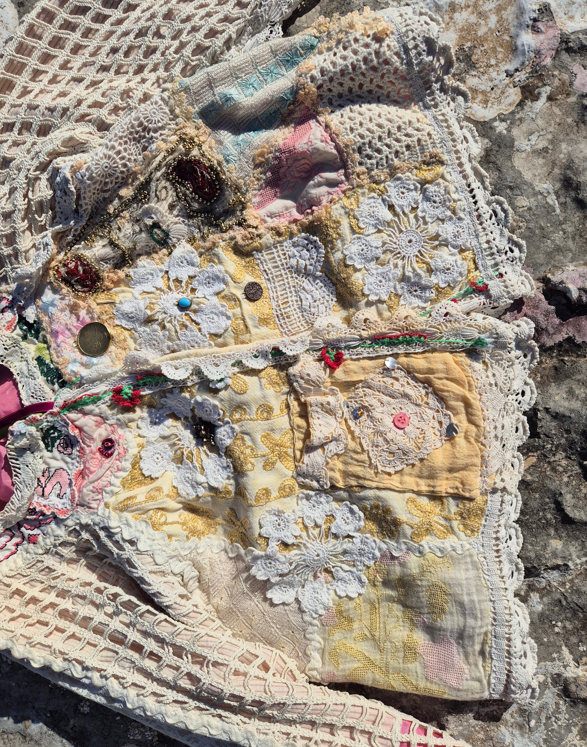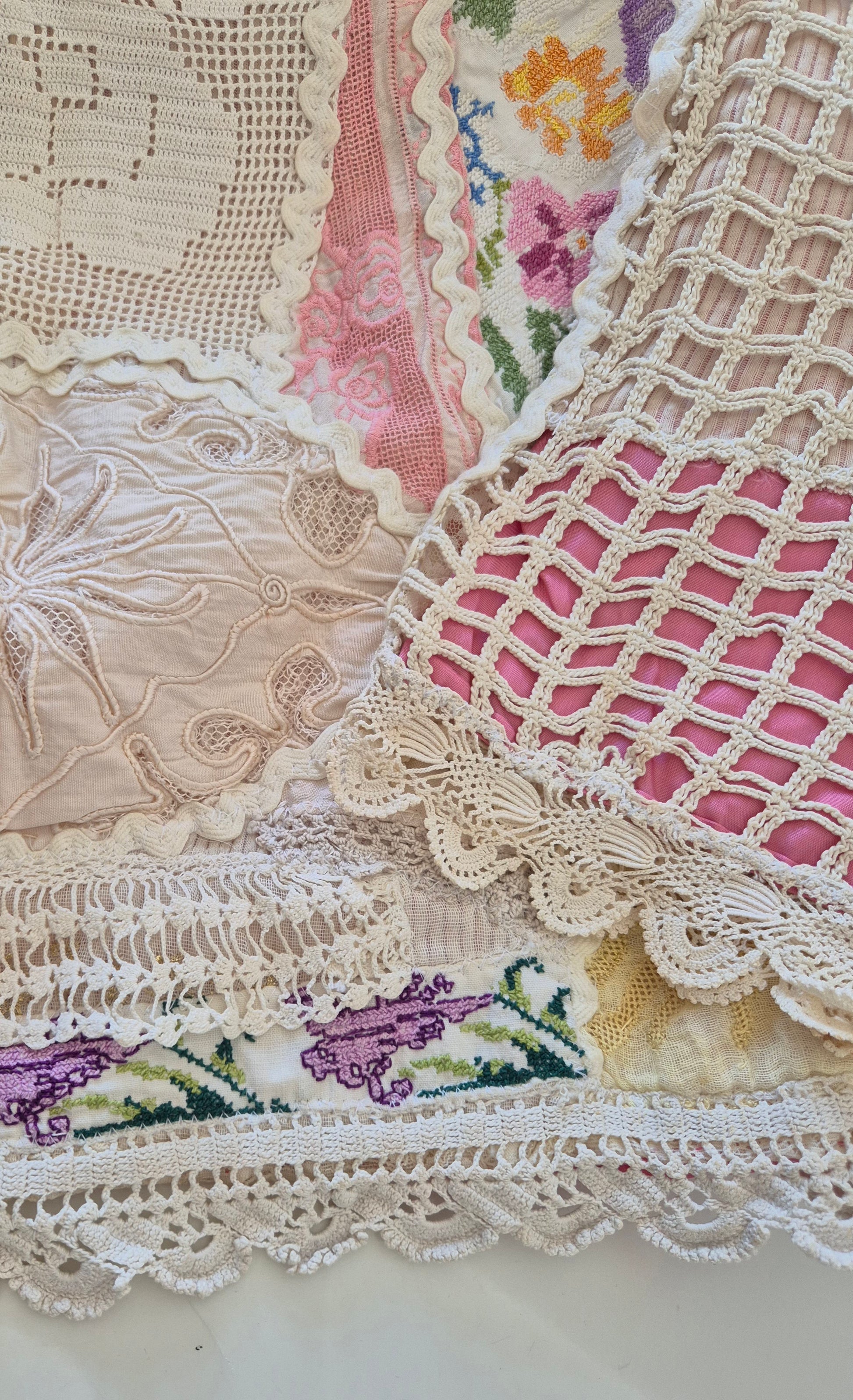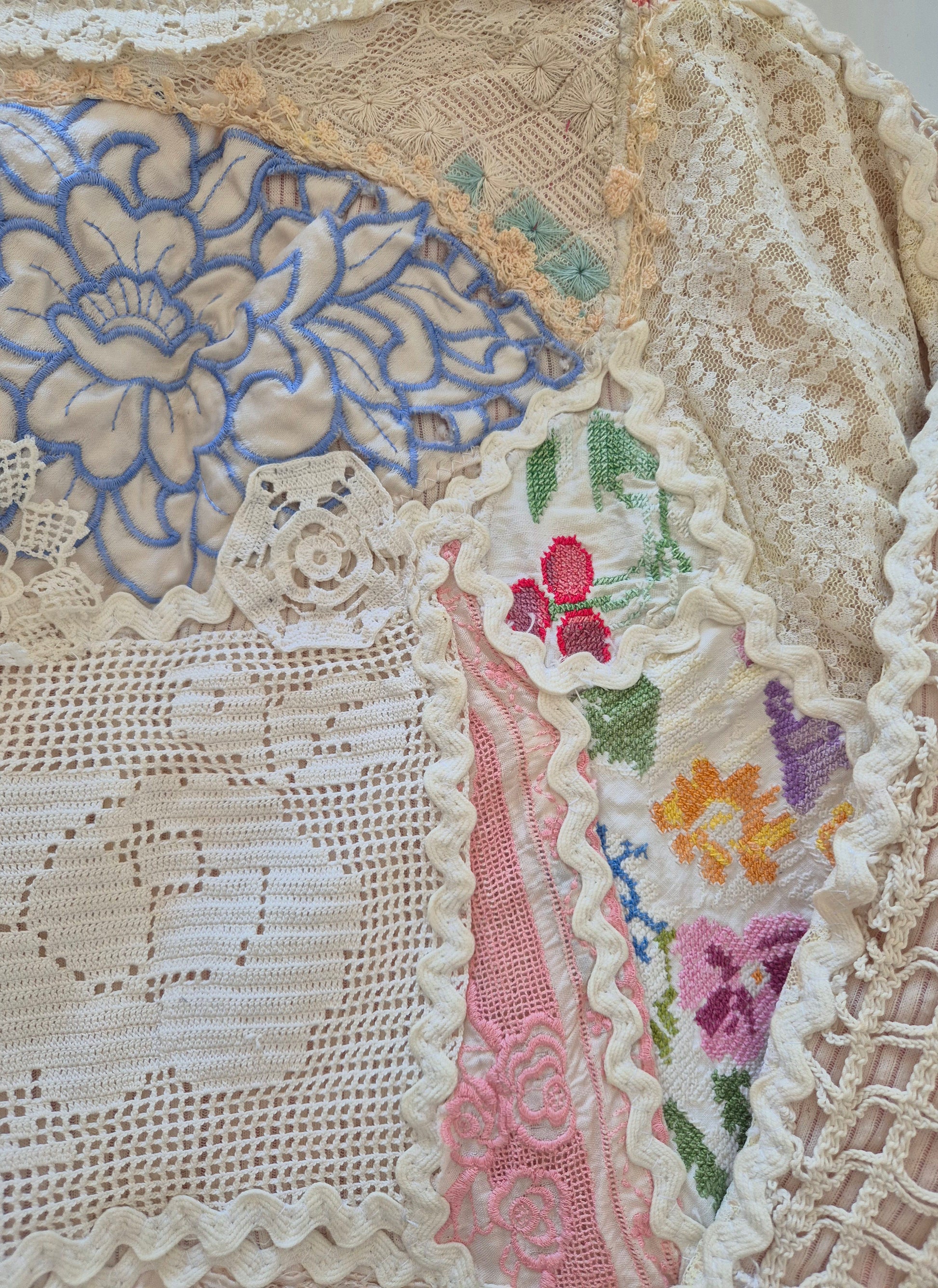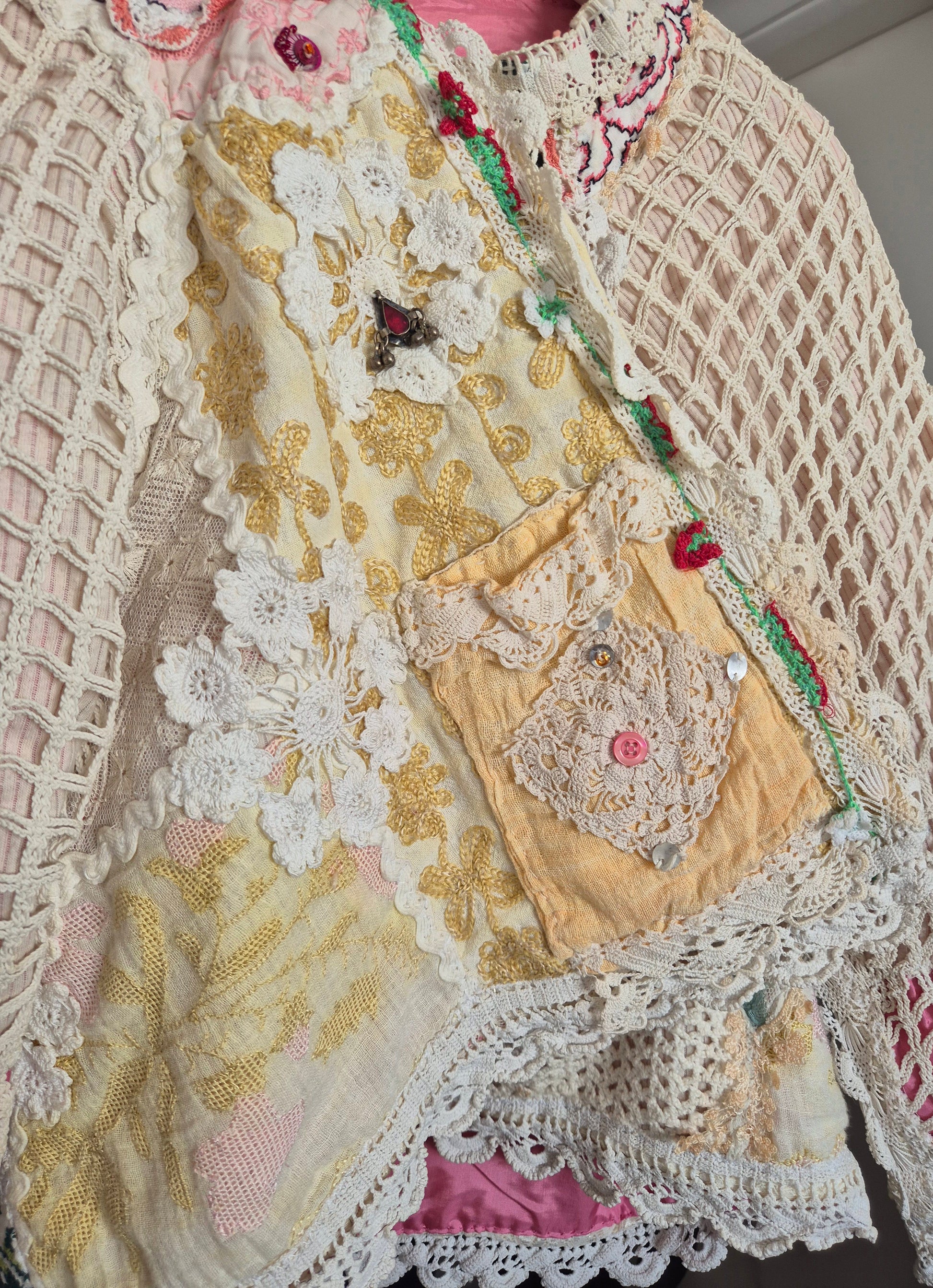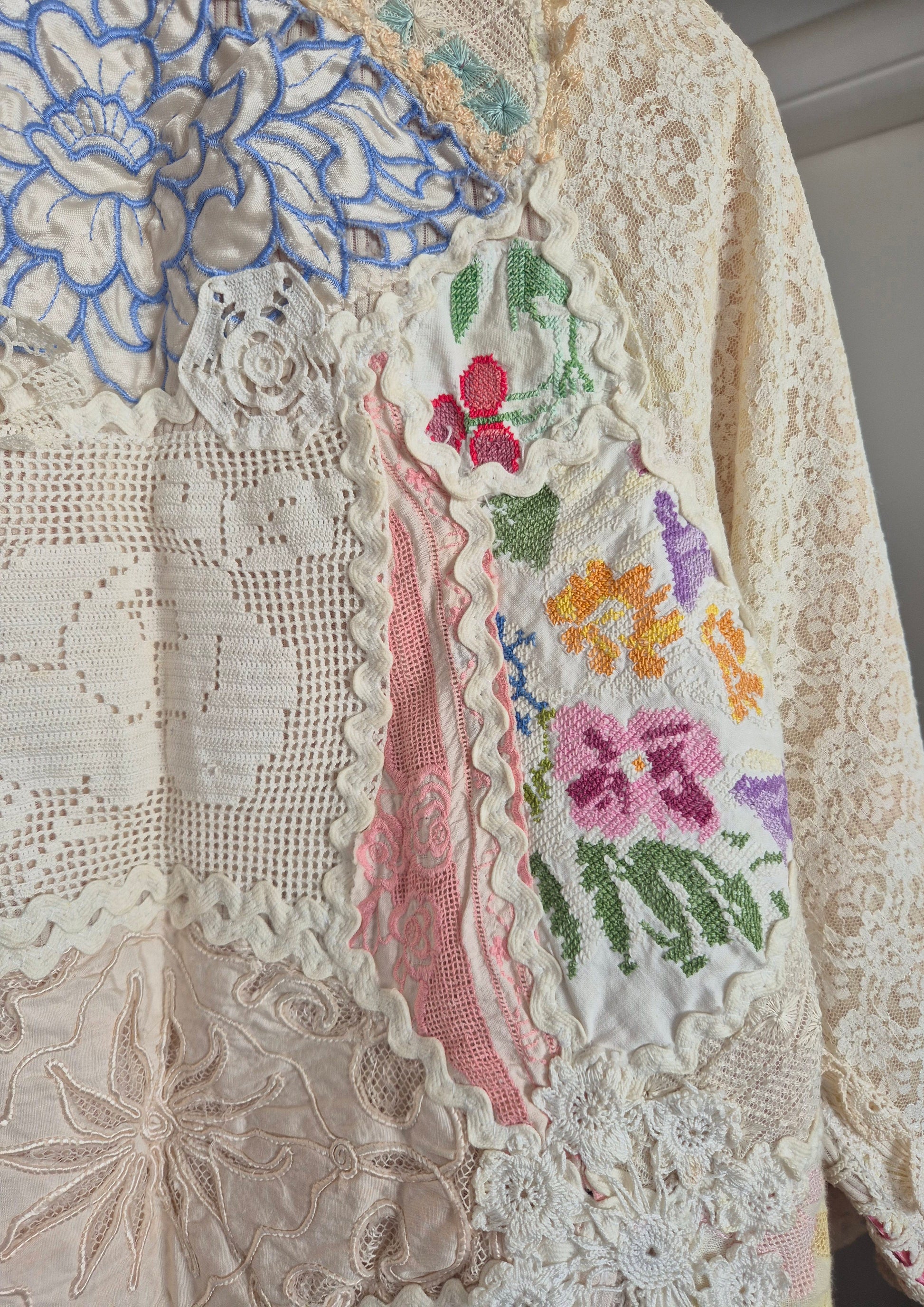 Maksimalno posebna vintage jakna 💎. Savršena! Pink podstava od fine viskoze, a povrh - detalja da im se ne zna broj... čipke, gobleni, privjesci, vezovi - fotografije govore sve 🤓. Što se tiče materijala vanjštine - to je pamuk, u različitim verzijama.