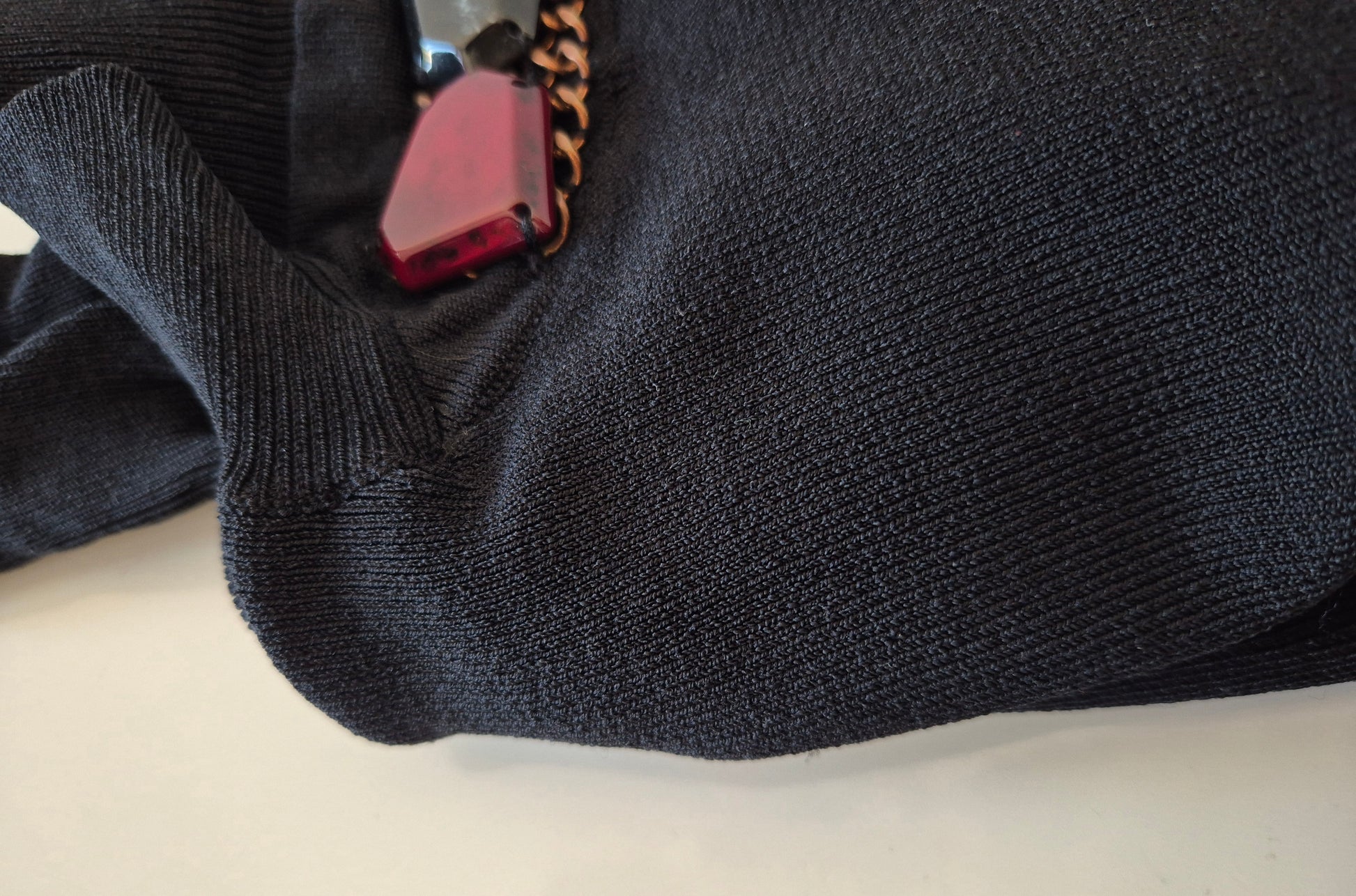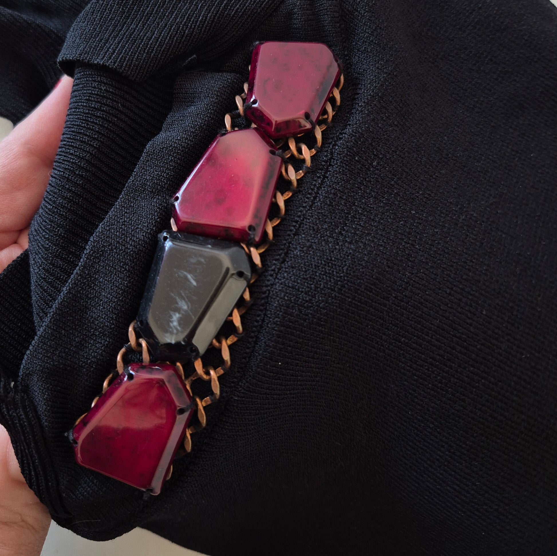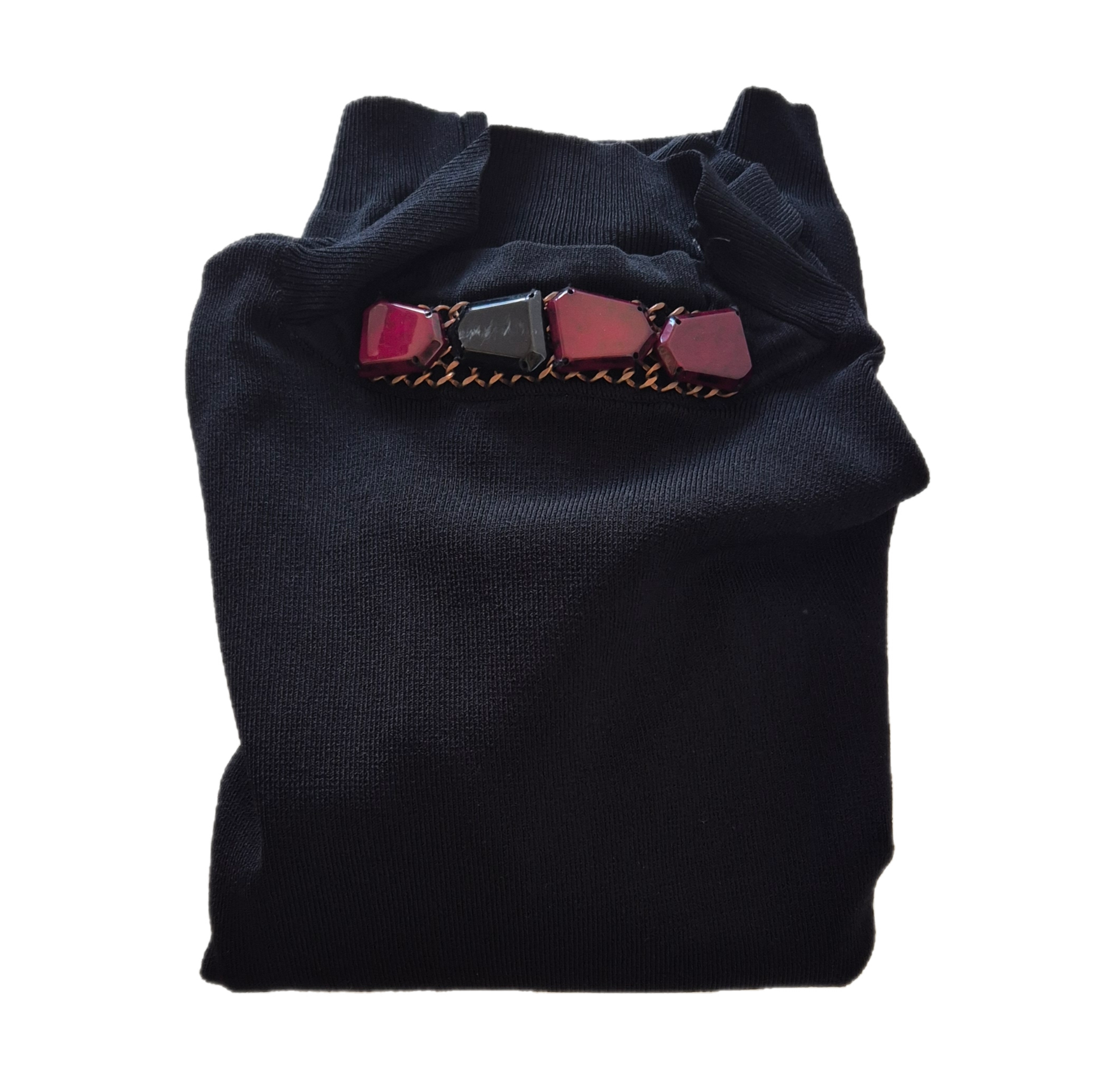 Crni pleteni top/lagani pulover, viskoza ili mješavina viskoze (i npr. poliamida). Na otvoru ,,drago kamenje" i lanac, odlično izgleda!