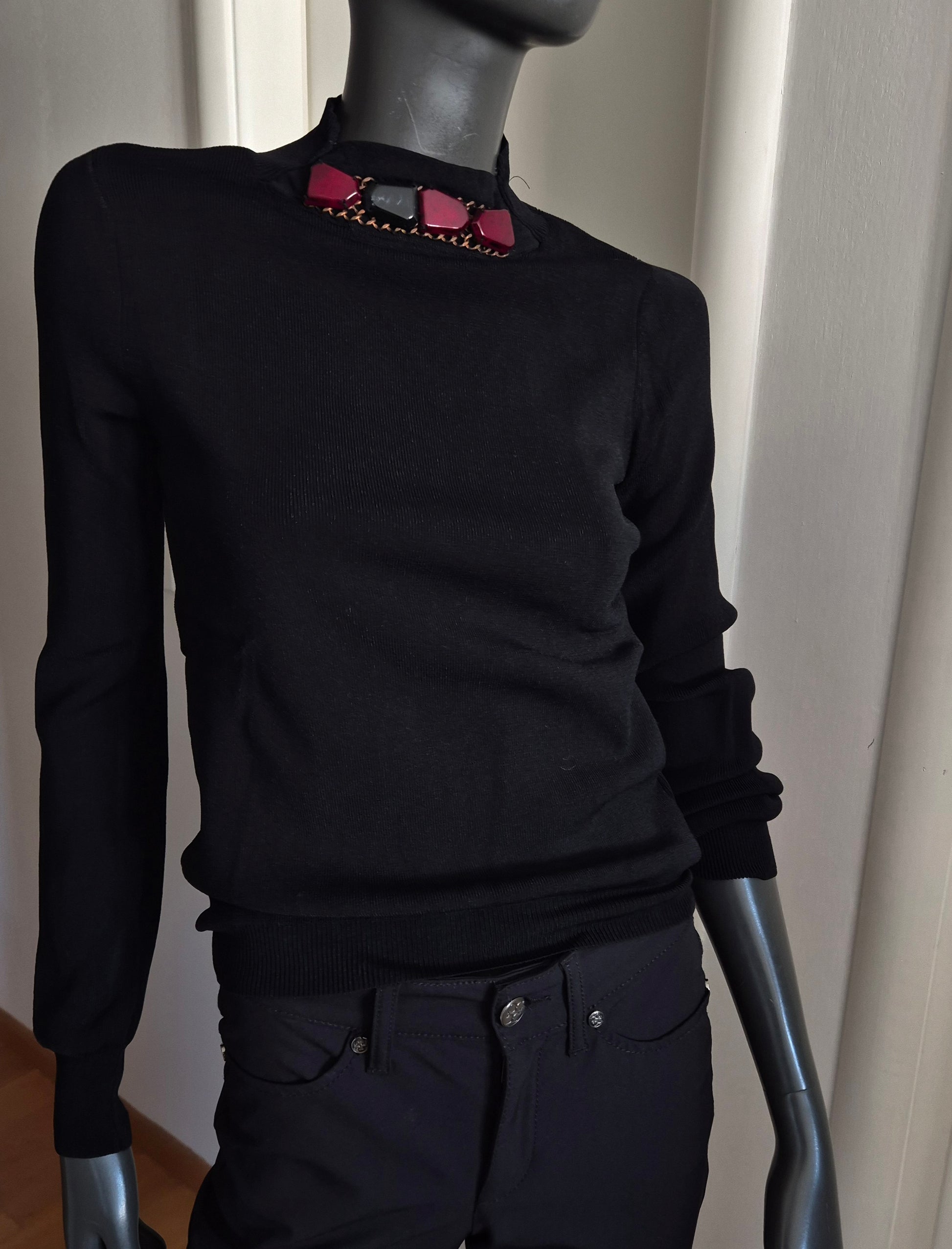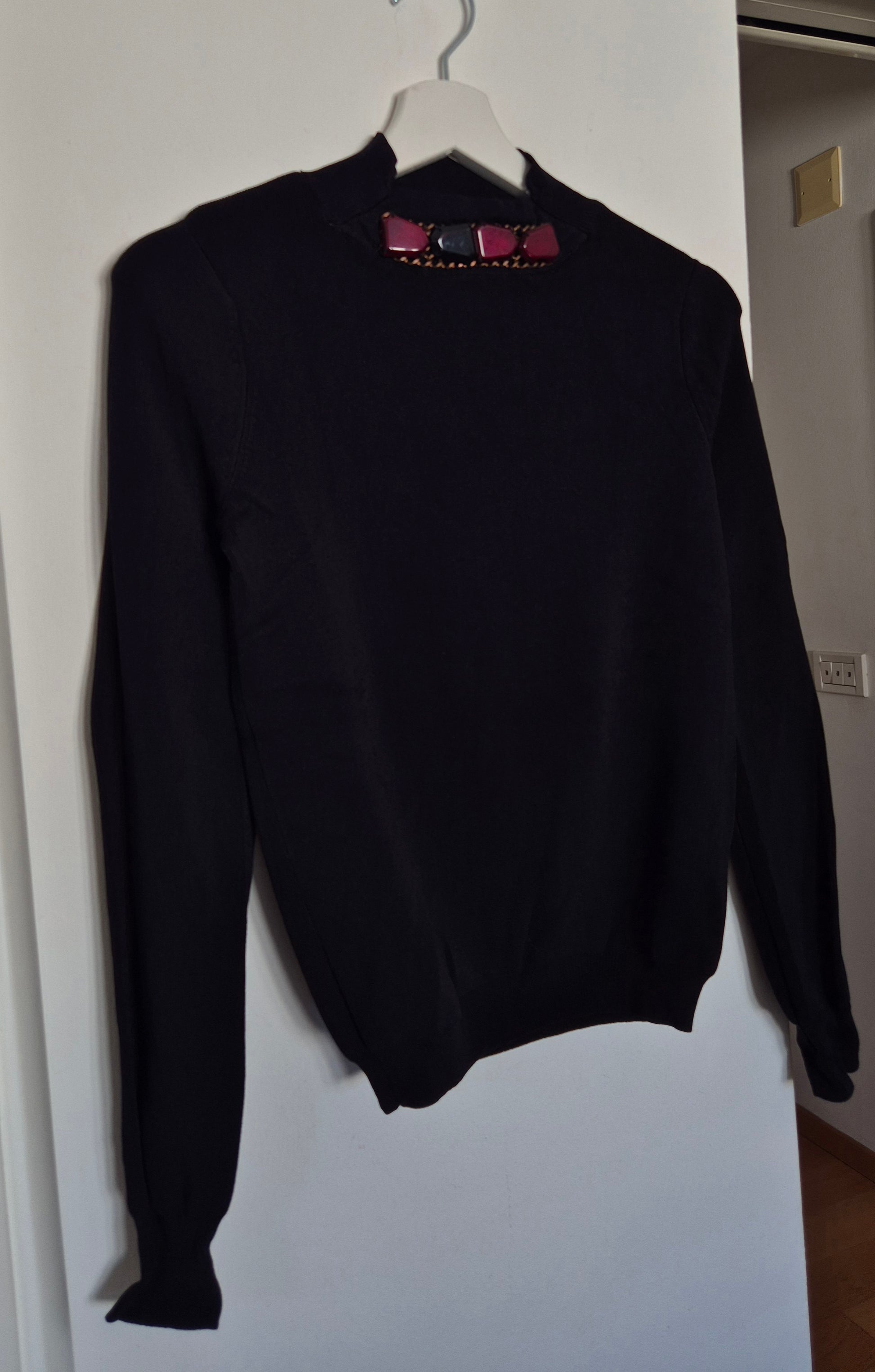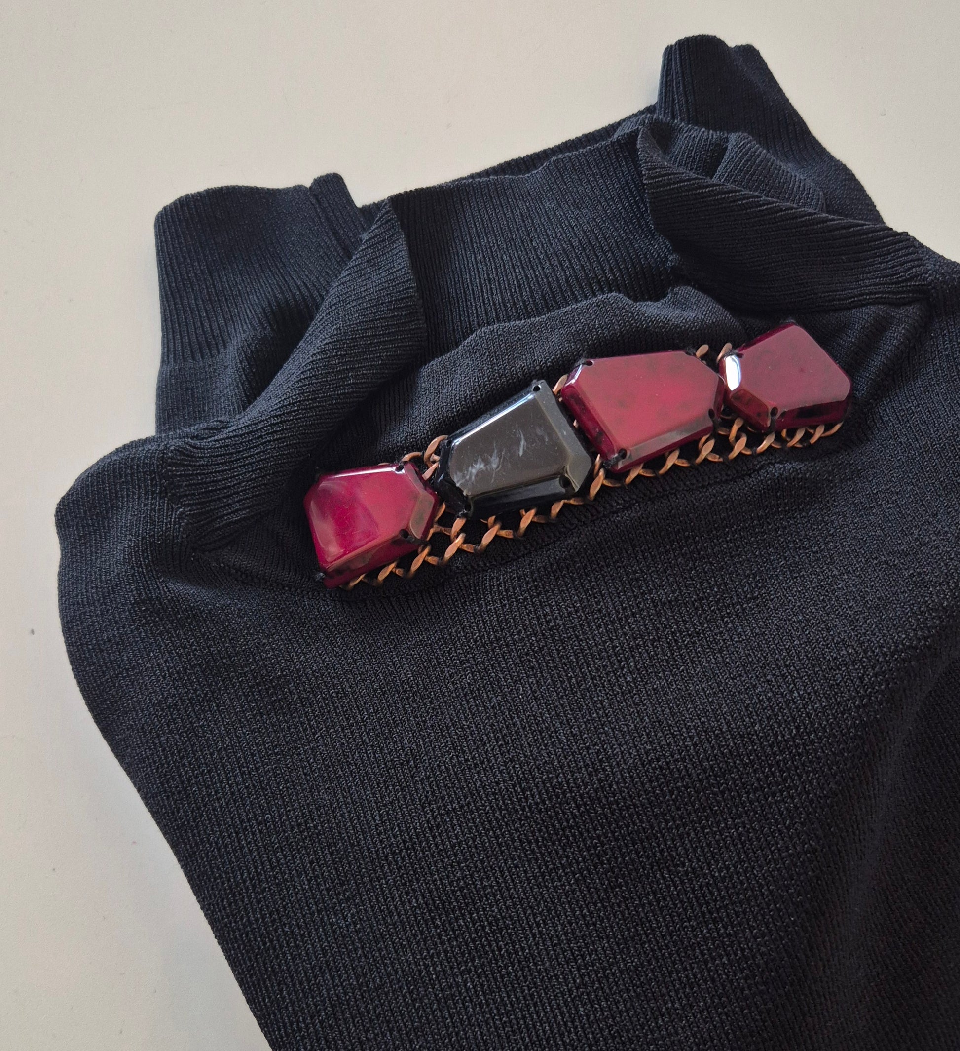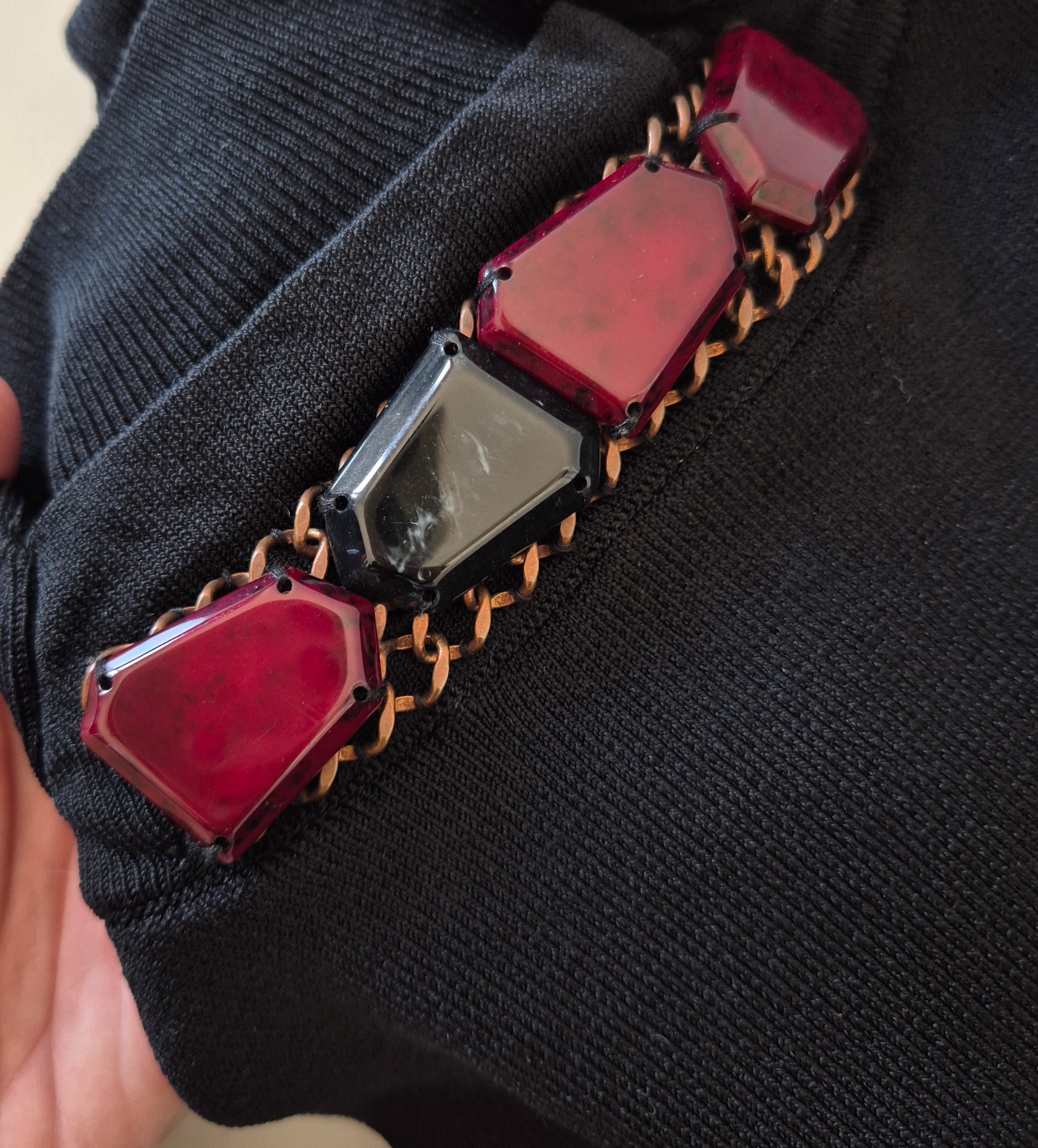Crni pleteni top/lagani pulover, viskoza ili mješavina viskoze (i npr. poliamida). Na otvoru ,,drago kamenje" i lanac, odlično izgleda!