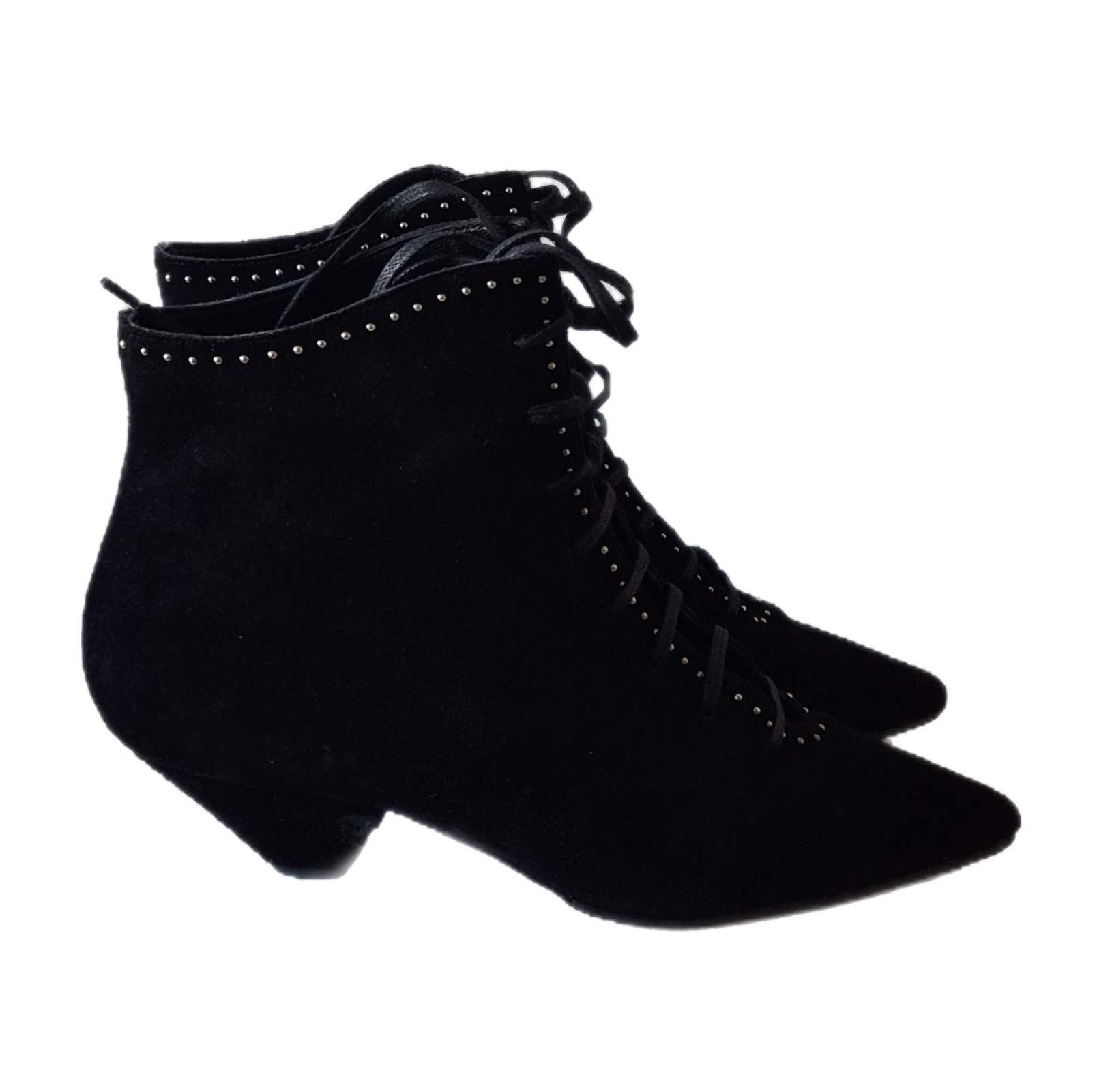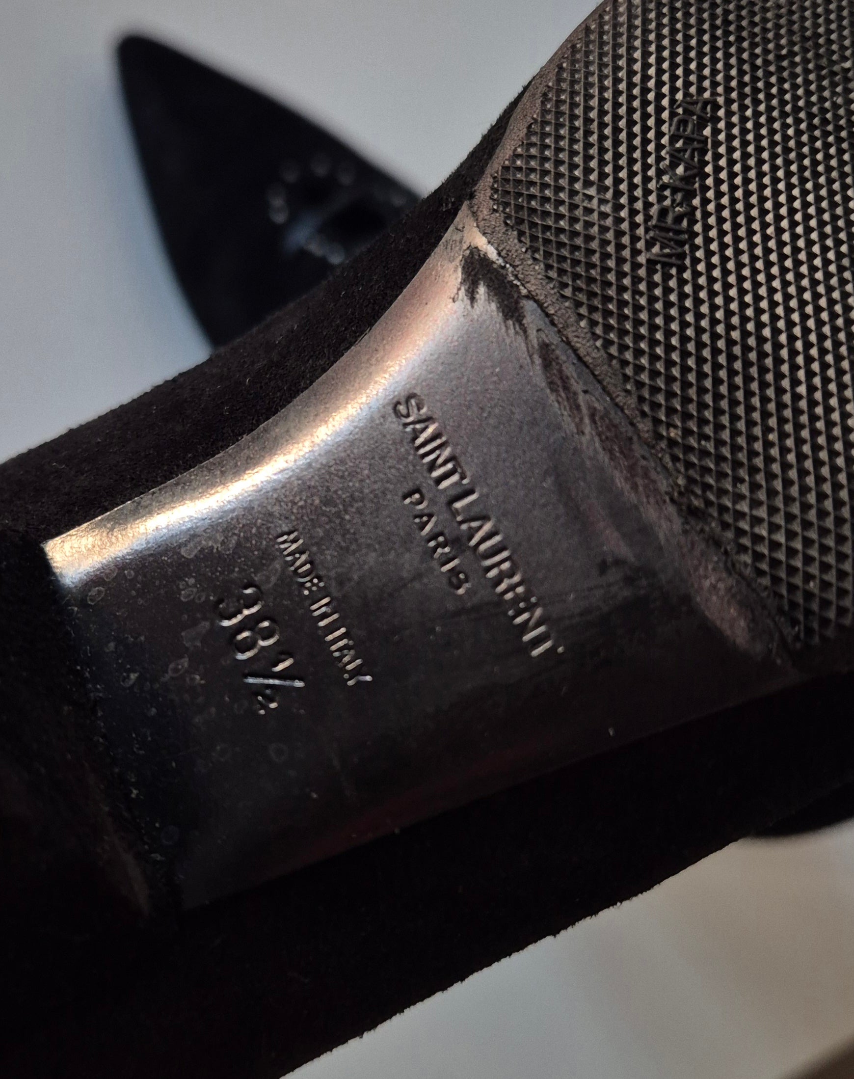 Saint Laurent čizme tj. gležnjače. Model Blaze. Brušena koža, sitne srebrne zakovice. Interesantan oblik pete. Dodan gumeni đon.