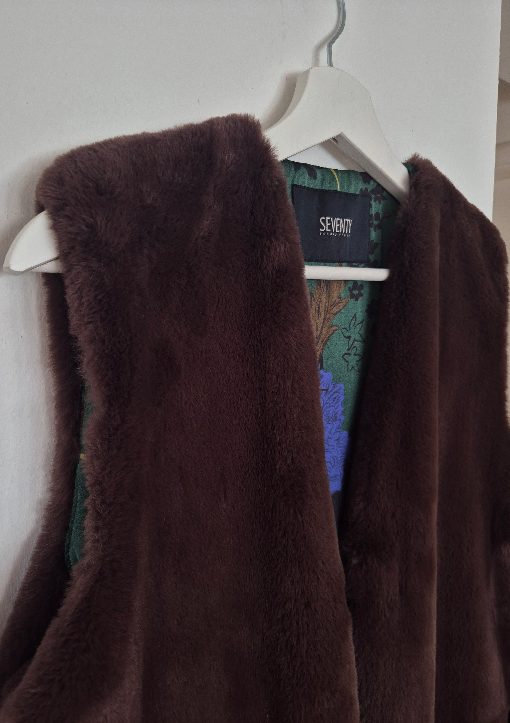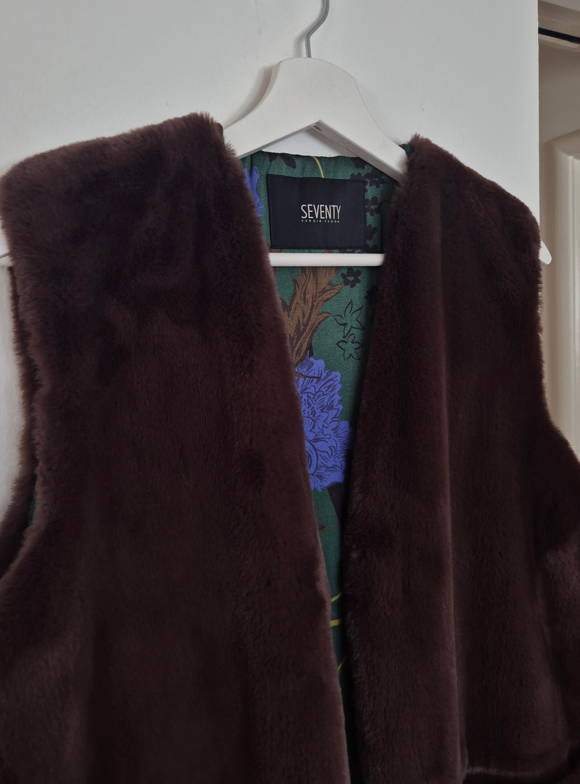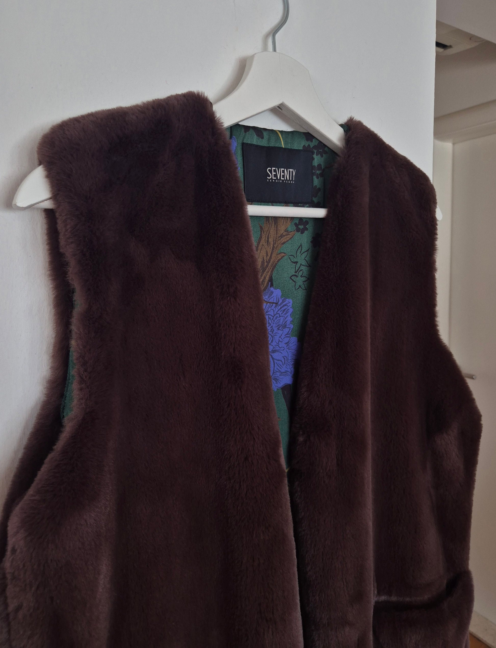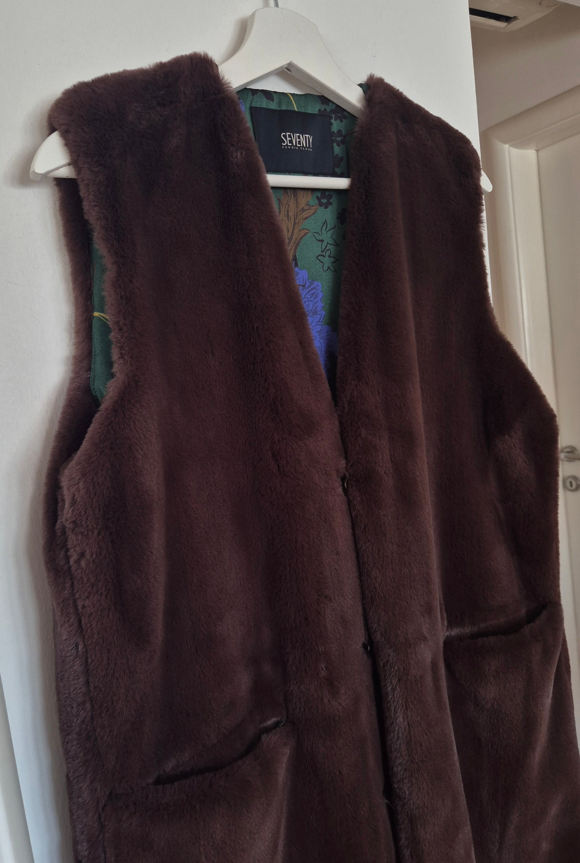 Seventy prsluk od smećkastog umjetnog krzna. Premekan 🫶. Šarena floral podstava od viskoze. Kopča se kukicama. Puno ljepši, efektniji uživo, a ovo što na fotografijama na lutki djeluje kao da je izblijeđeno - nije :)