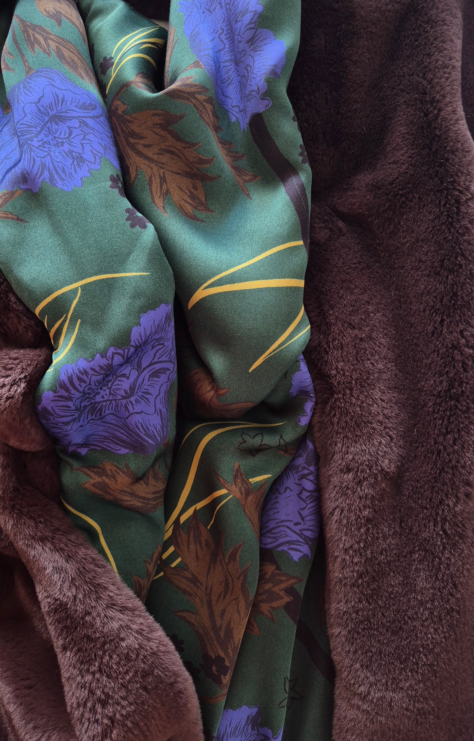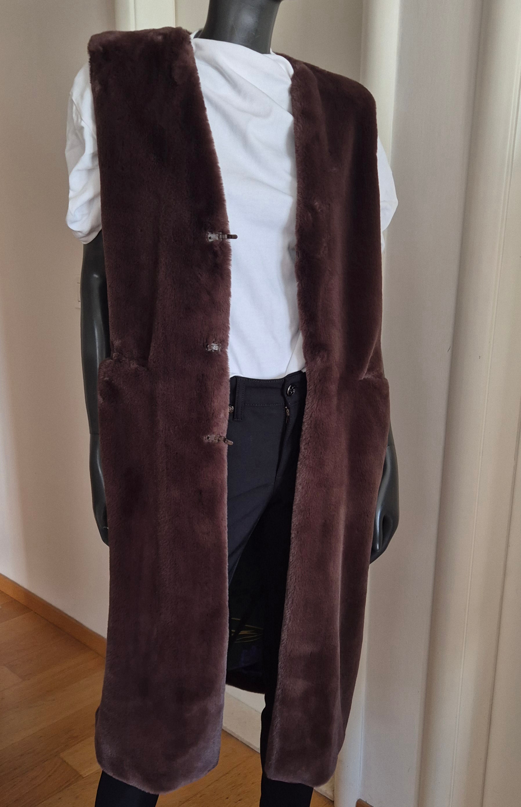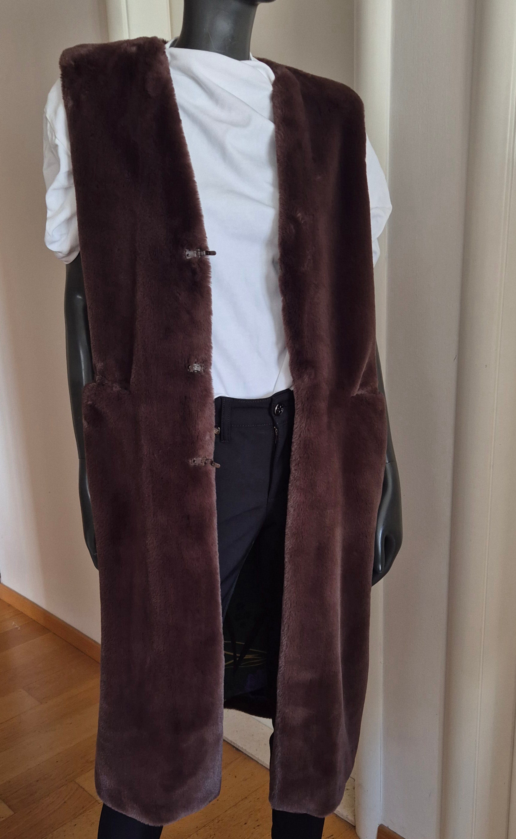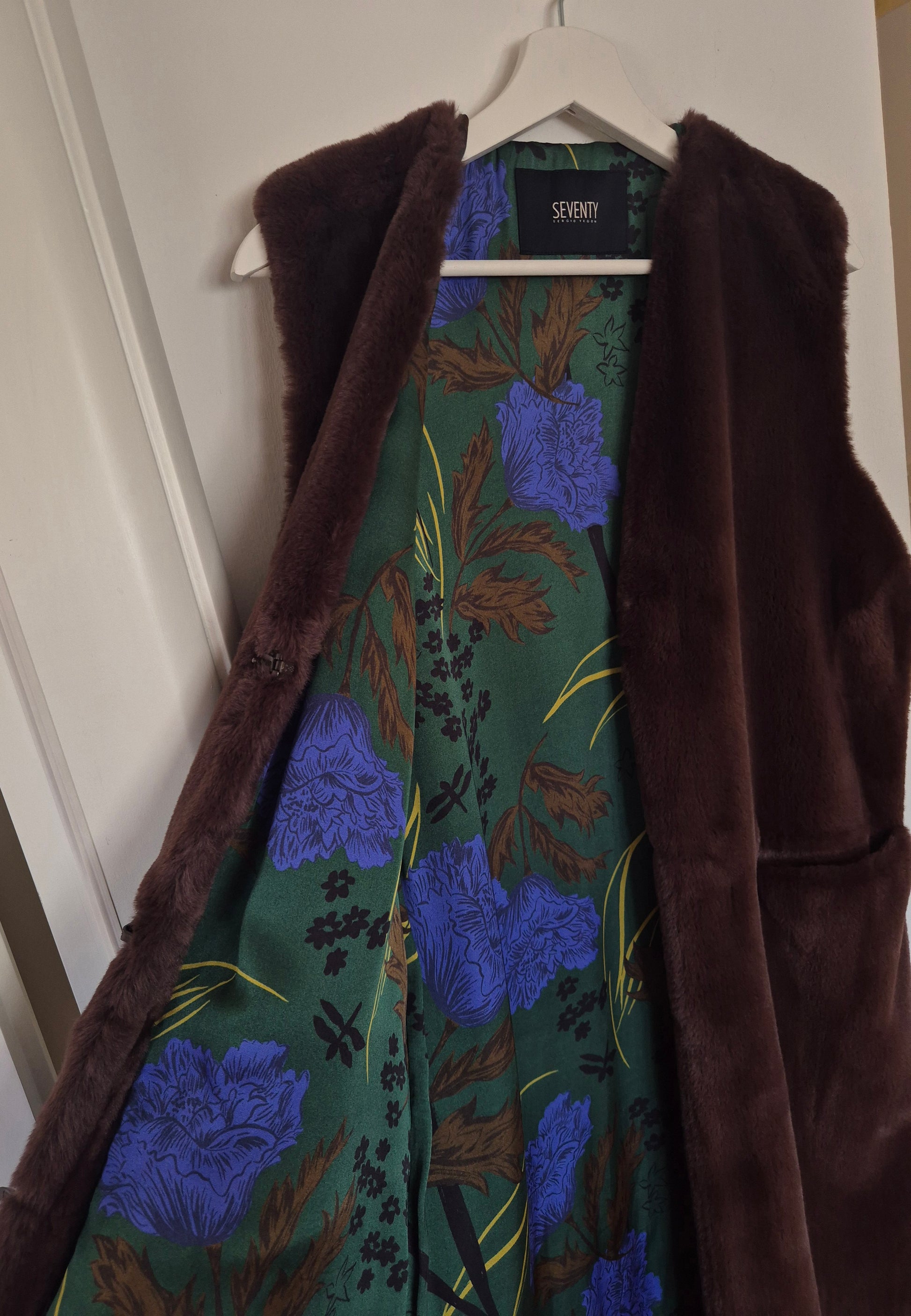 Seventy prsluk od smećkastog umjetnog krzna. Premekan 🫶. Šarena floral podstava od viskoze. Kopča se kukicama. Puno ljepši, efektniji uživo, a ovo što na fotografijama na lutki djeluje kao da je izblijeđeno - nije :)