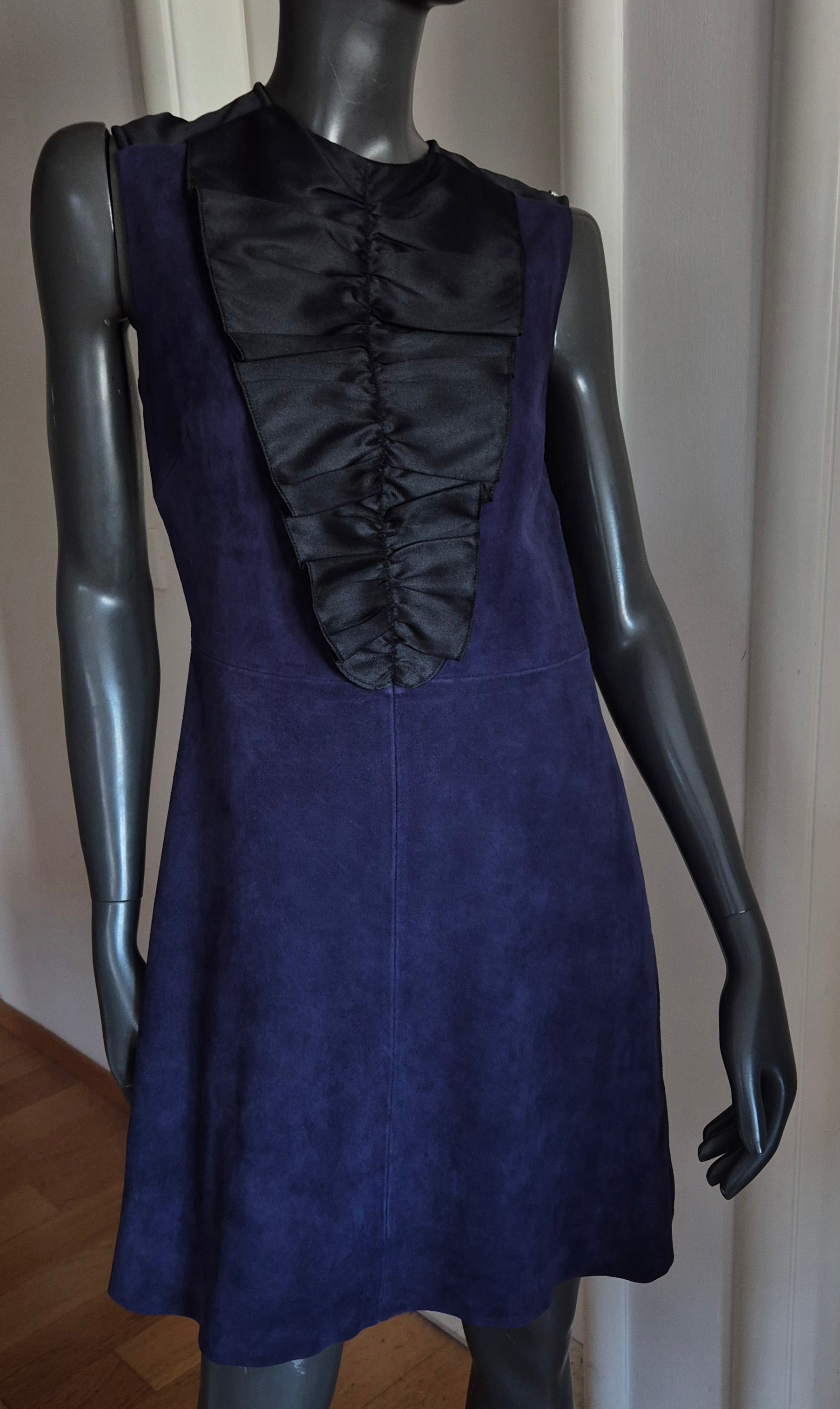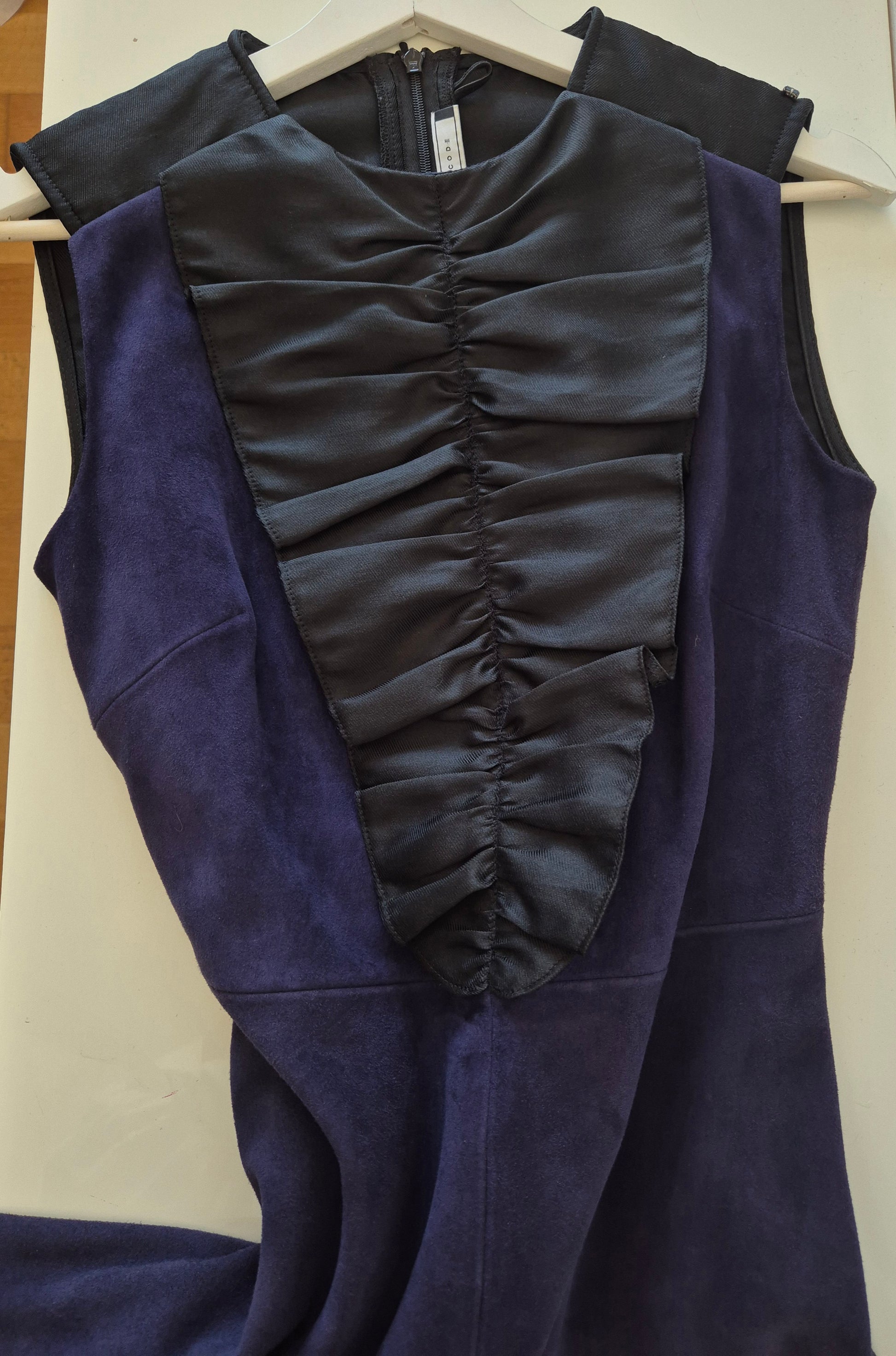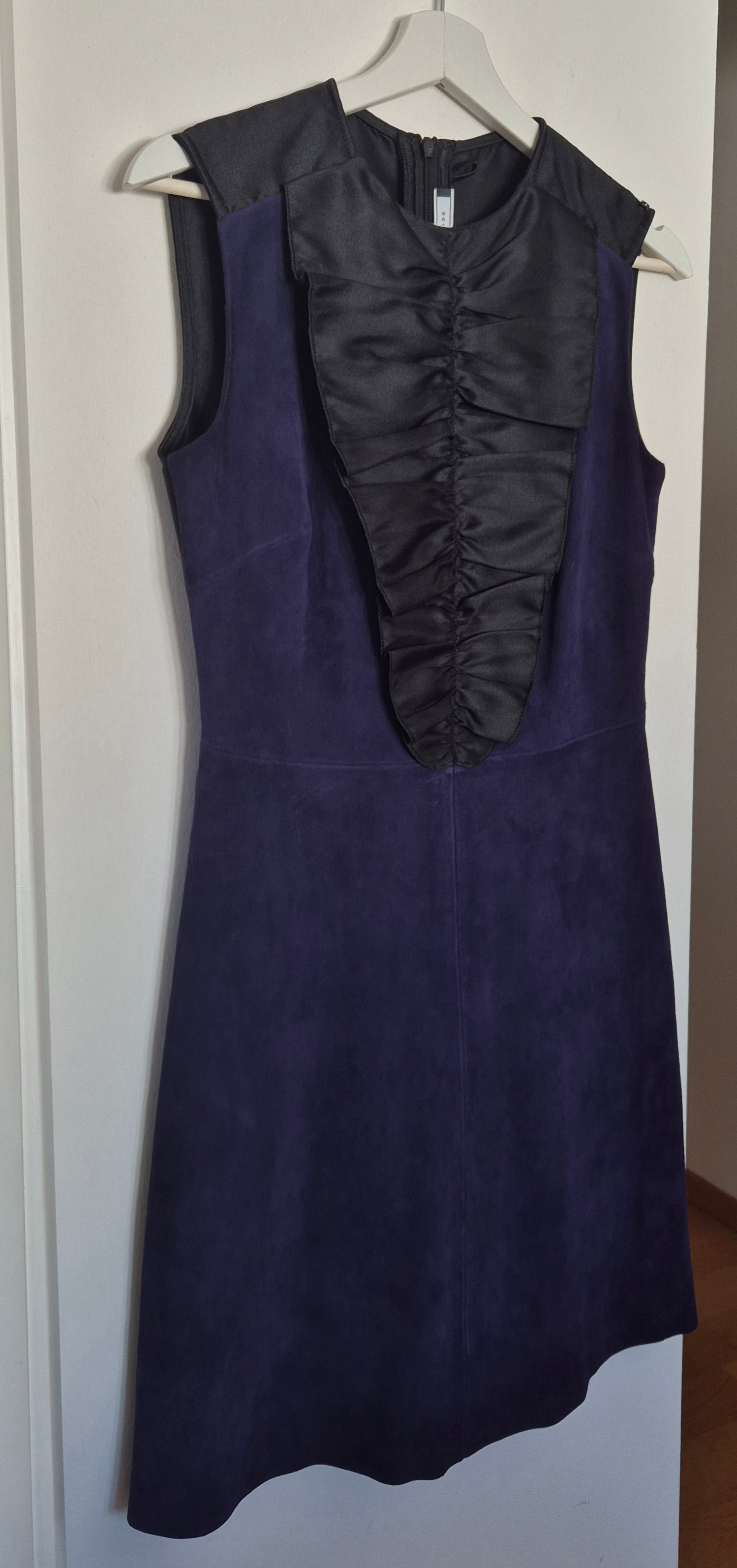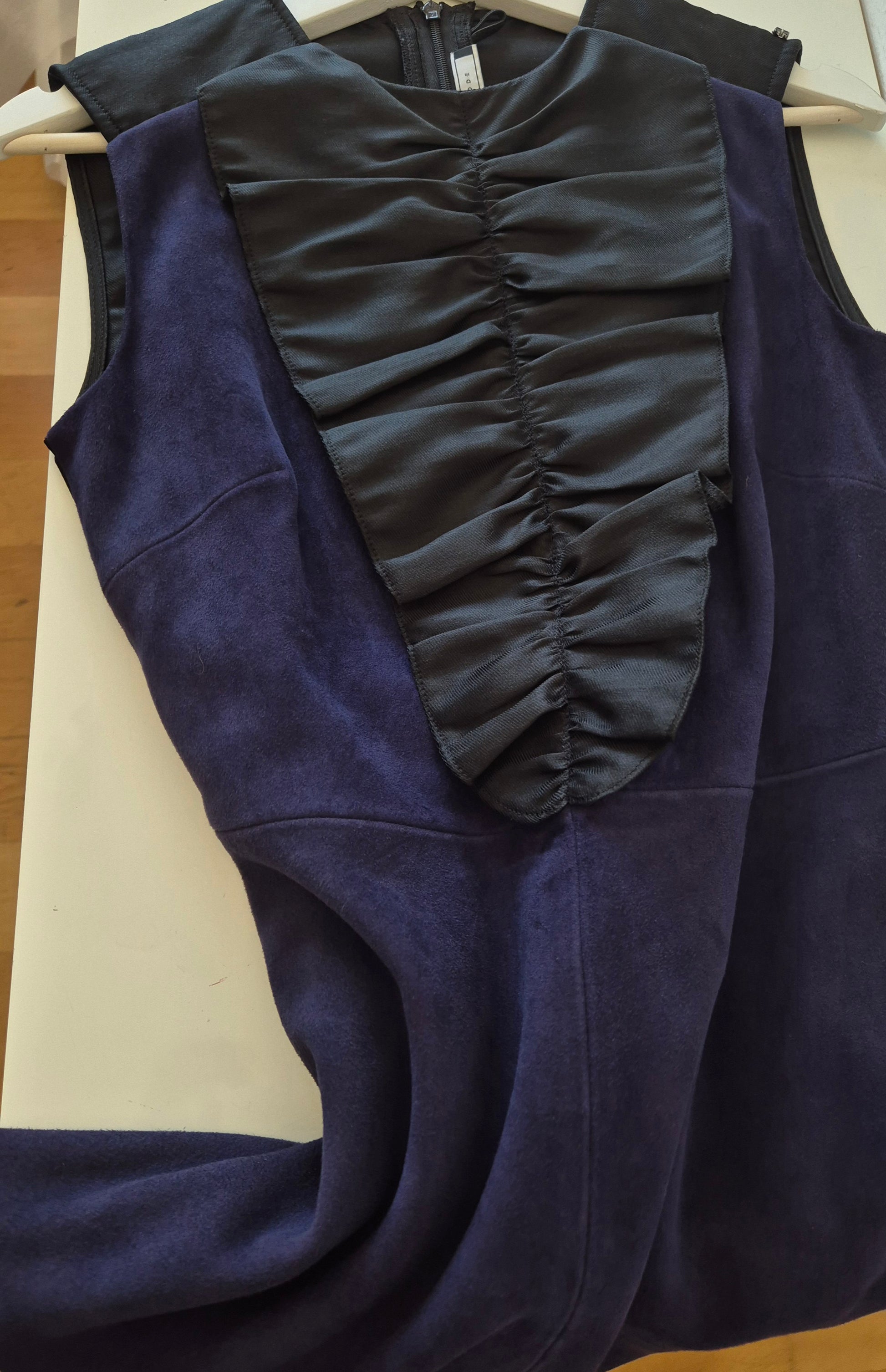 Savršena haljina luksuznog brenda Sportmax. Tamnoplava brušena koža i umetci od crnog finog materijala (poliester s malo svile). Blago strukirana, blagi A-line u donjem dijelu. Ma fantastična! Na ramenu prepoznatljiv pečat brenda - kristalić.
