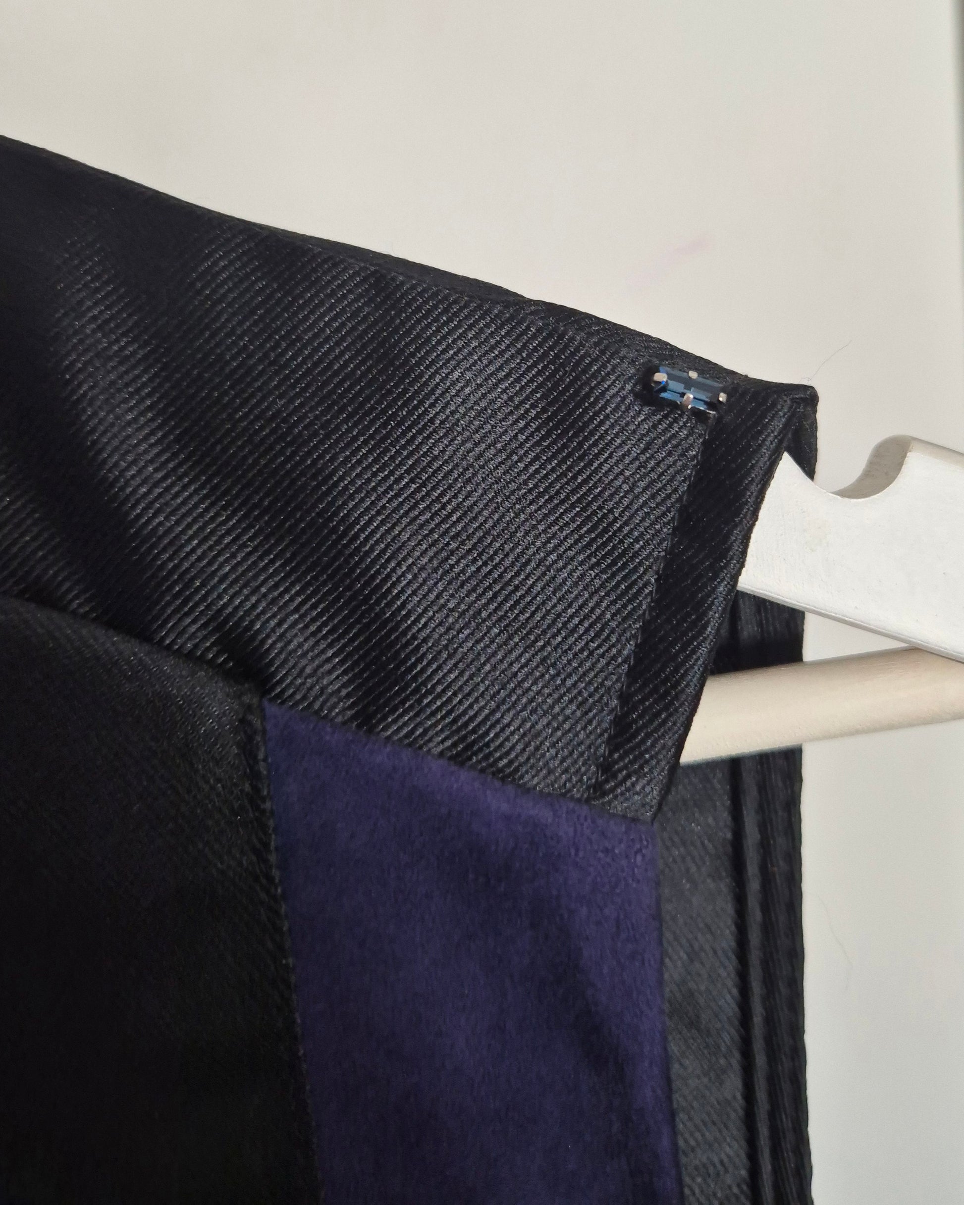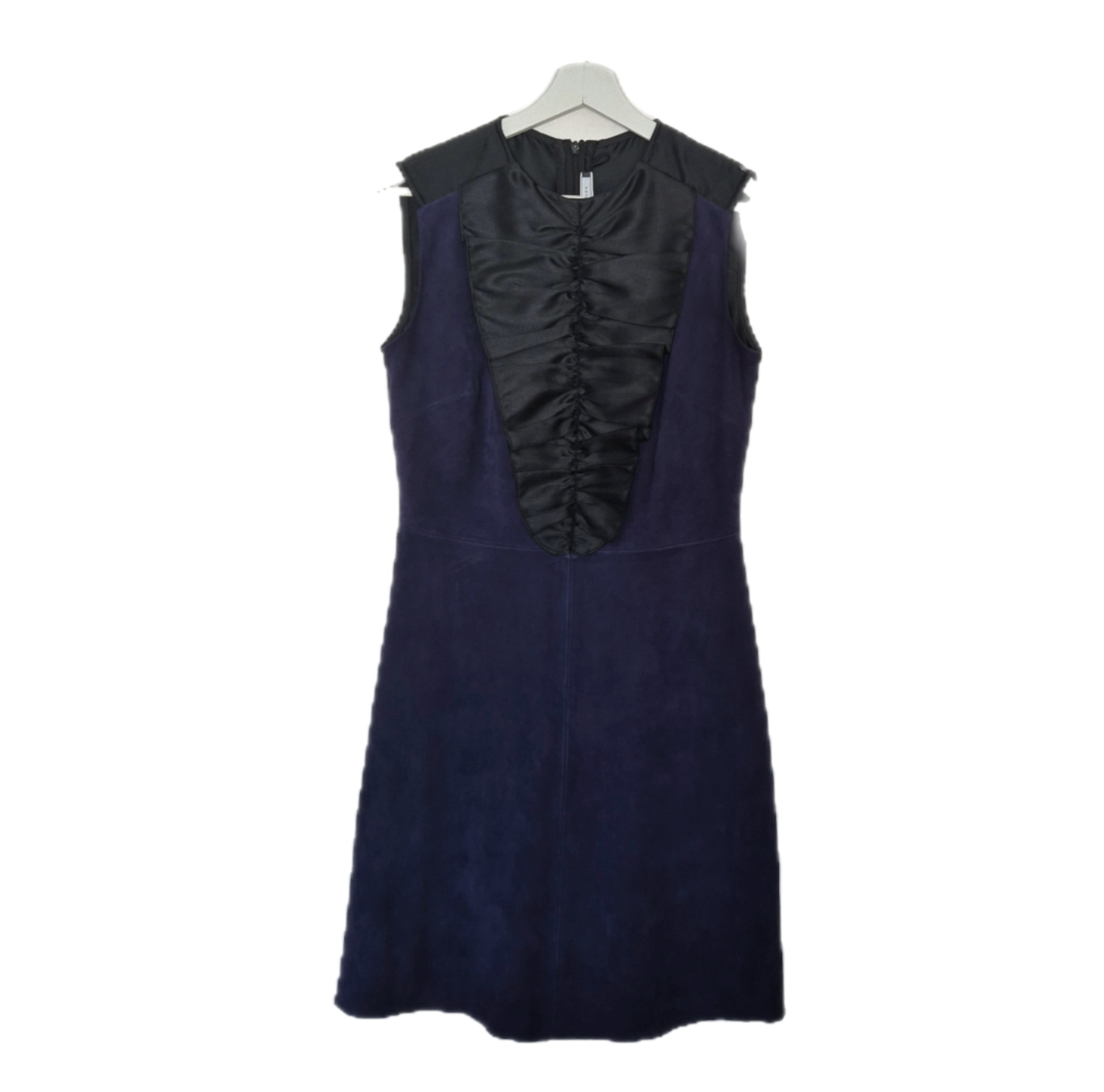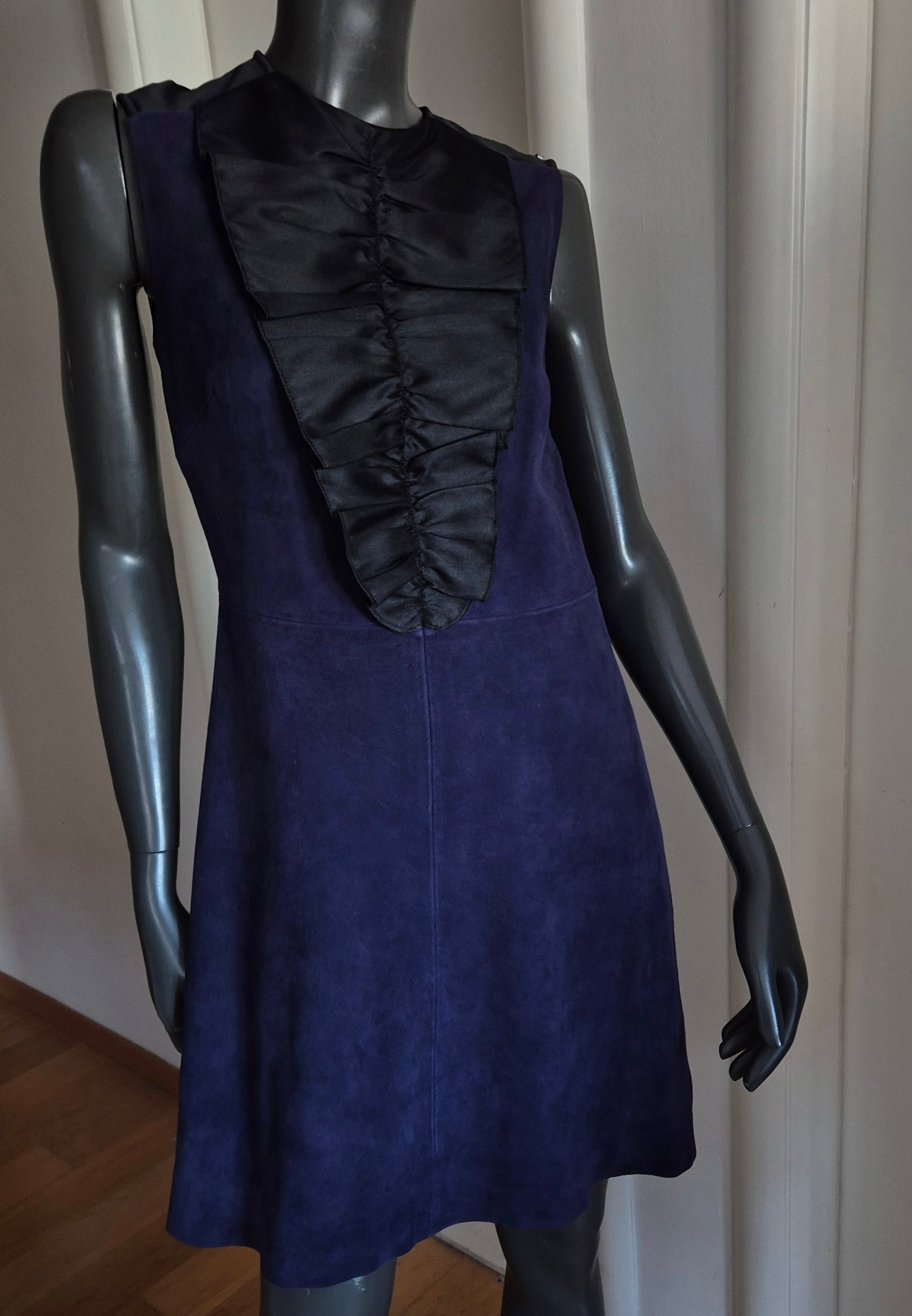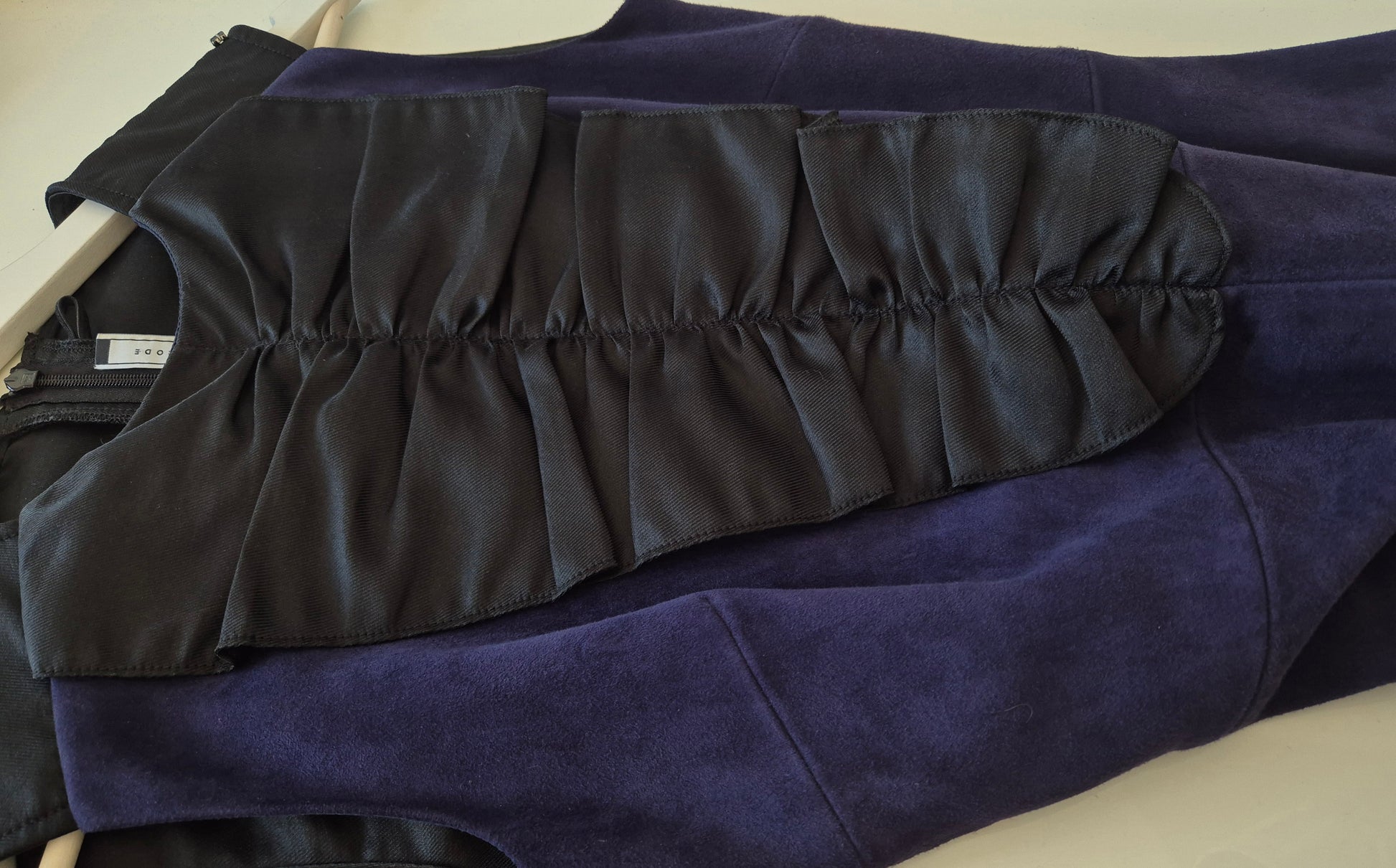 Savršena haljina luksuznog brenda Sportmax. Tamnoplava brušena koža i umetci od crnog finog materijala (poliester s malo svile). Blago strukirana, blagi A-line u donjem dijelu. Ma fantastična! Na ramenu prepoznatljiv pečat brenda - kristalić.