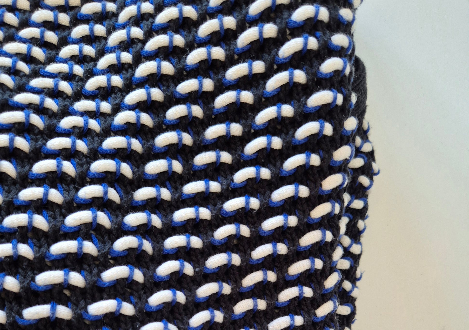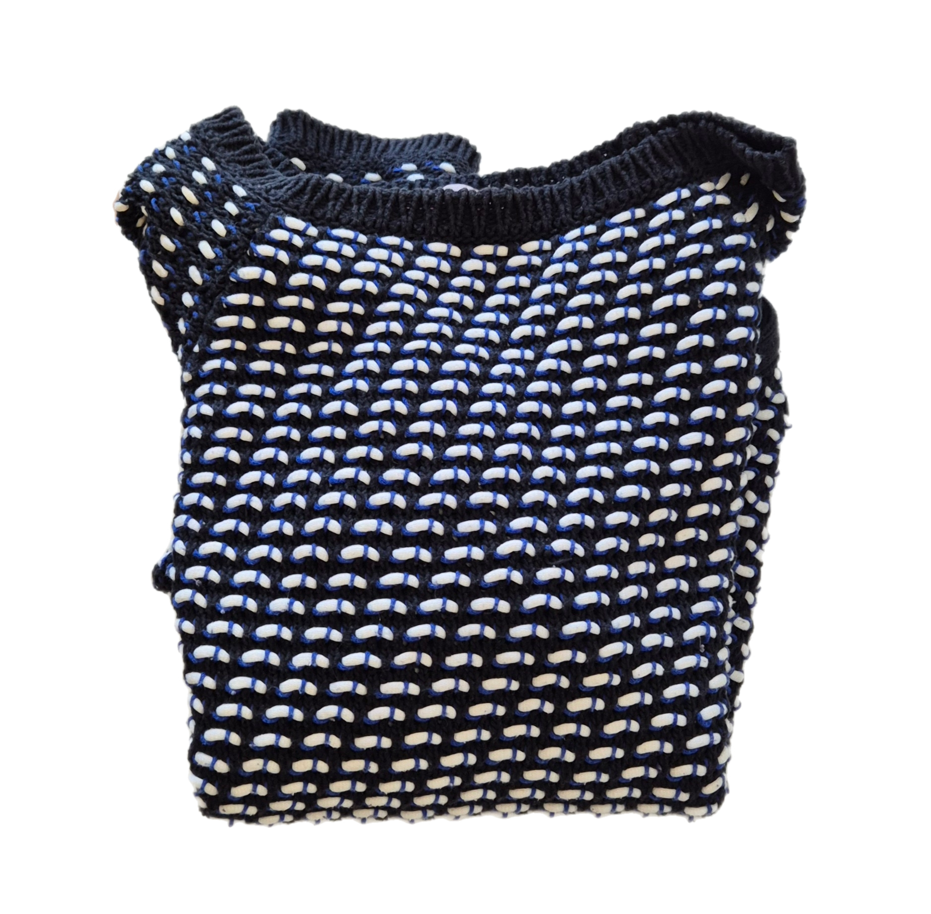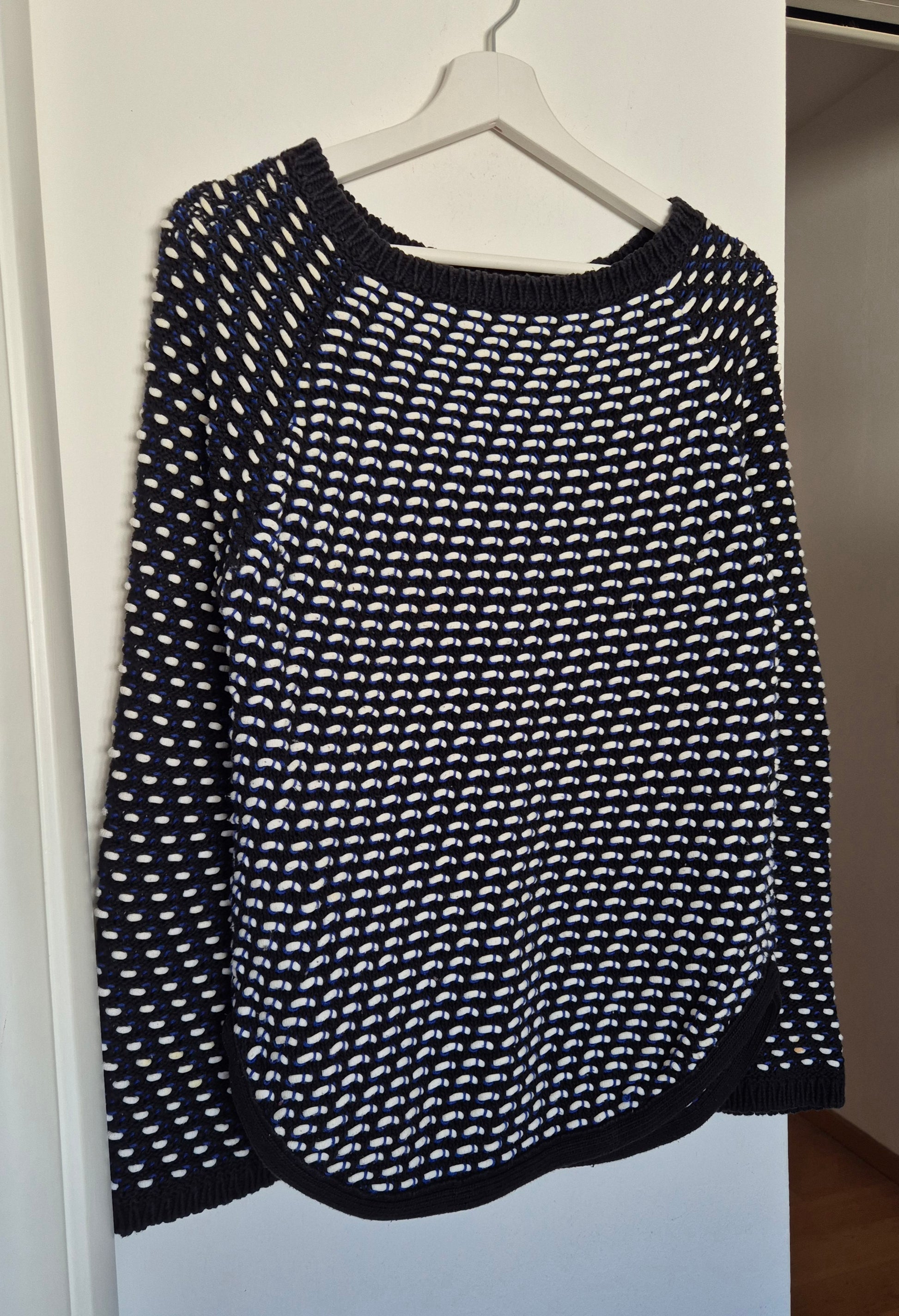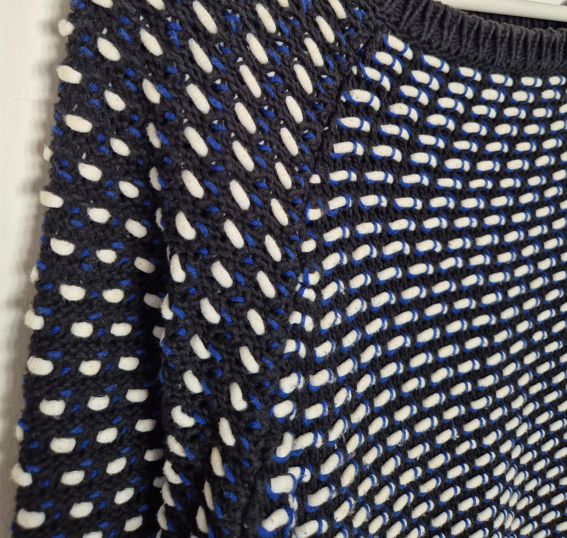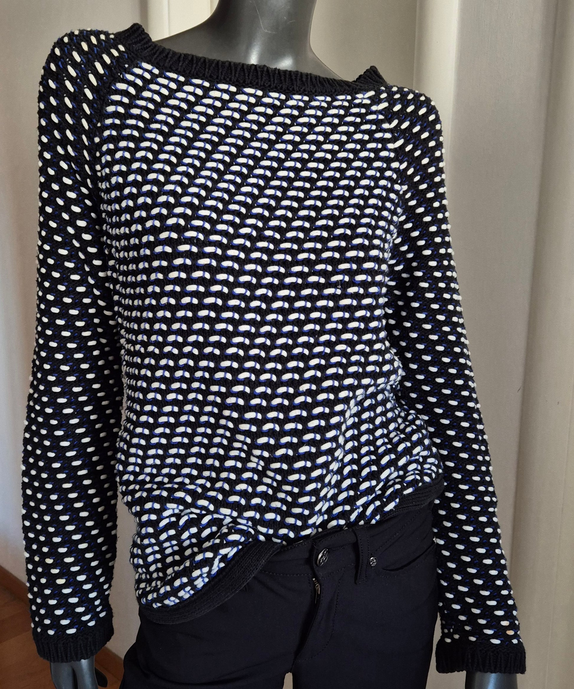 Stefanel reljefasti pulover, crno-bijelo-plavi :). Vjerojatno pamuk.