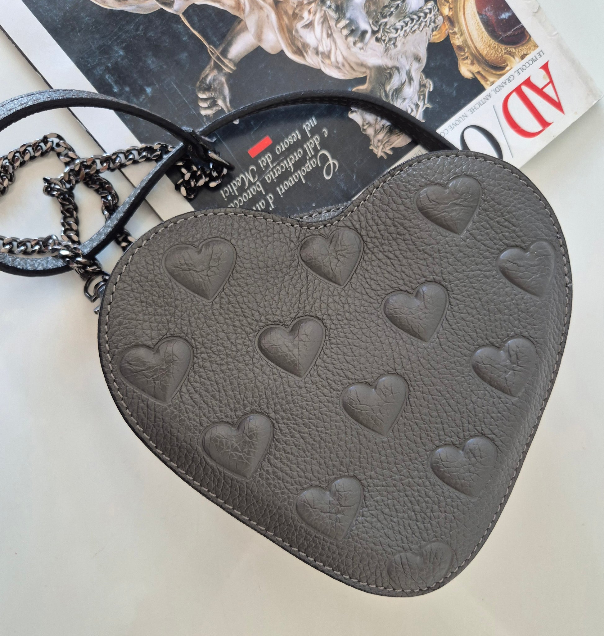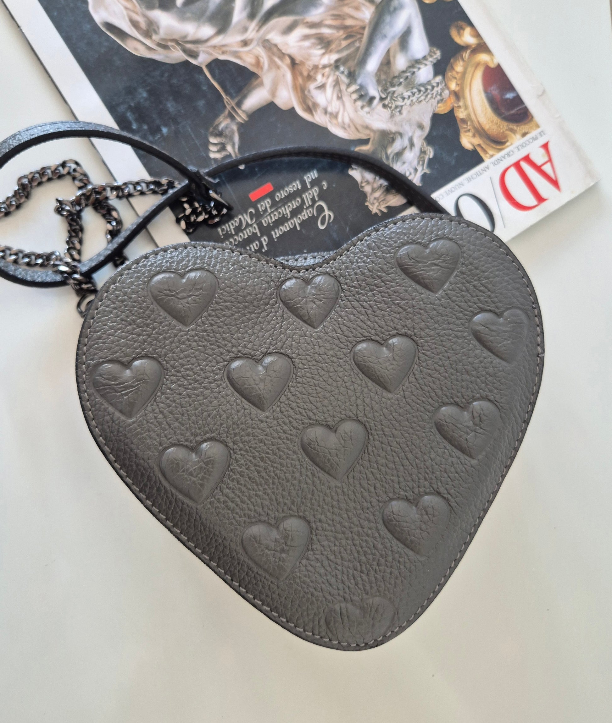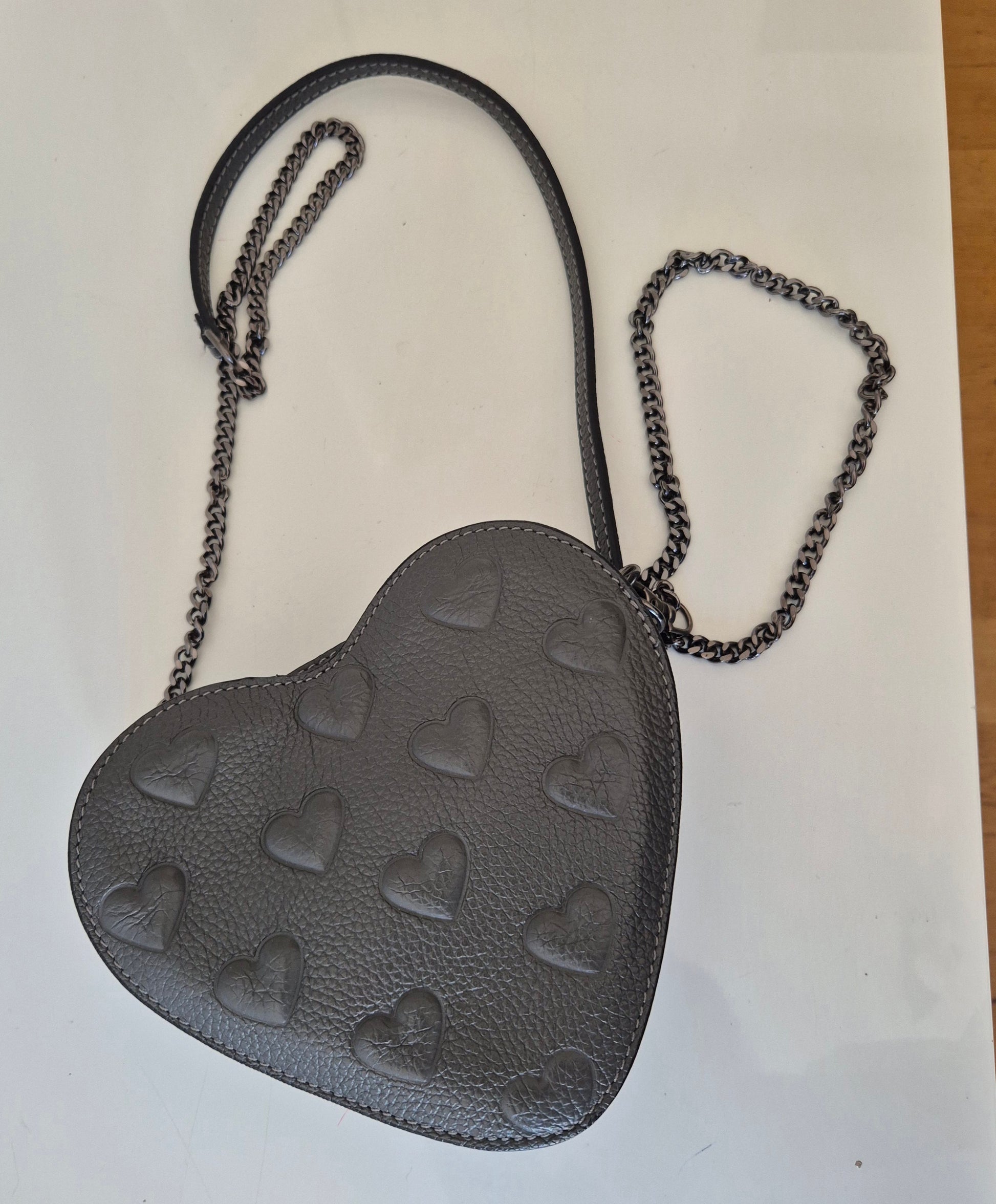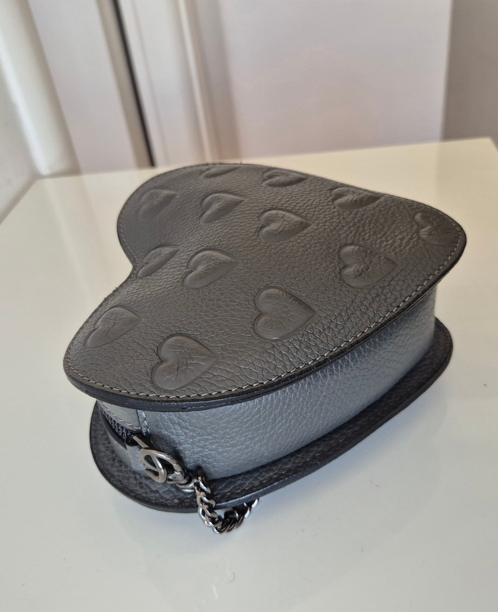 Siva torbica u obliku srca i s uzorkom srca 🩶. Materijal nepoznat - ili premazana koža ili dobra imitacija iste. Vjerojatno Made in Italy - unutra je, etiketica u bojama talijanske zastave.