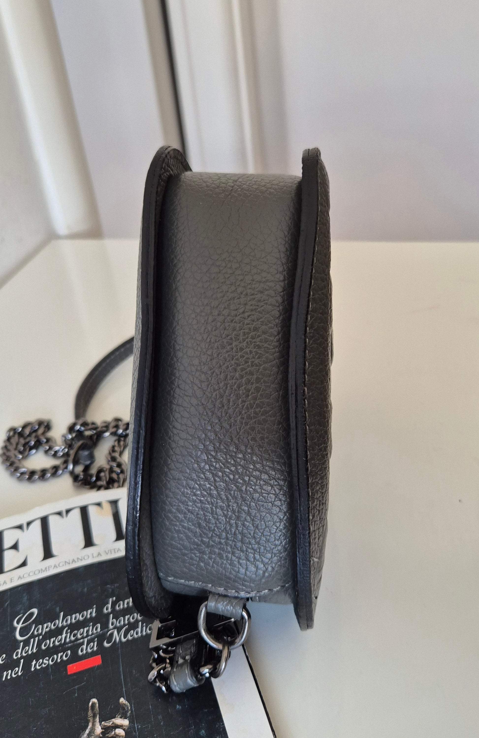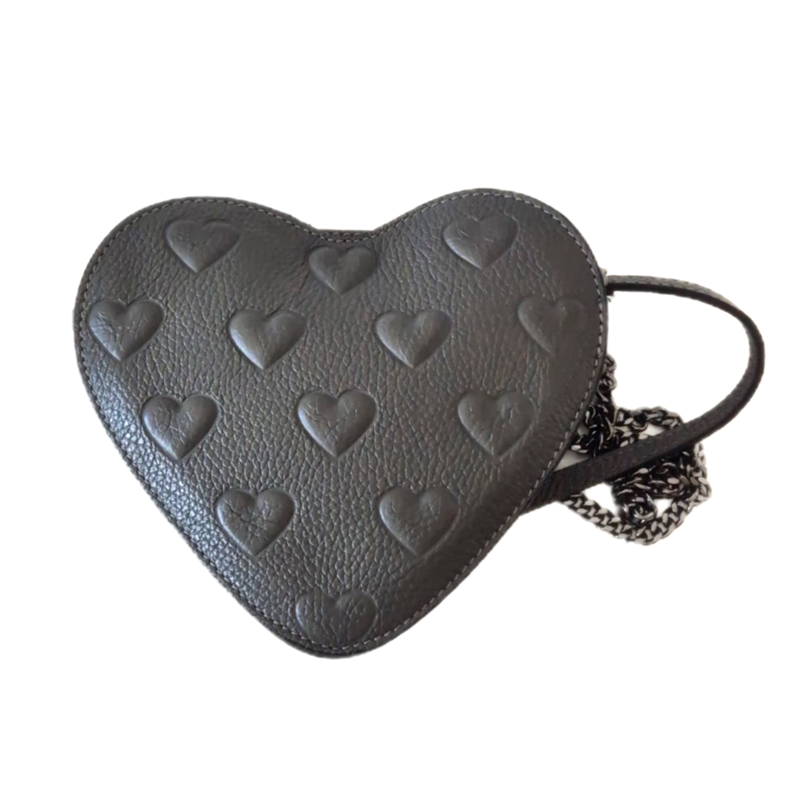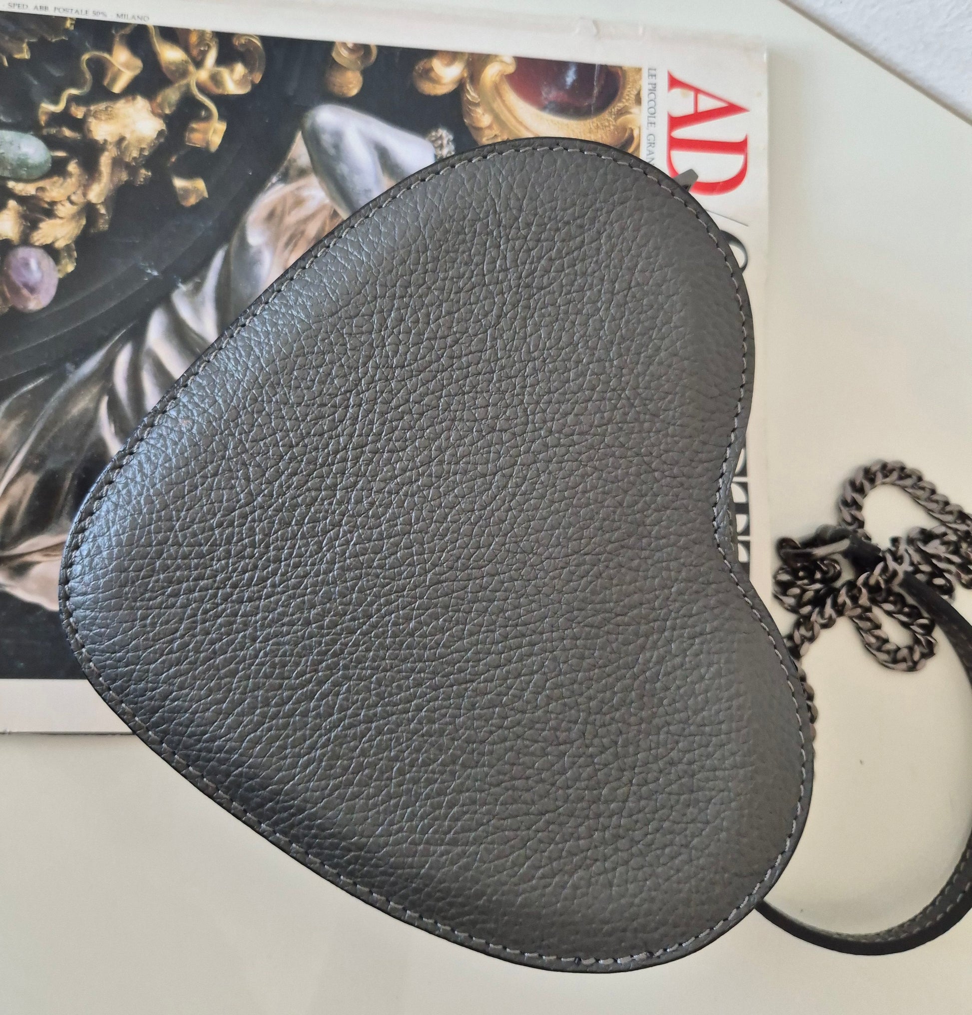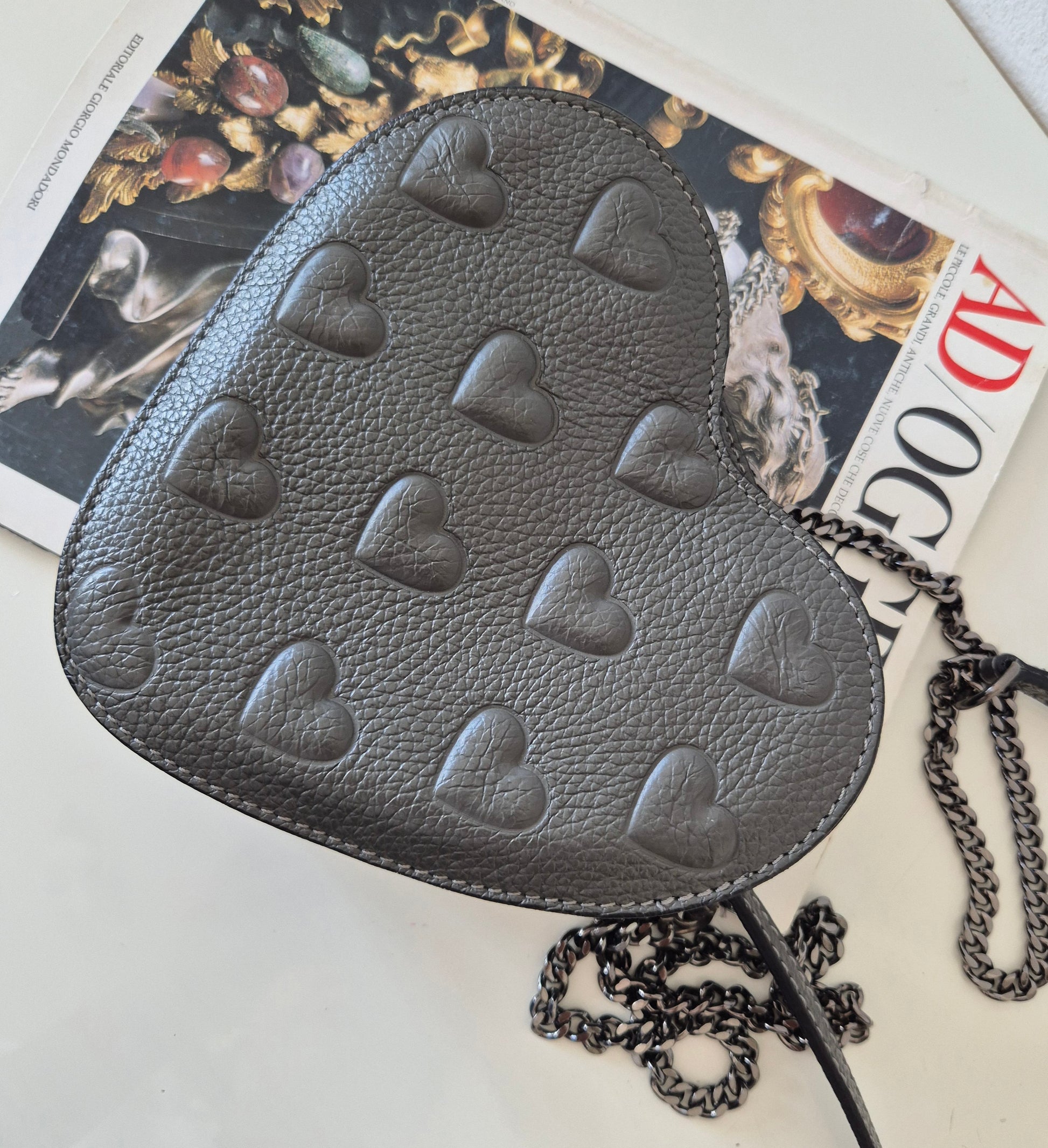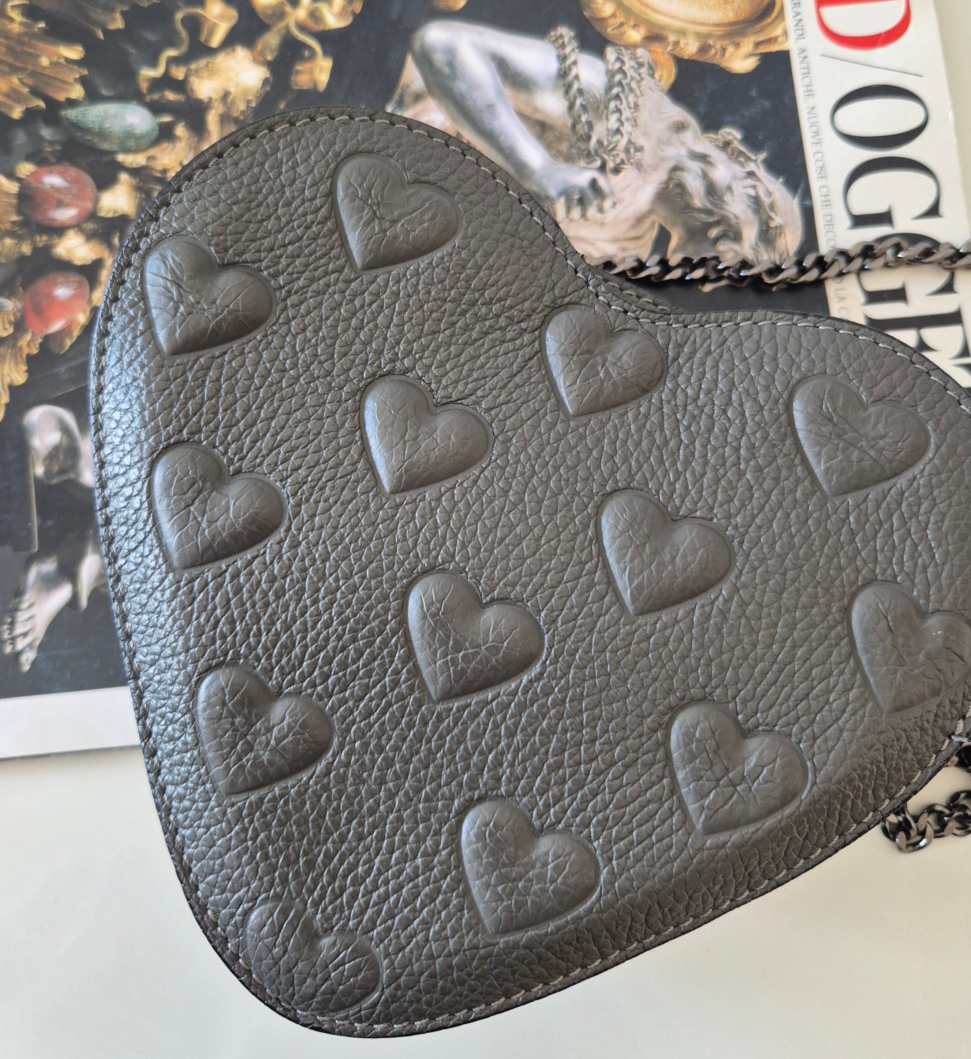 Siva torbica u obliku srca i s uzorkom srca 🩶. Materijal nepoznat - ili premazana koža ili dobra imitacija iste. Vjerojatno Made in Italy - unutra je, etiketica u bojama talijanske zastave.