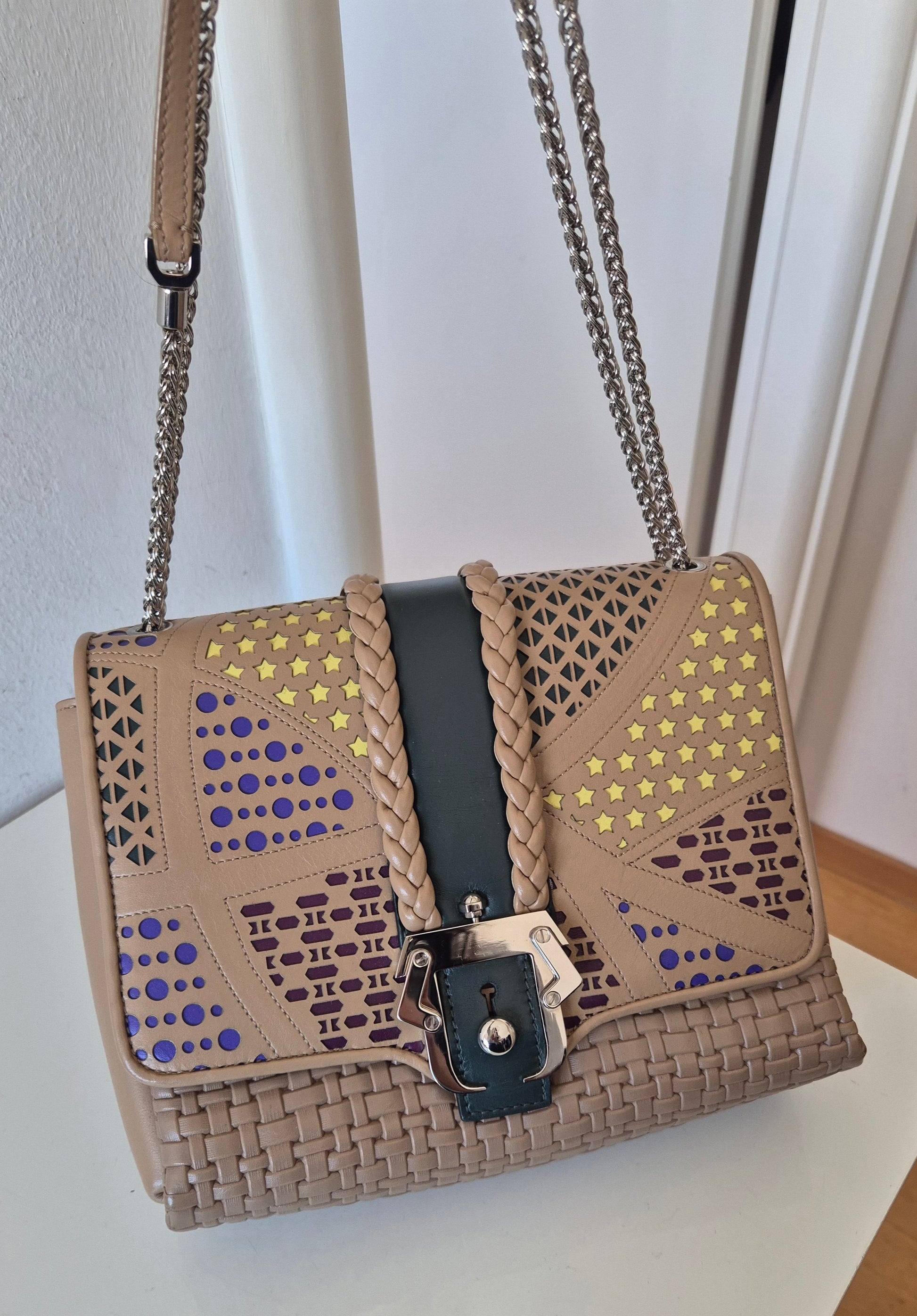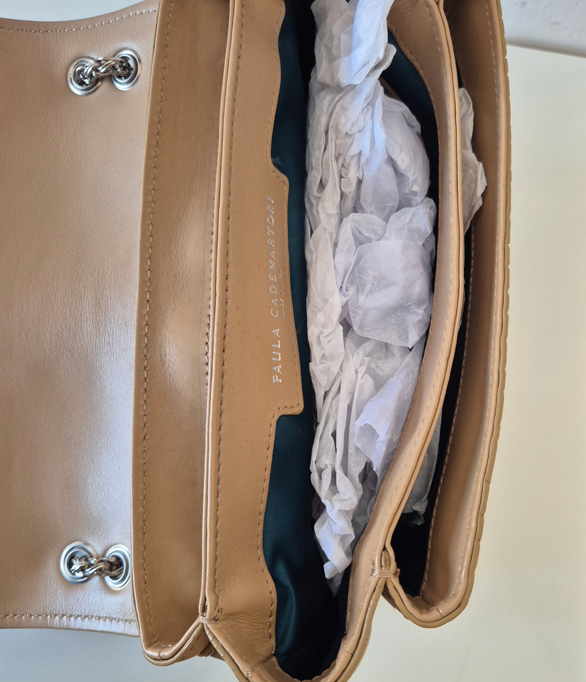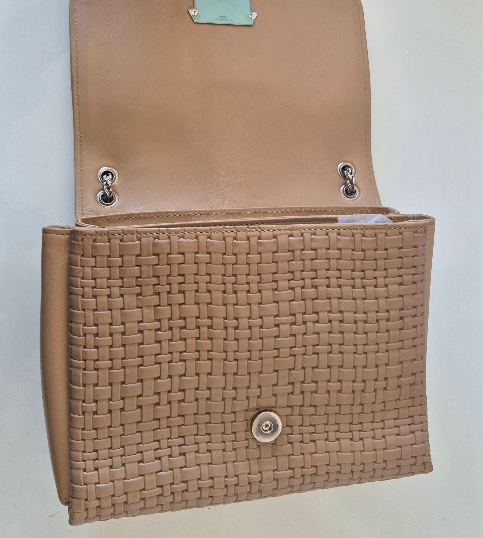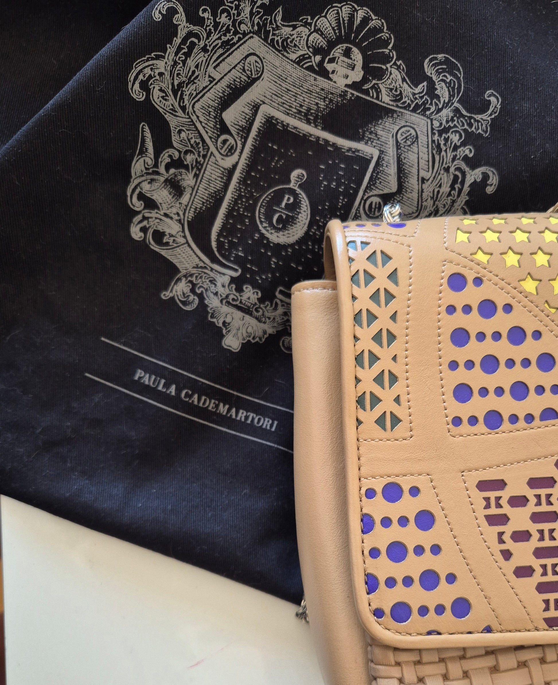 Torba brazilske dizajnerice Paule Cademartori. Koža, veoma poseban dizajn i puno detalja. Dolazi s dust bag-om. Stanje perfektno, (kao) nova. Može se nositi preko ramena ili preko tijela (lanac može biti u 2 ili 1 niz).