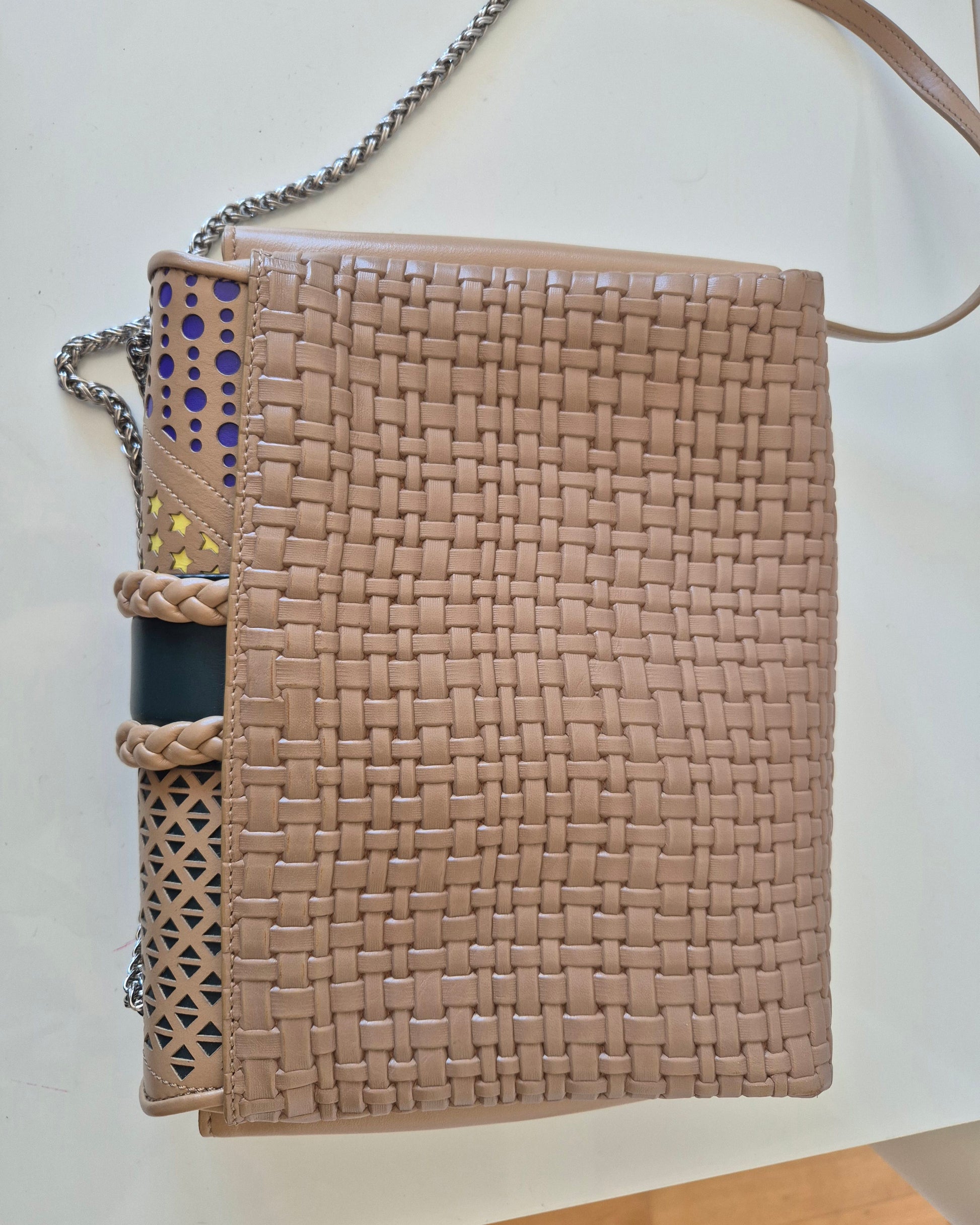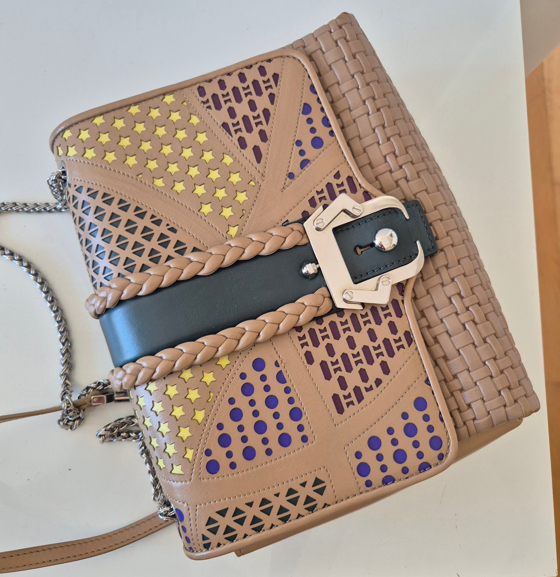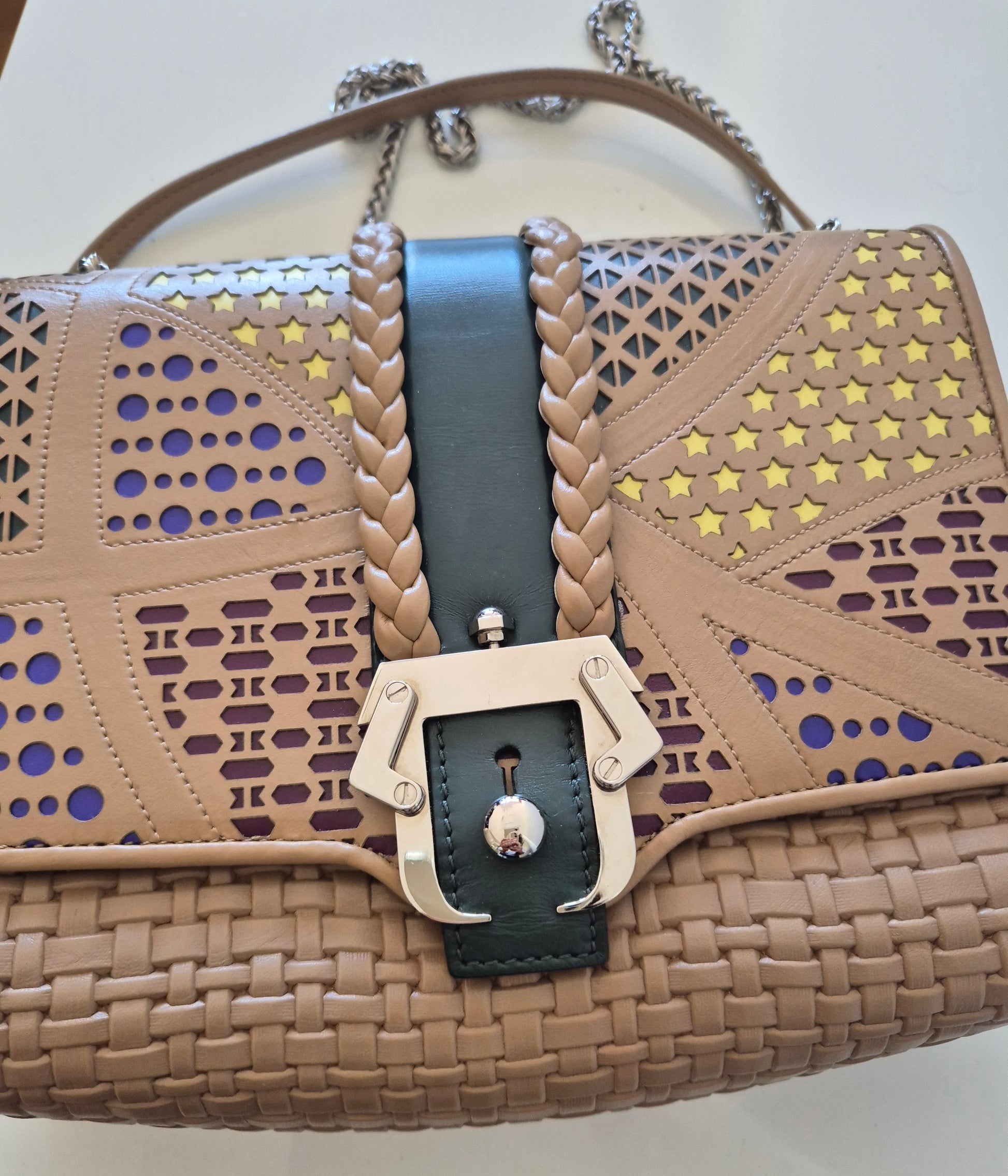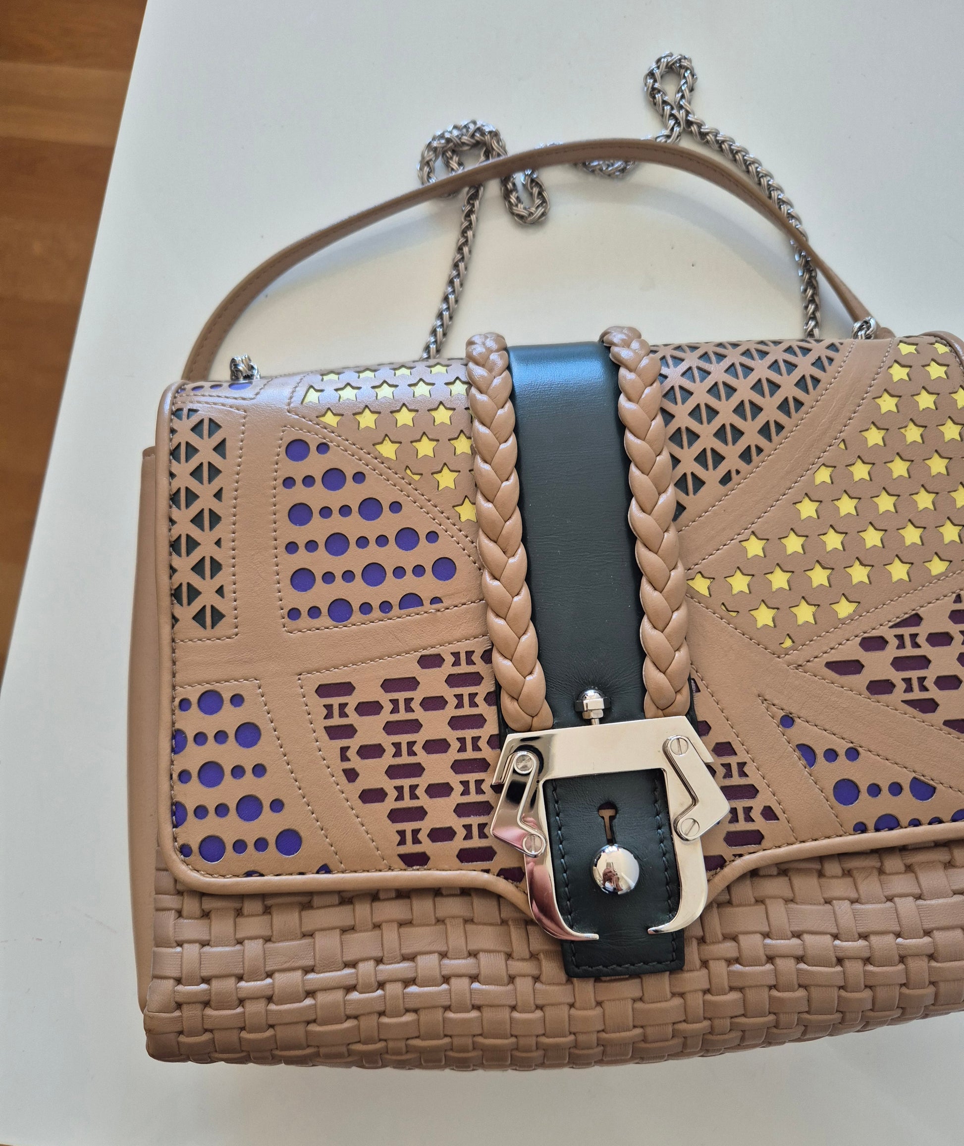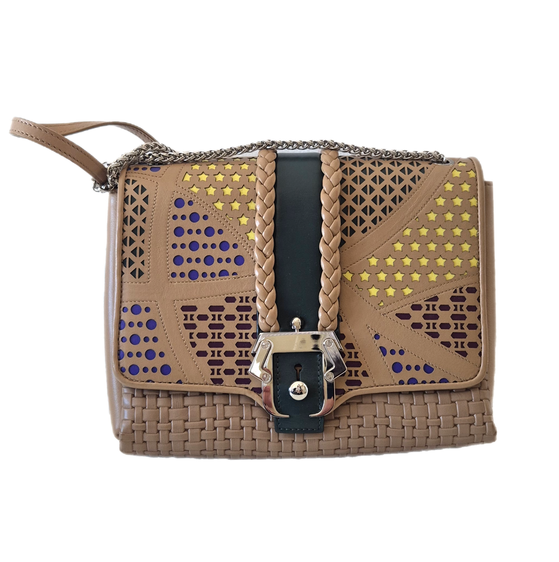 Torba brazilske dizajnerice Paule Cademartori. Koža, veoma poseban dizajn i puno detalja. Dolazi s dust bag-om. Stanje perfektno, (kao) nova. Može se nositi preko ramena ili preko tijela (lanac može biti u 2 ili 1 niz).