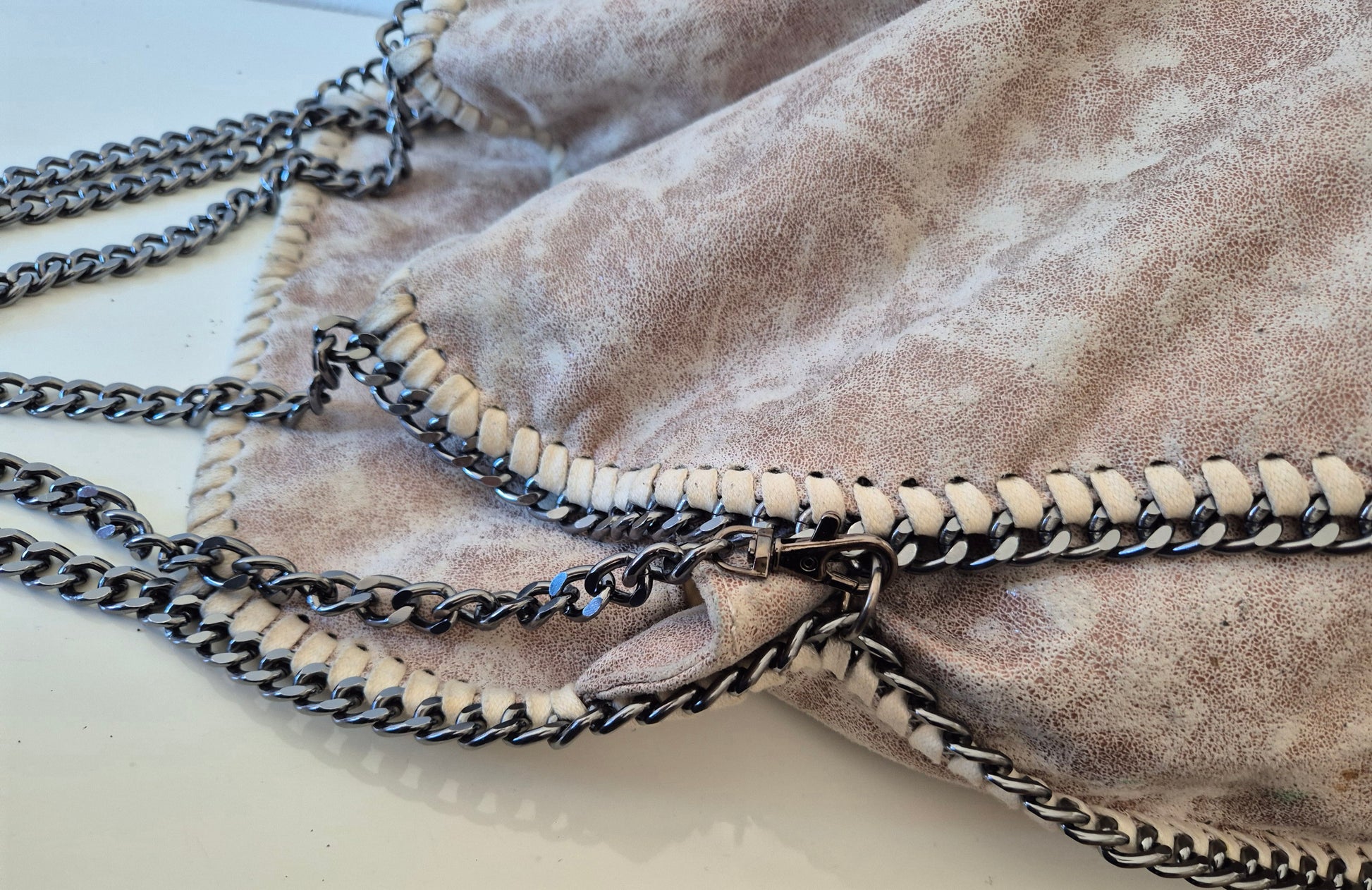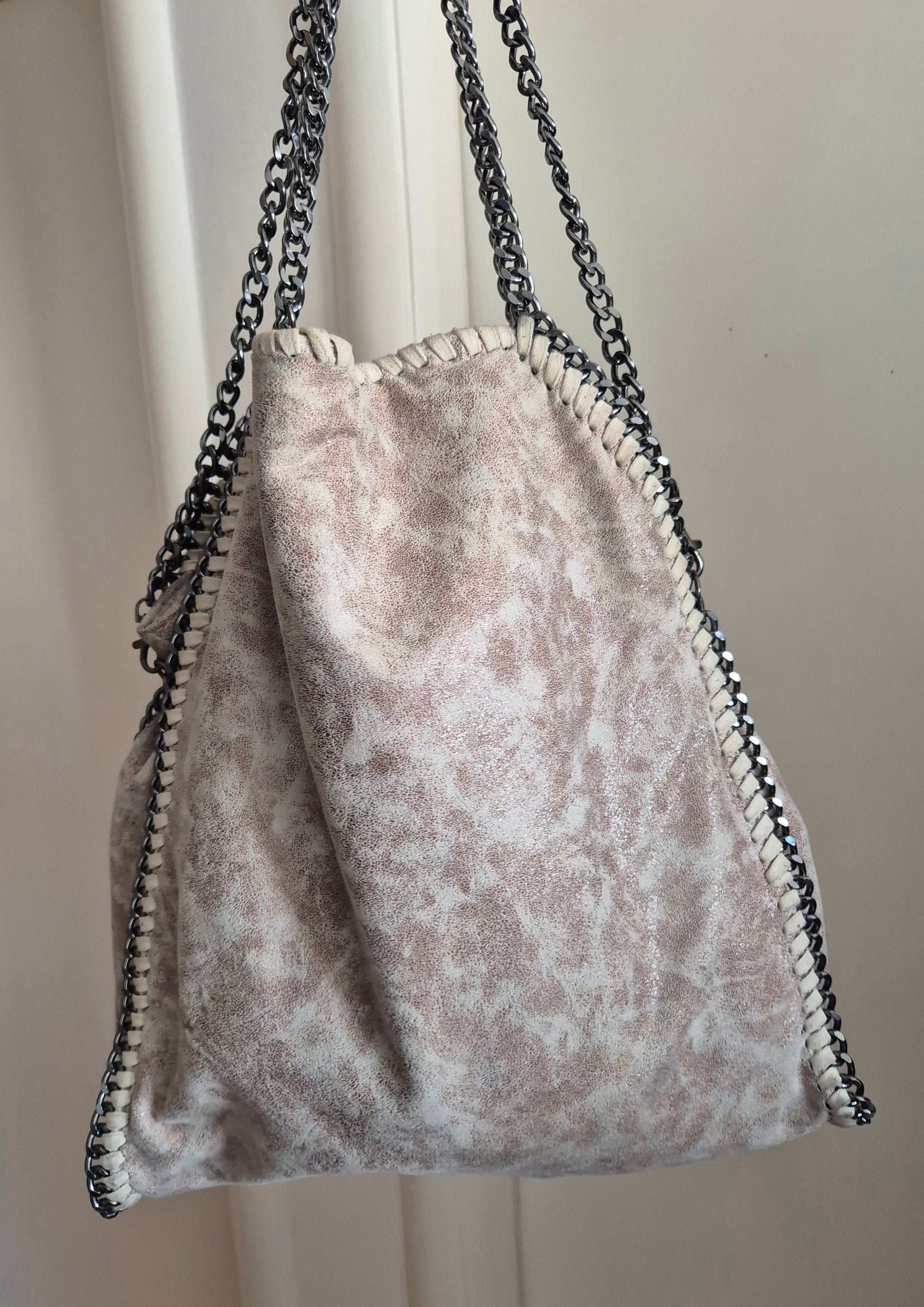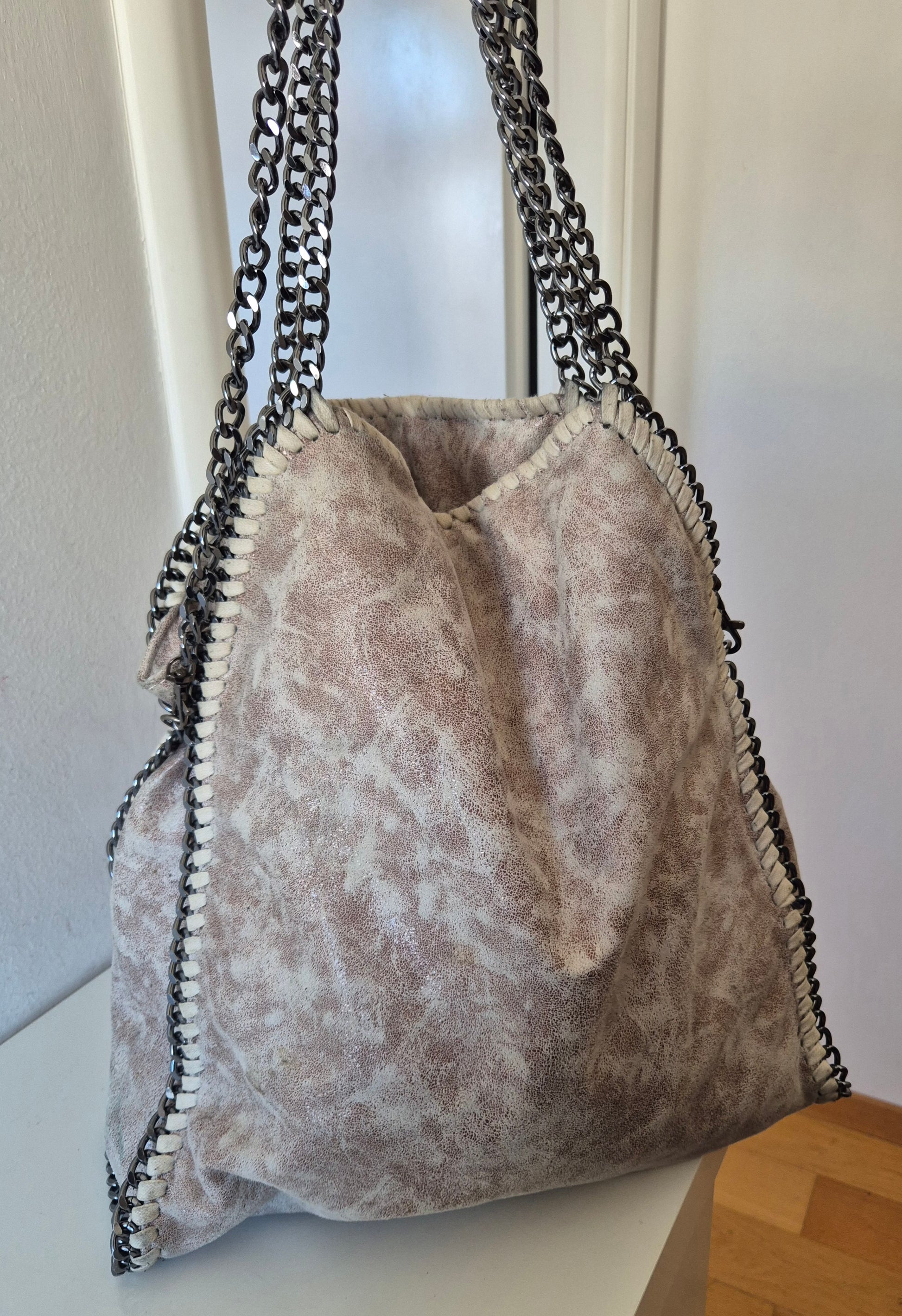 Prostrana everyday torba, nalik na Stella McCartney model. Od tekstila (blago presijavajućeg), a ručke su lanci. 3 su ručke, jedna se može maknuti.