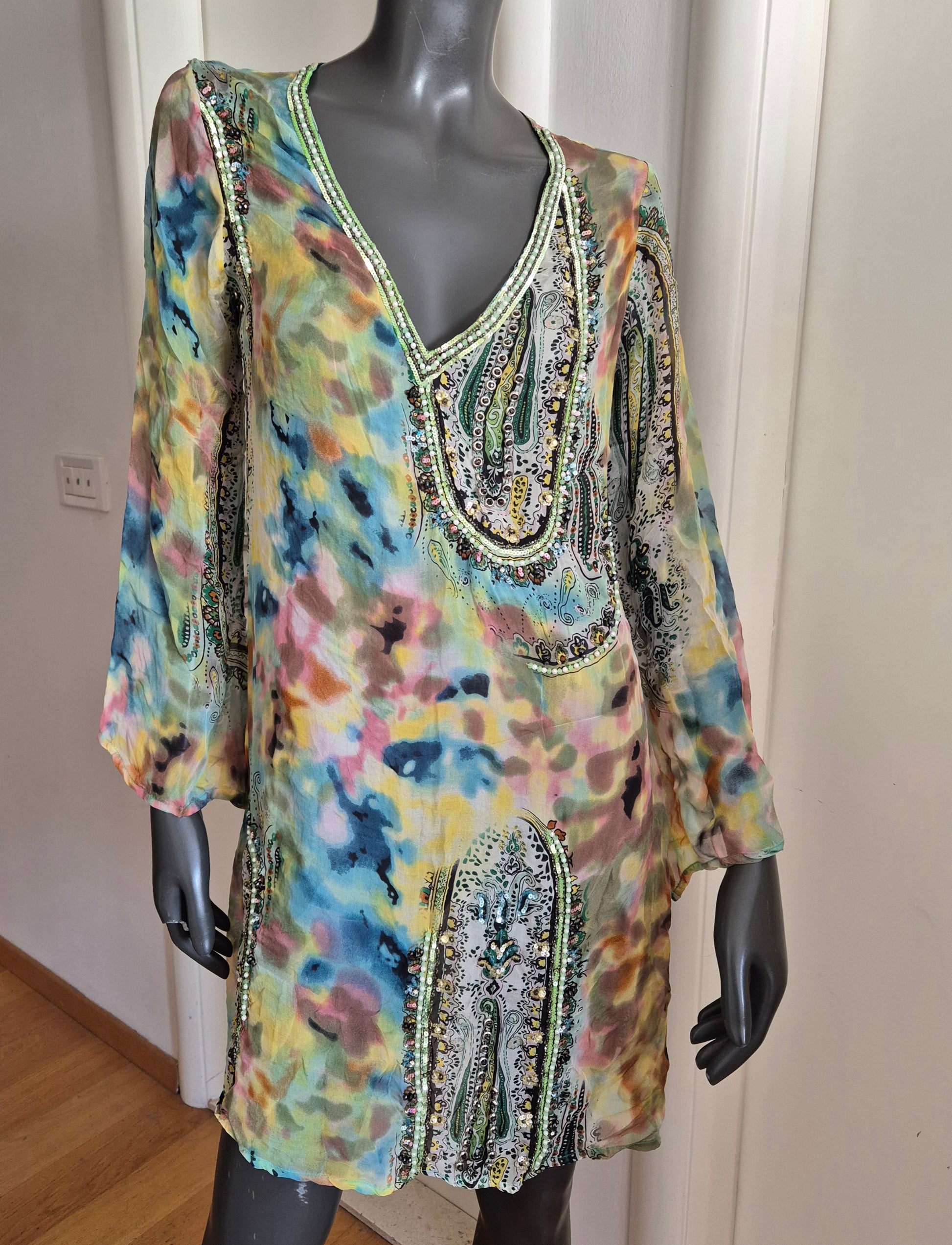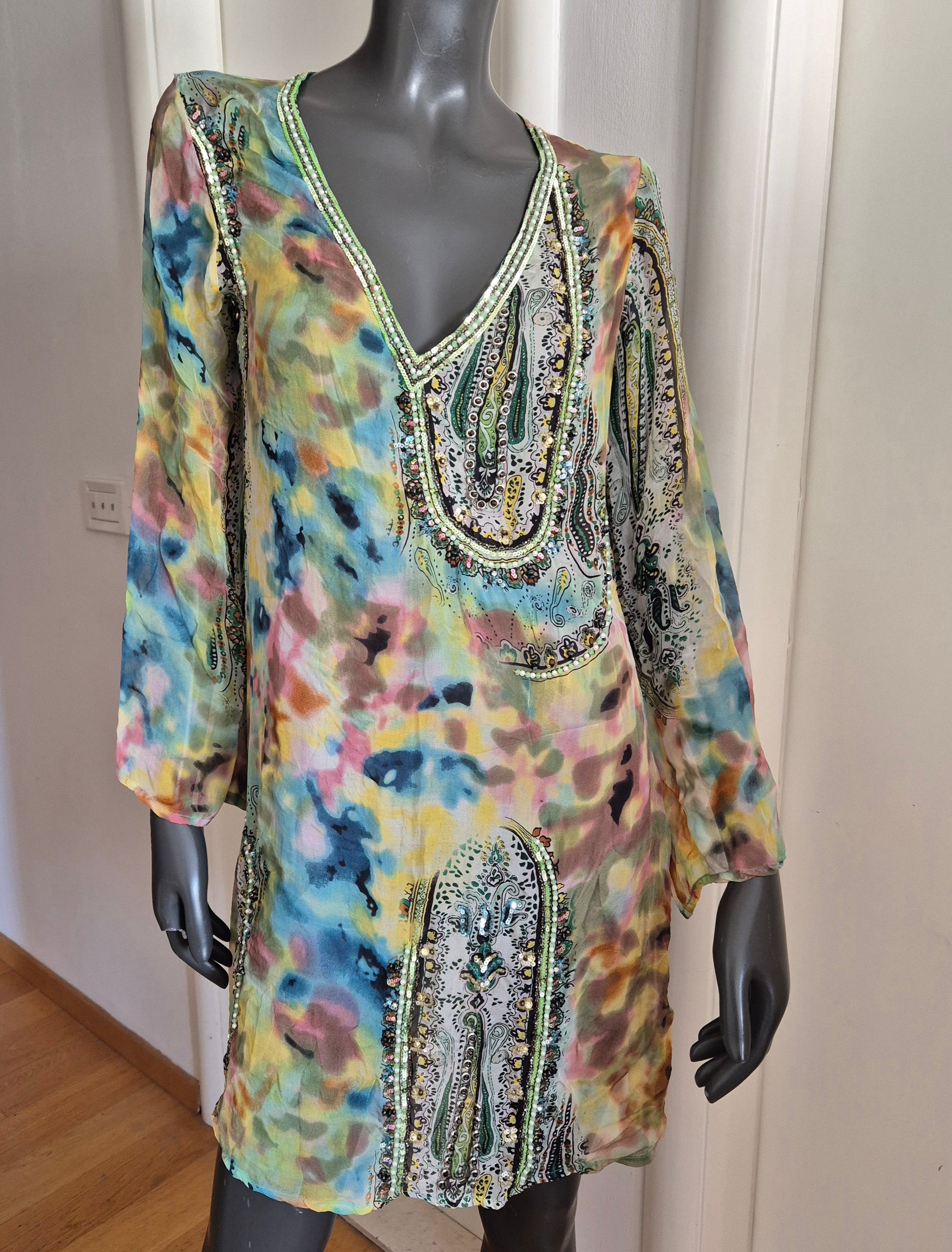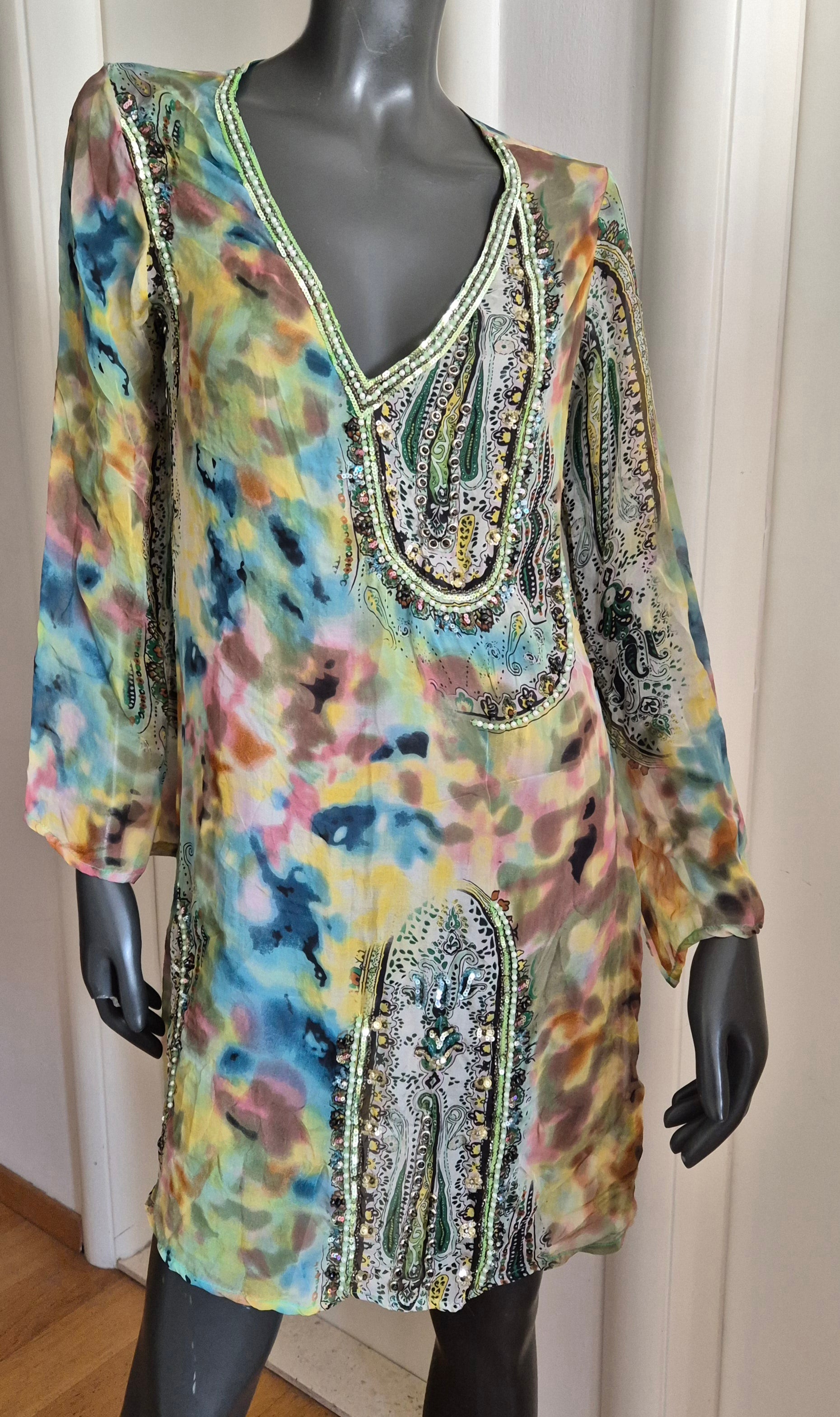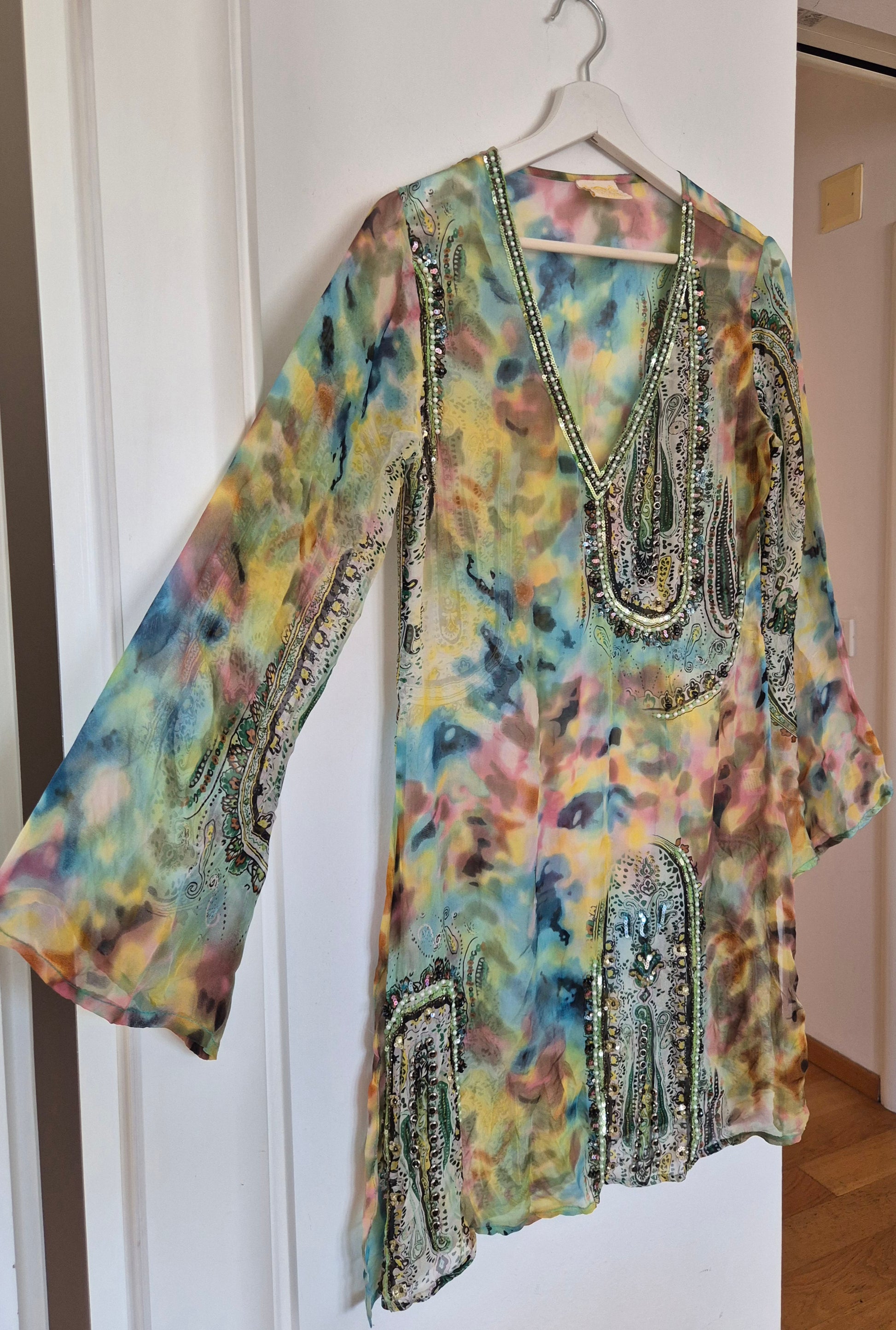 Prekrasna haljina ili tunika od nježne svile. S uzorkom i različitim perlicama na različitim mjestima. Zvono rukavi. Prorezi bočno.