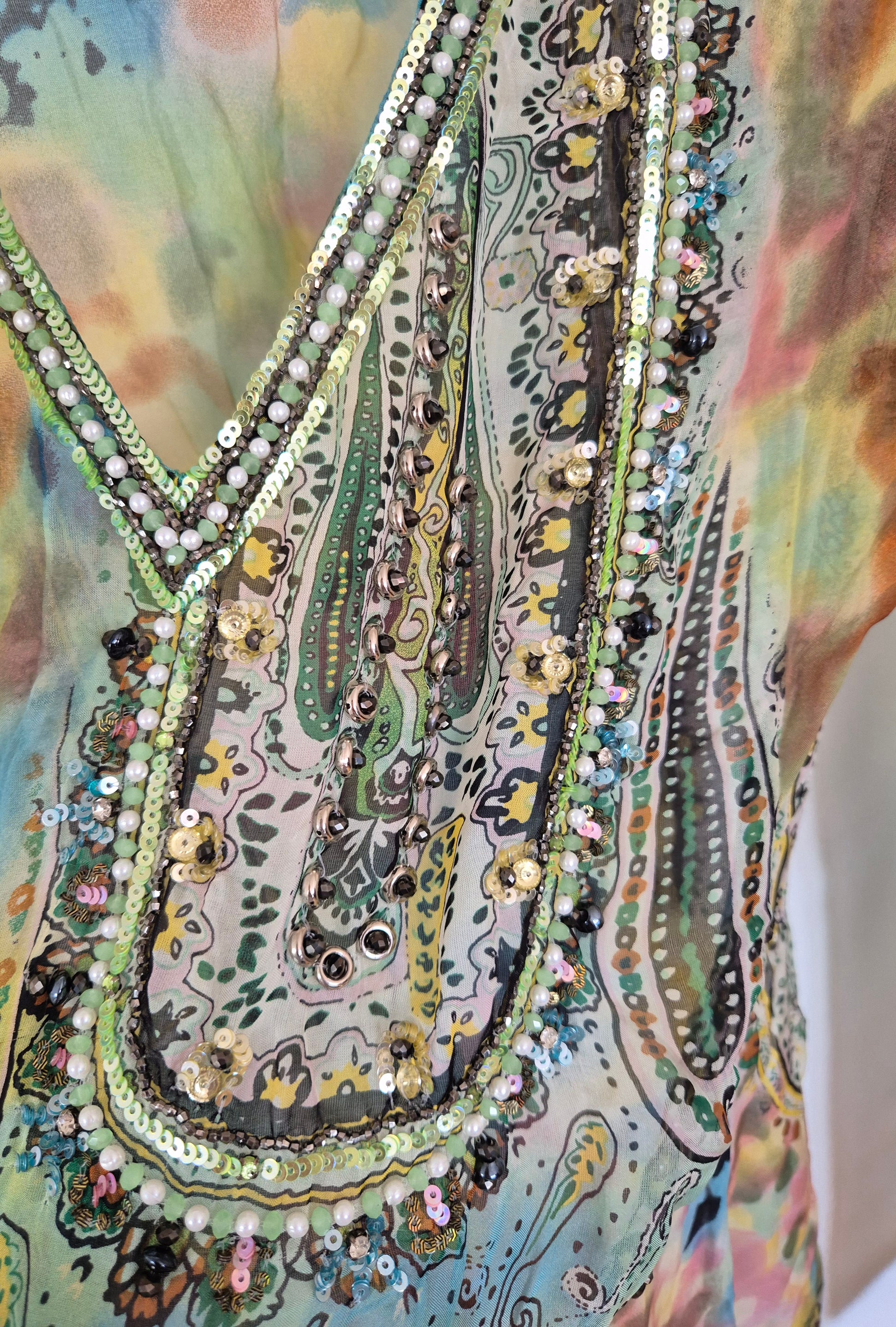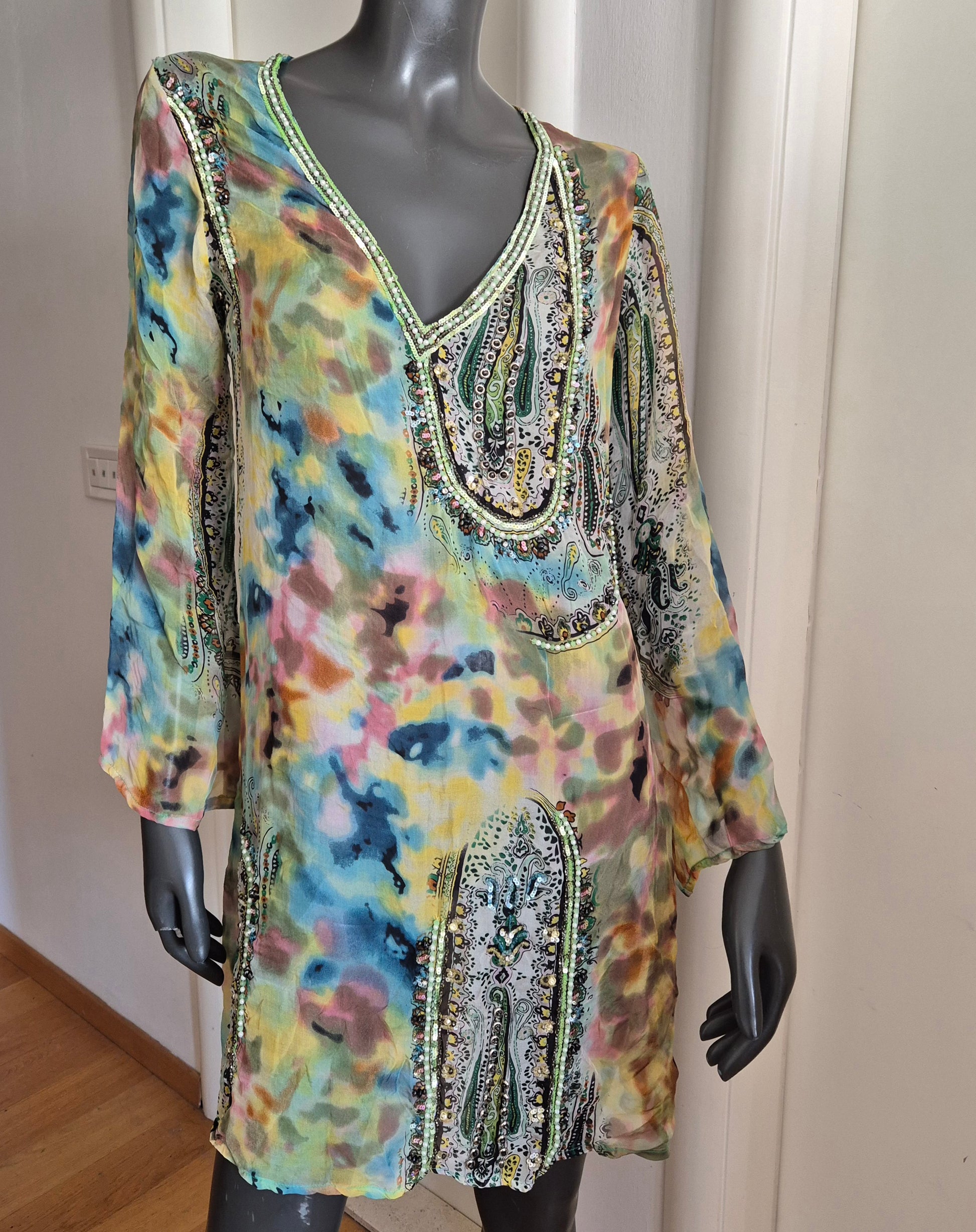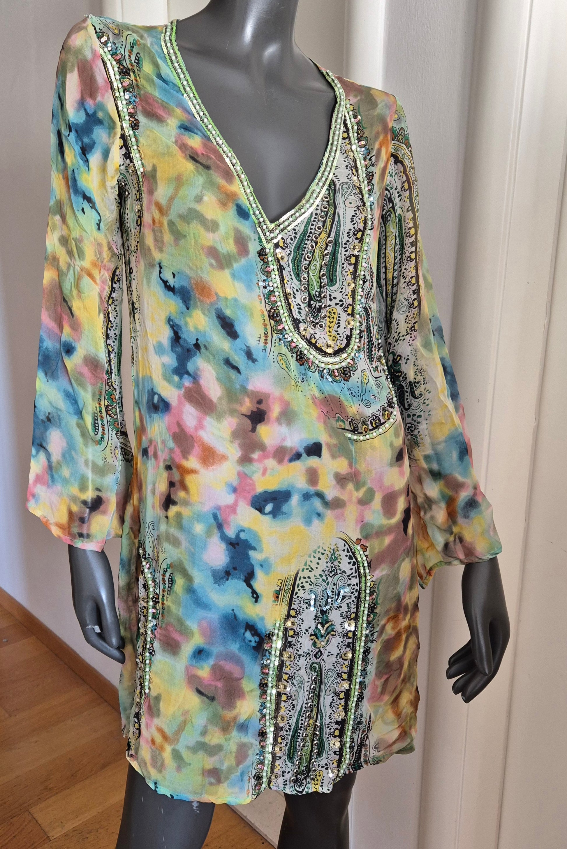 Prekrasna haljina ili tunika od nježne svile. S uzorkom i različitim perlicama na različitim mjestima. Zvono rukavi. Prorezi bočno.