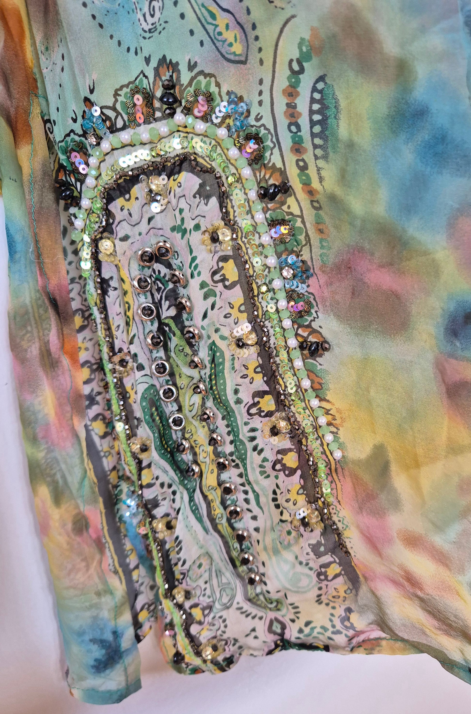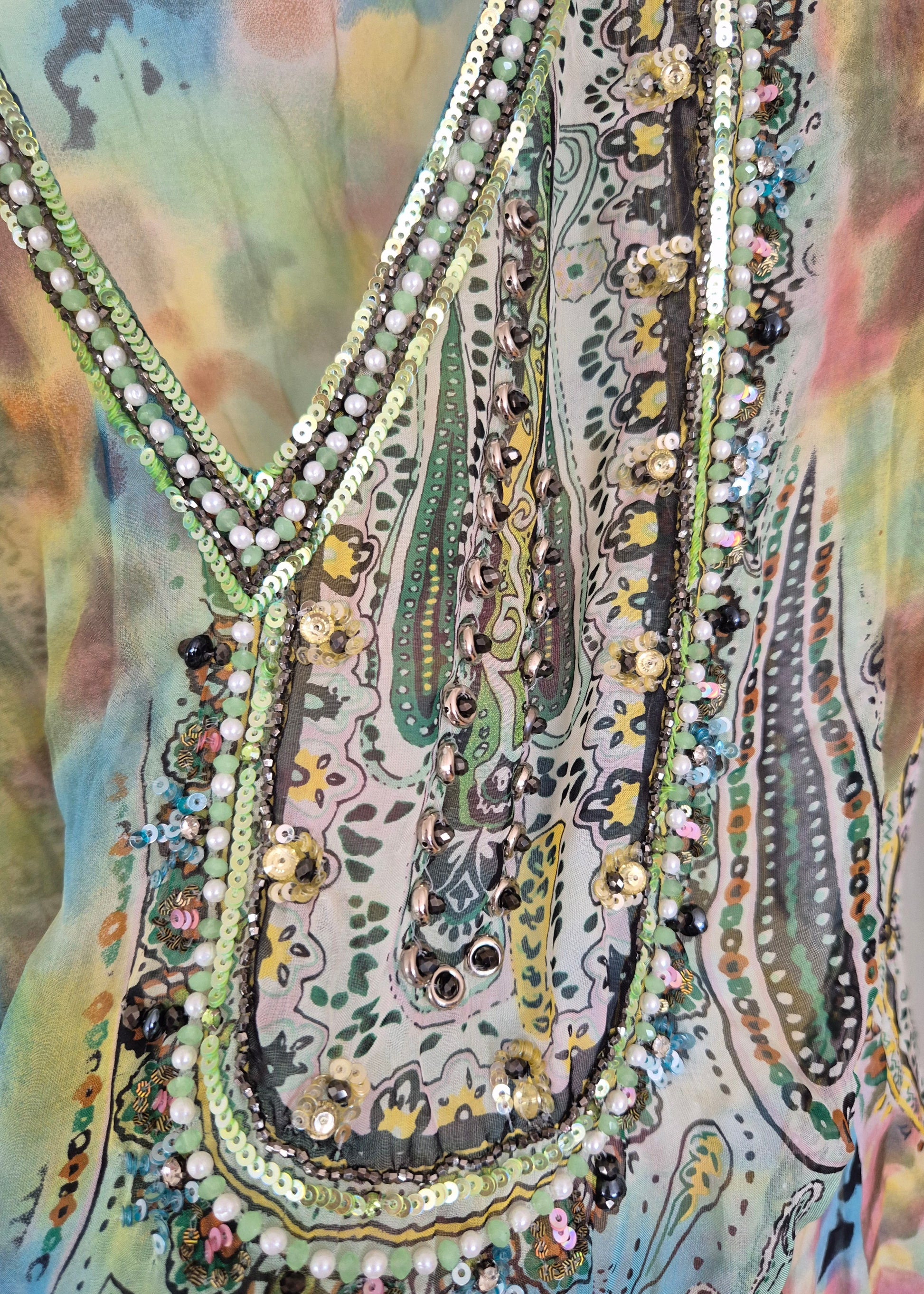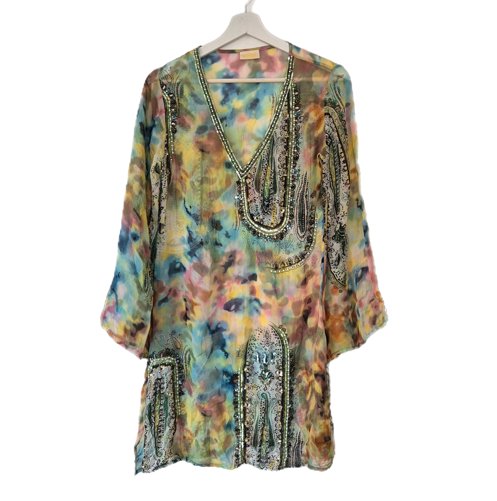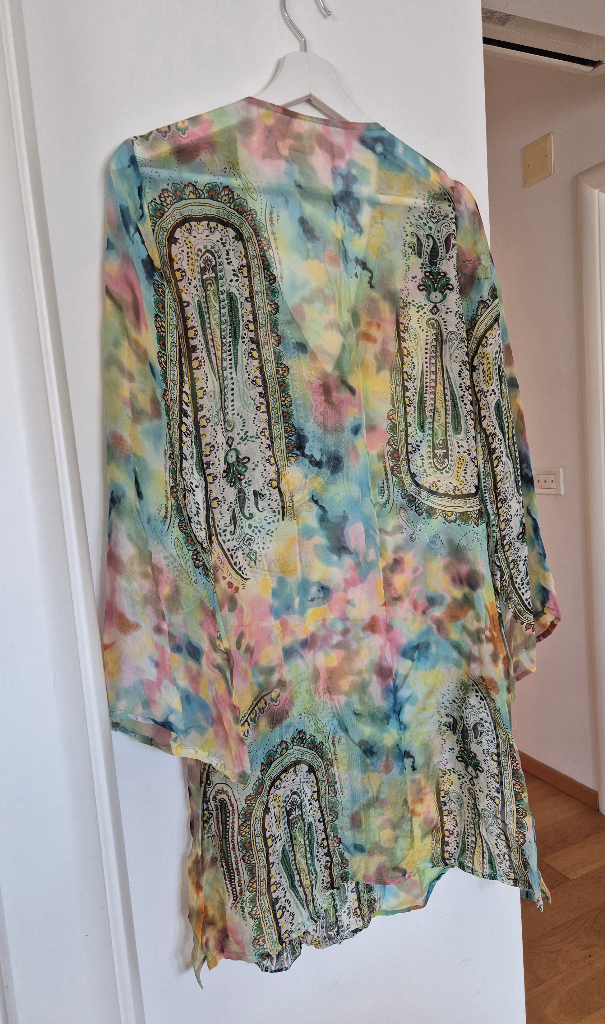 Prekrasna haljina ili tunika od nježne svile. S uzorkom i različitim perlicama na različitim mjestima. Zvono rukavi. Prorezi bočno.